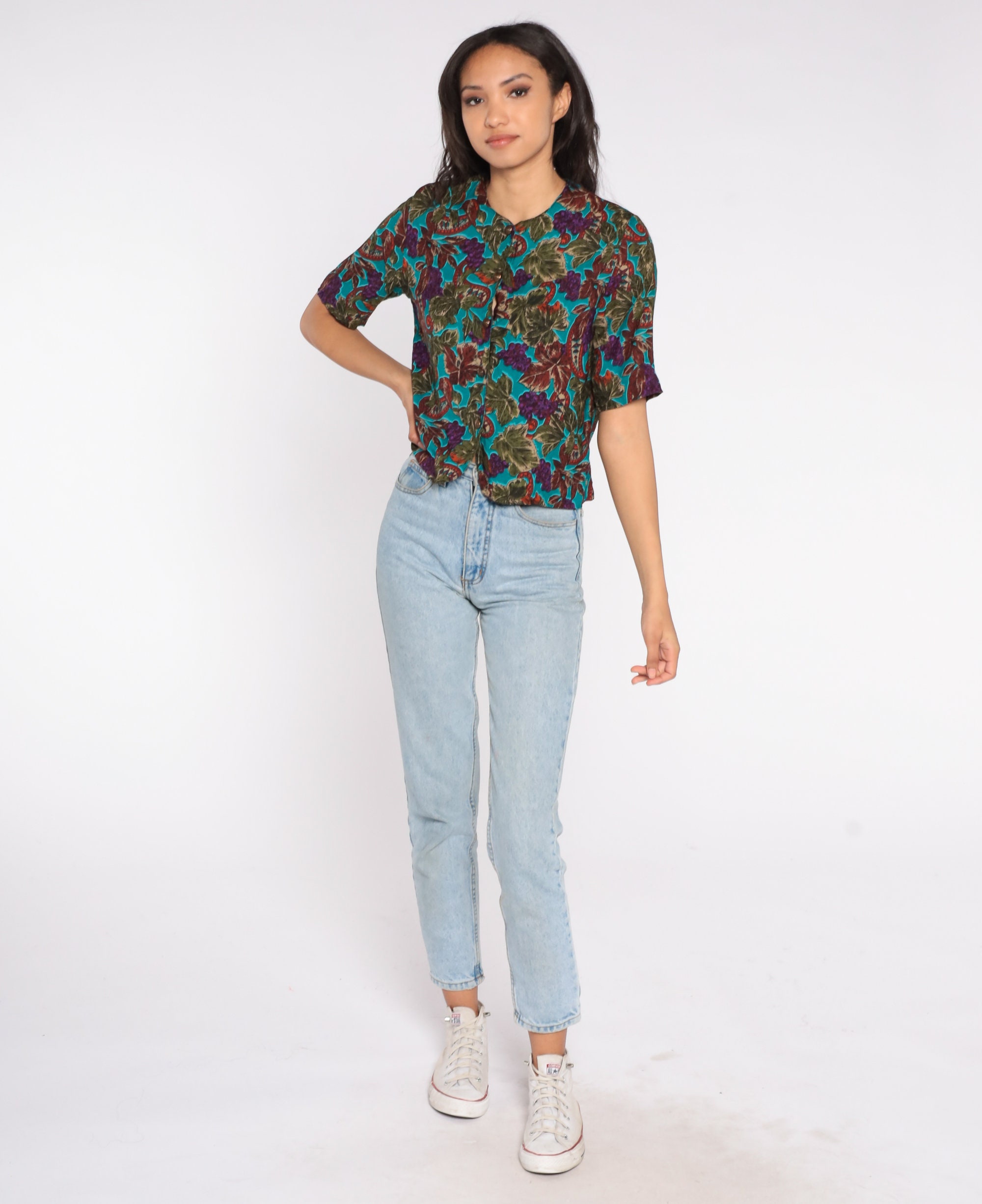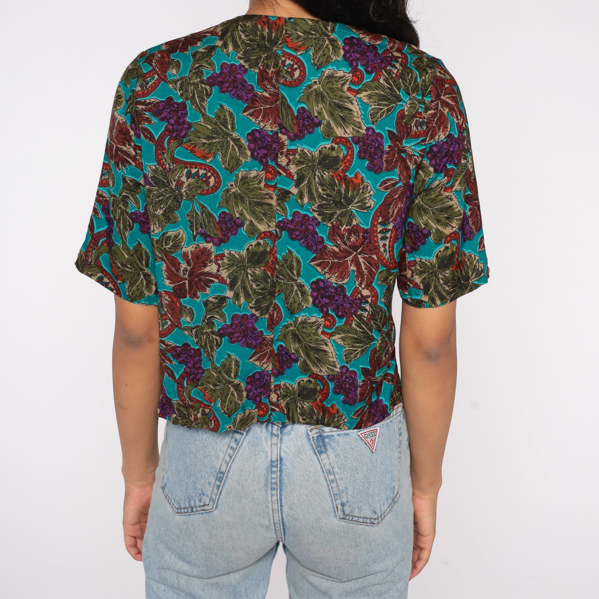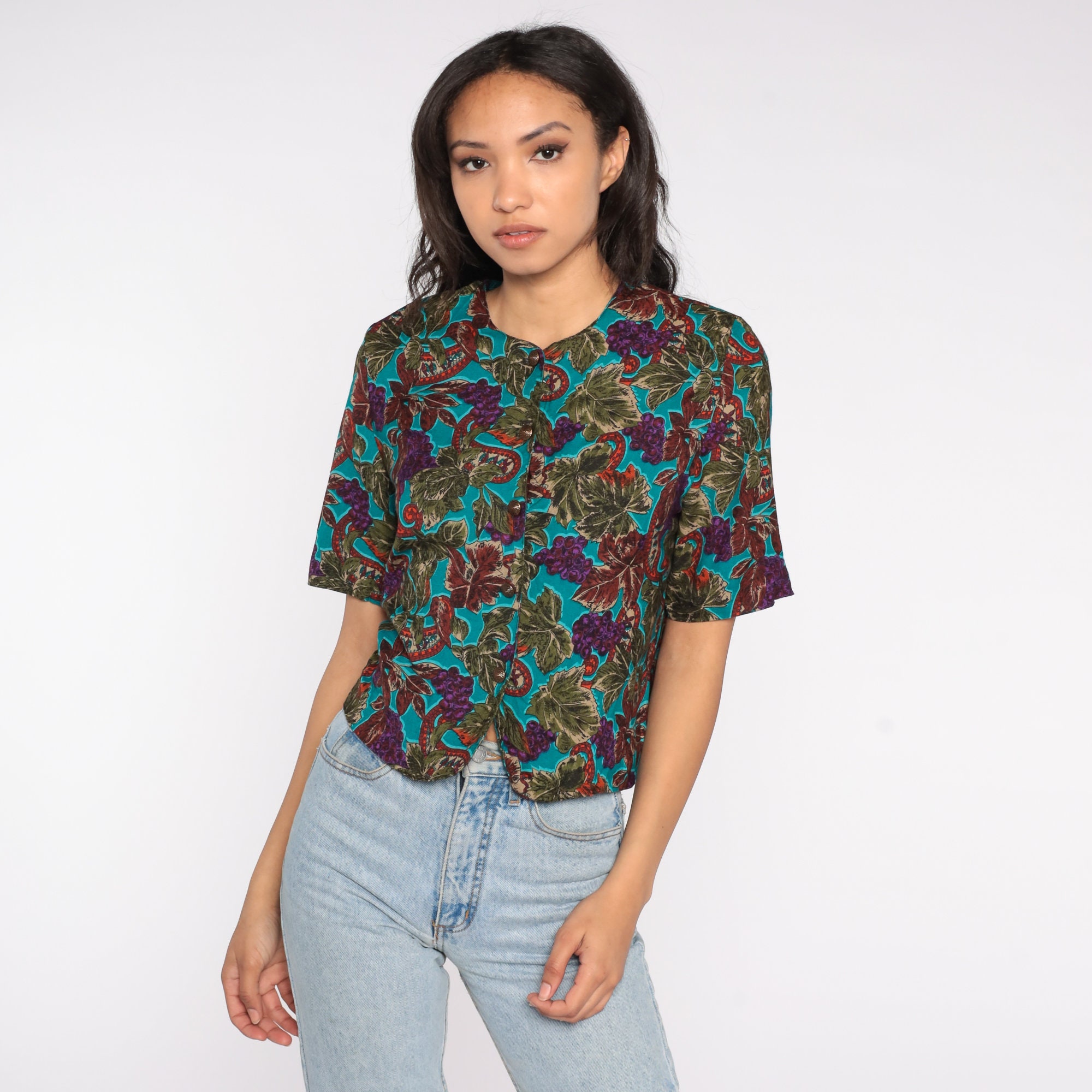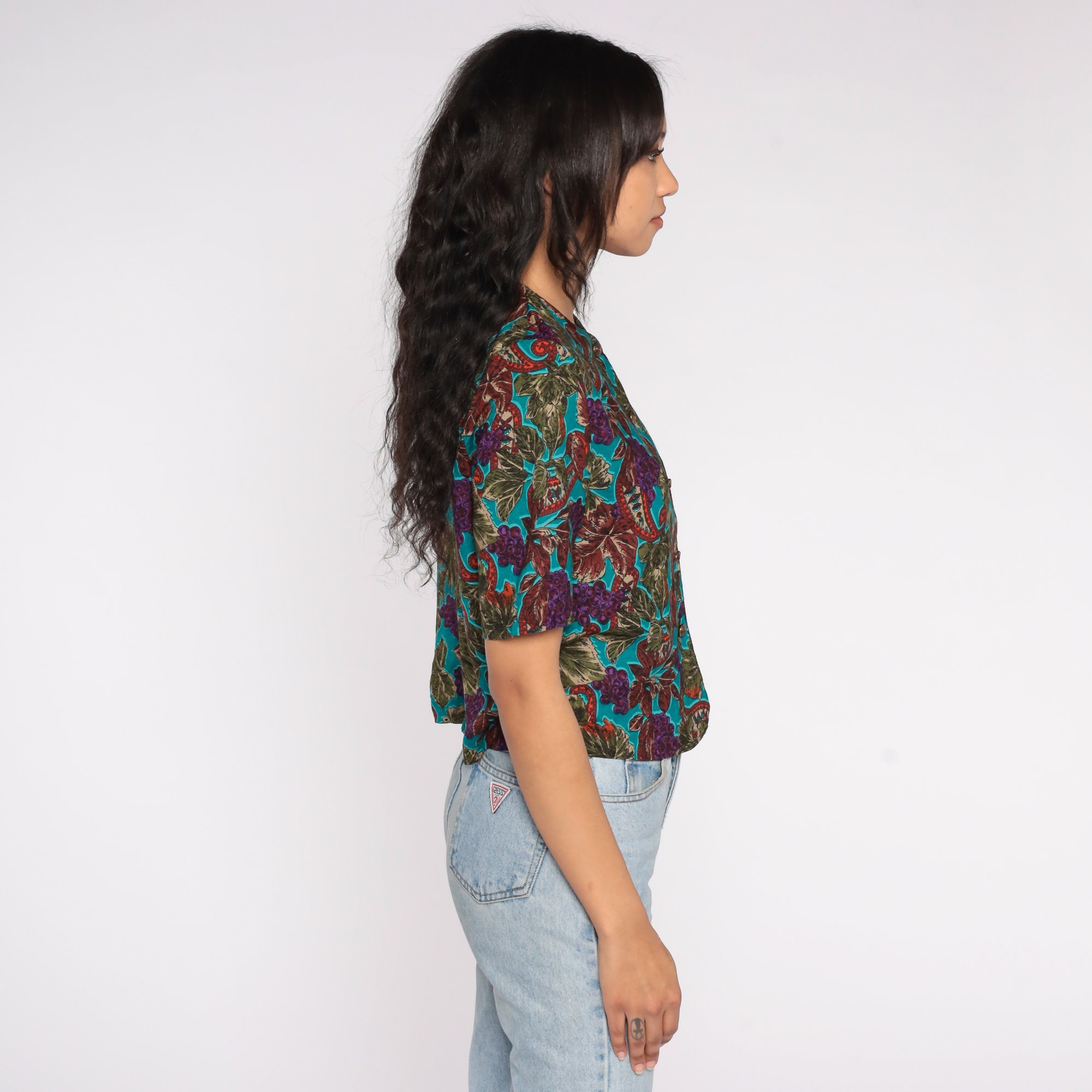 Vintage 80s 90s shirt with a paisley and grape vine print, buttons up the front and short sleeves.