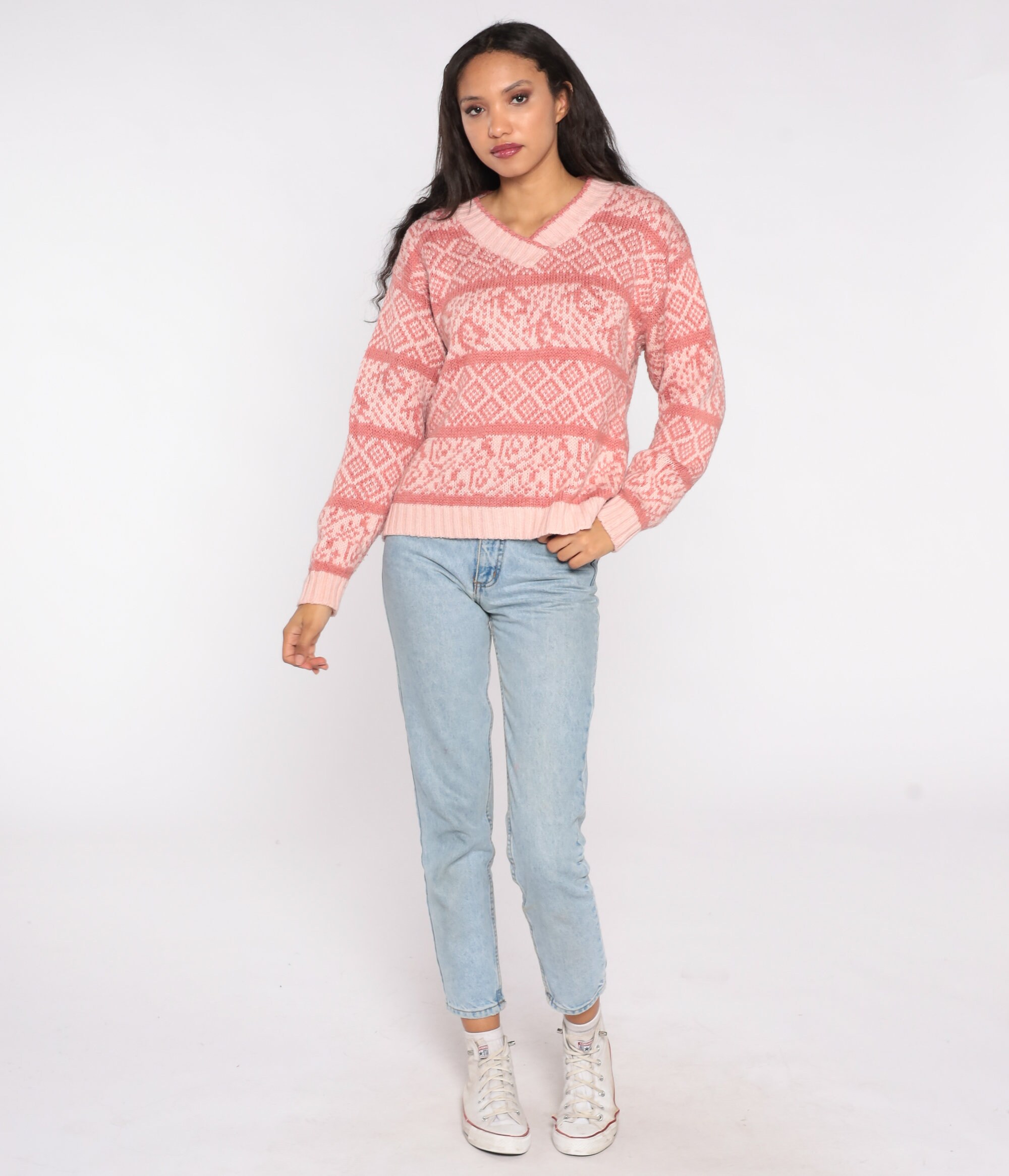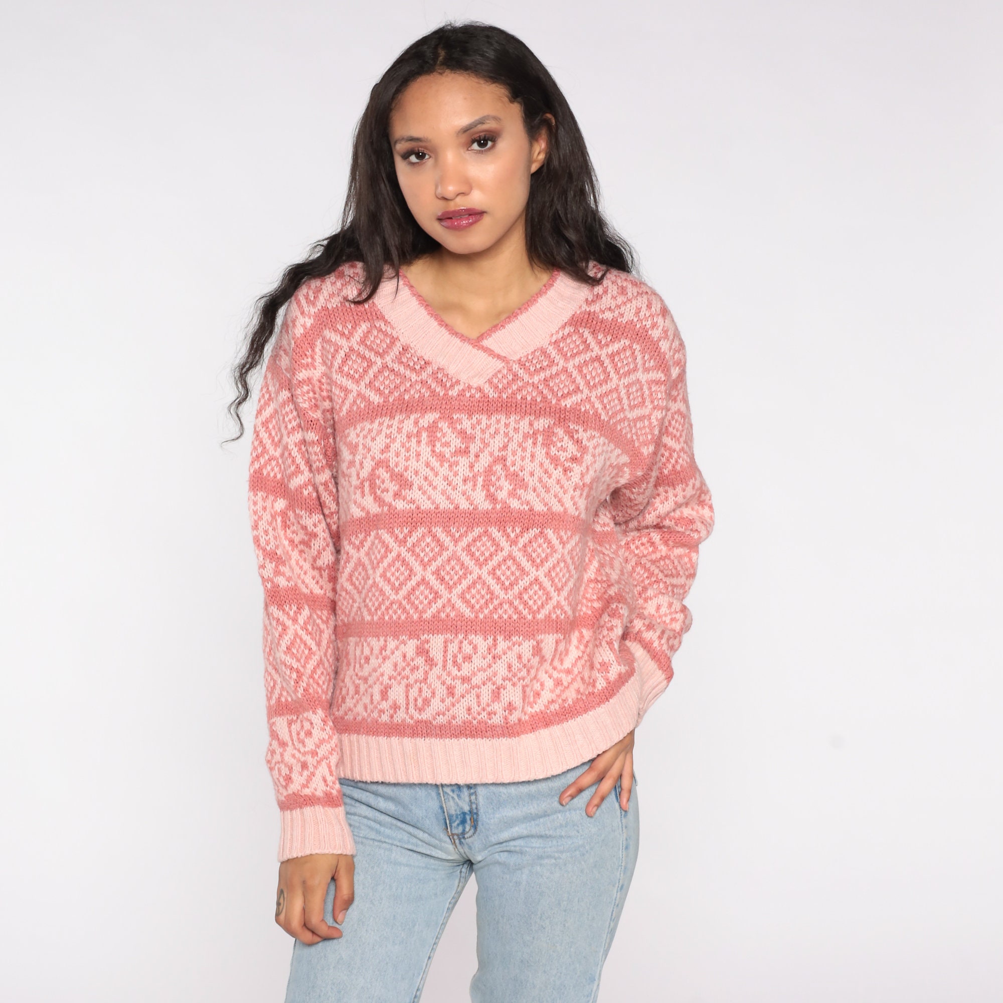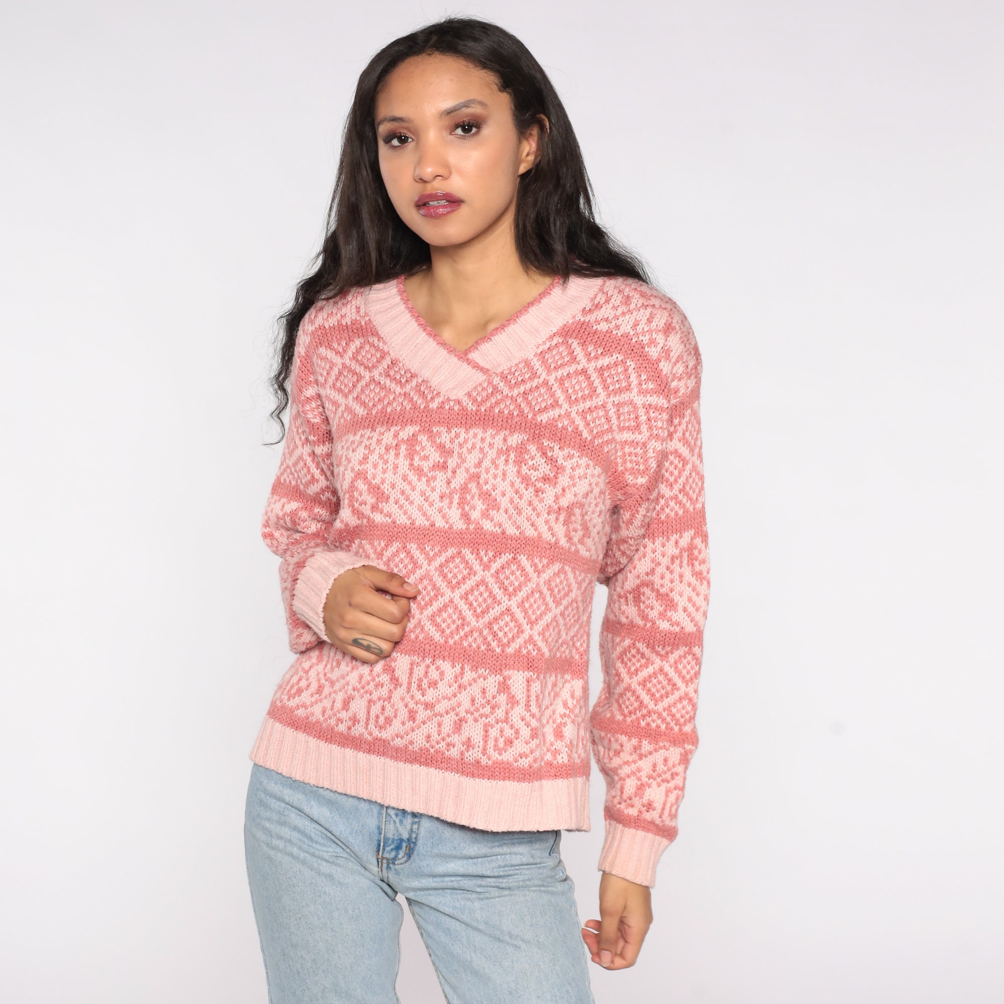 Vintage 80s sweater in pink with a geometric striped print.