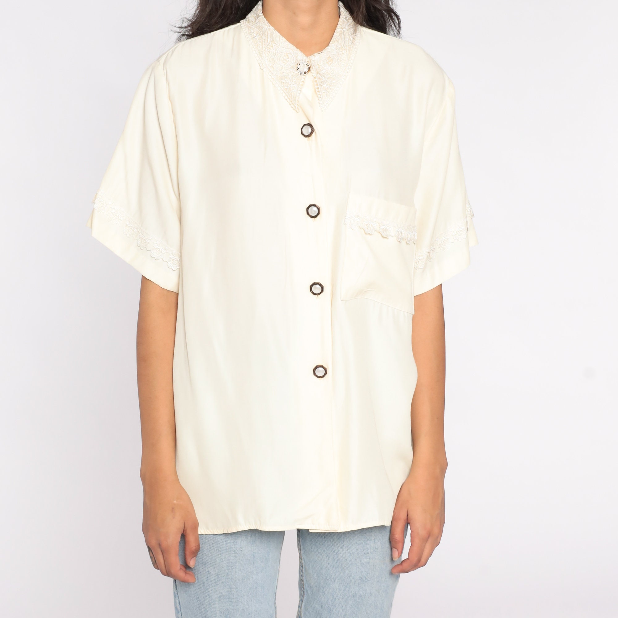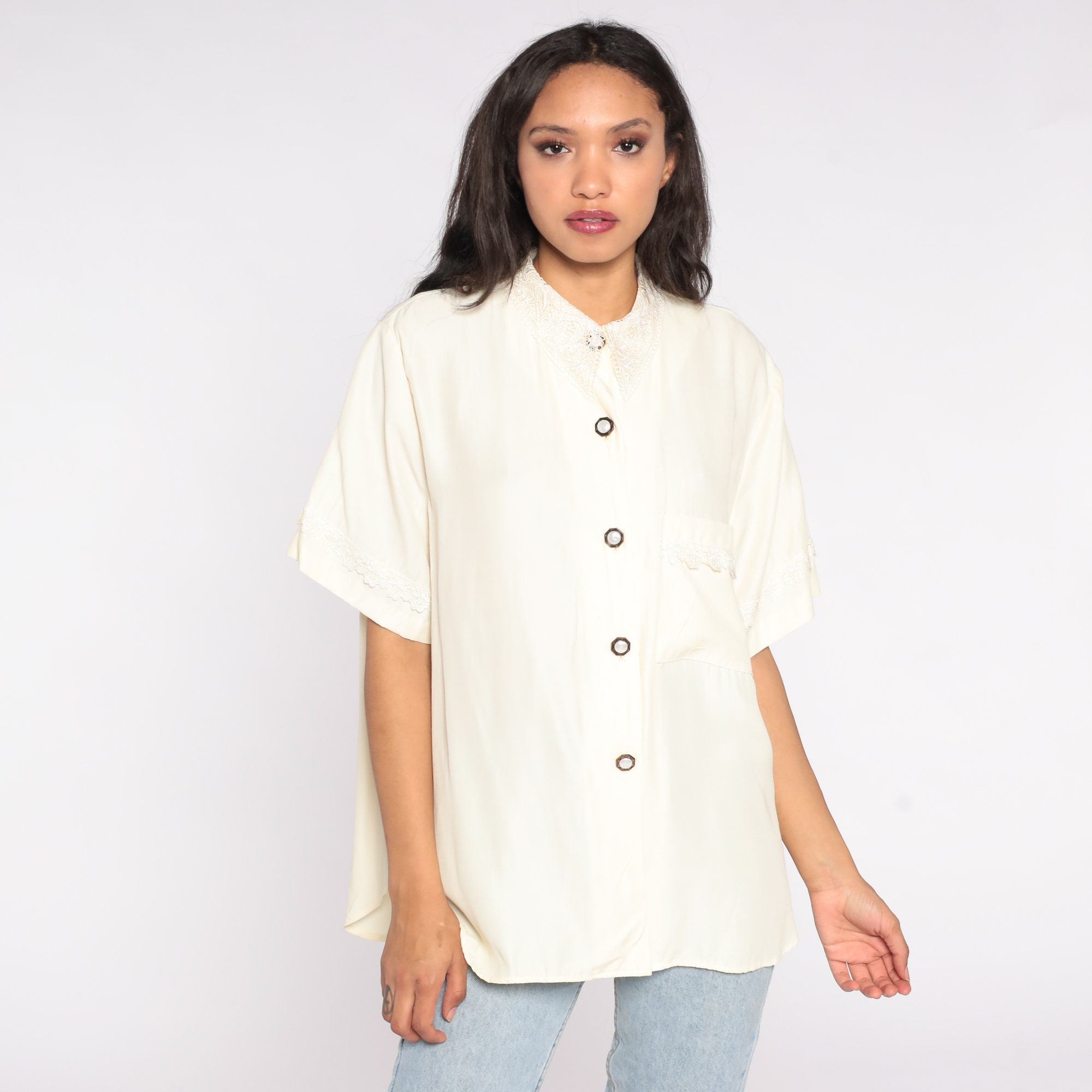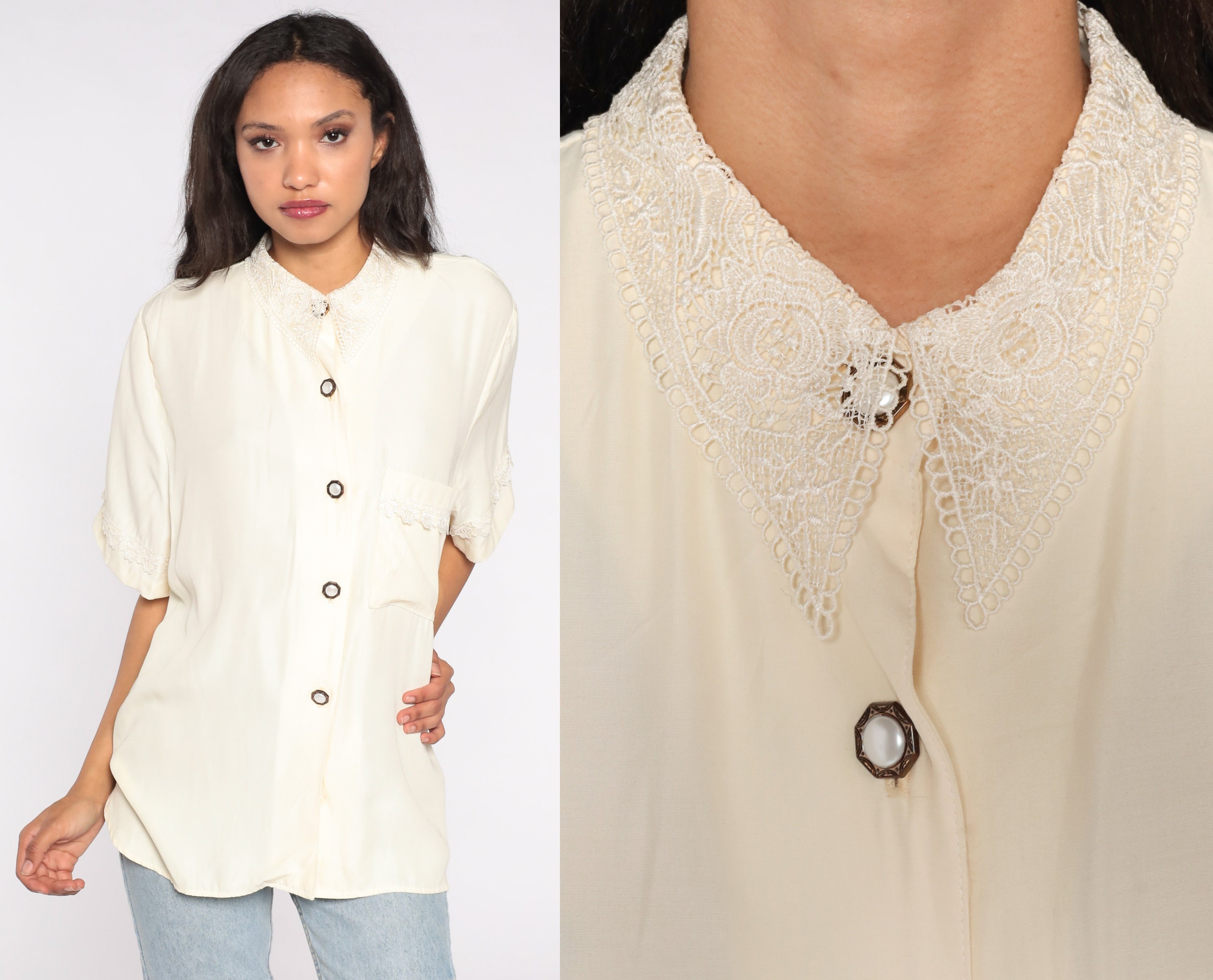 Vintage 80s shirt in cream with a chest pocket, buttons up the front, and a lace collar.