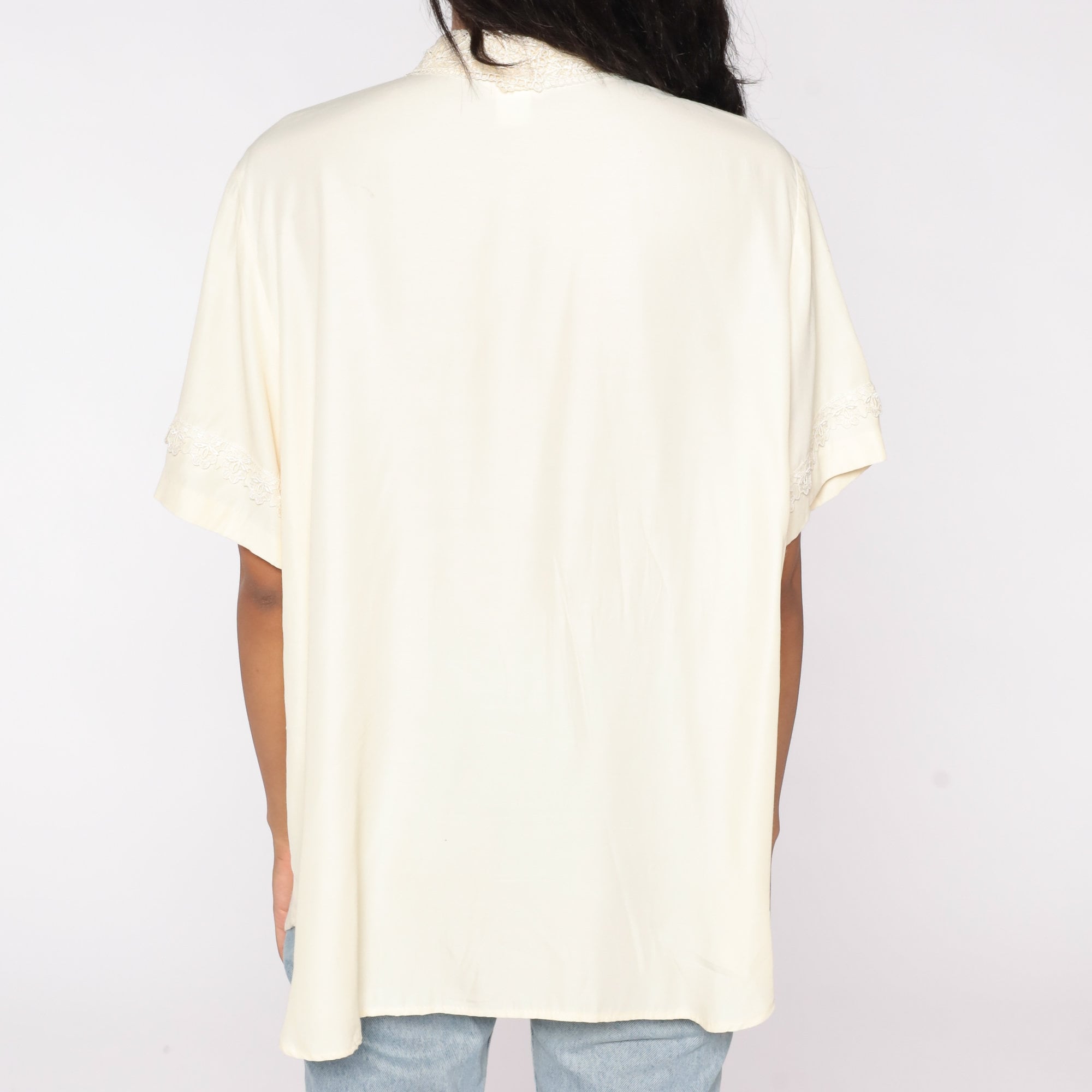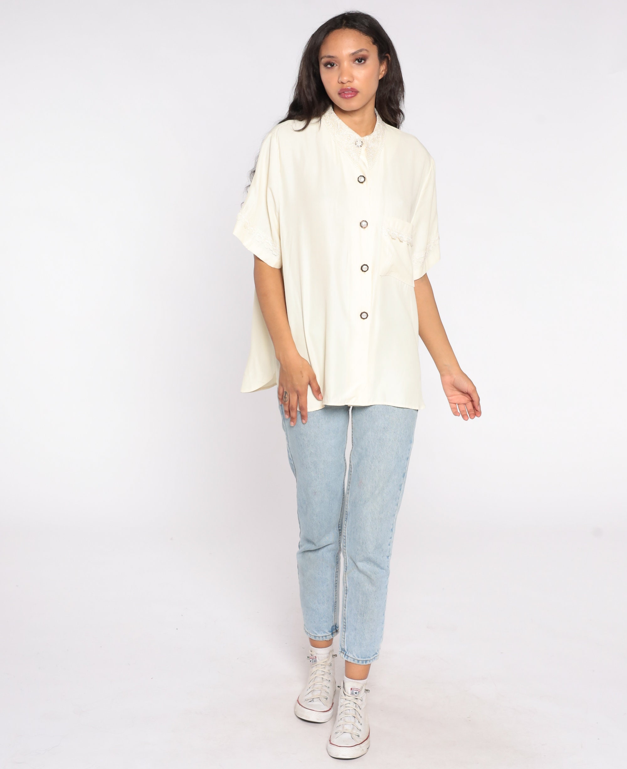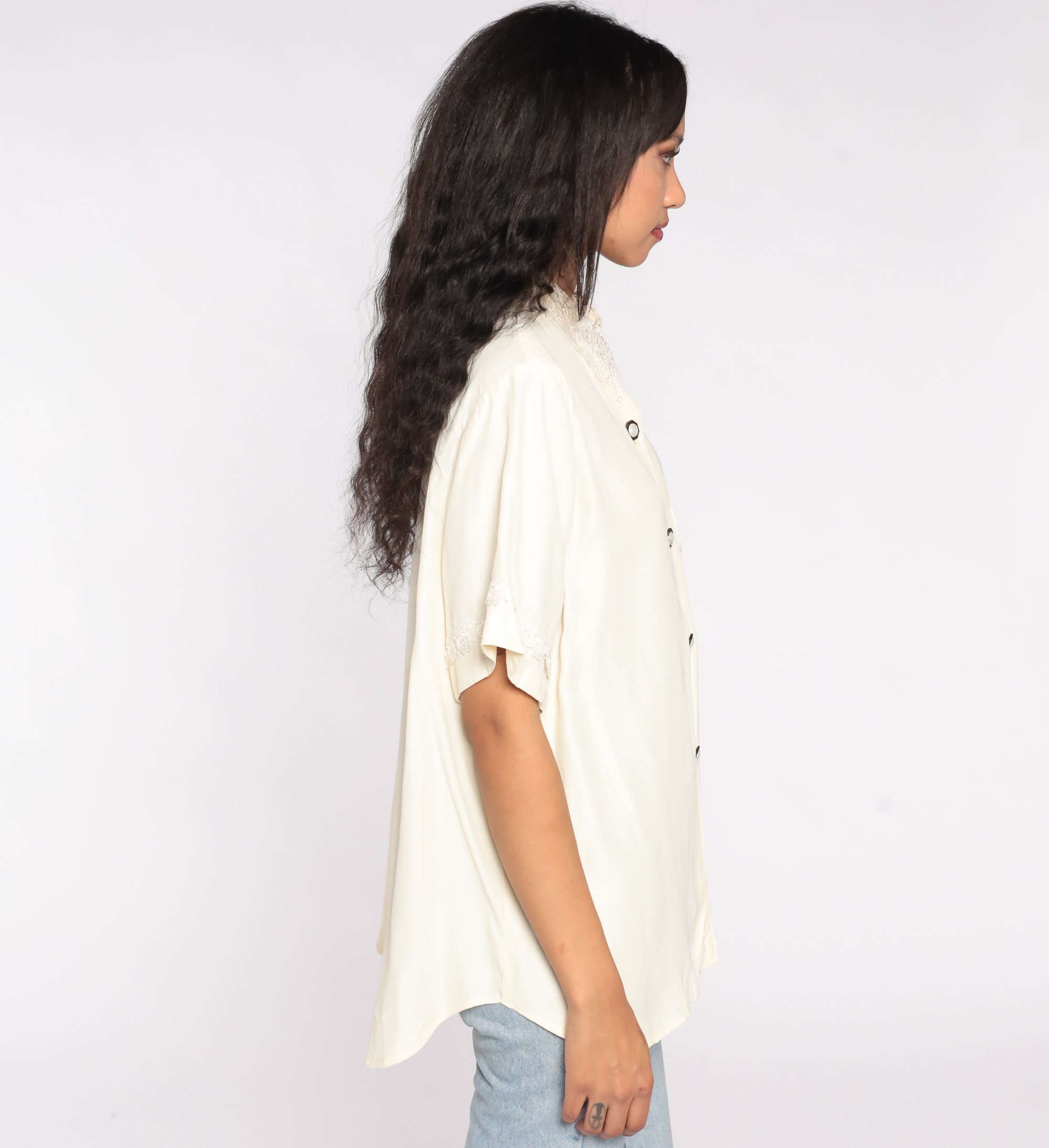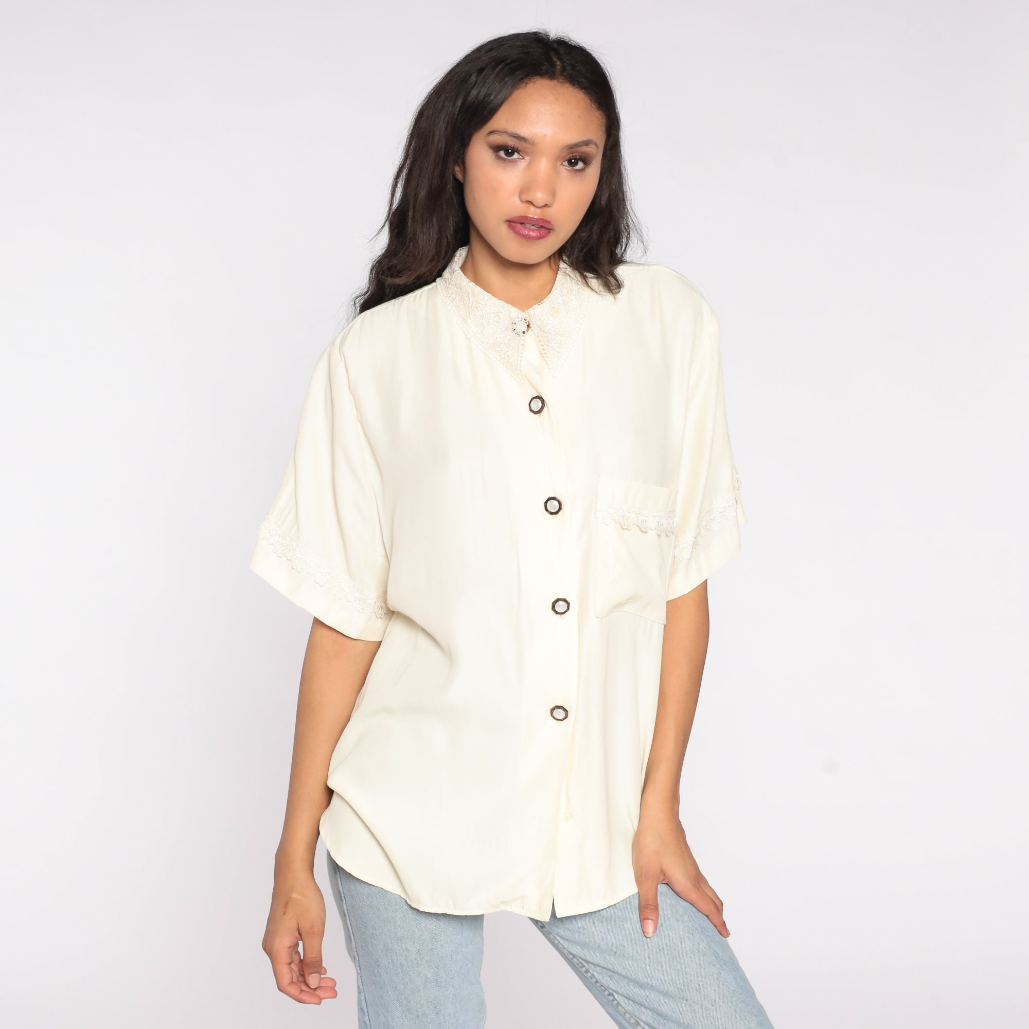 Vintage 80s shirt in cream with a chest pocket, buttons up the front, and a lace collar.