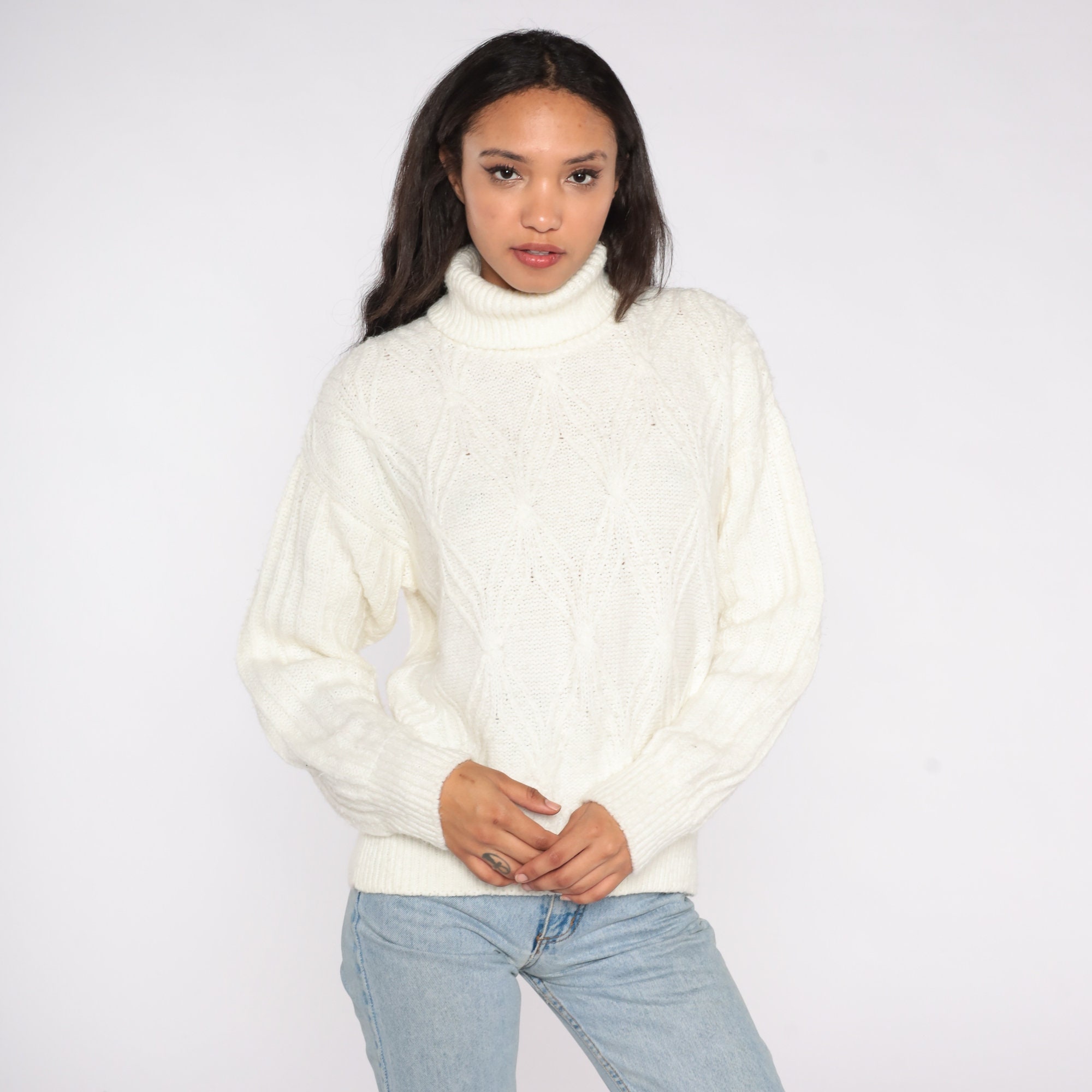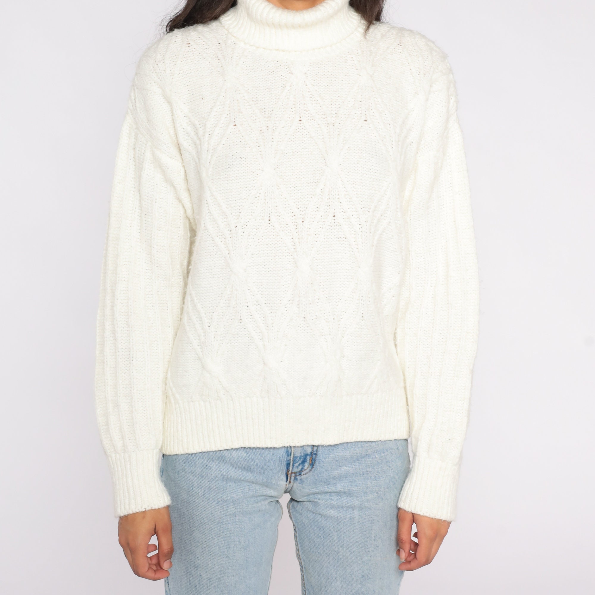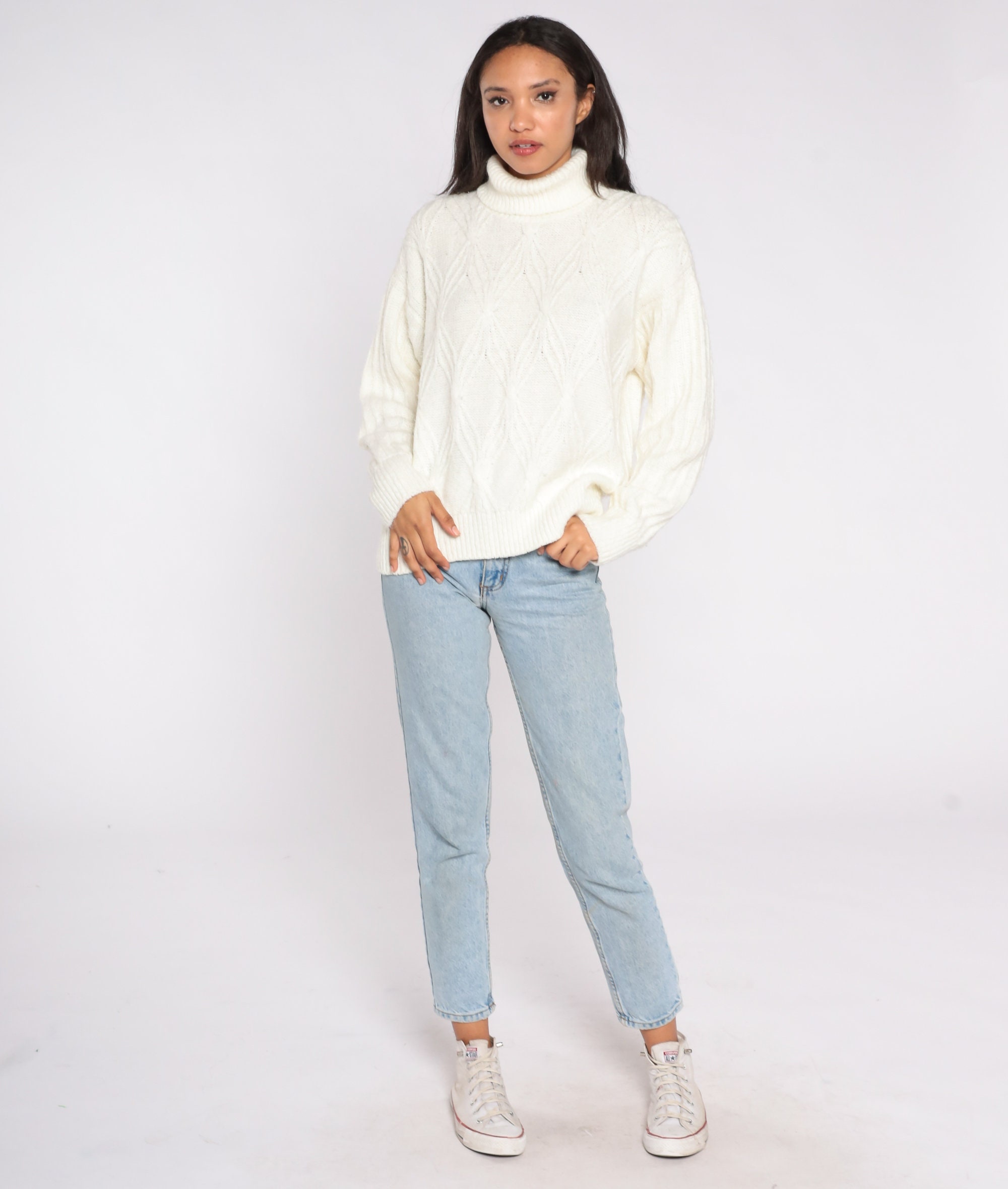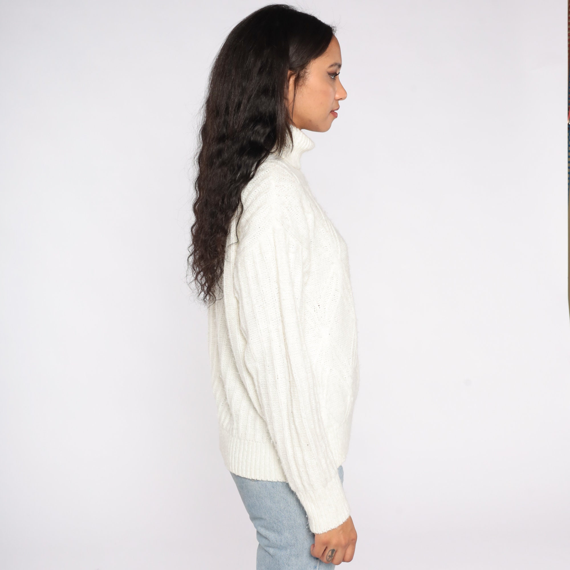 Vintage 80s 90s sweater in white with a textured design and a turtleneck.