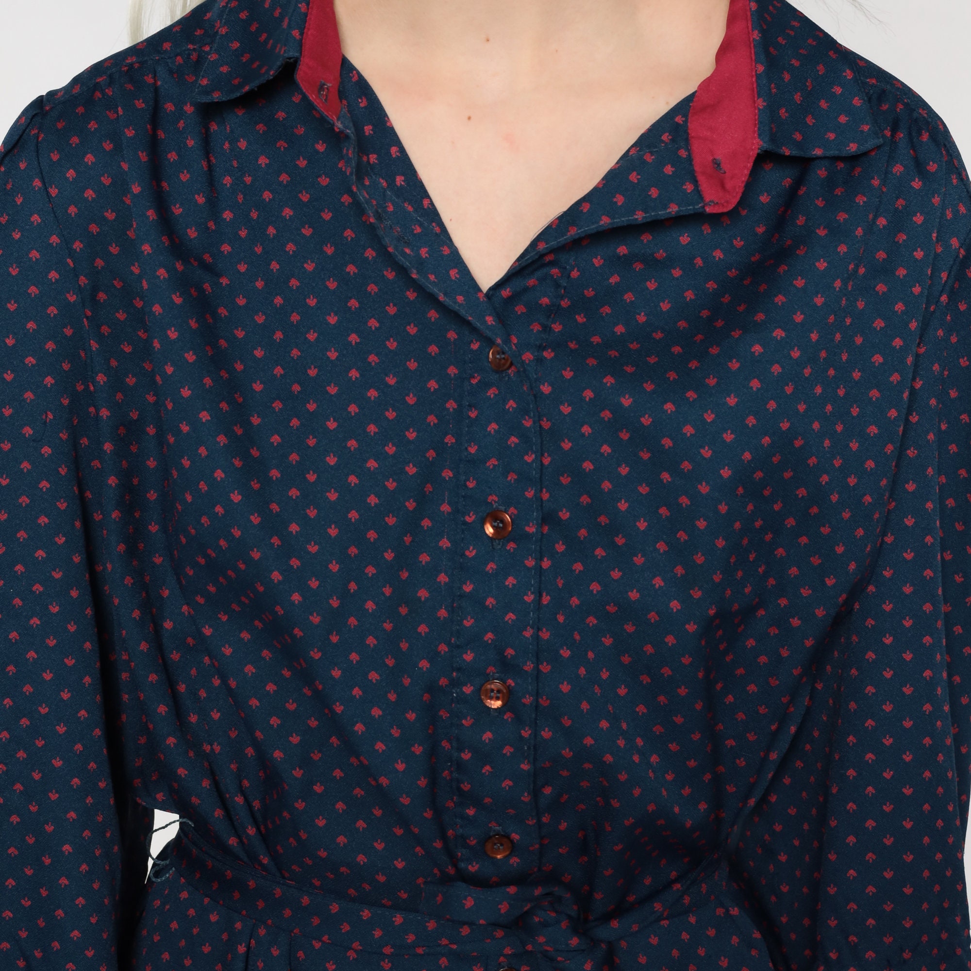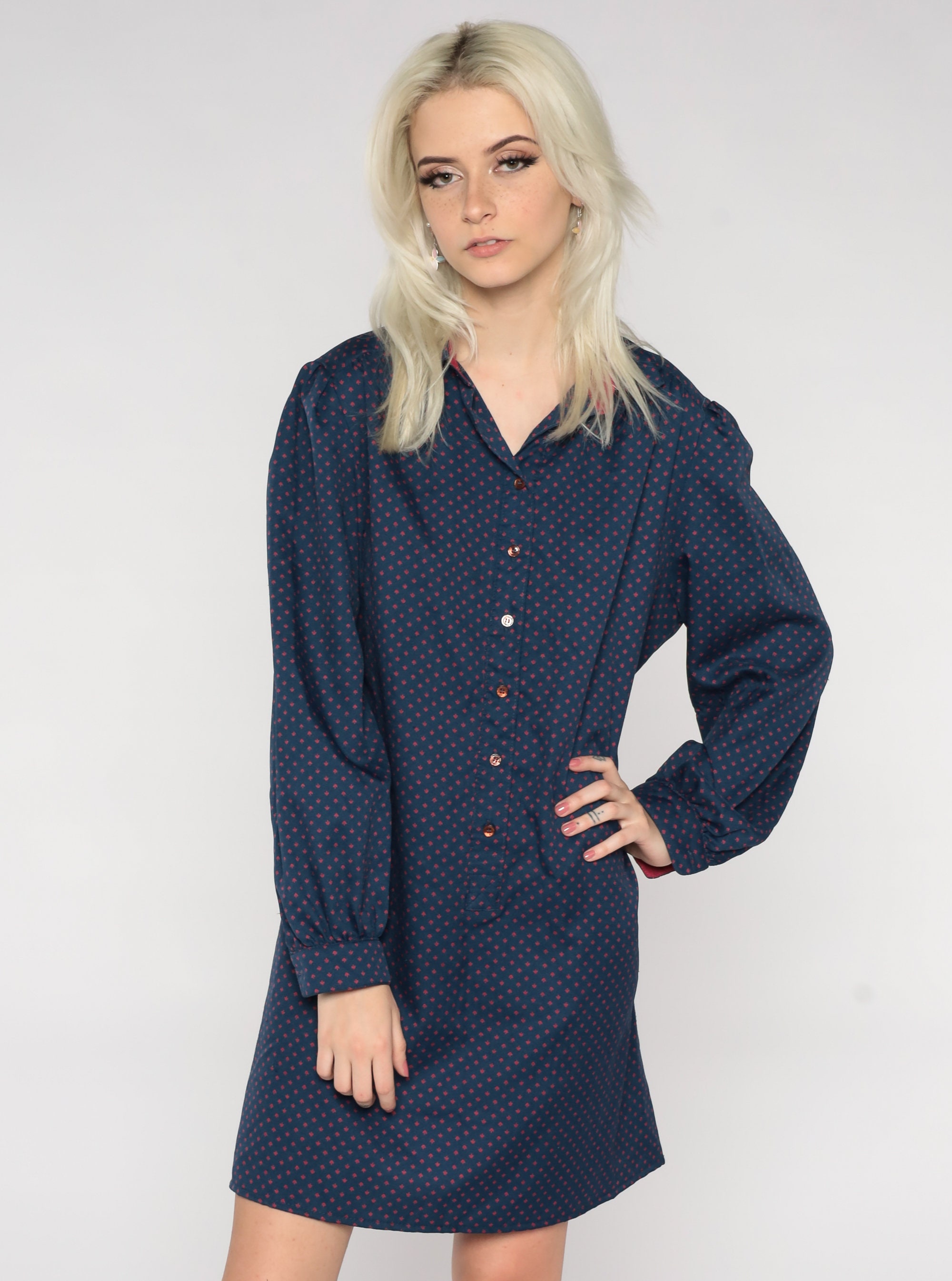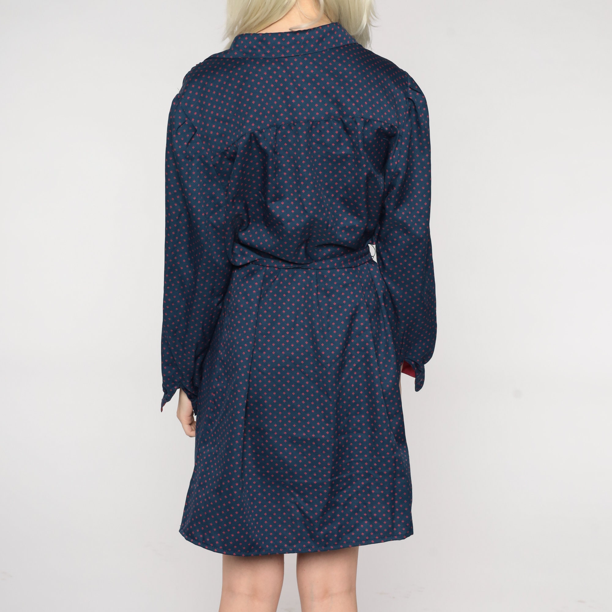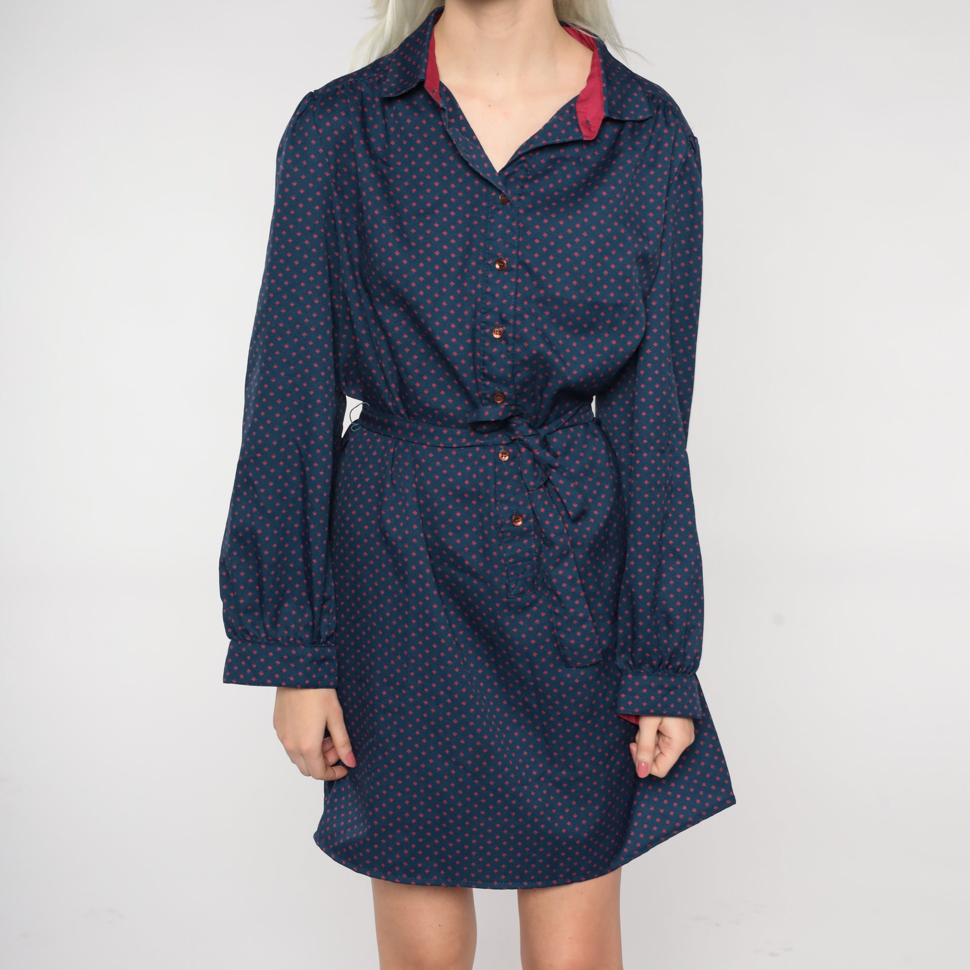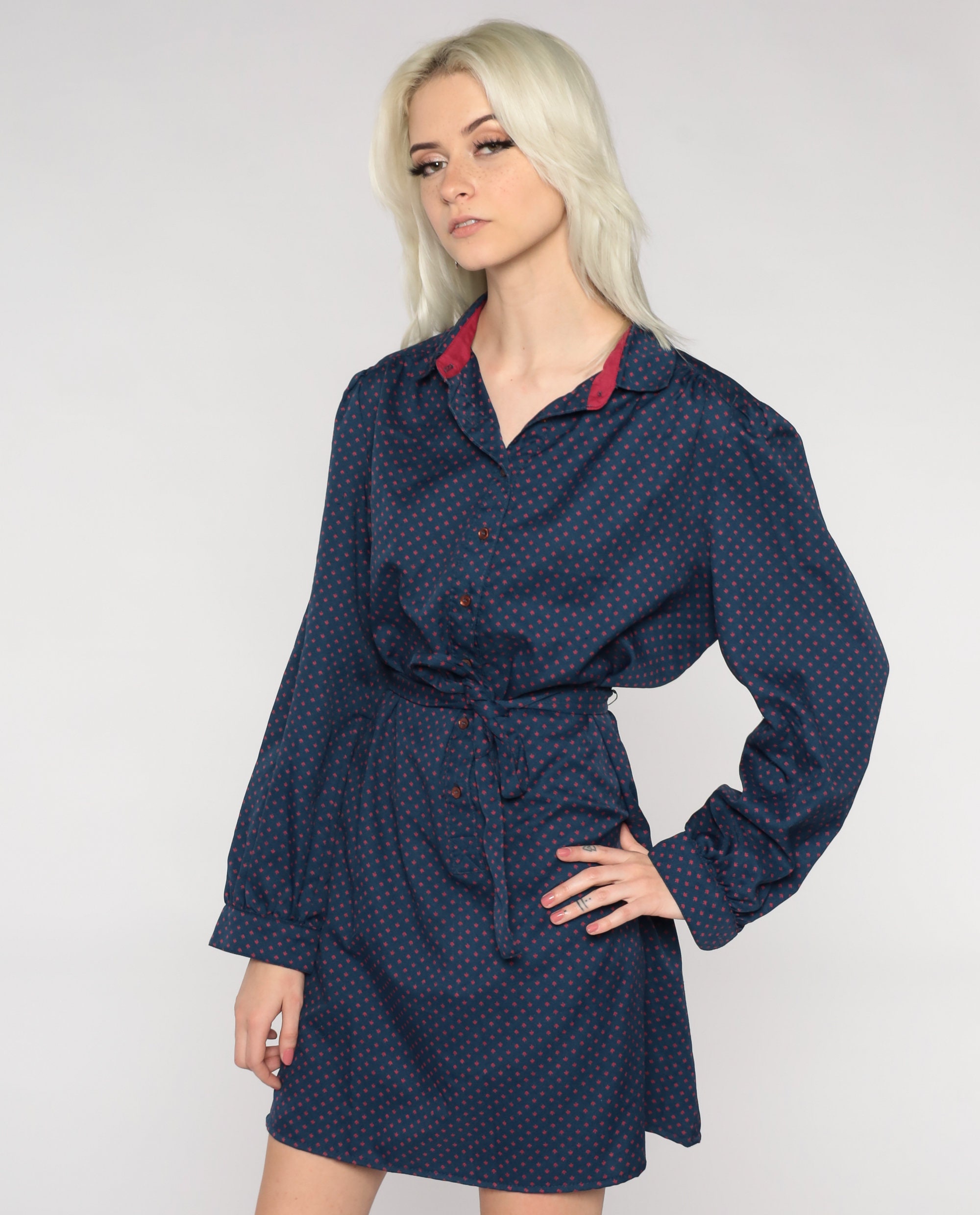 Vintage 80s dress in navy blue with red polka dots, a tie belt, and buttons up the front. It has a high waist and long sleeves. Mini length.