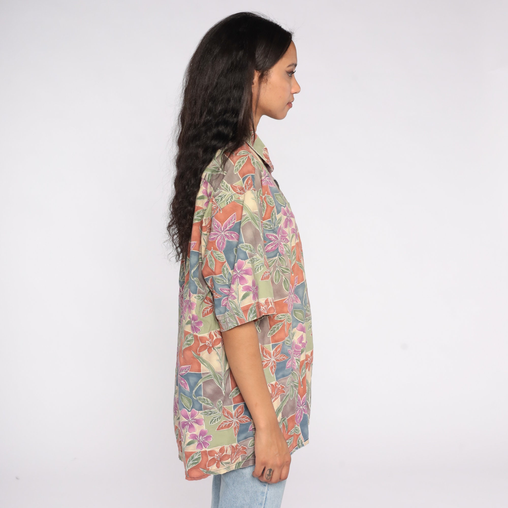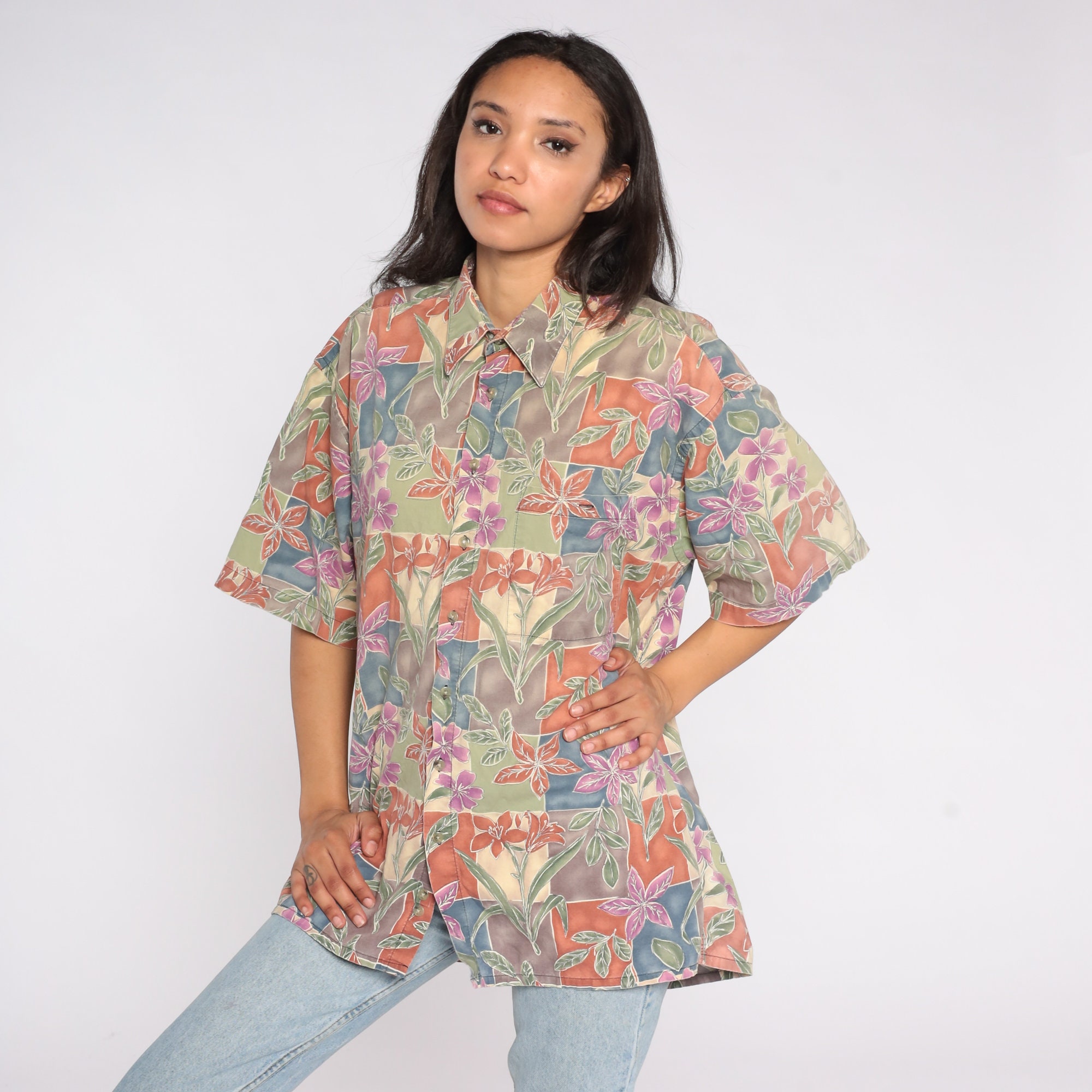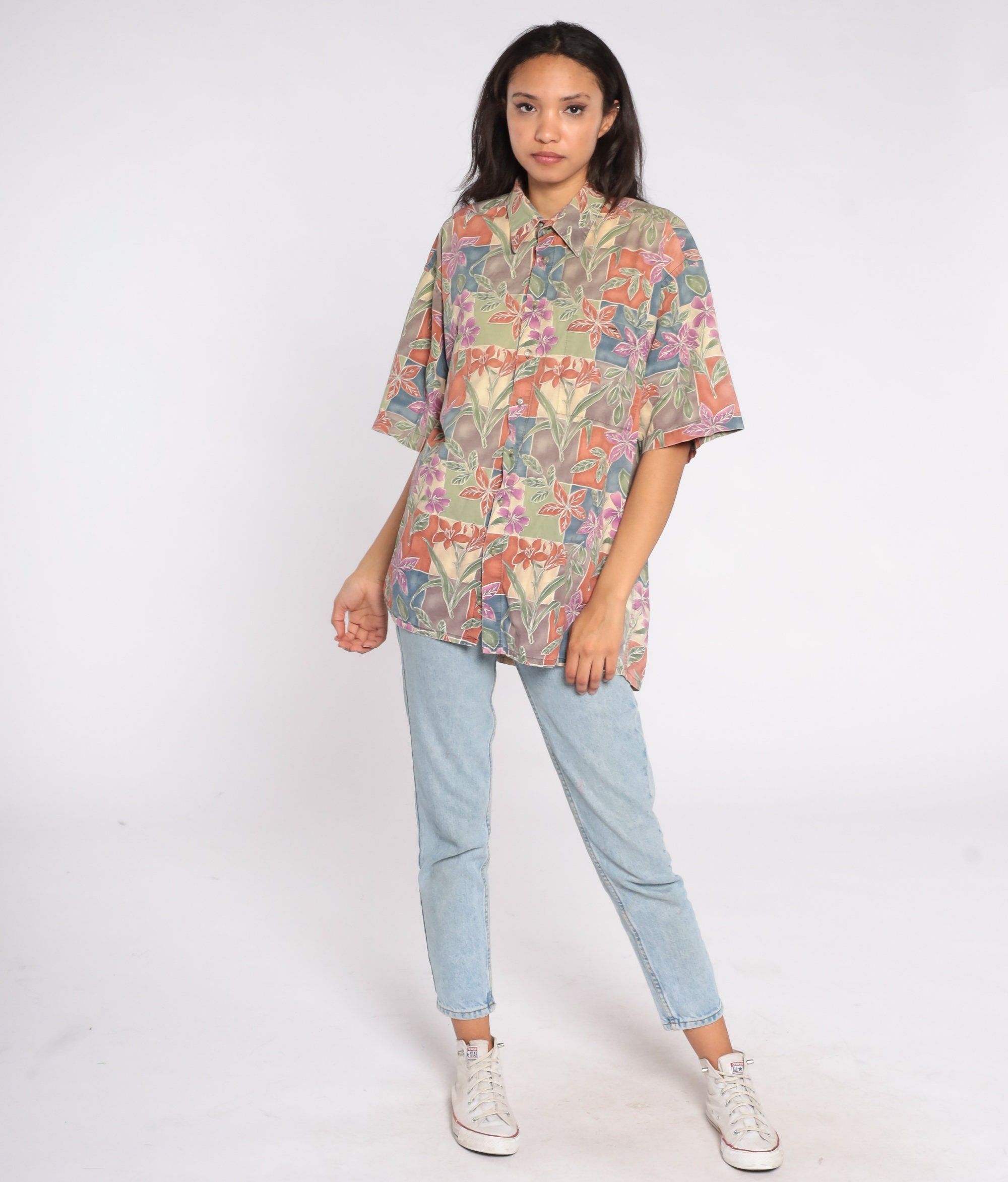 Vintage 80s 90s shirt by Pierre Cardin with a floral print, side slits, and buttons up the front.