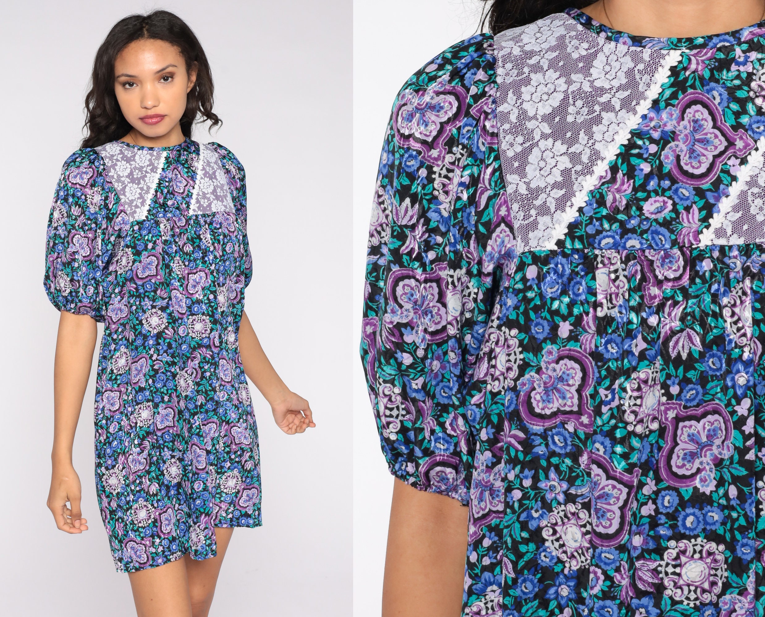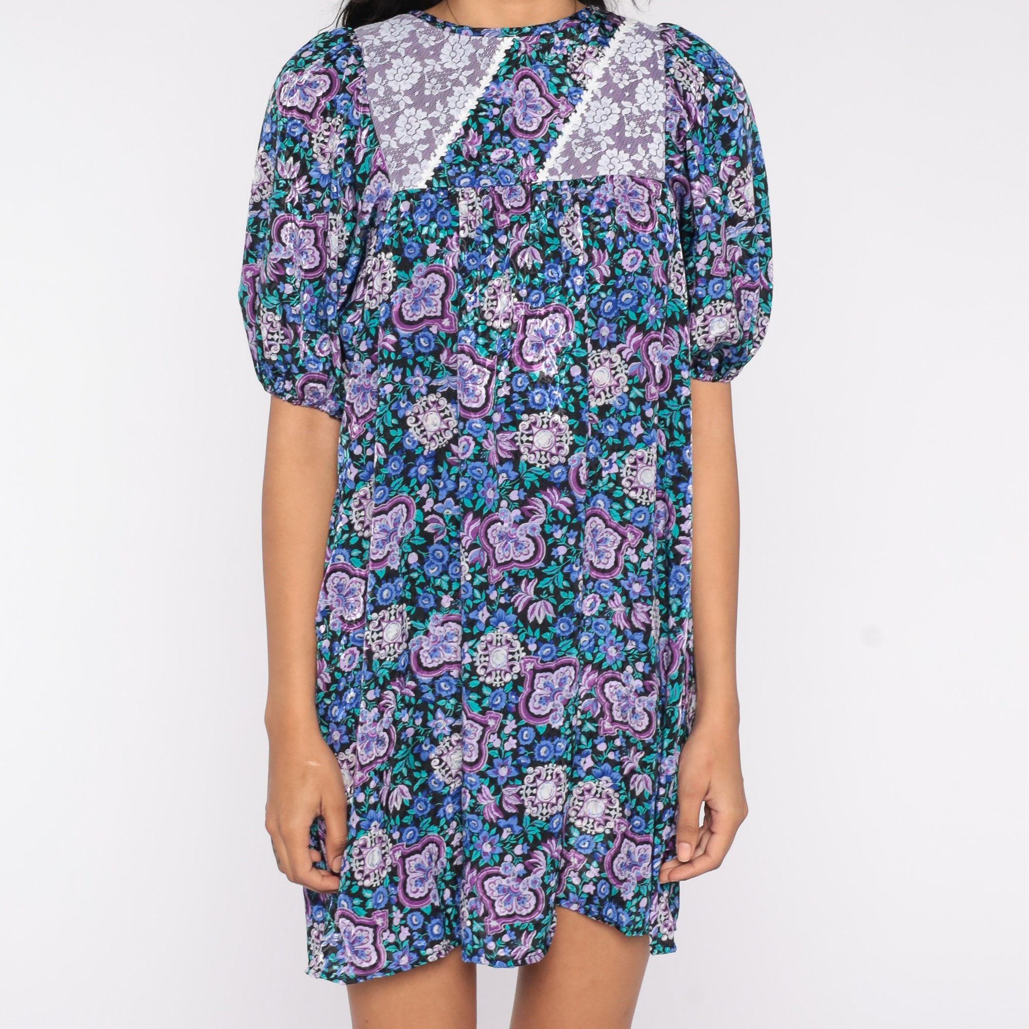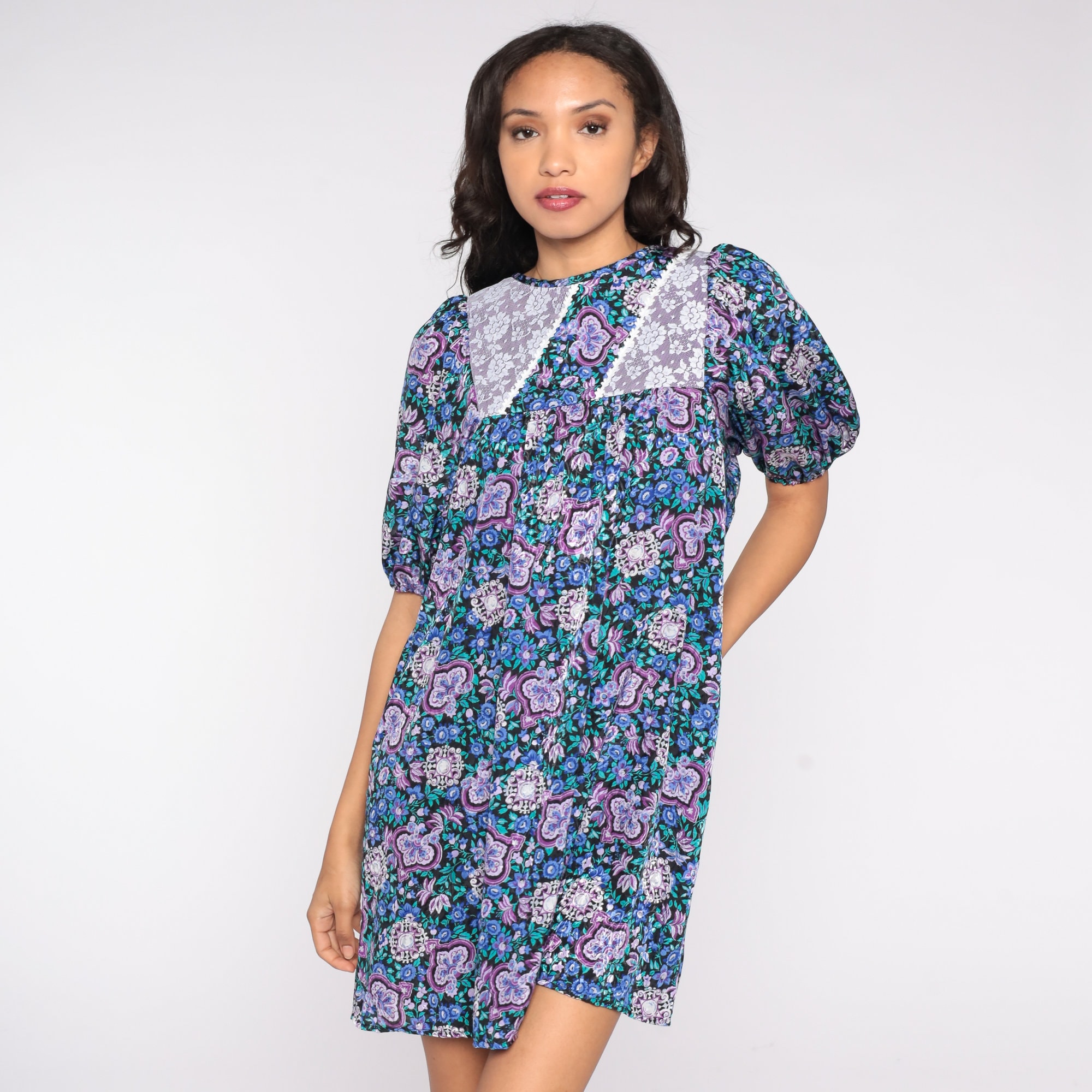 Vintage 80s dress in a blue floral print with a lace trim bib. It has a tent cut and short balloon sleeves. Mini length.