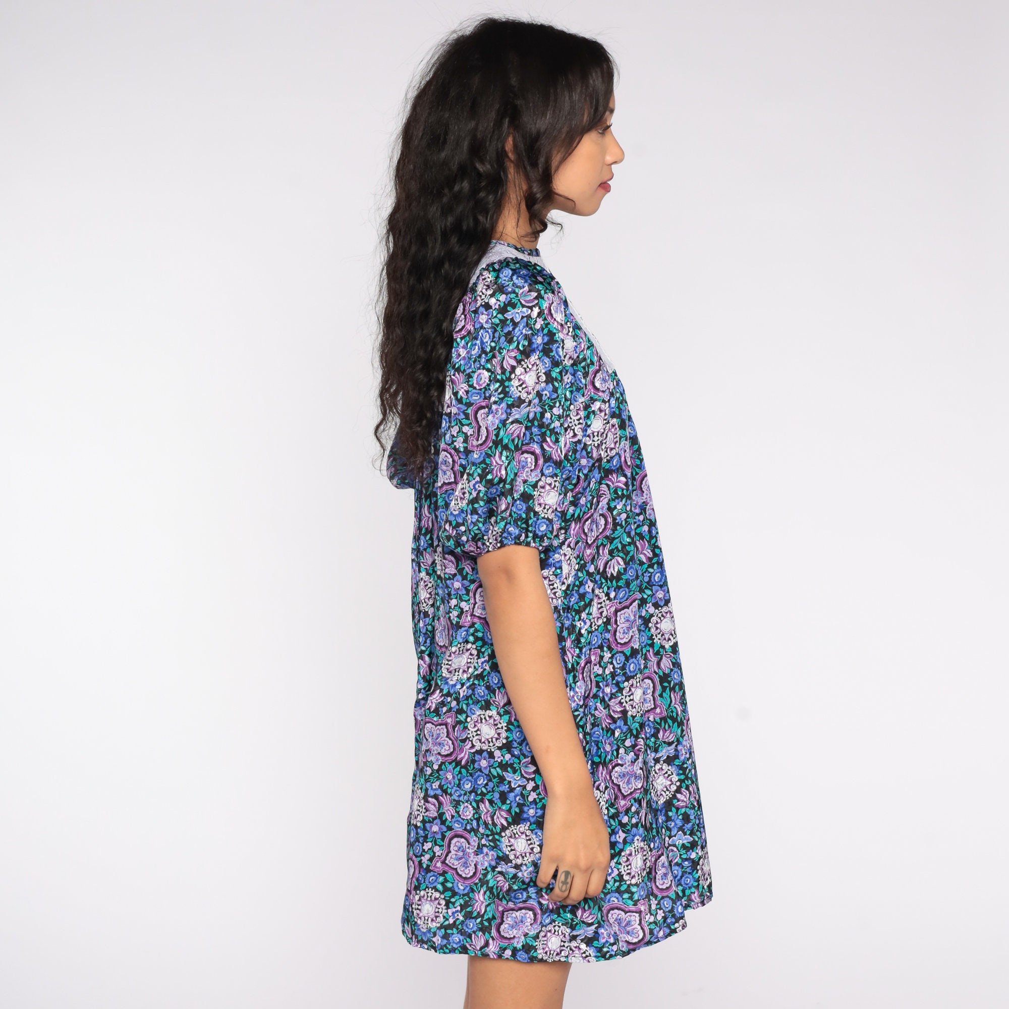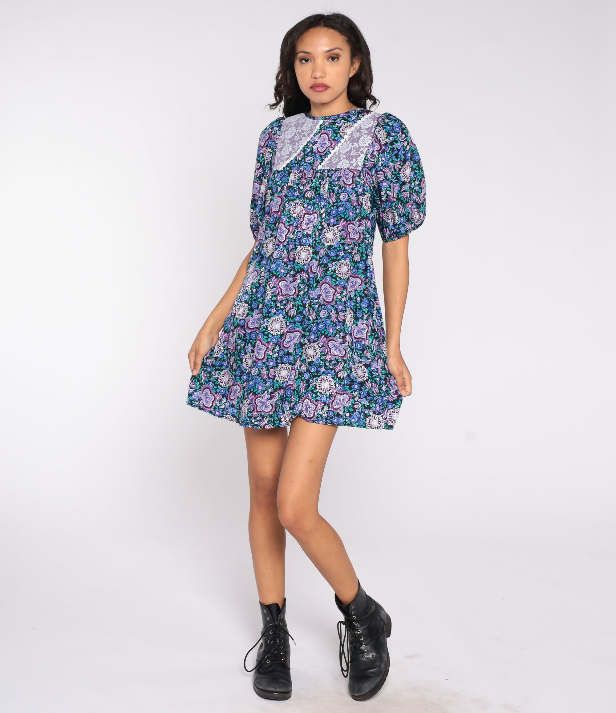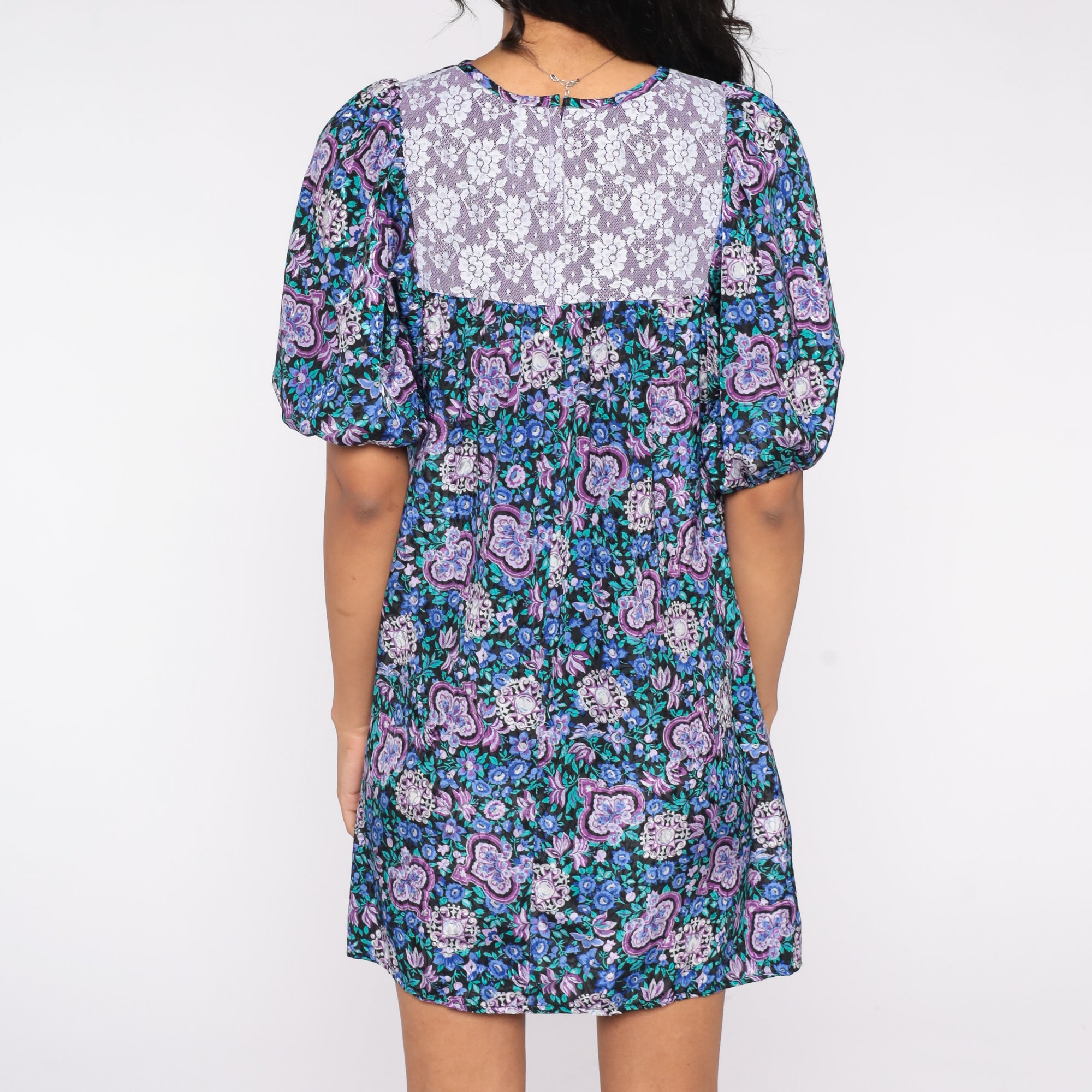 Vintage 80s dress in a blue floral print with a lace trim bib. It has a tent cut and short balloon sleeves. Mini length.