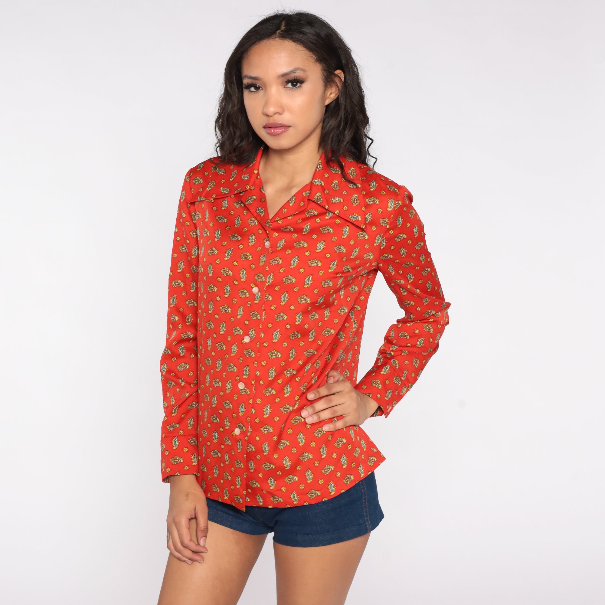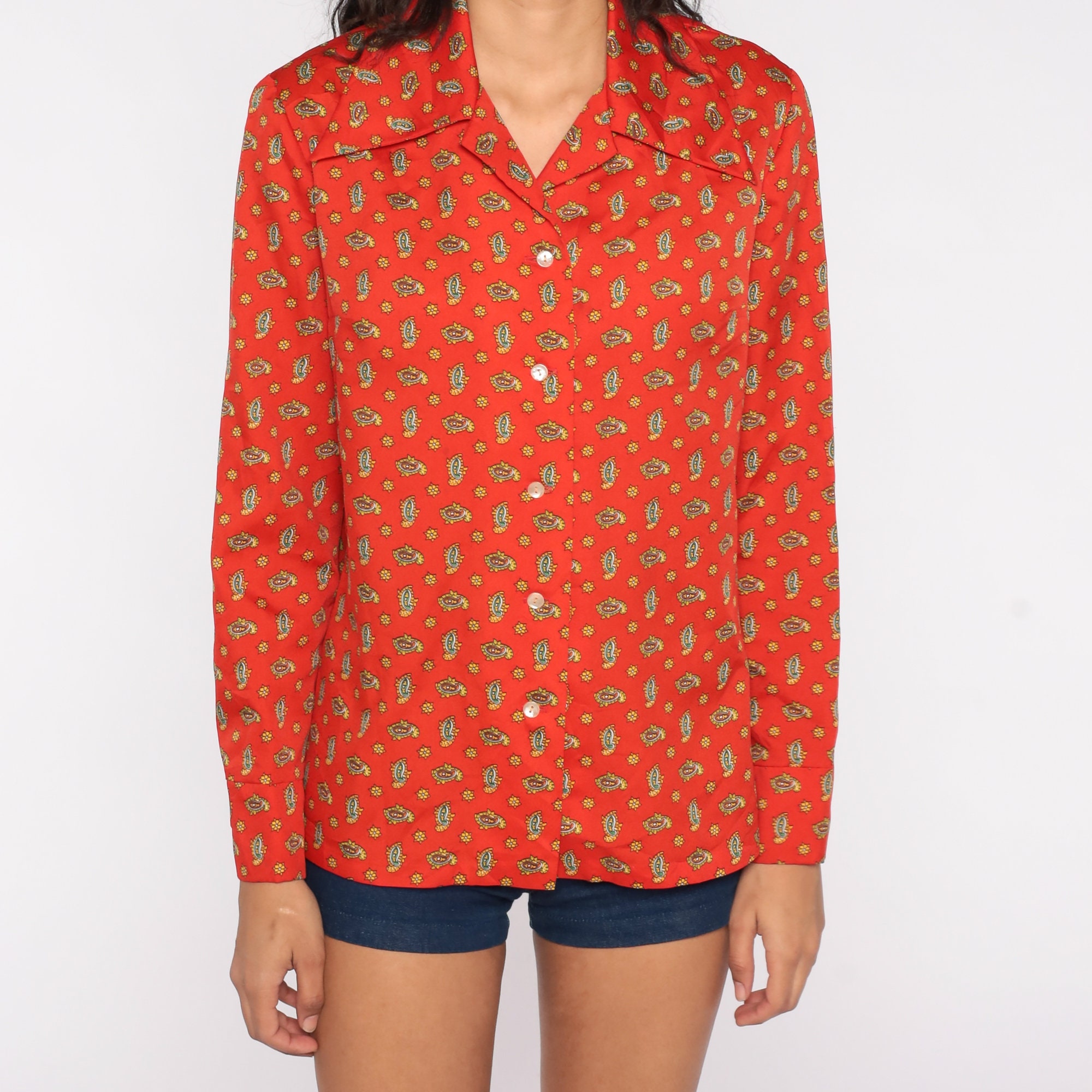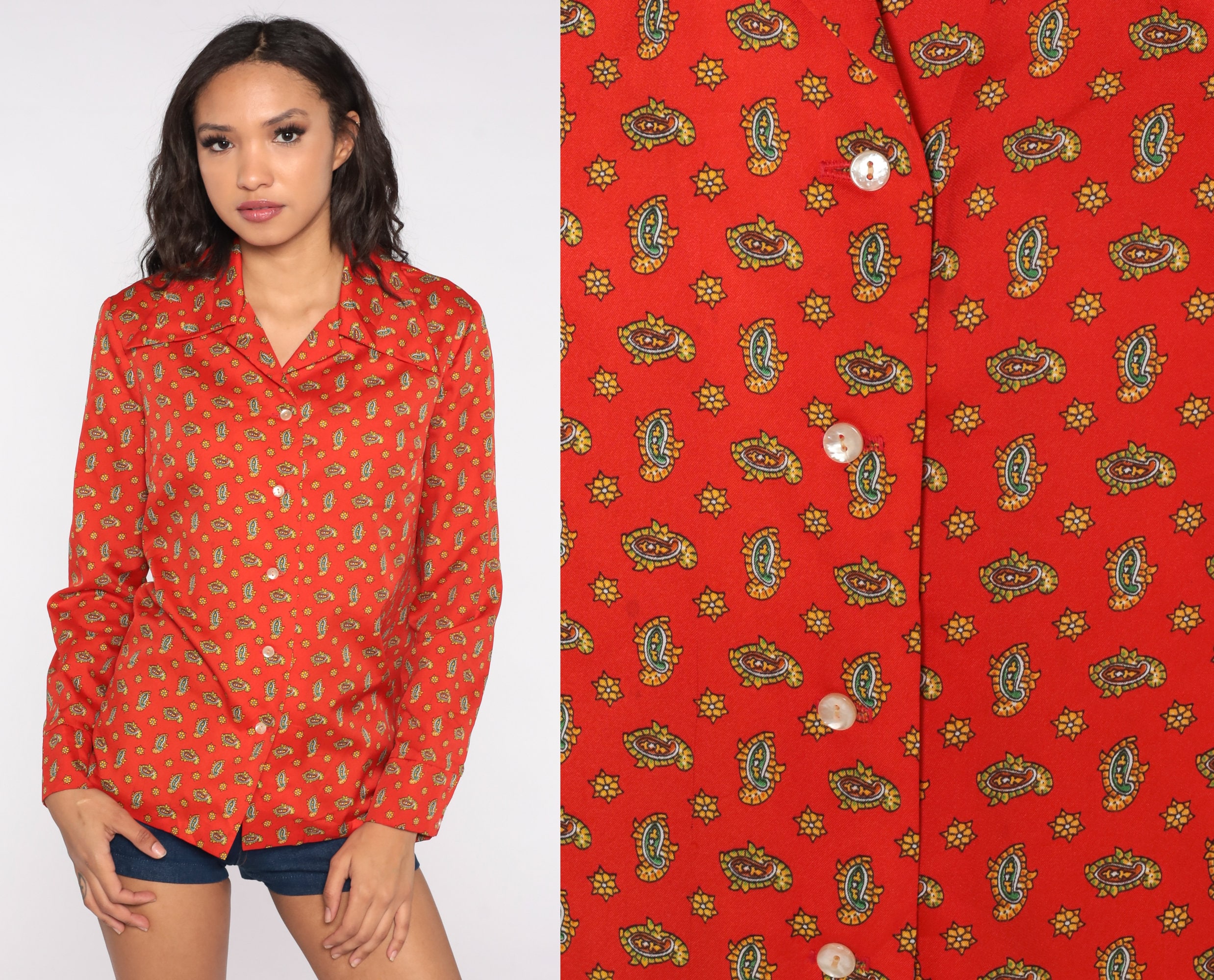 Vintage 70s blouse in a paisley print. Long sleeves, buttons down the front.