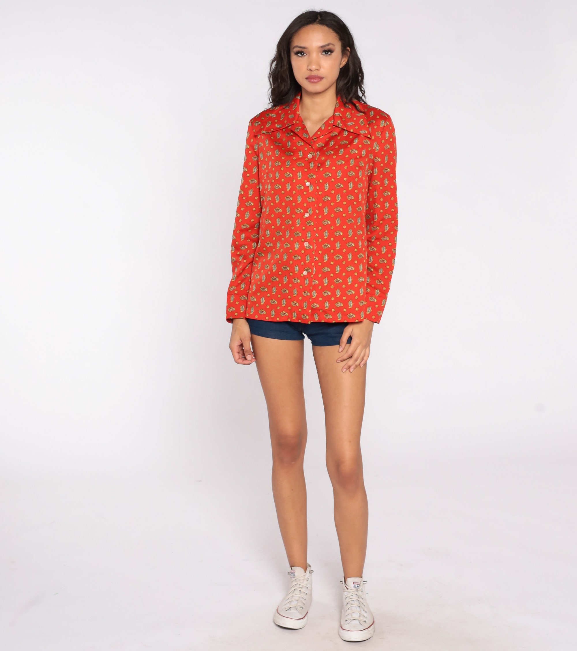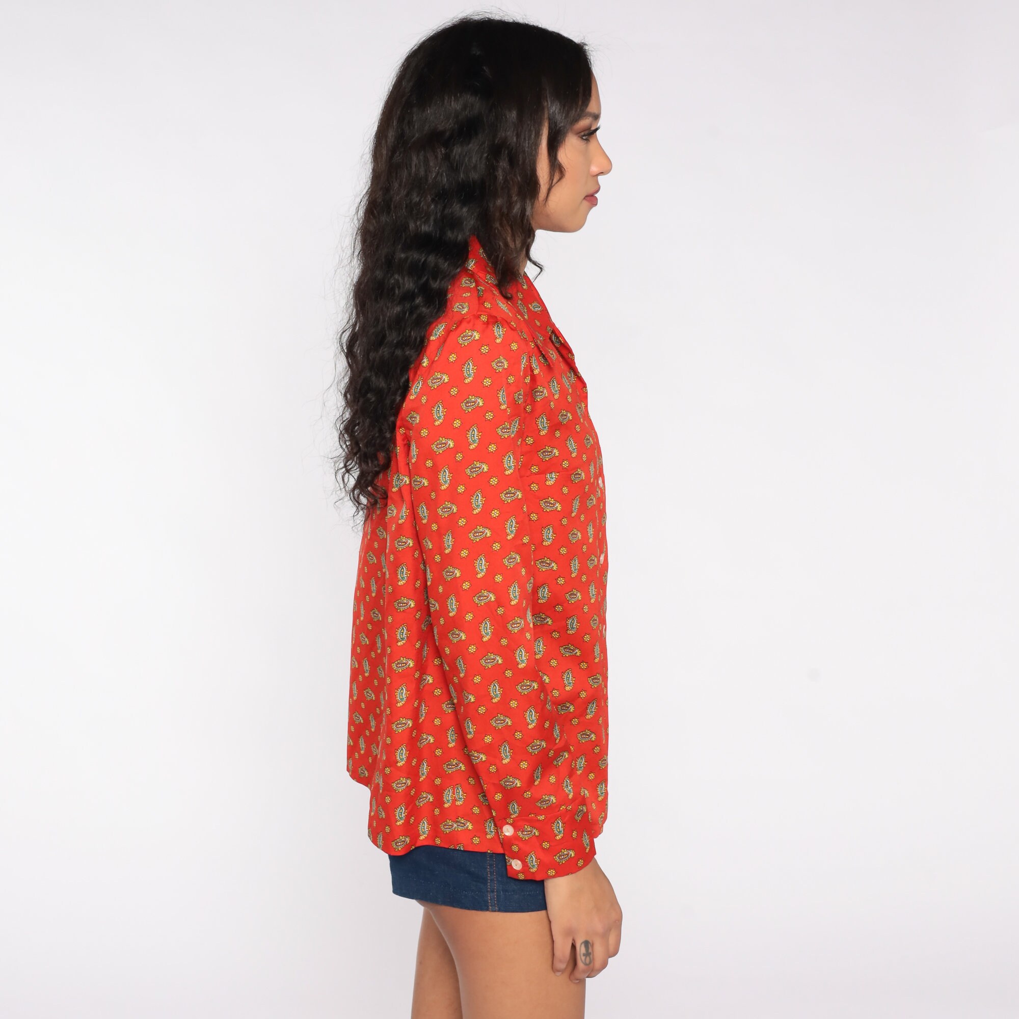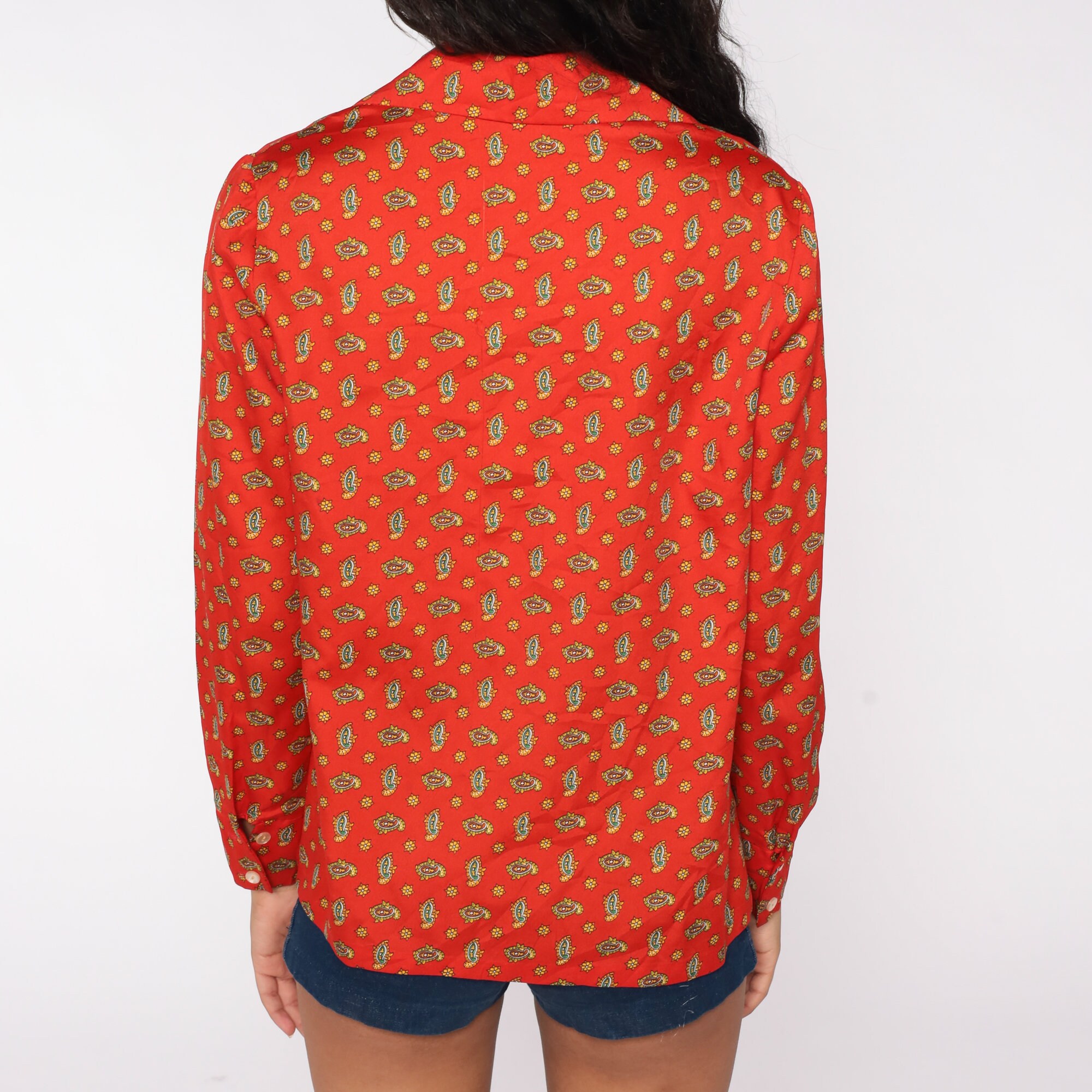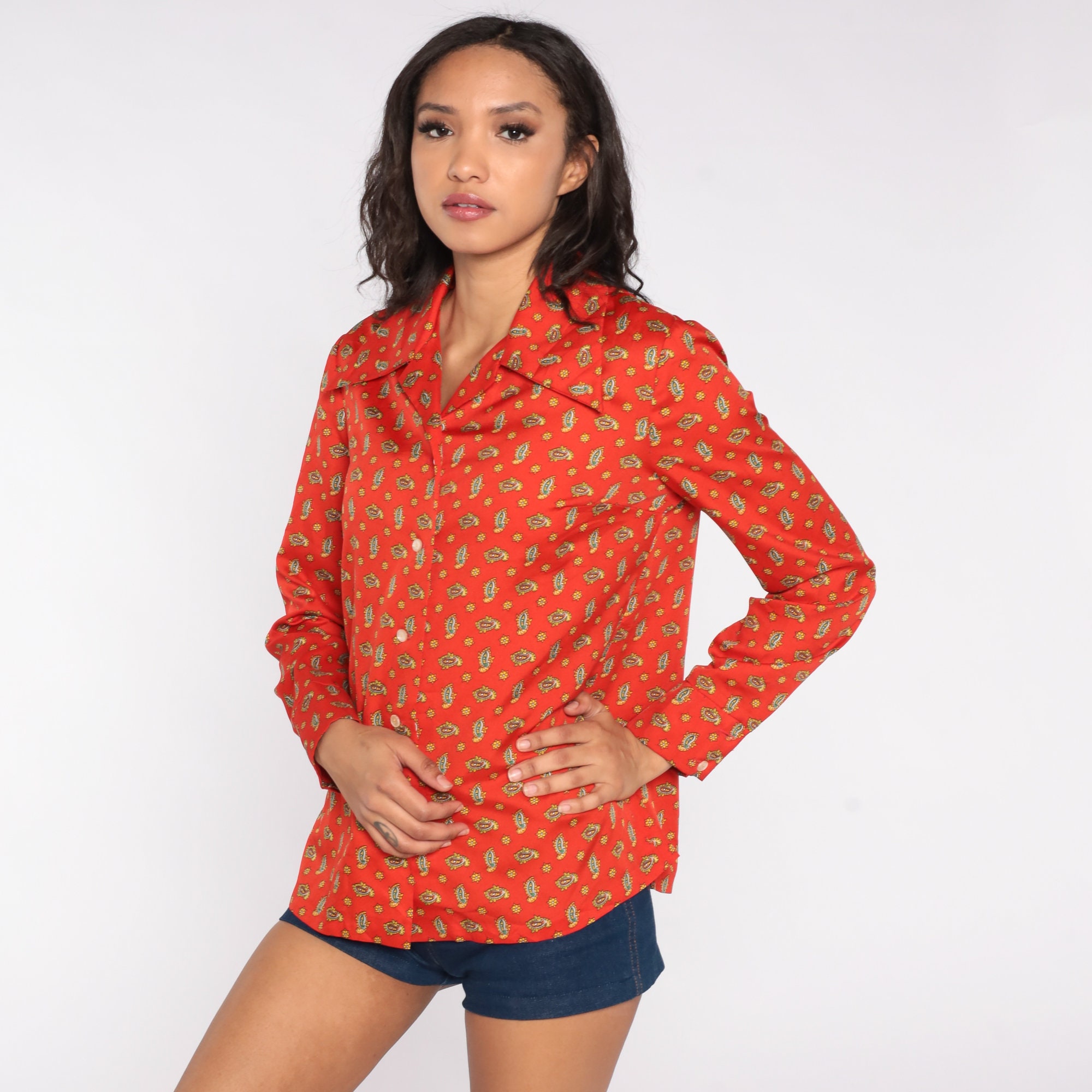 Vintage 70s blouse in a paisley print. Long sleeves, buttons down the front.