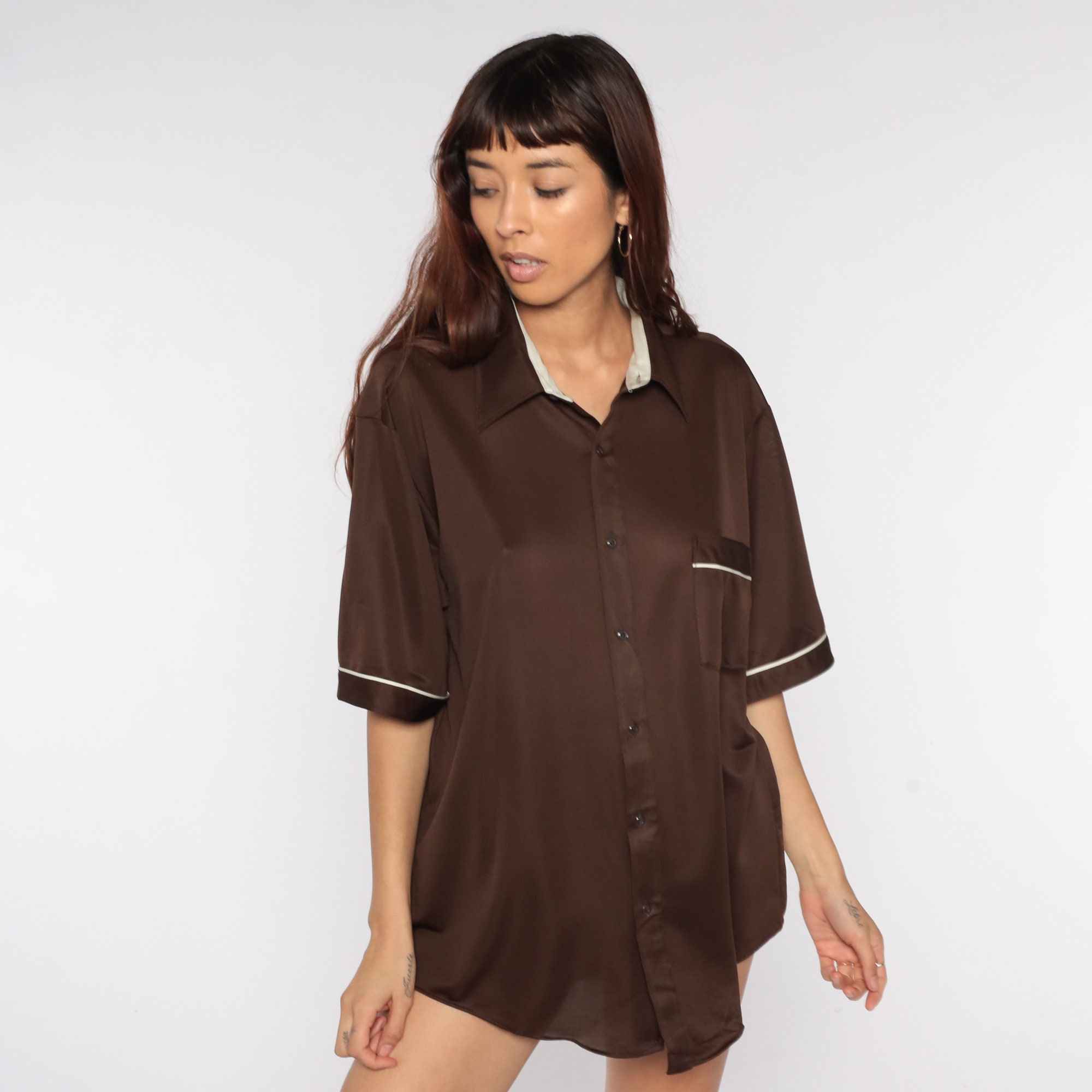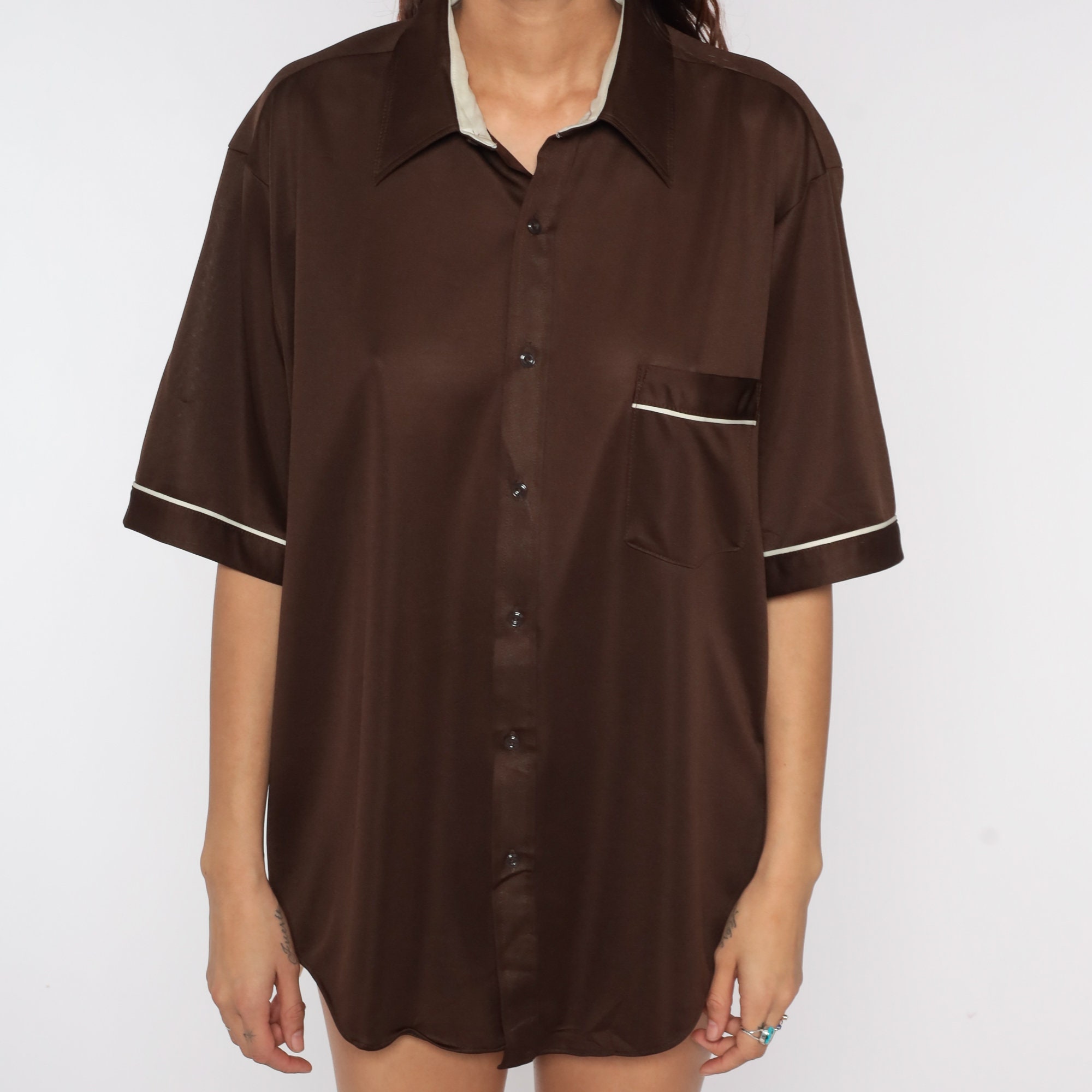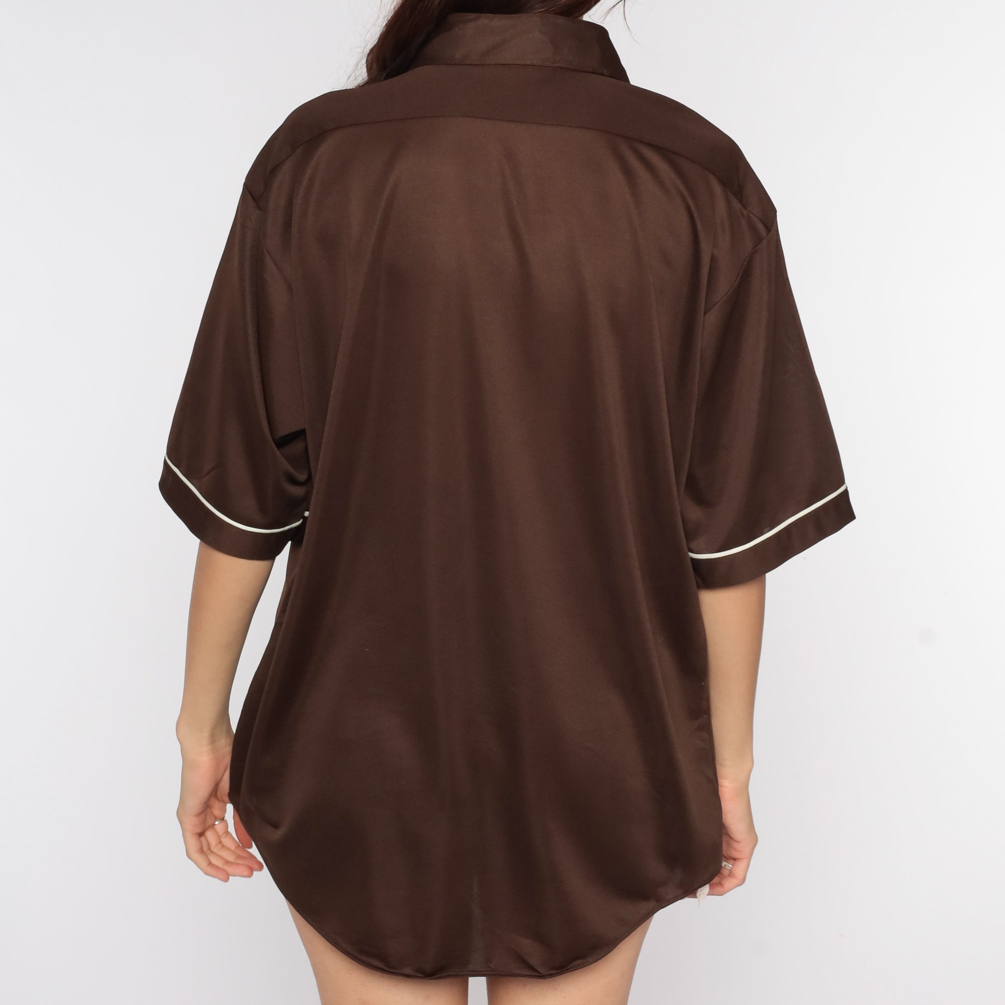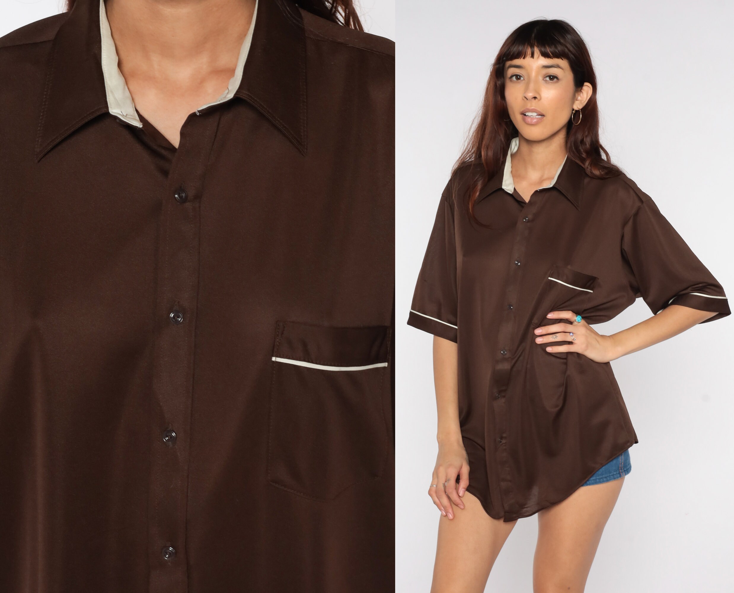 Vintage 70s shirt in brown with white trim. Buttons up the front with a collar and short sleeves. Originally for men.