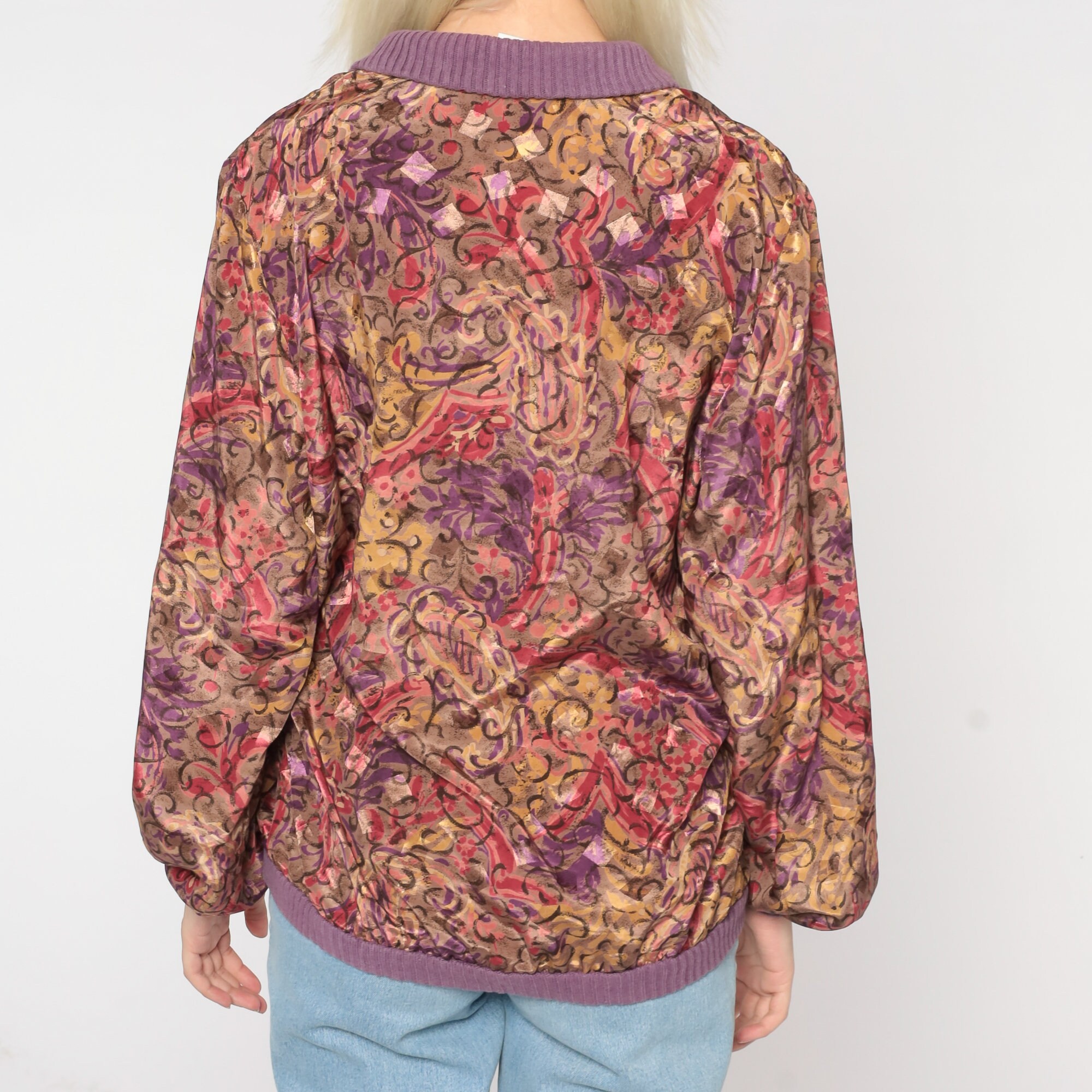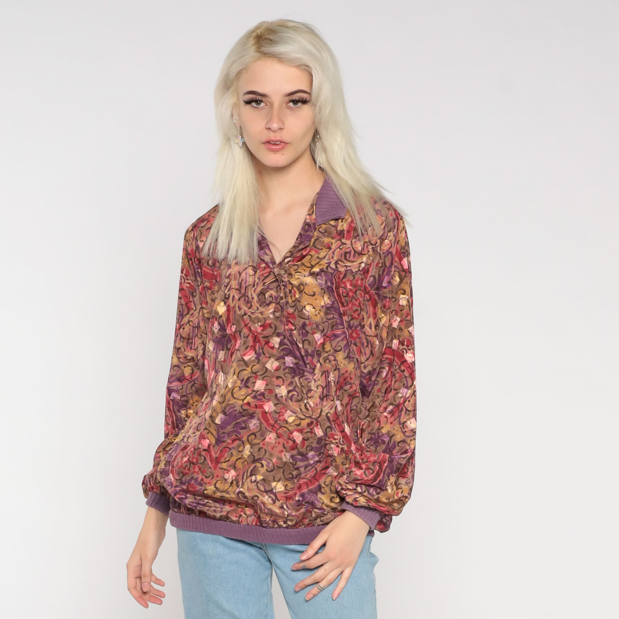 Vintage 80s shirt in an abstract and paisley print with long cuffed sleeves, a collar, and a banded hem.