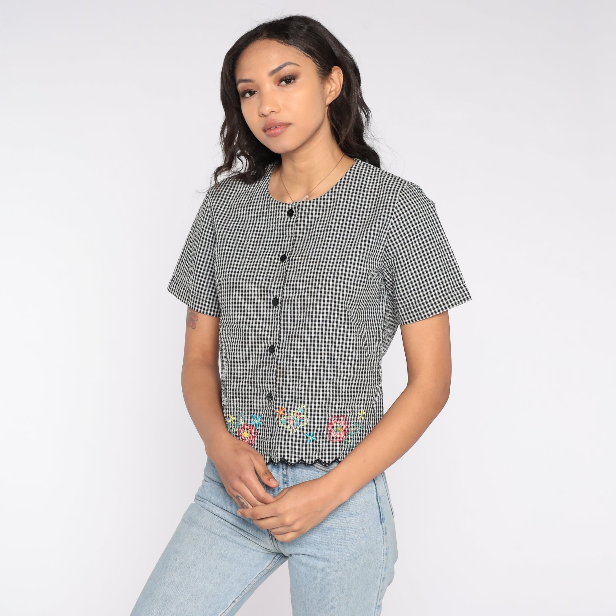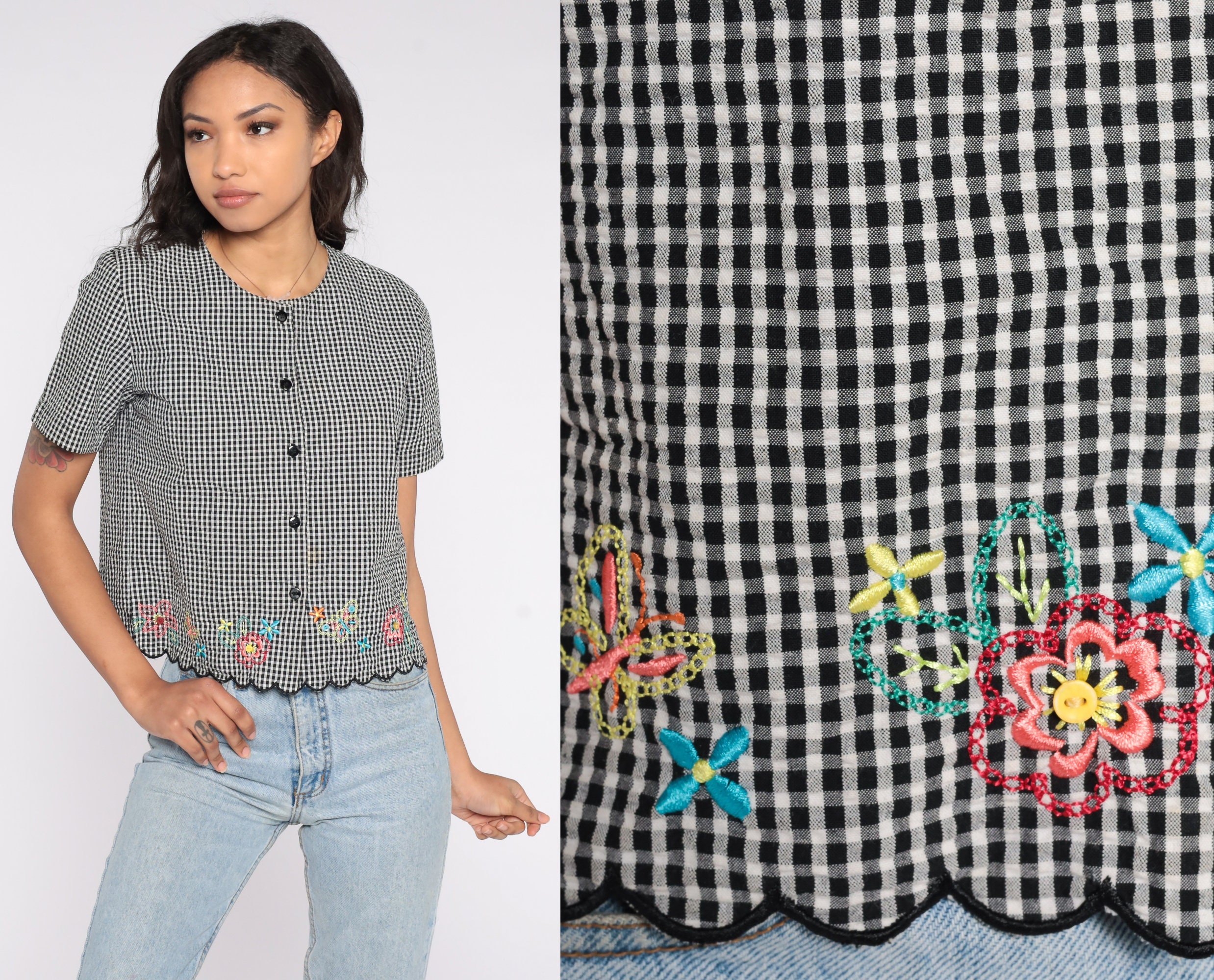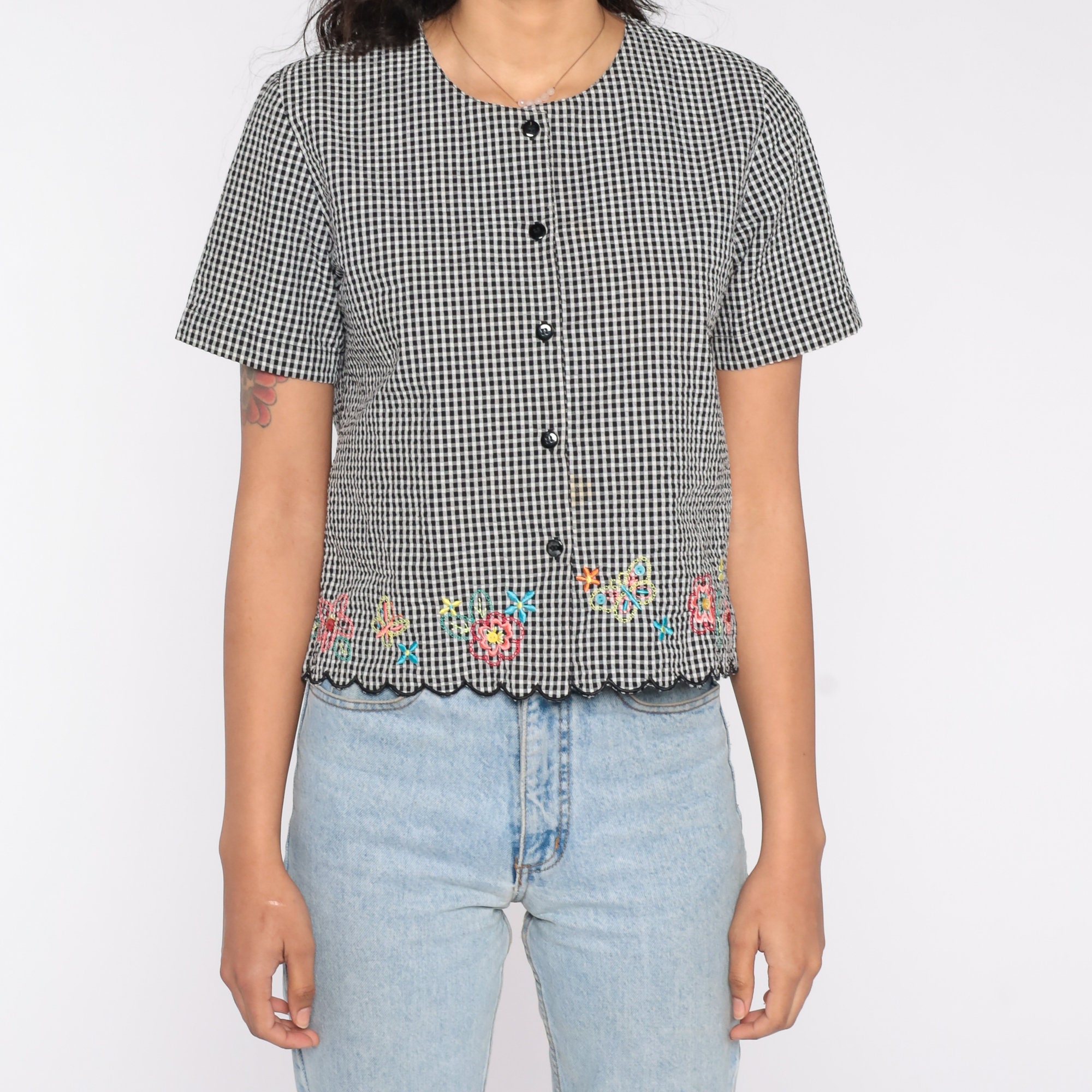 Vintage 90s shirt in a black gingham print with floral embroidery and a scalloped hem. Buttons up the front with short sleeves.