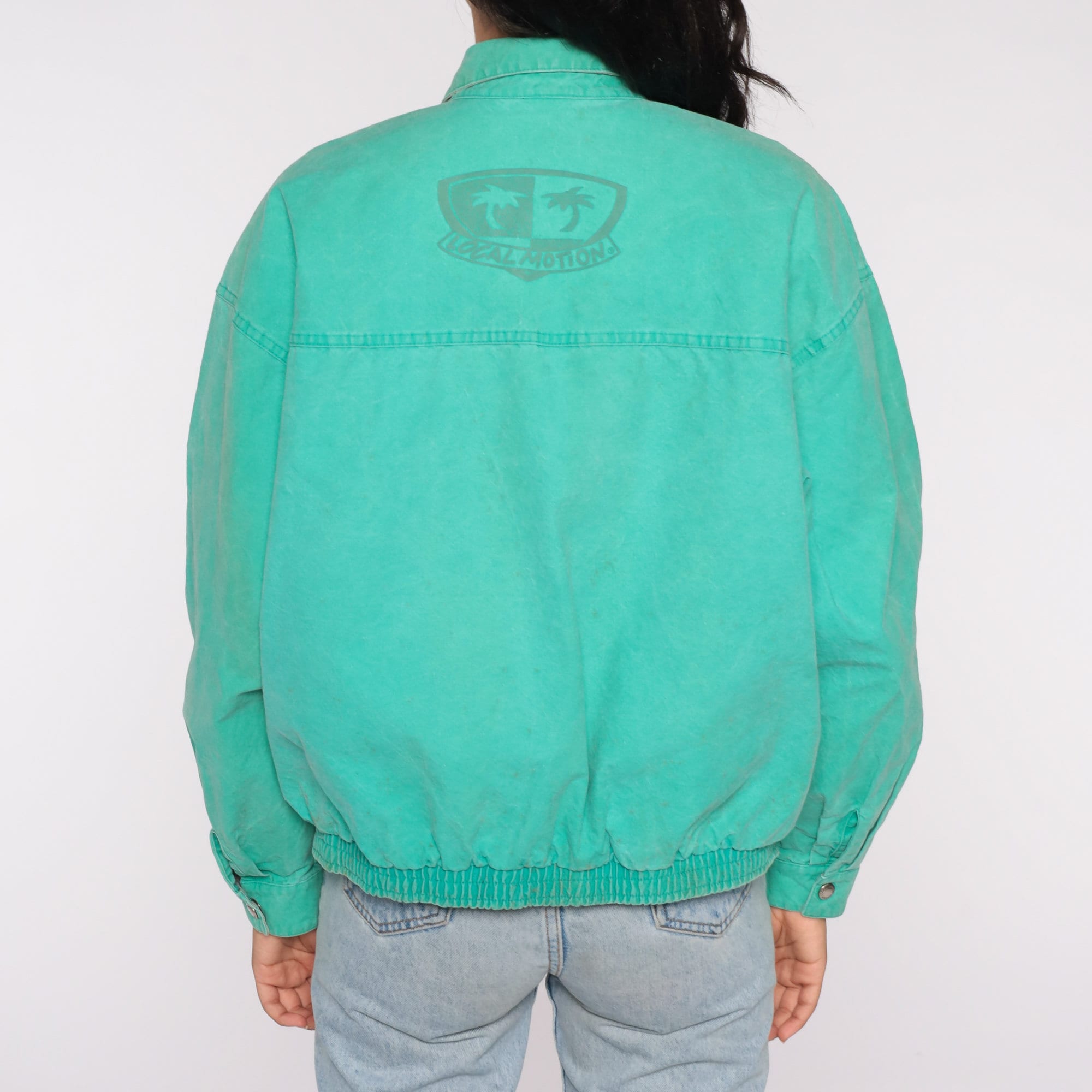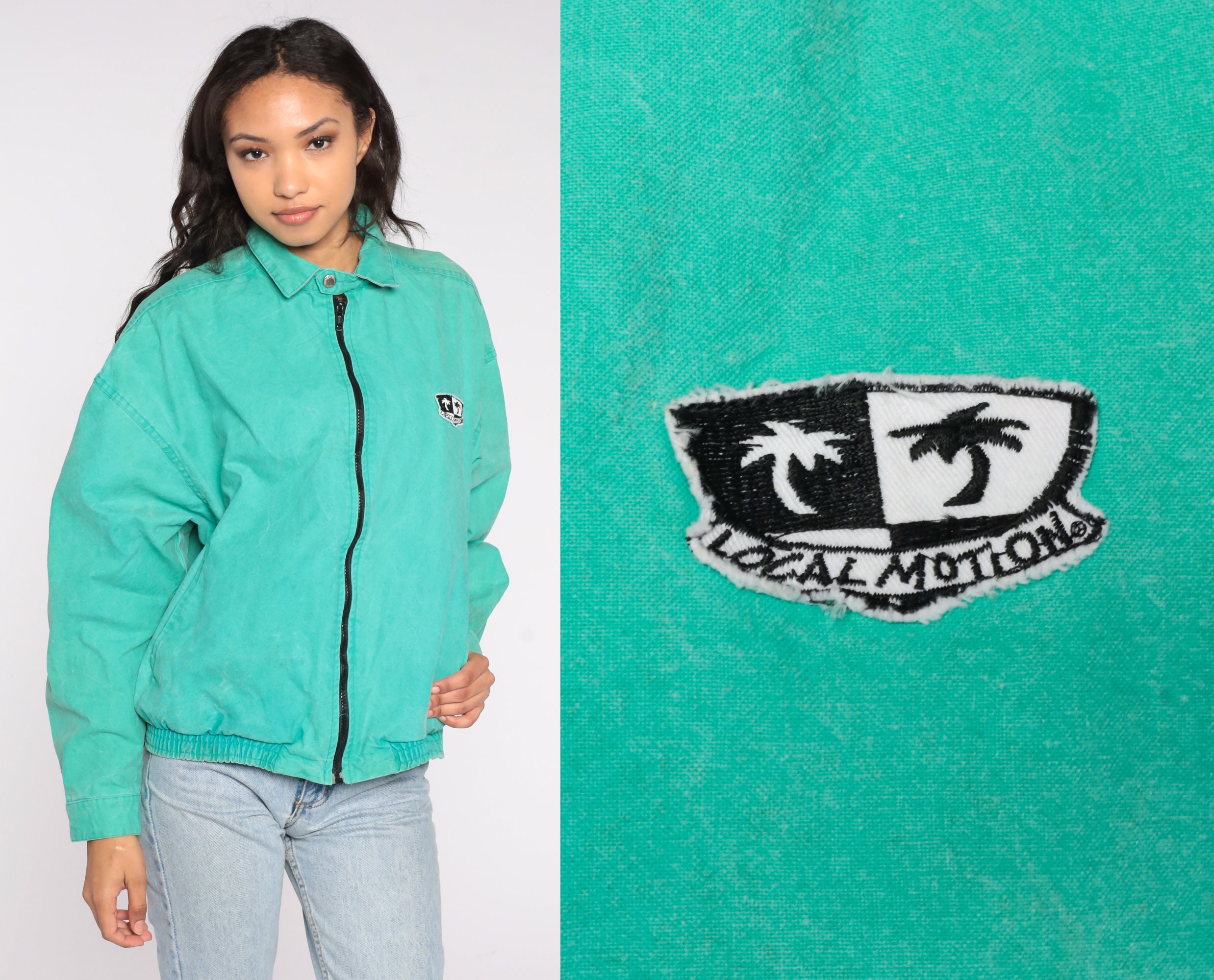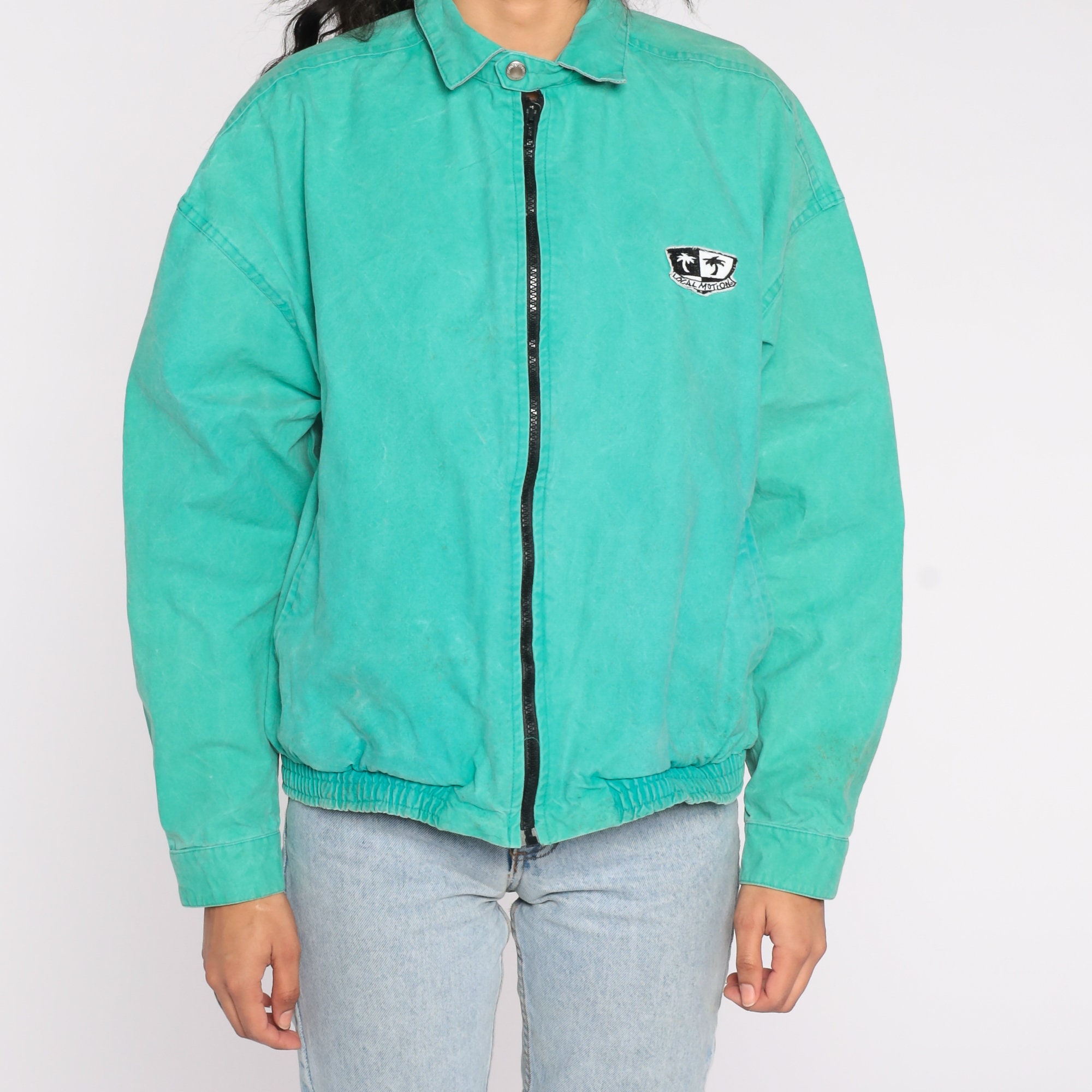 Vintage 90s windbreaker jacket in bright green with a Local Motion logo on the front and back. Zips up the front.