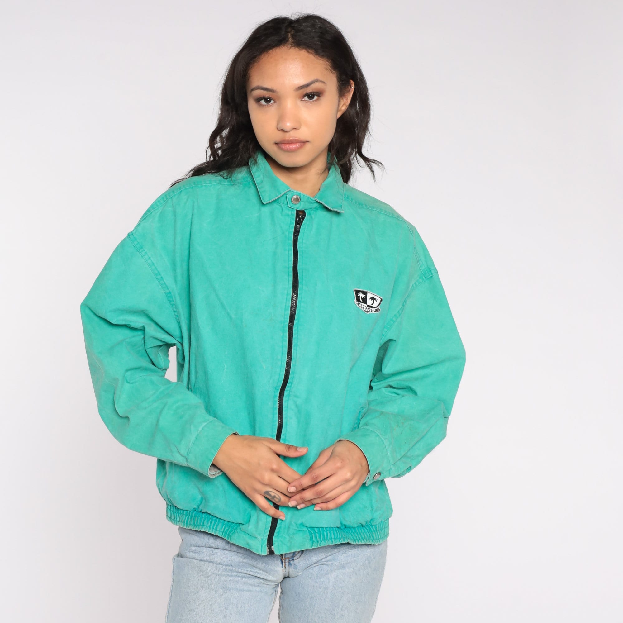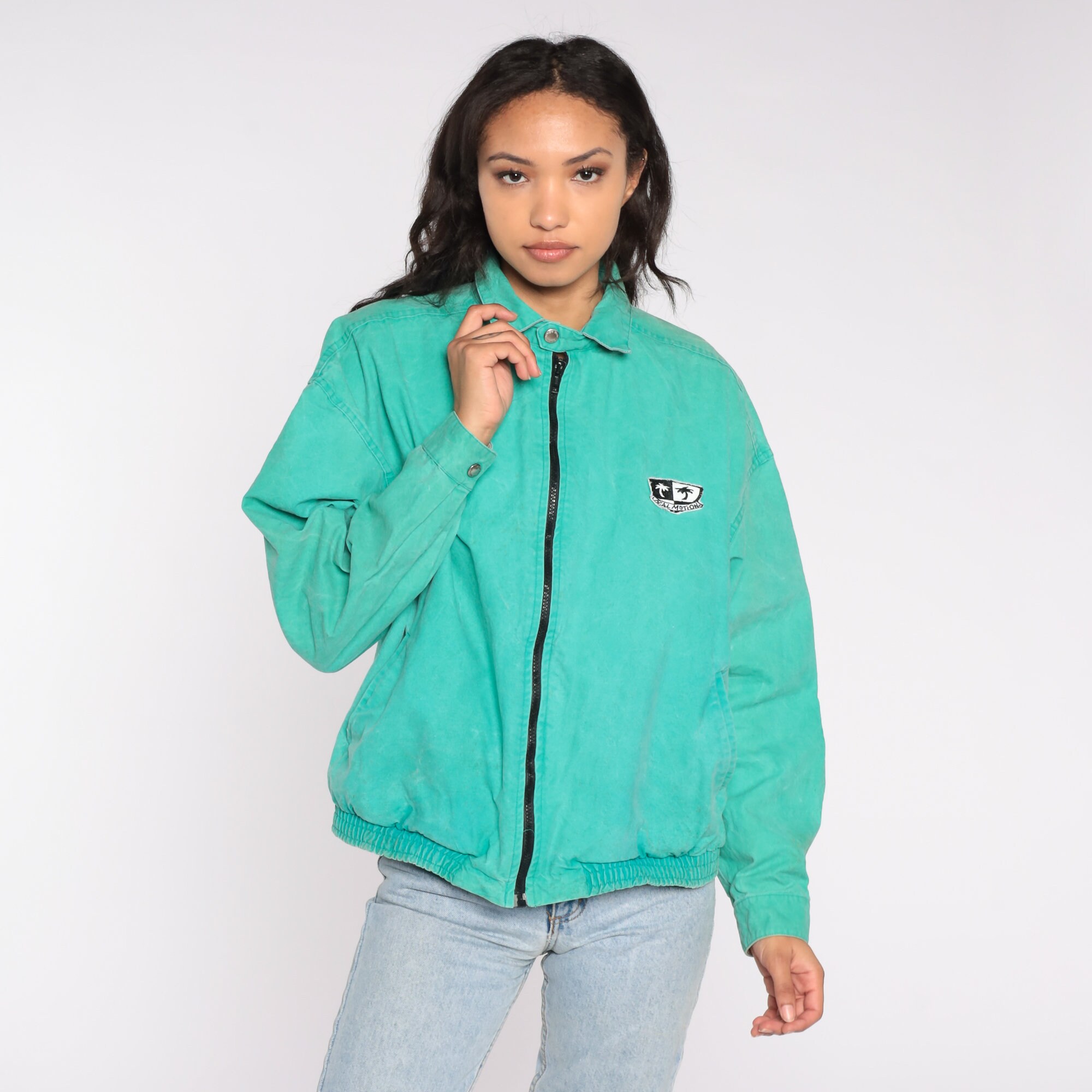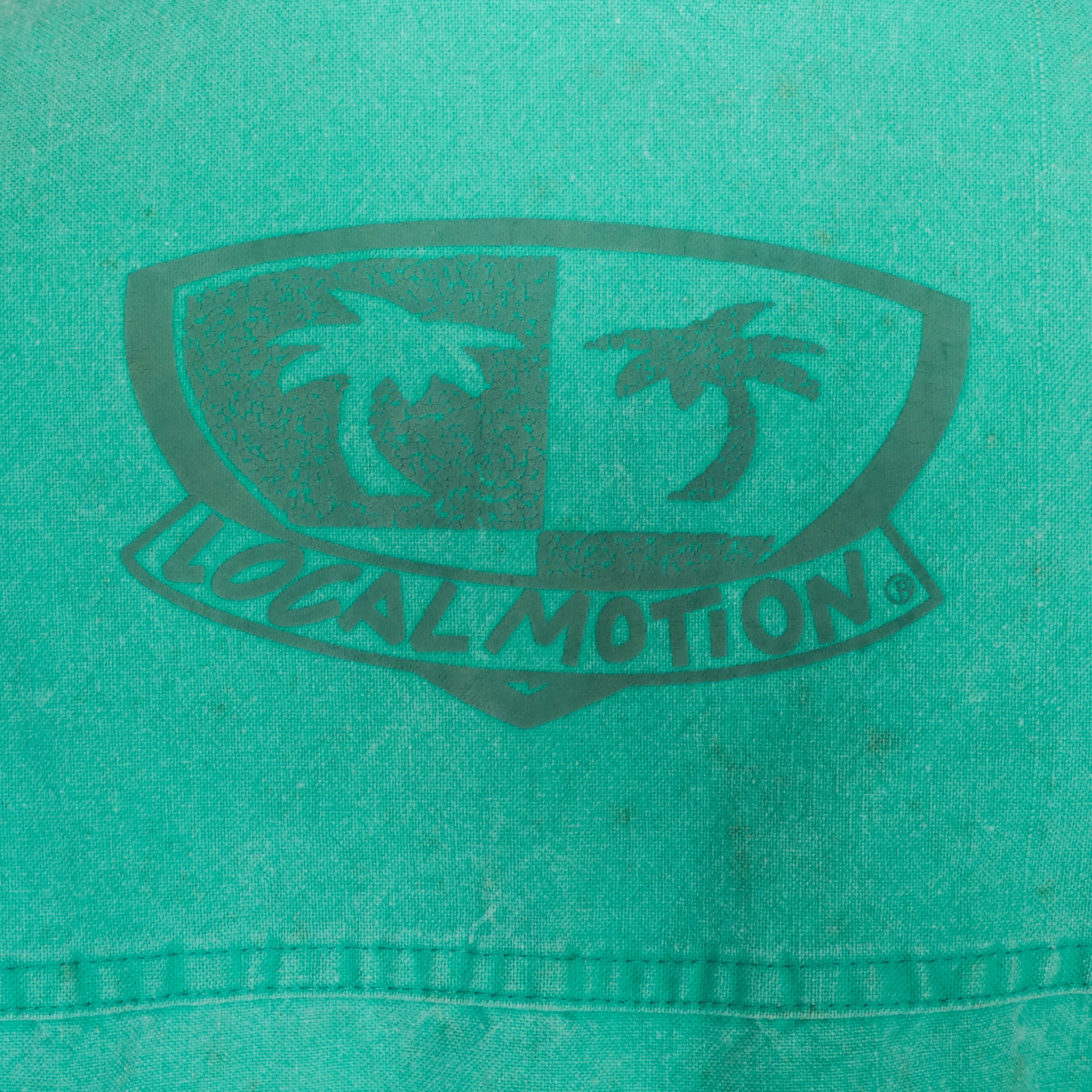 Vintage 90s windbreaker jacket in bright green with a Local Motion logo on the front and back. Zips up the front.