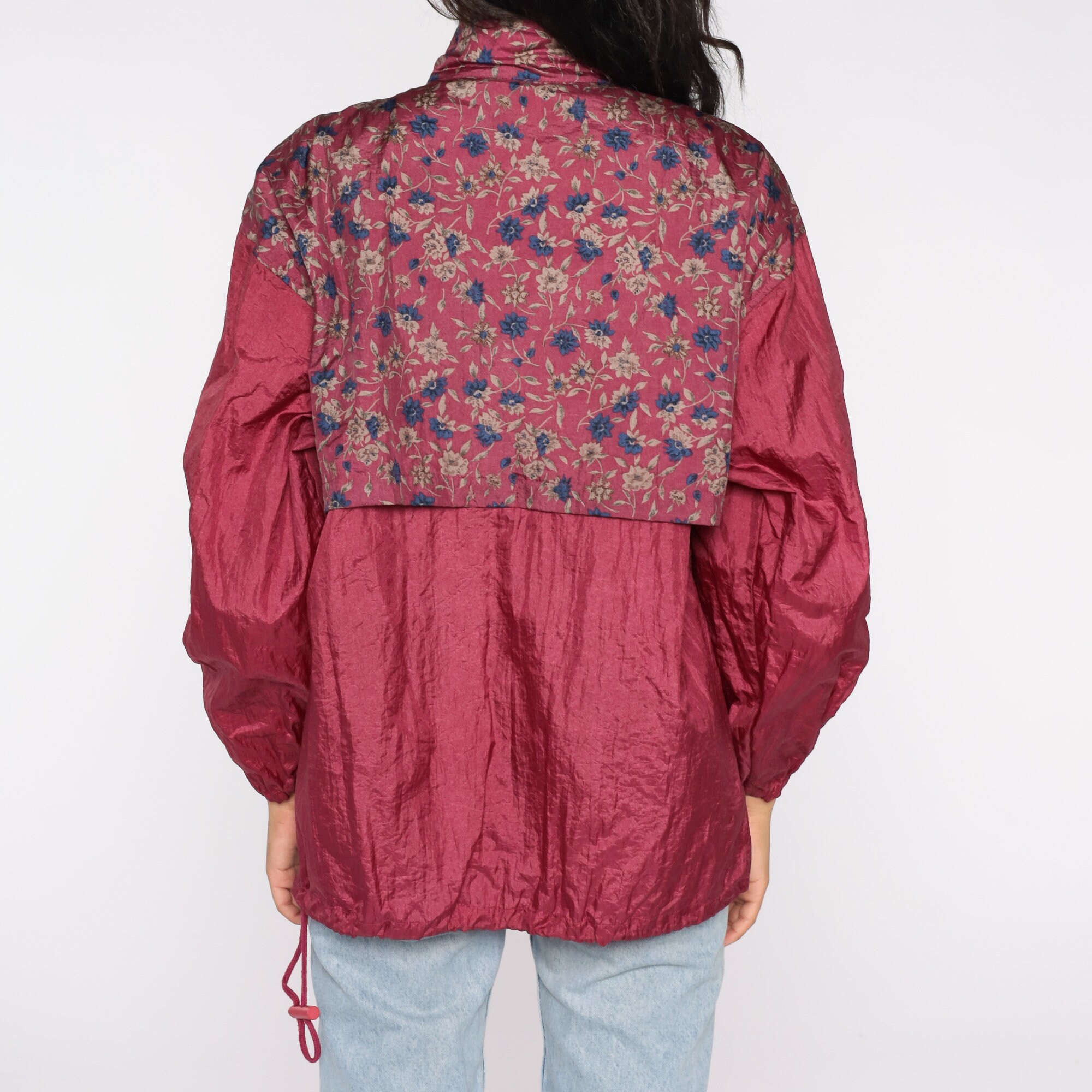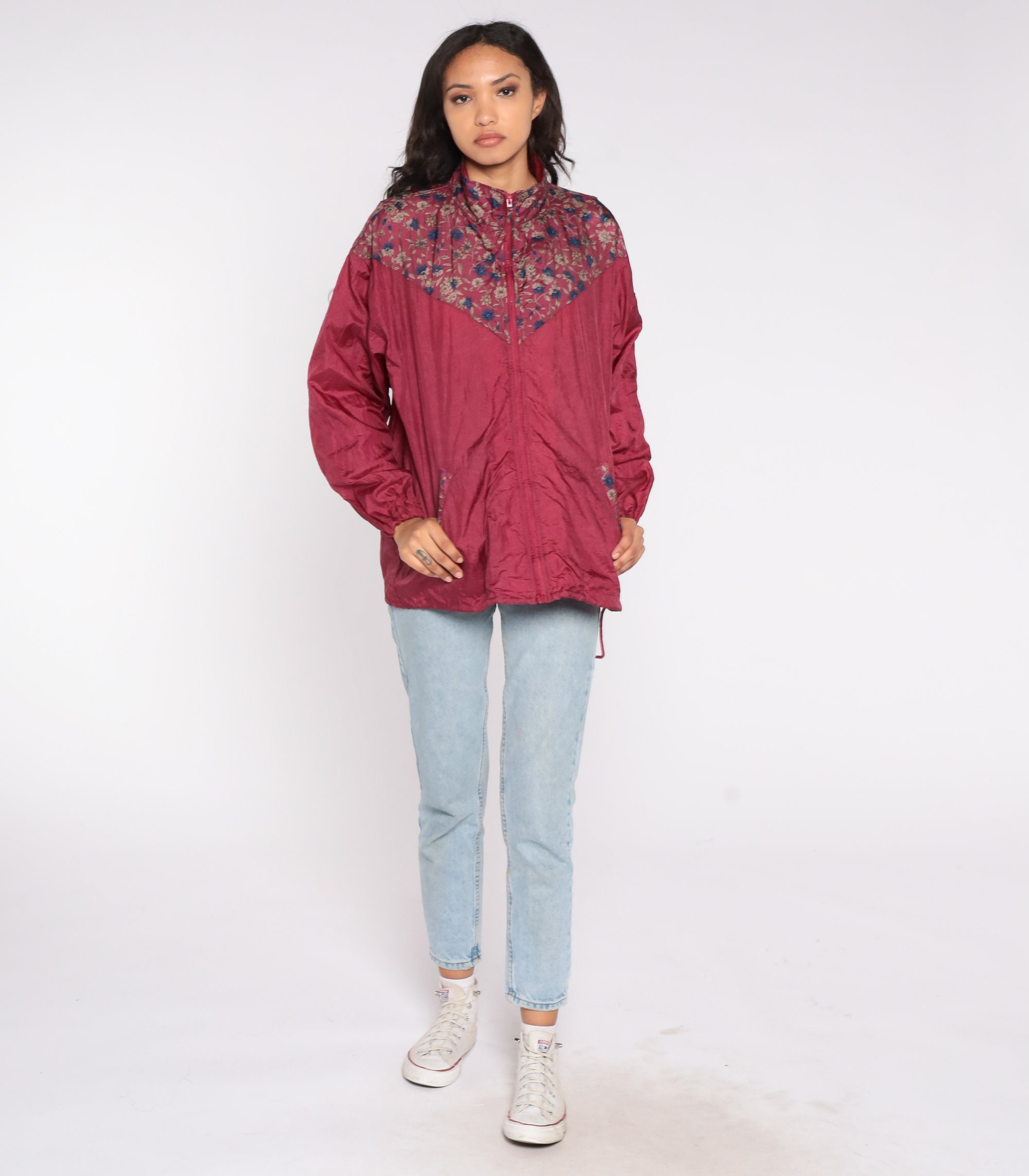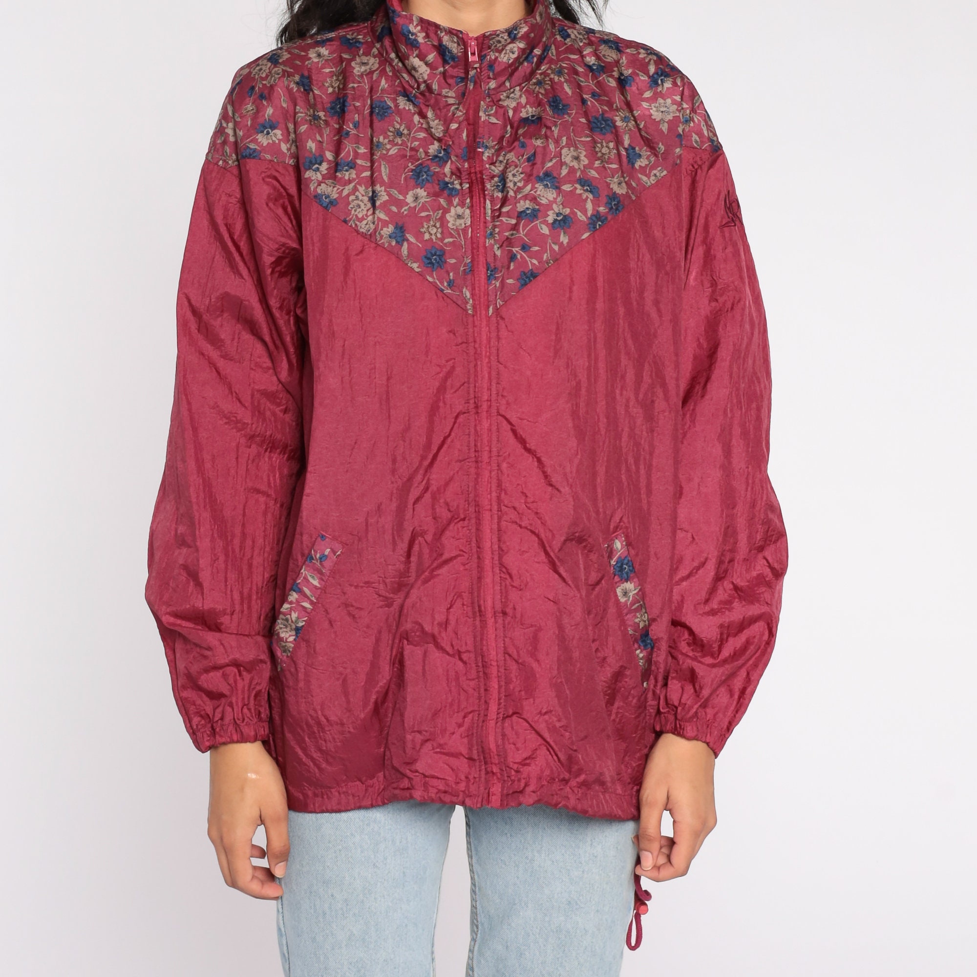 Vintage 90s windbreaker jacket in red with floral panels on the chest and back. Zips up the front.