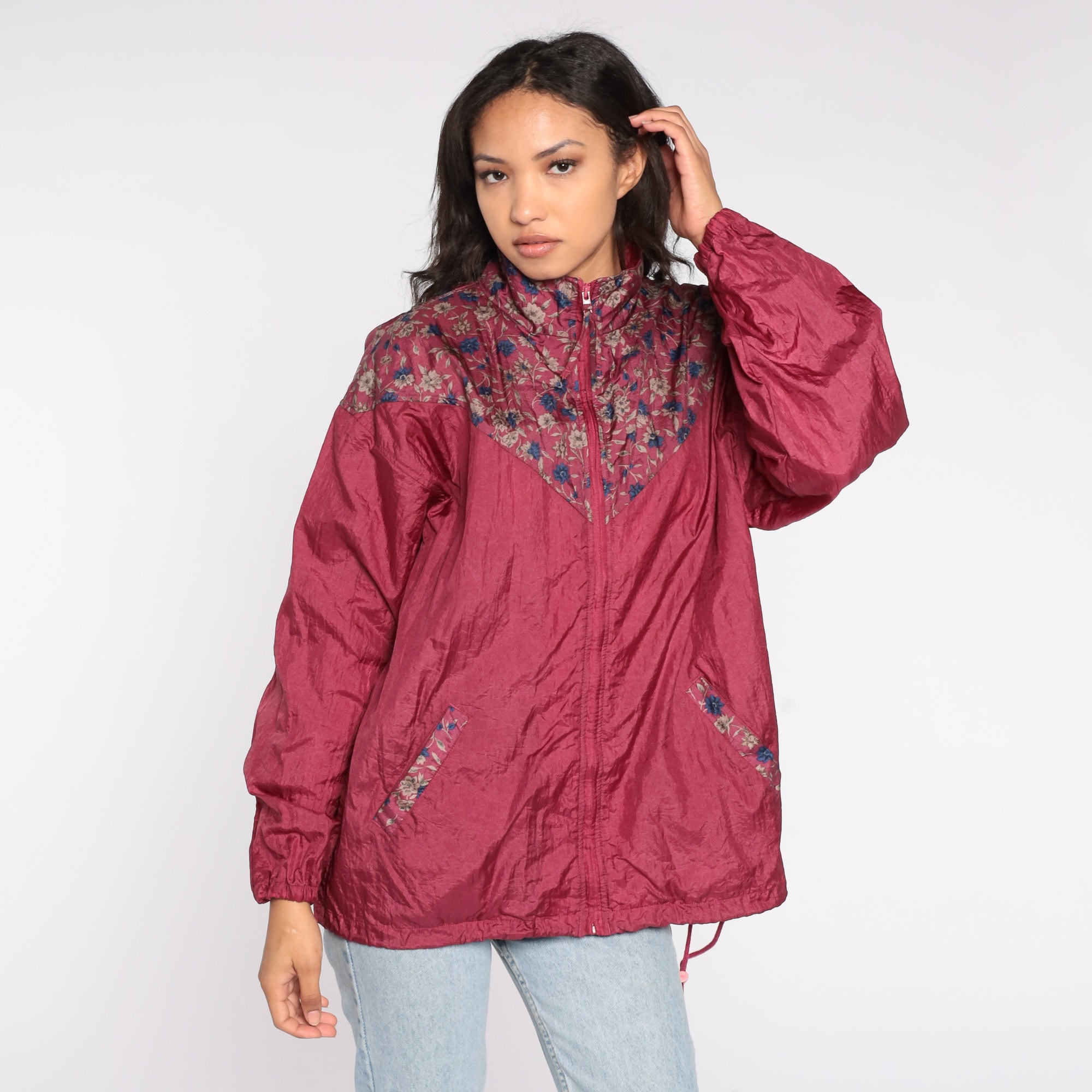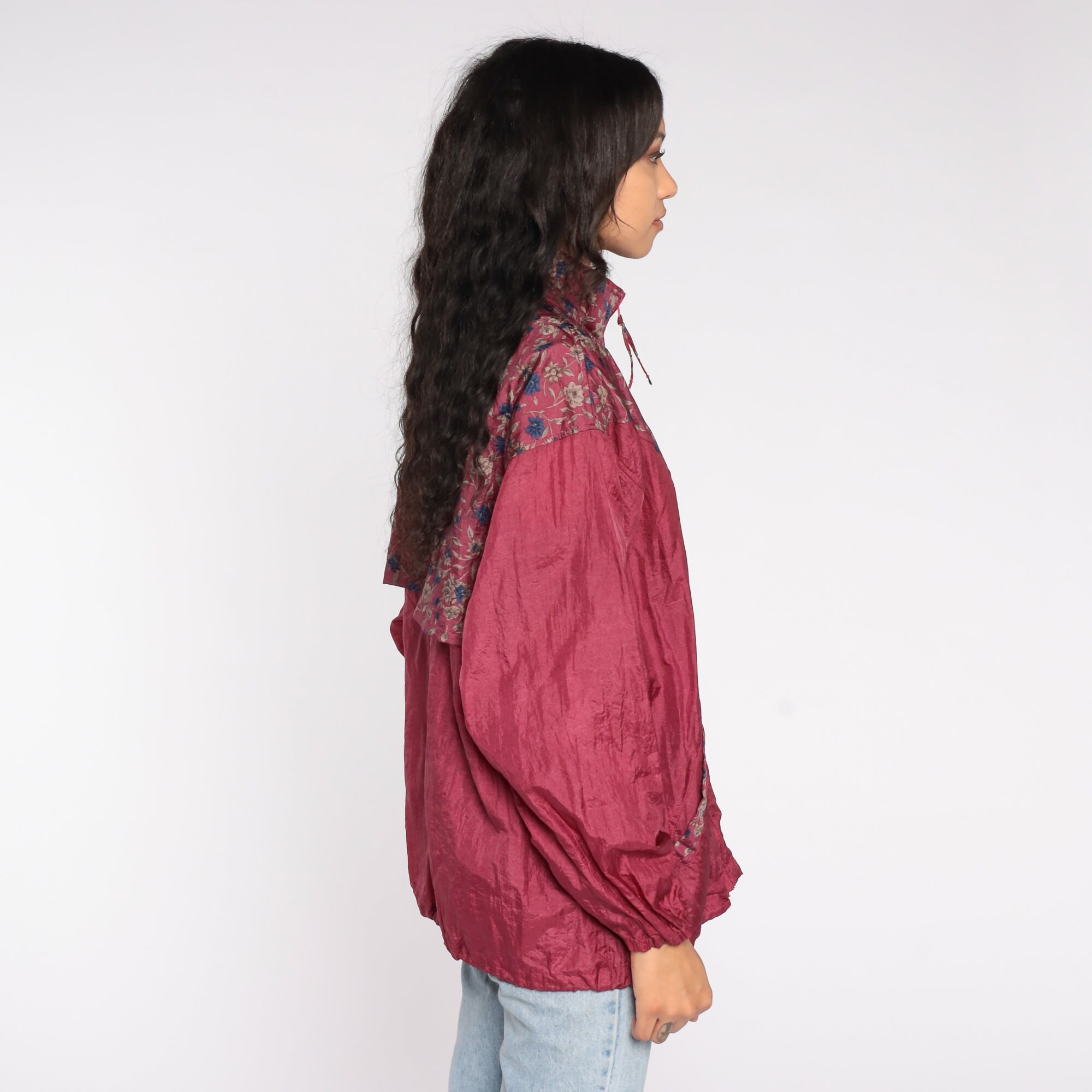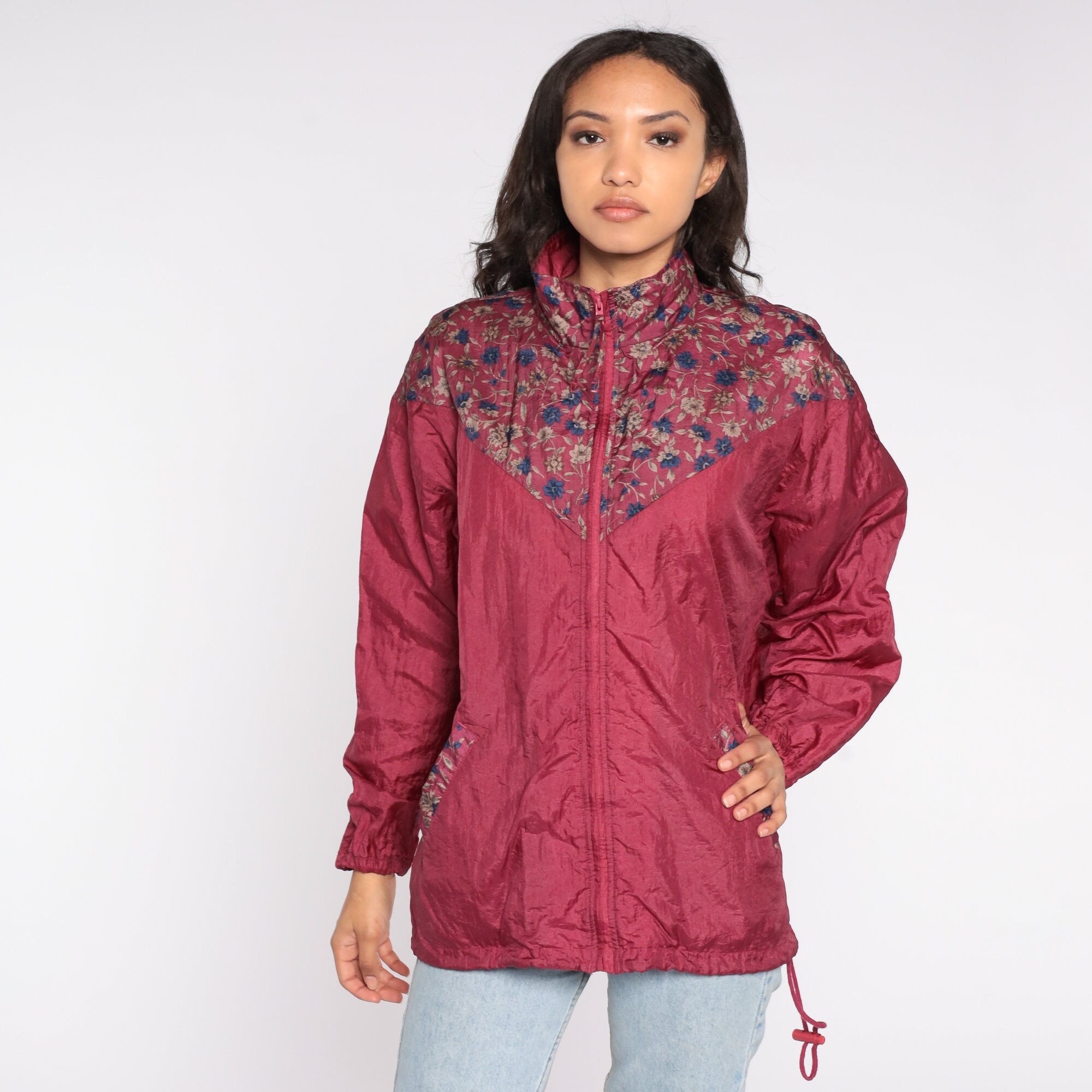 Vintage 90s windbreaker jacket in red with floral panels on the chest and back. Zips up the front.