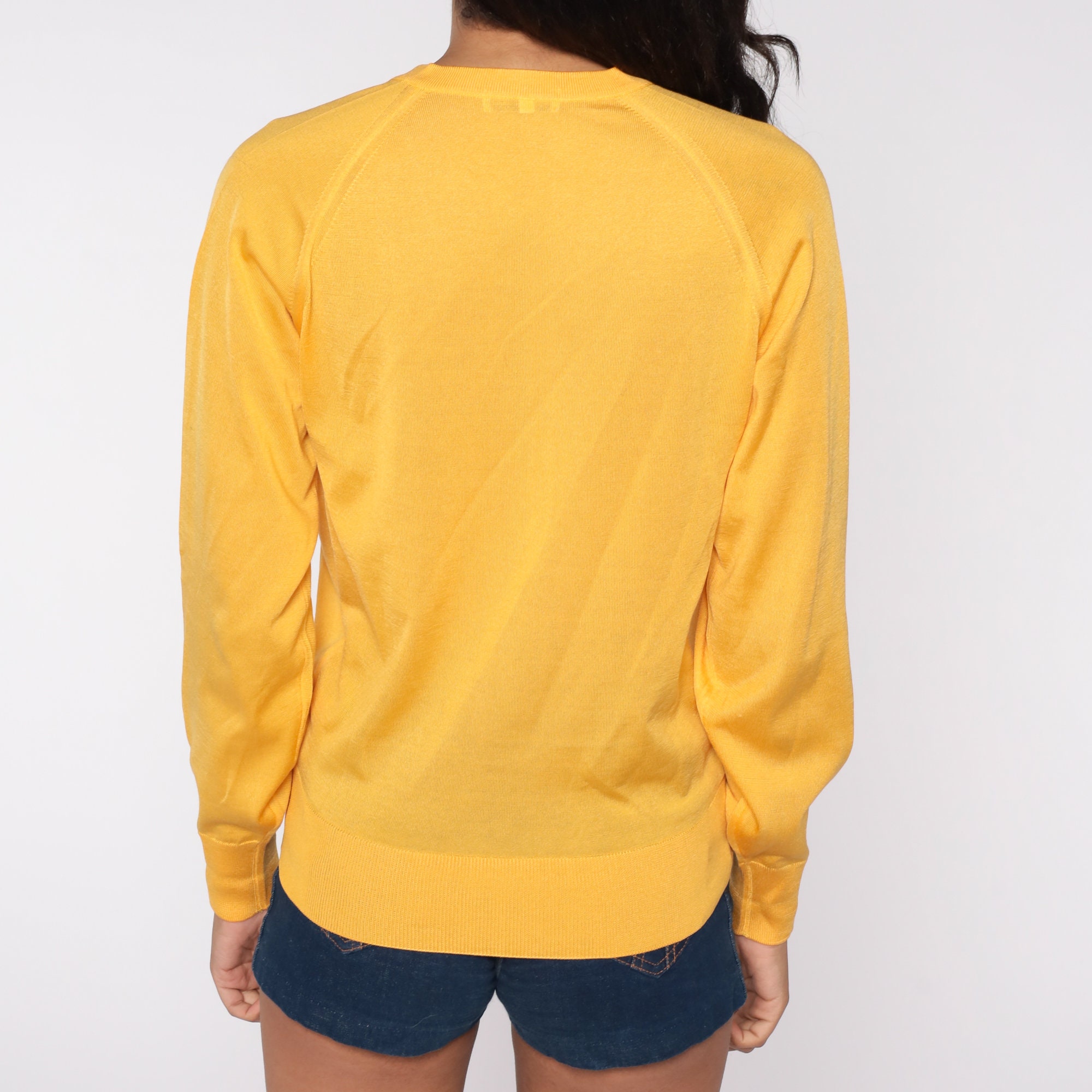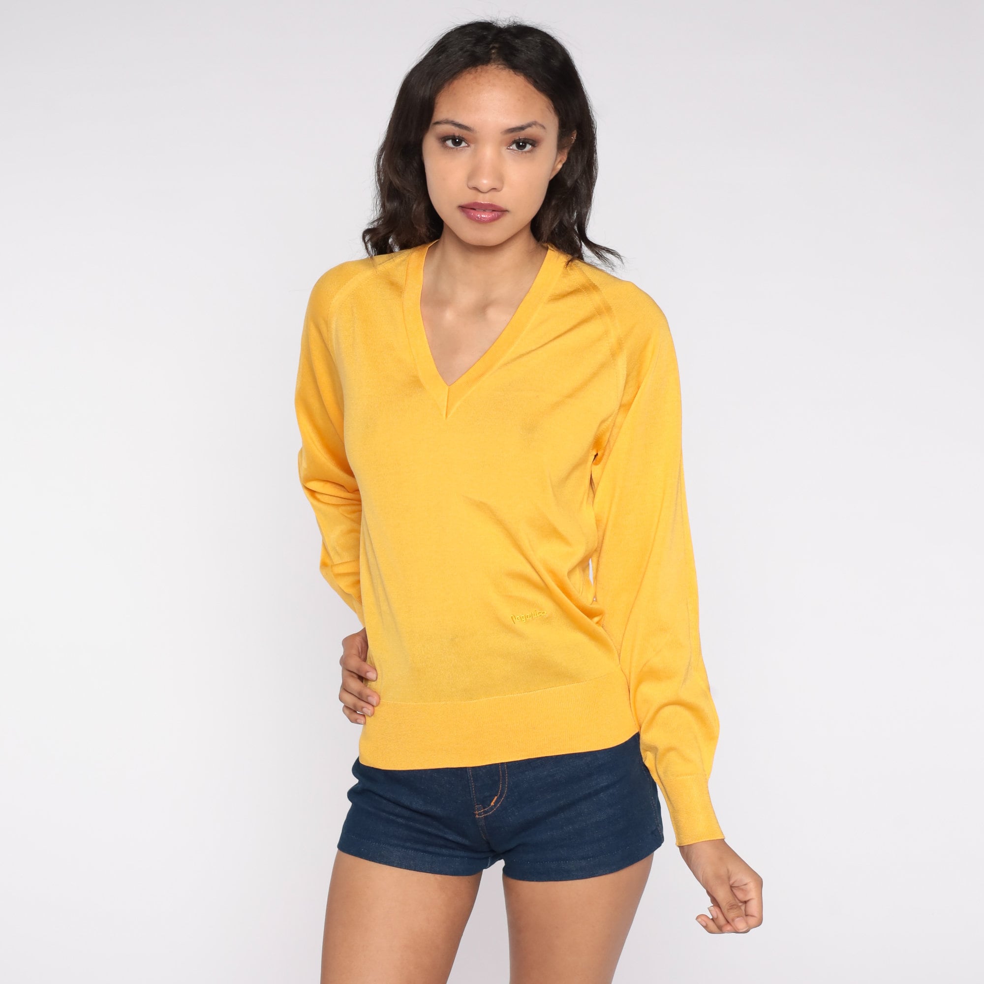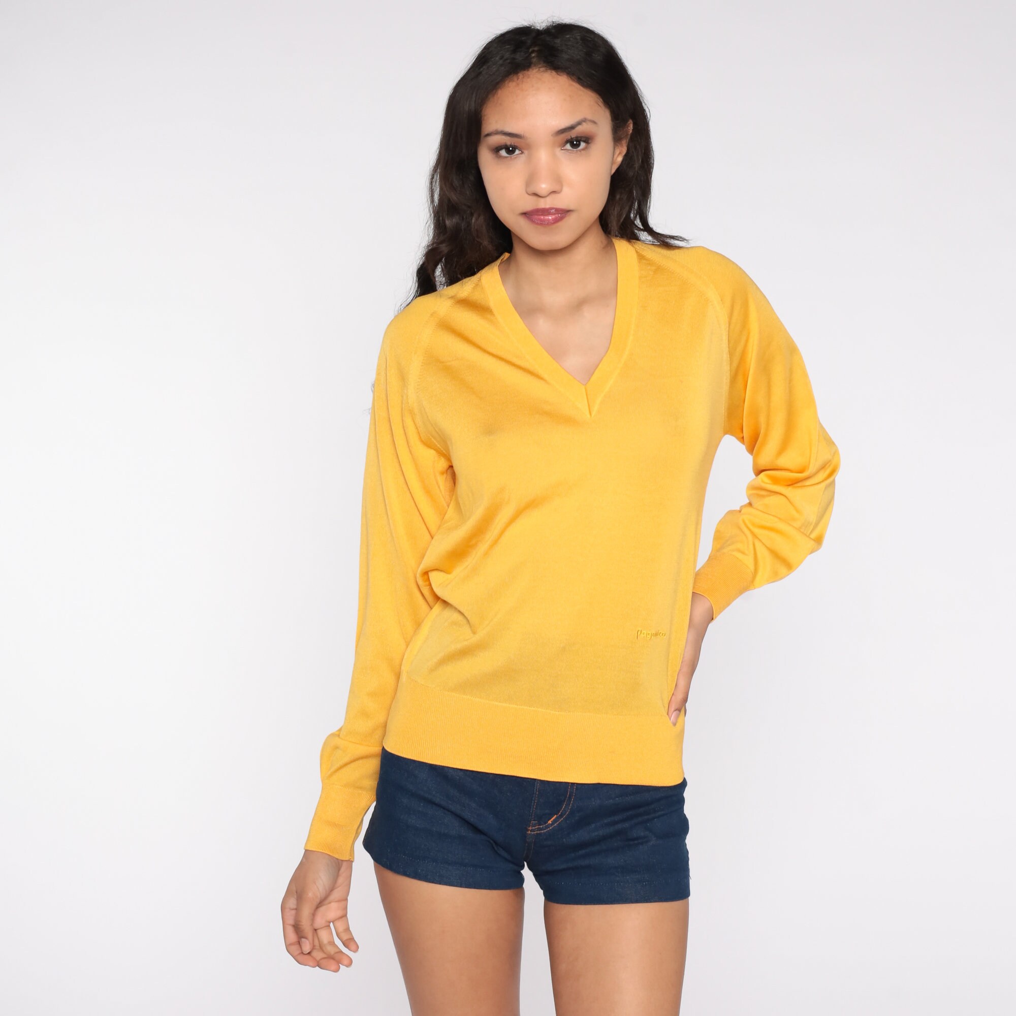 Vintage 80s sweater in yellow polyester with Paganica embroidered on the side and raglan sleeves.
