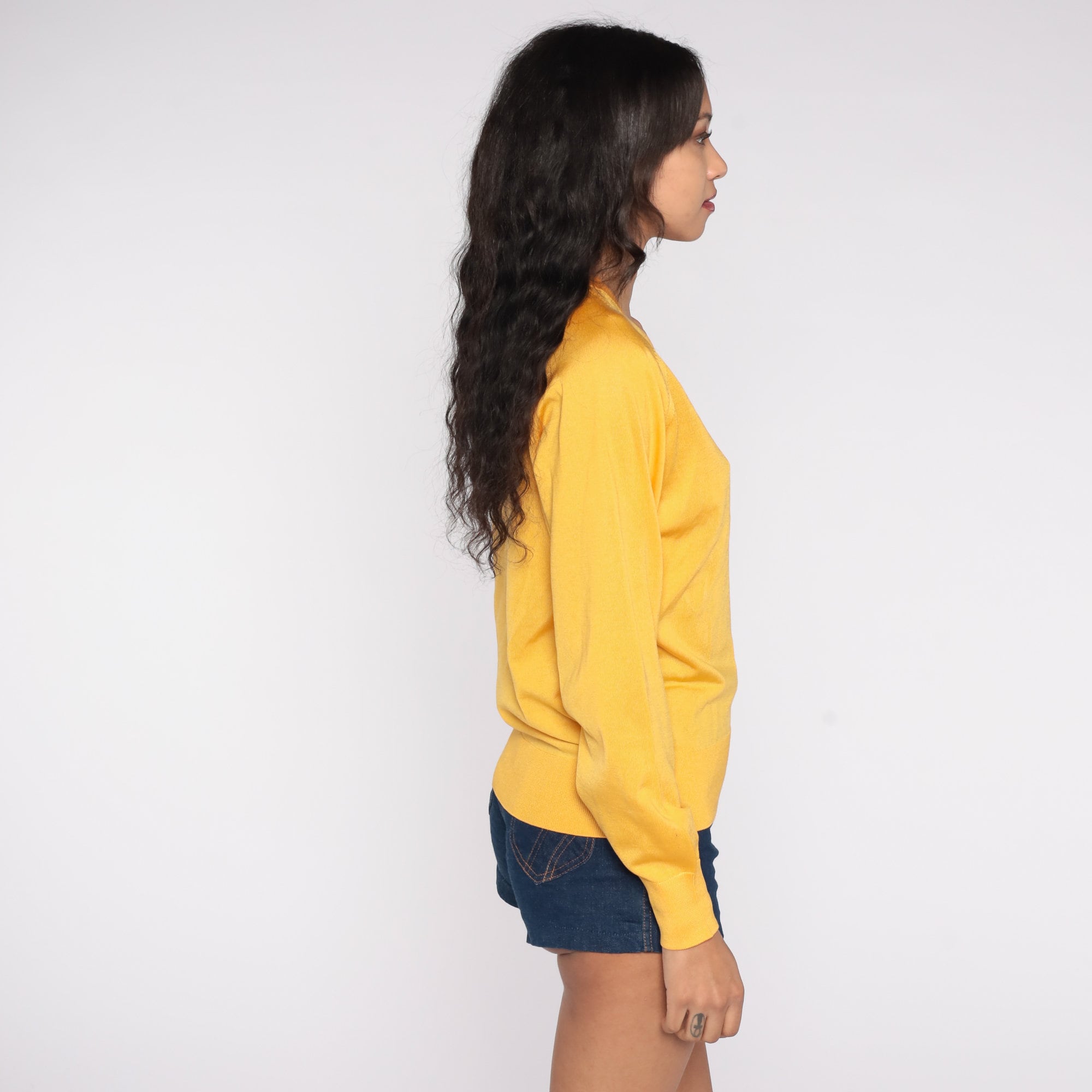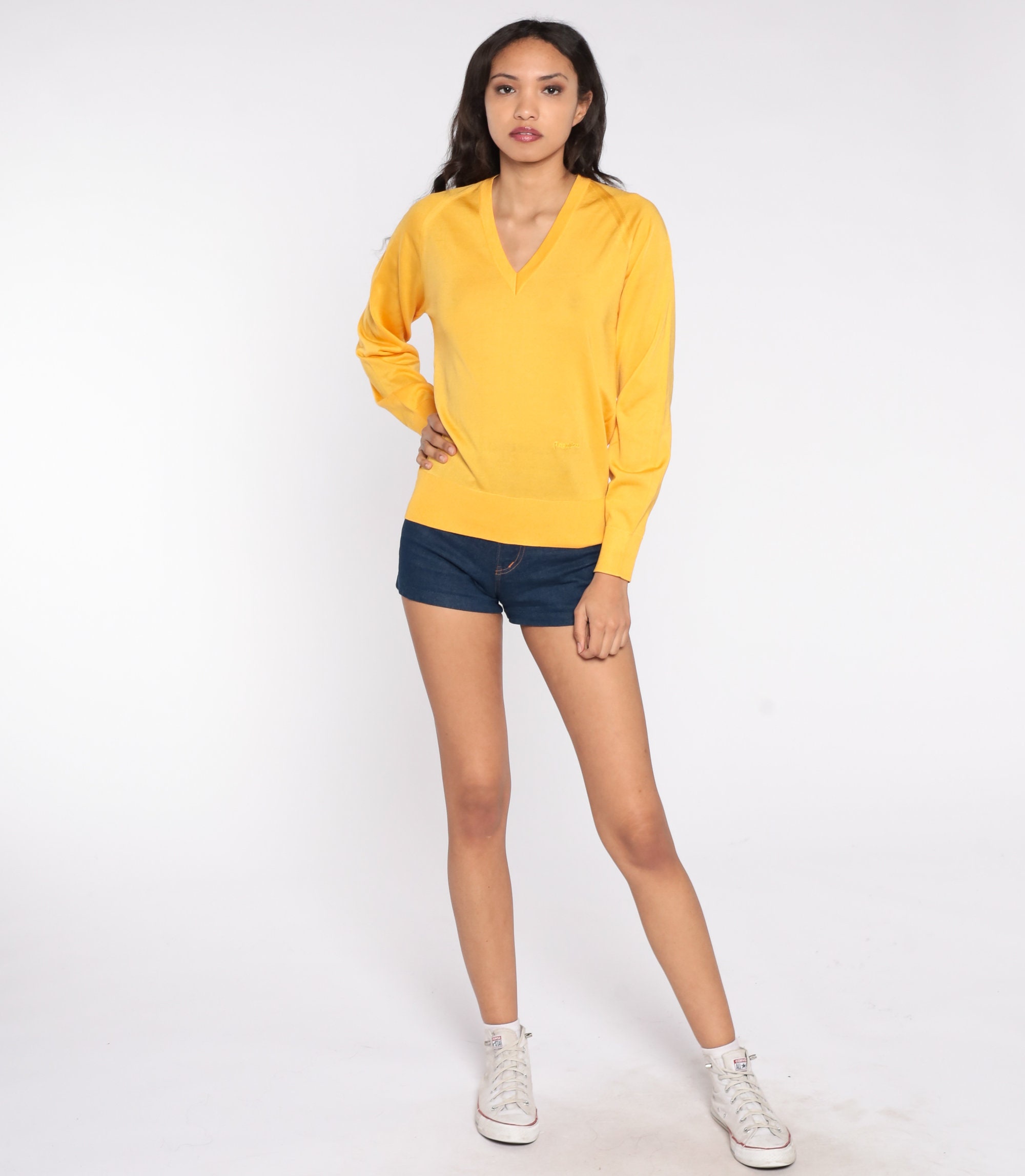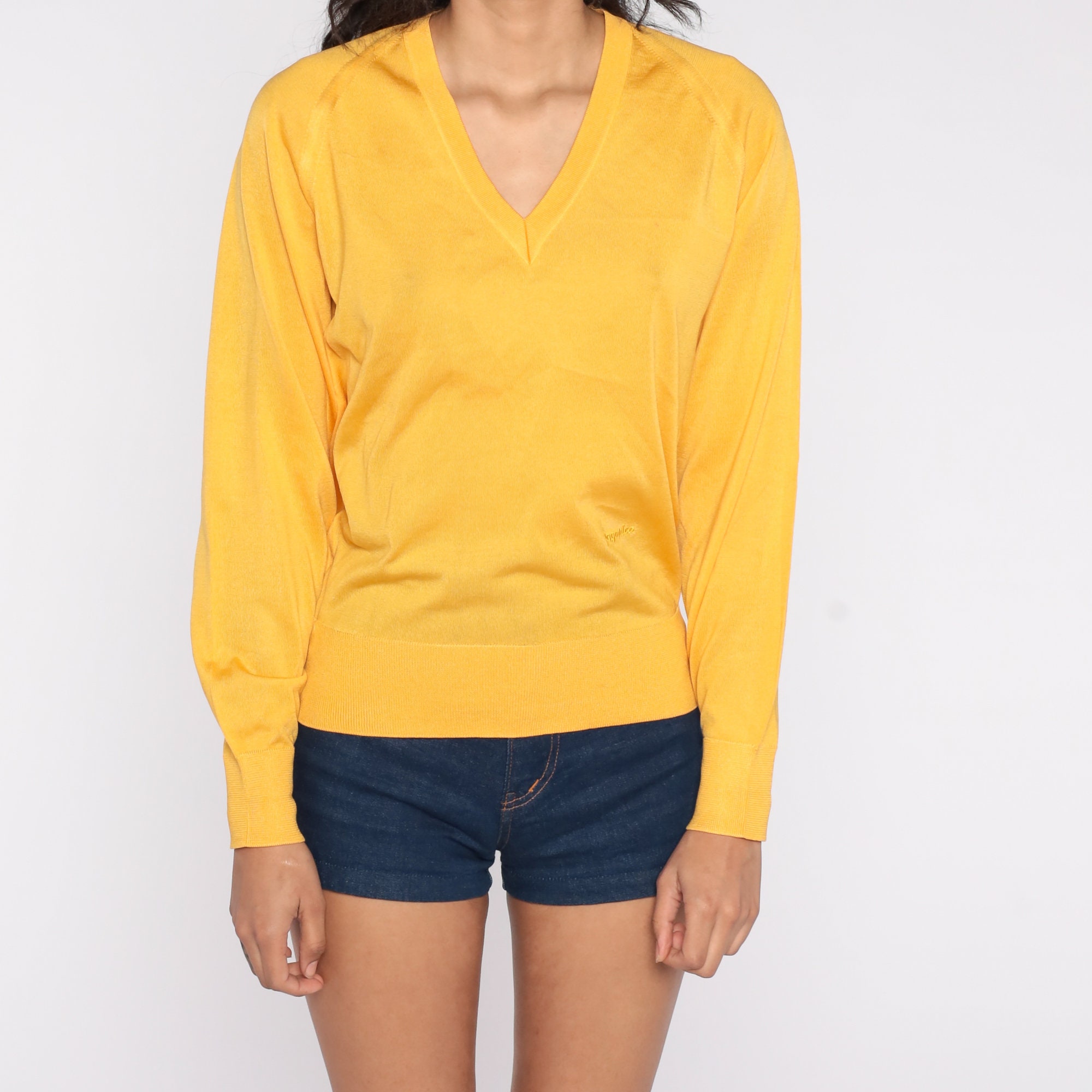 Vintage 80s sweater in yellow polyester with Paganica embroidered on the side and raglan sleeves.