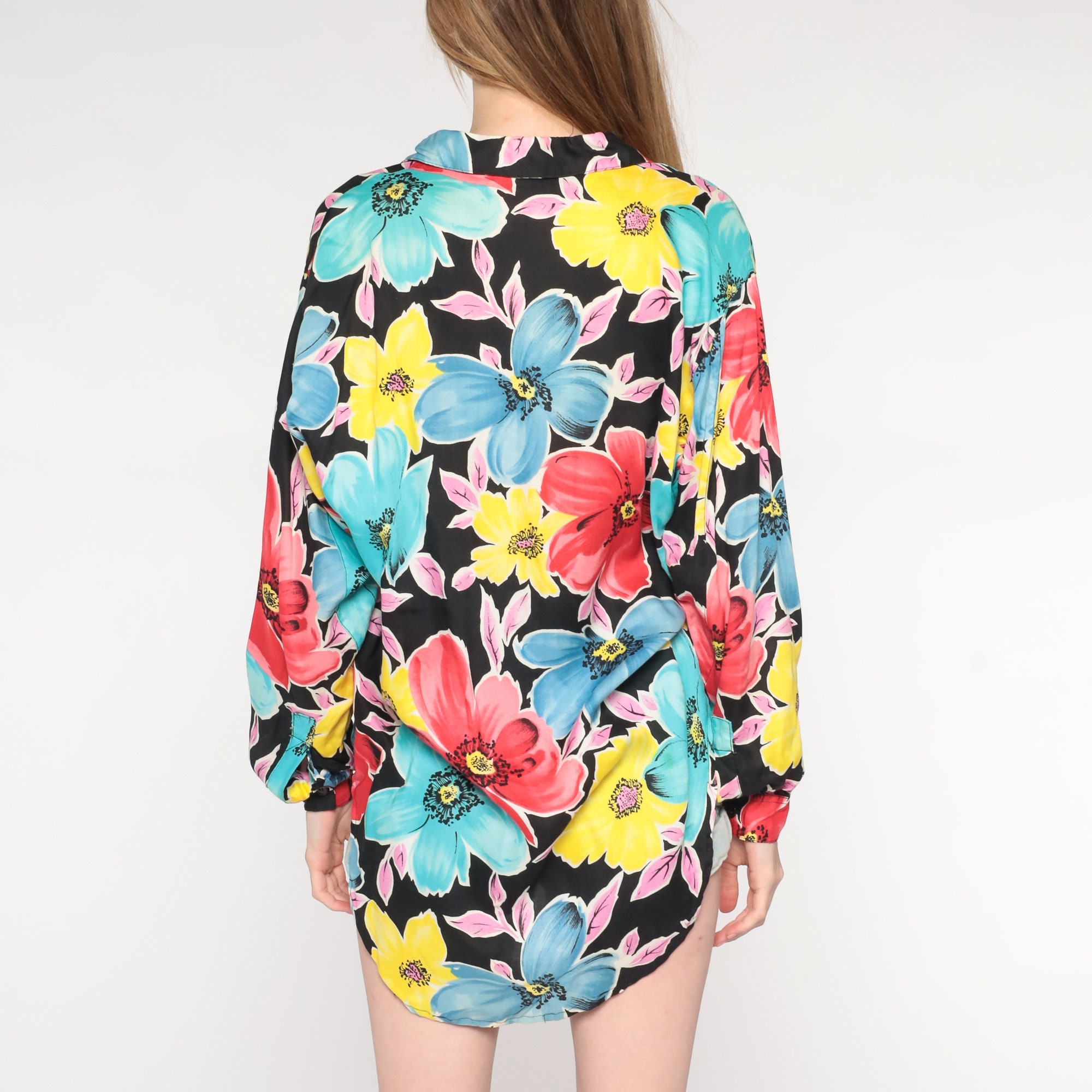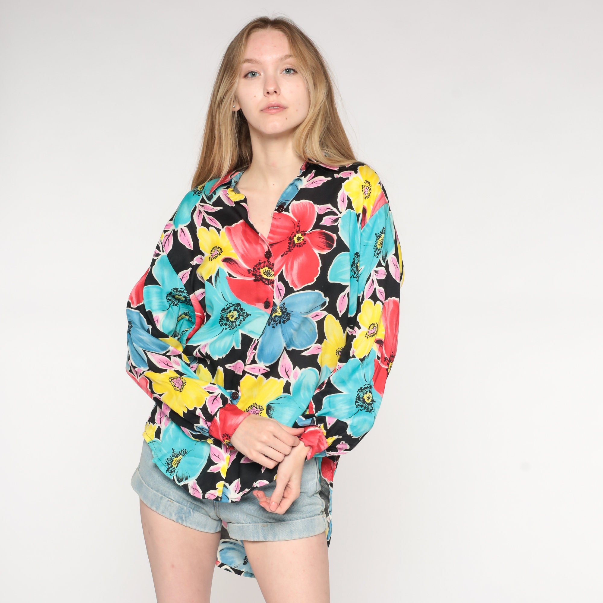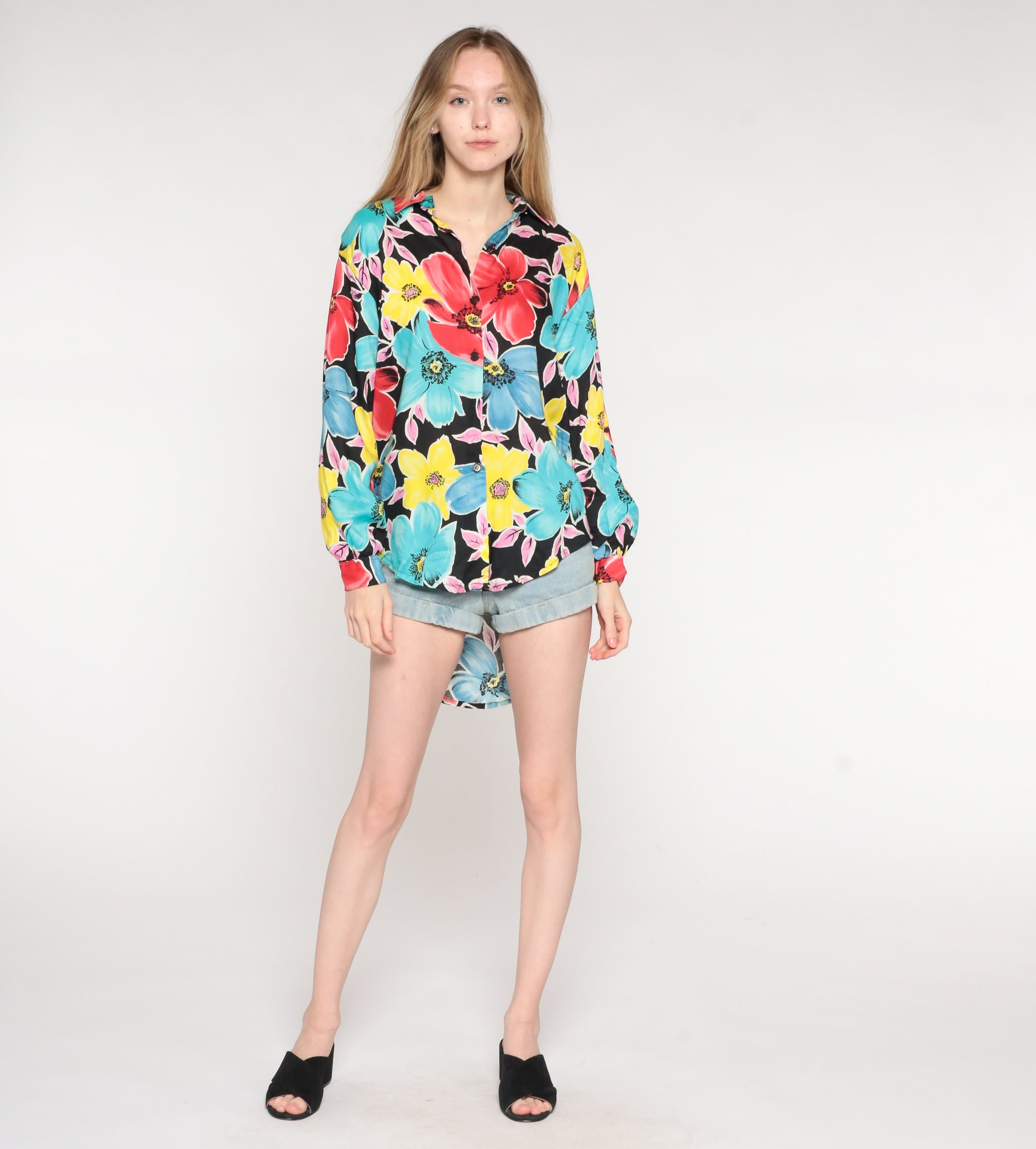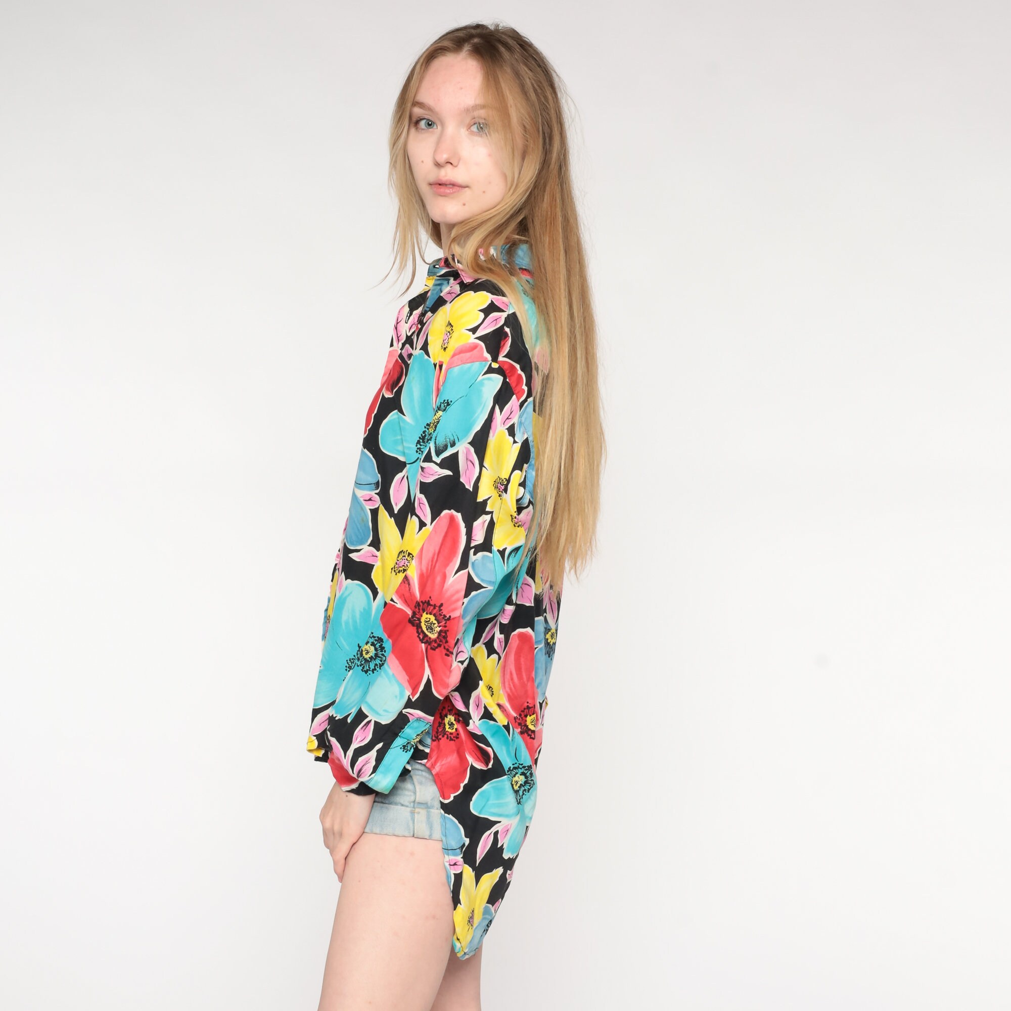 Vintage 90s button up shirt with a floral print. It has long sleeves and buttons up the front.