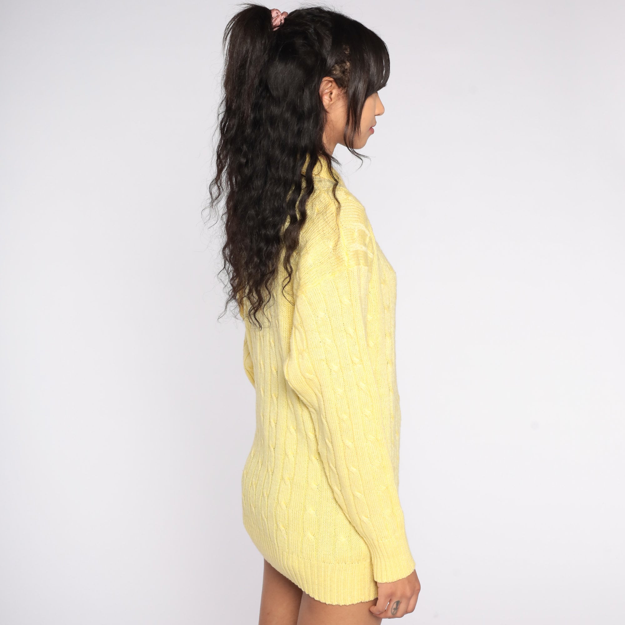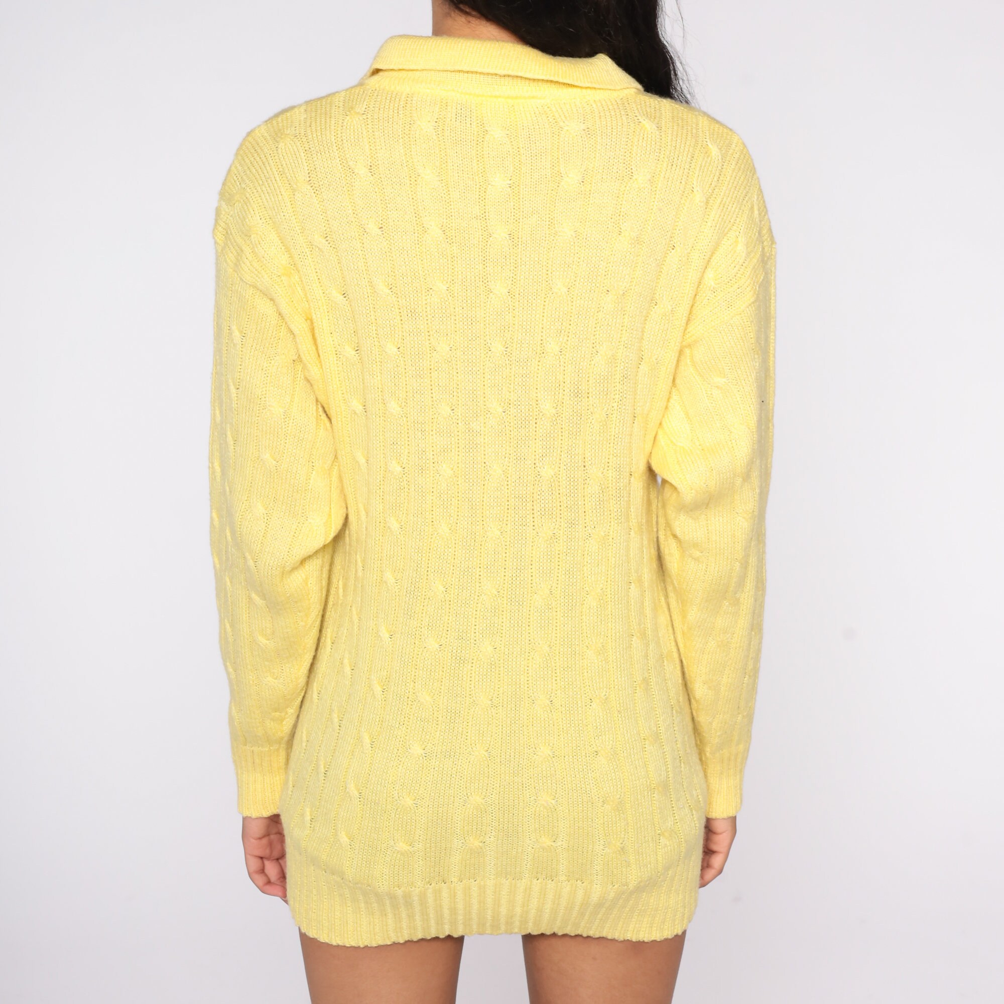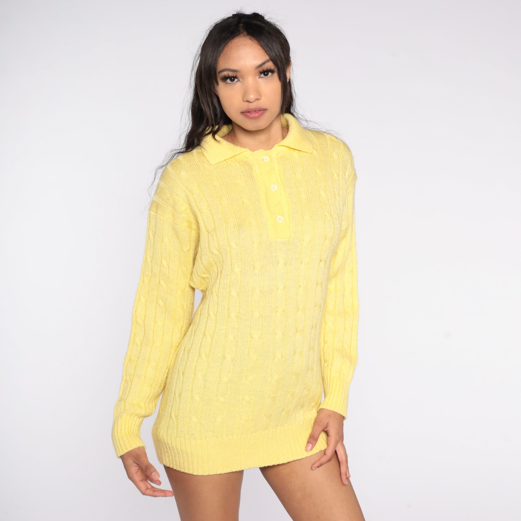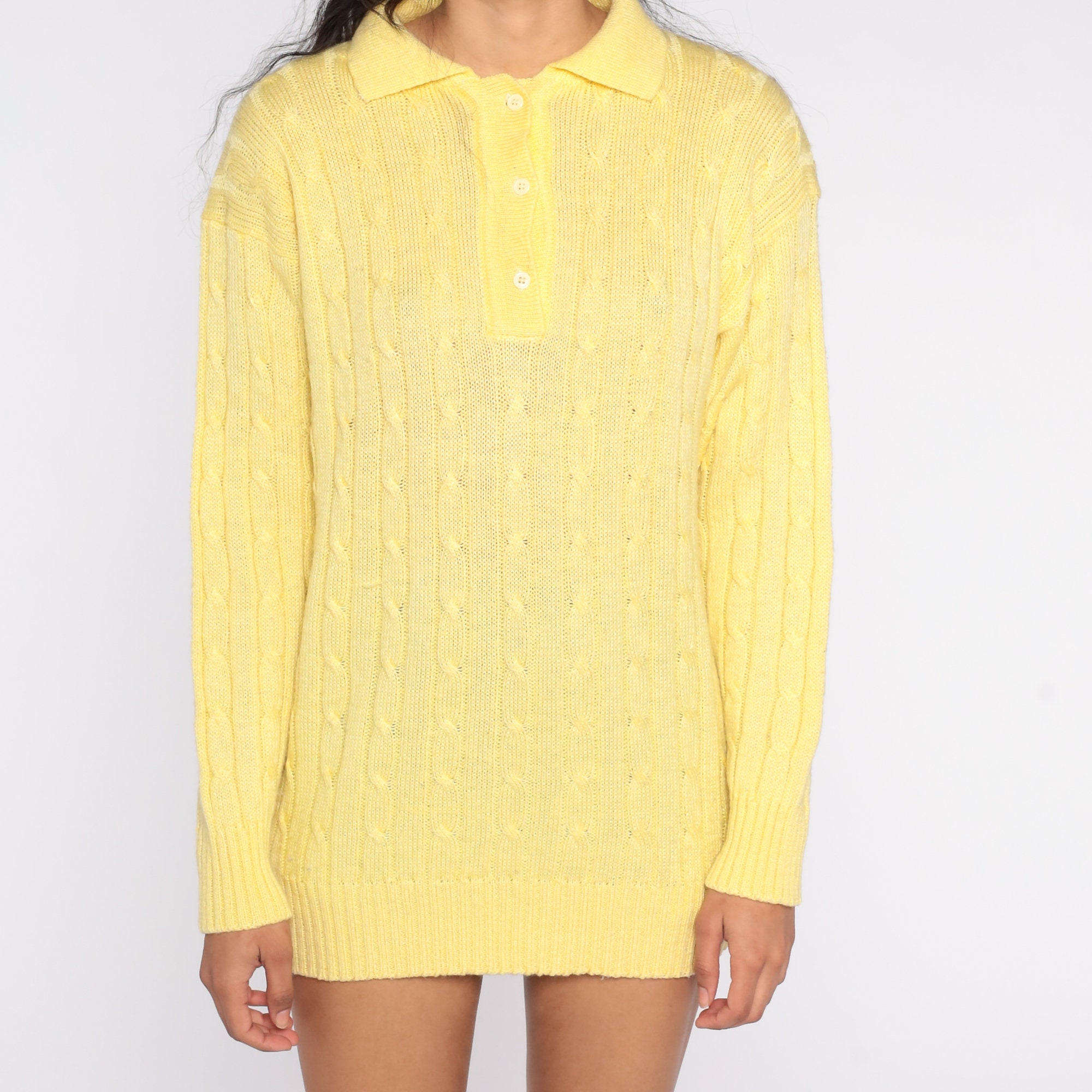 Vintage 80s sweater by Diane Von Furstenberg in yellow cable knit with a collar and buttons on the chest.