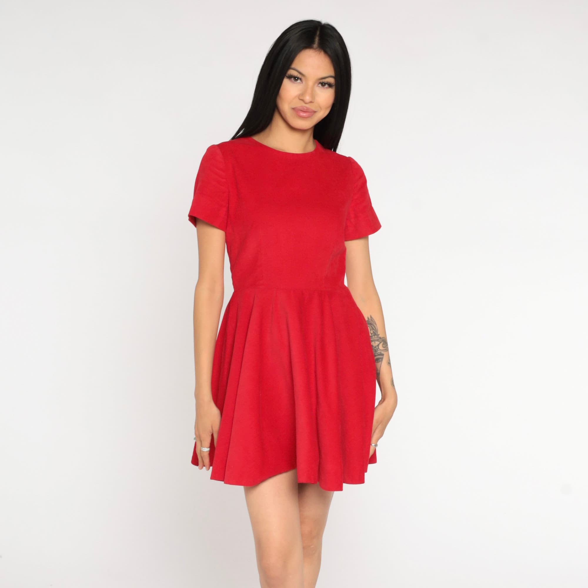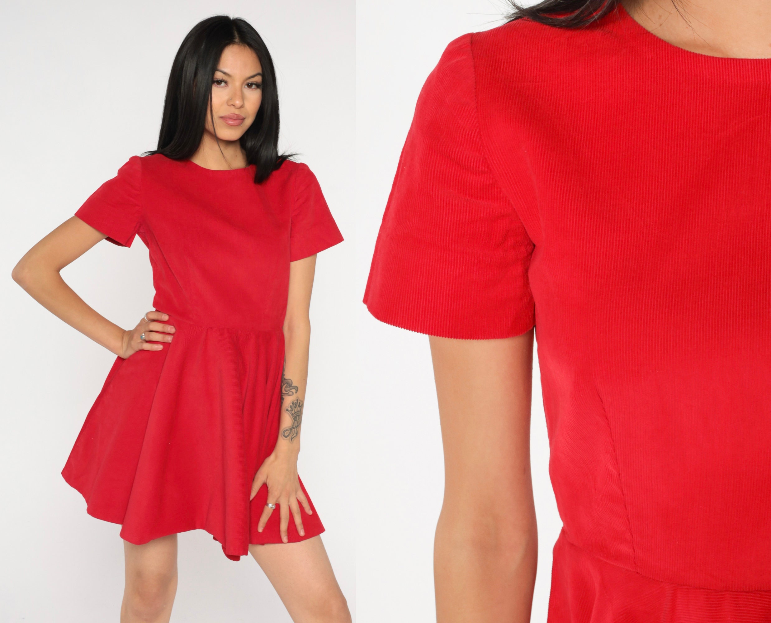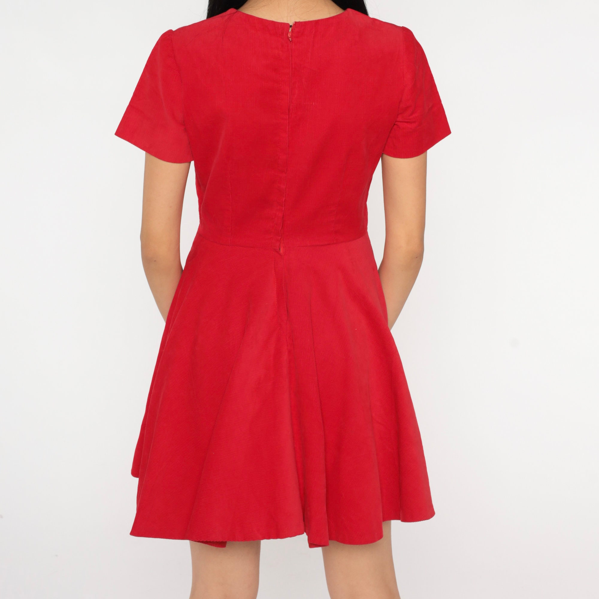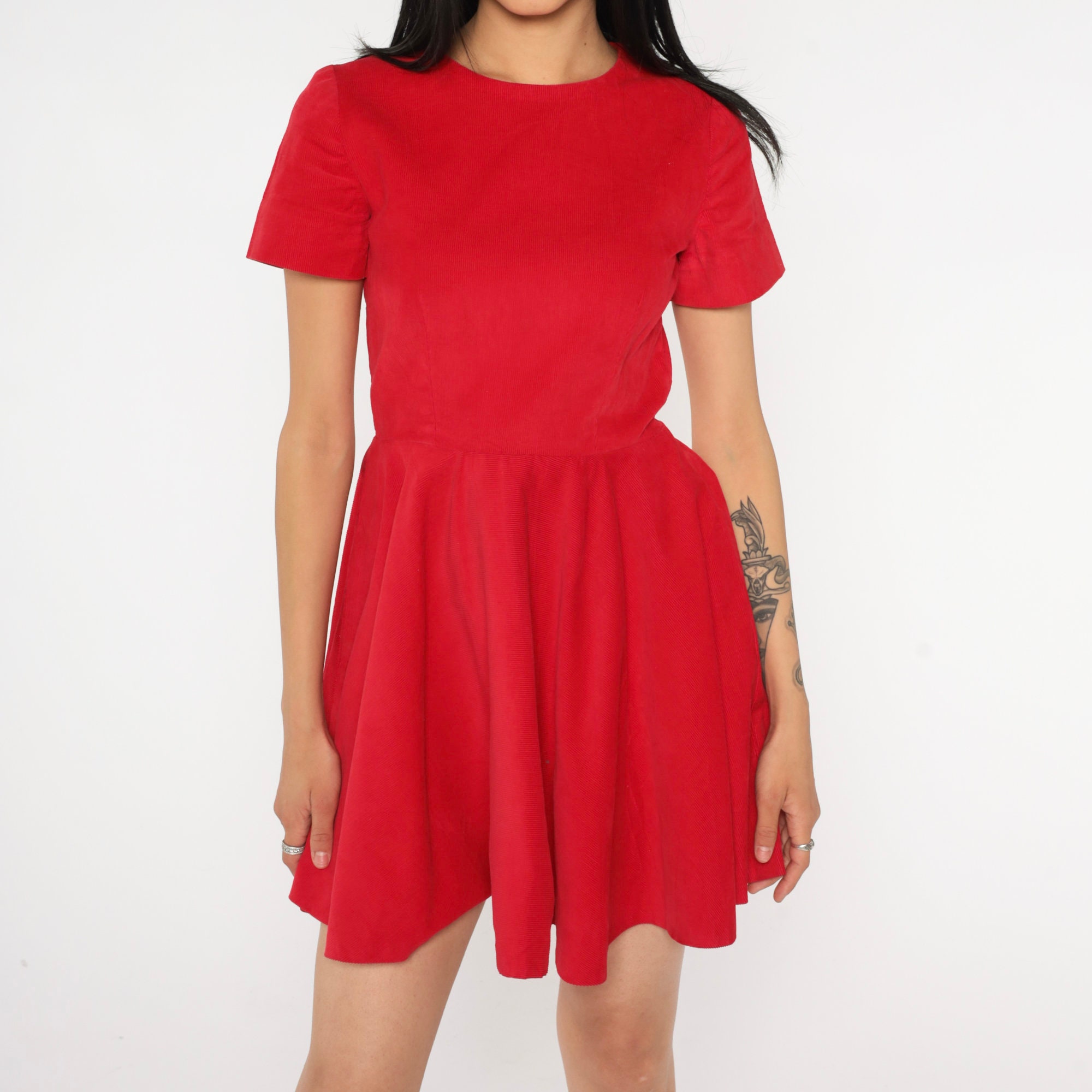 Vintage 80s dress in red corduroy. It has a high waist and short sleeves. Mini length.