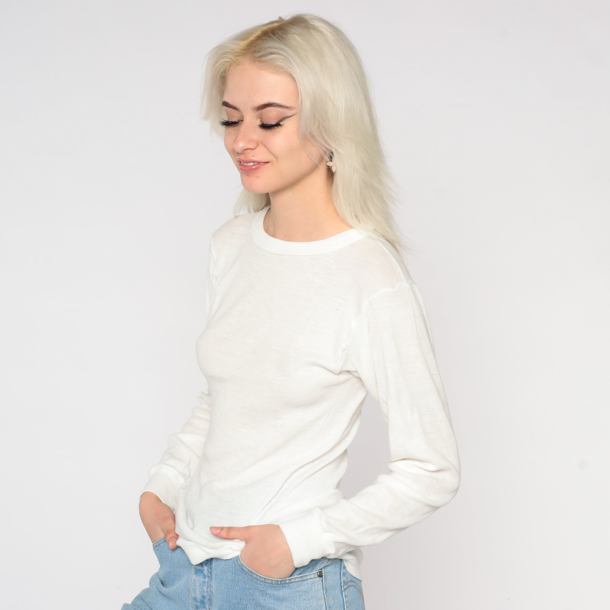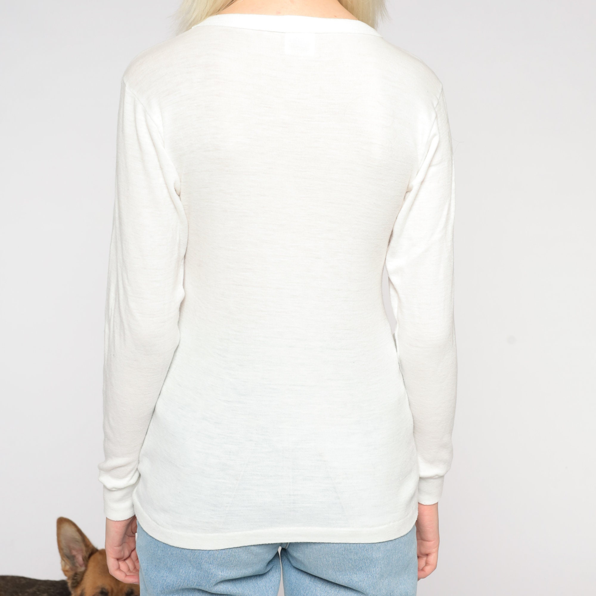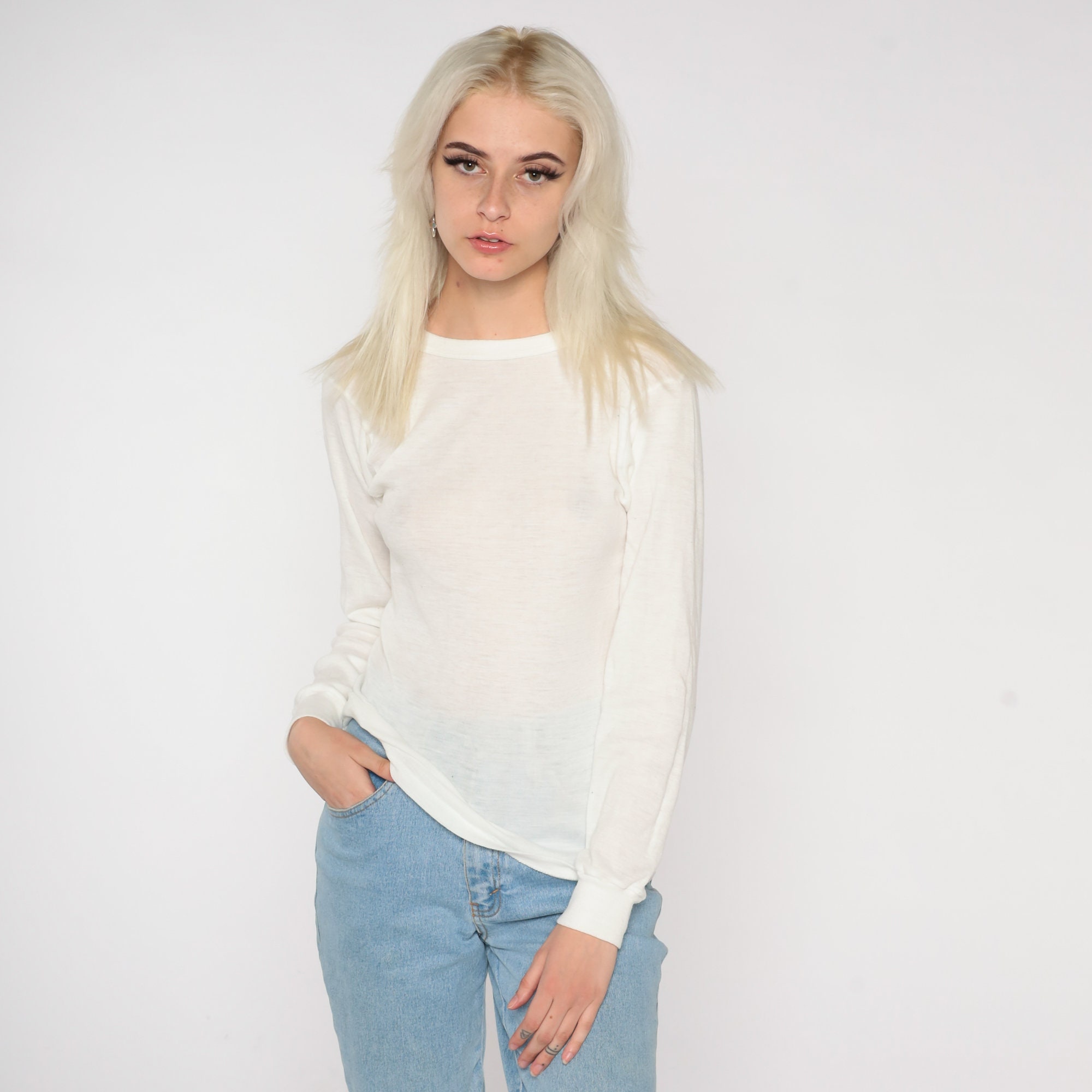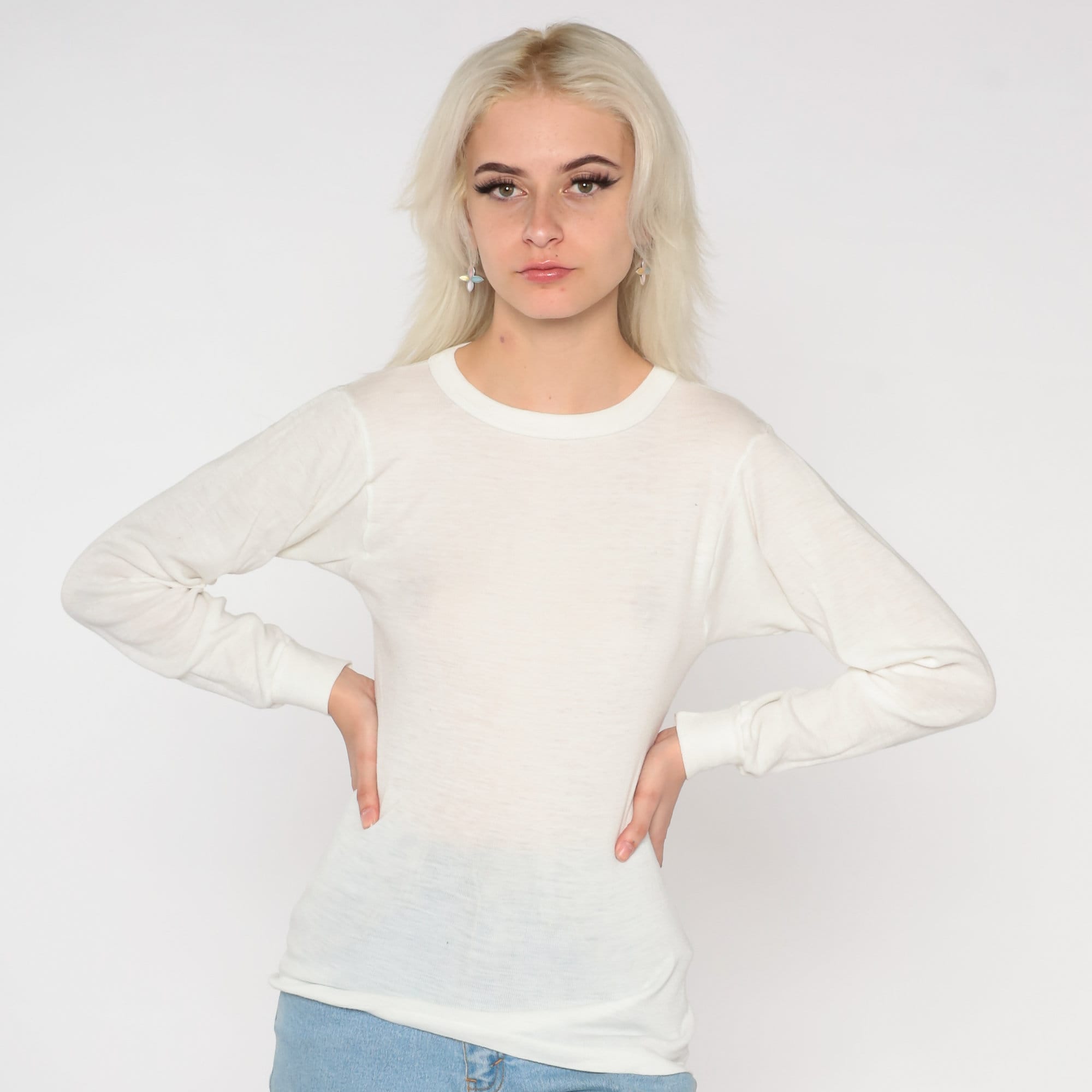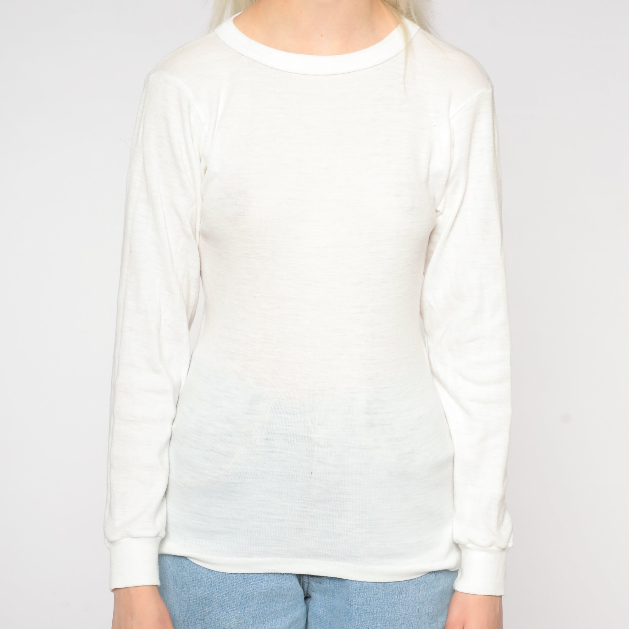 Vintage 80s thermal shirt in semi sheer white with long sleeves and a crewneck.