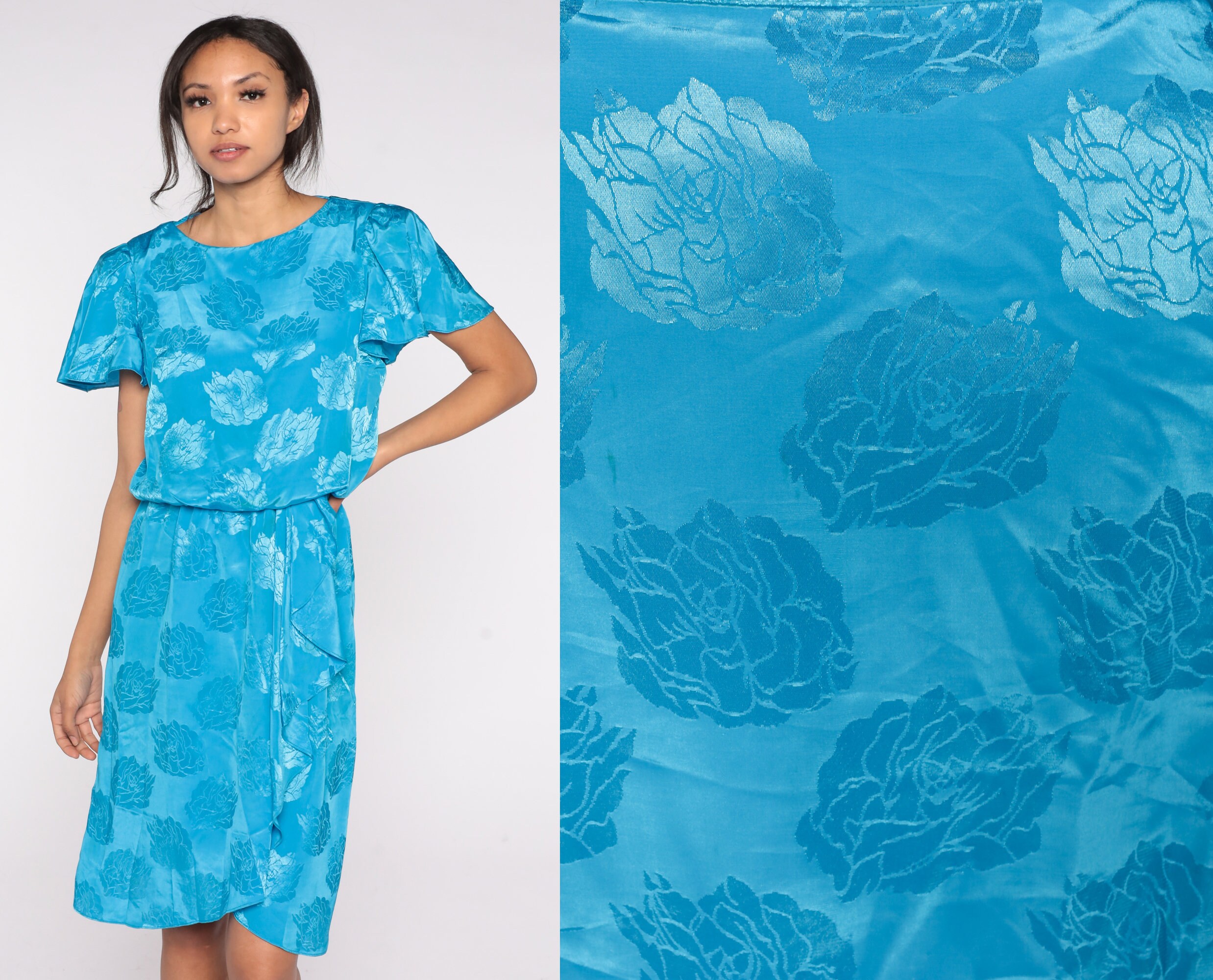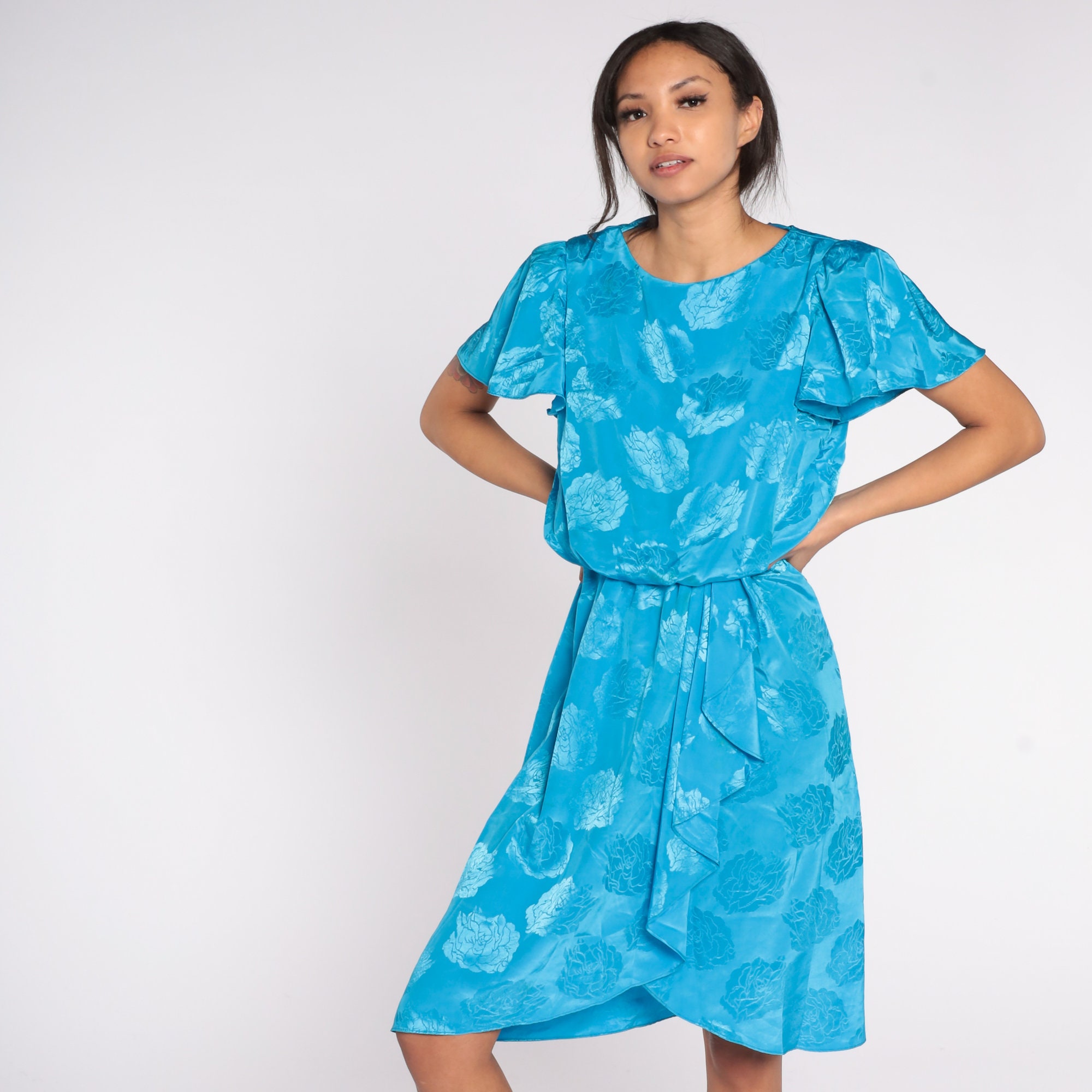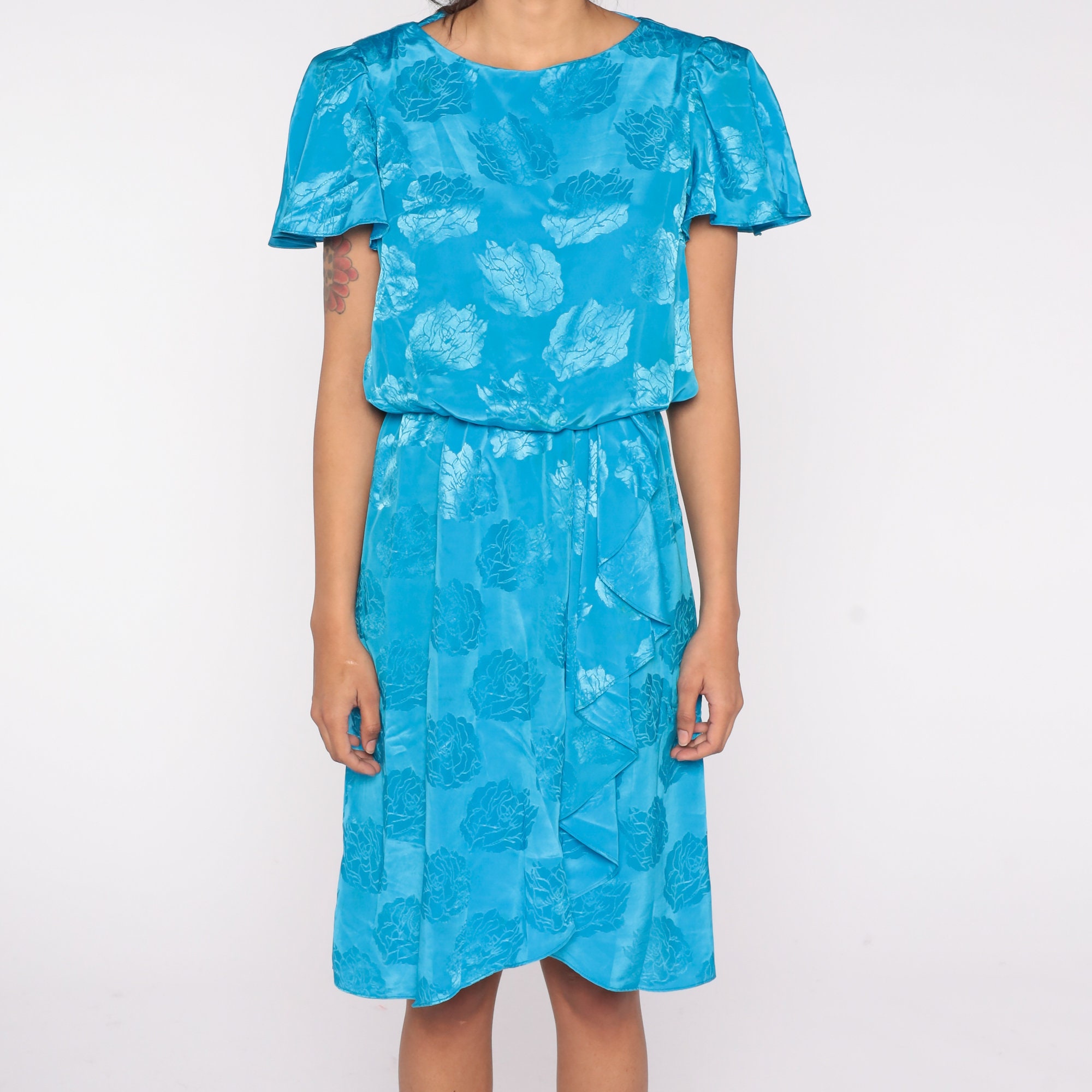 Vintage 80s dress in blue with an embossed floral design. It has a high waist, flutter sleeves and a ruffle on the skirt. Midi length.