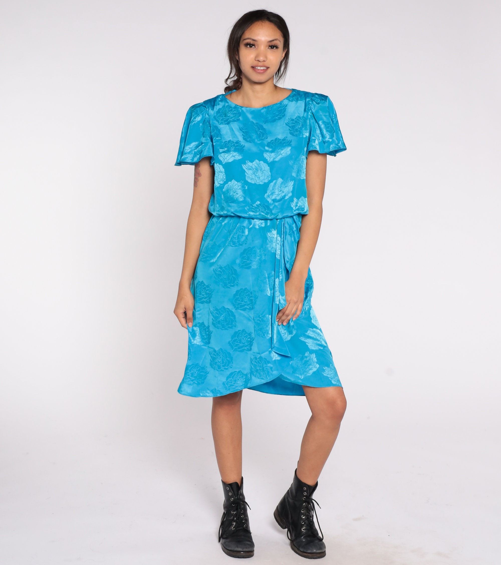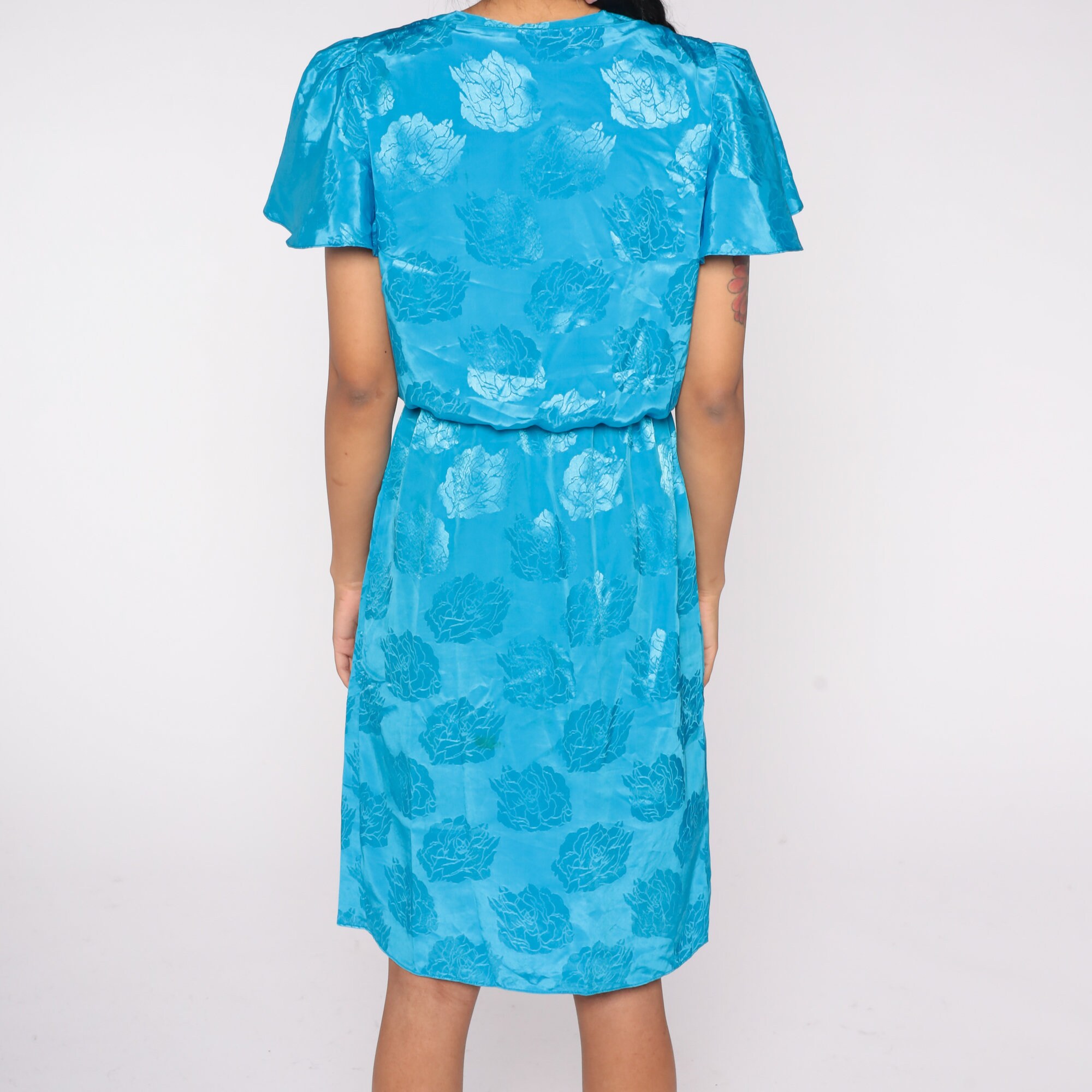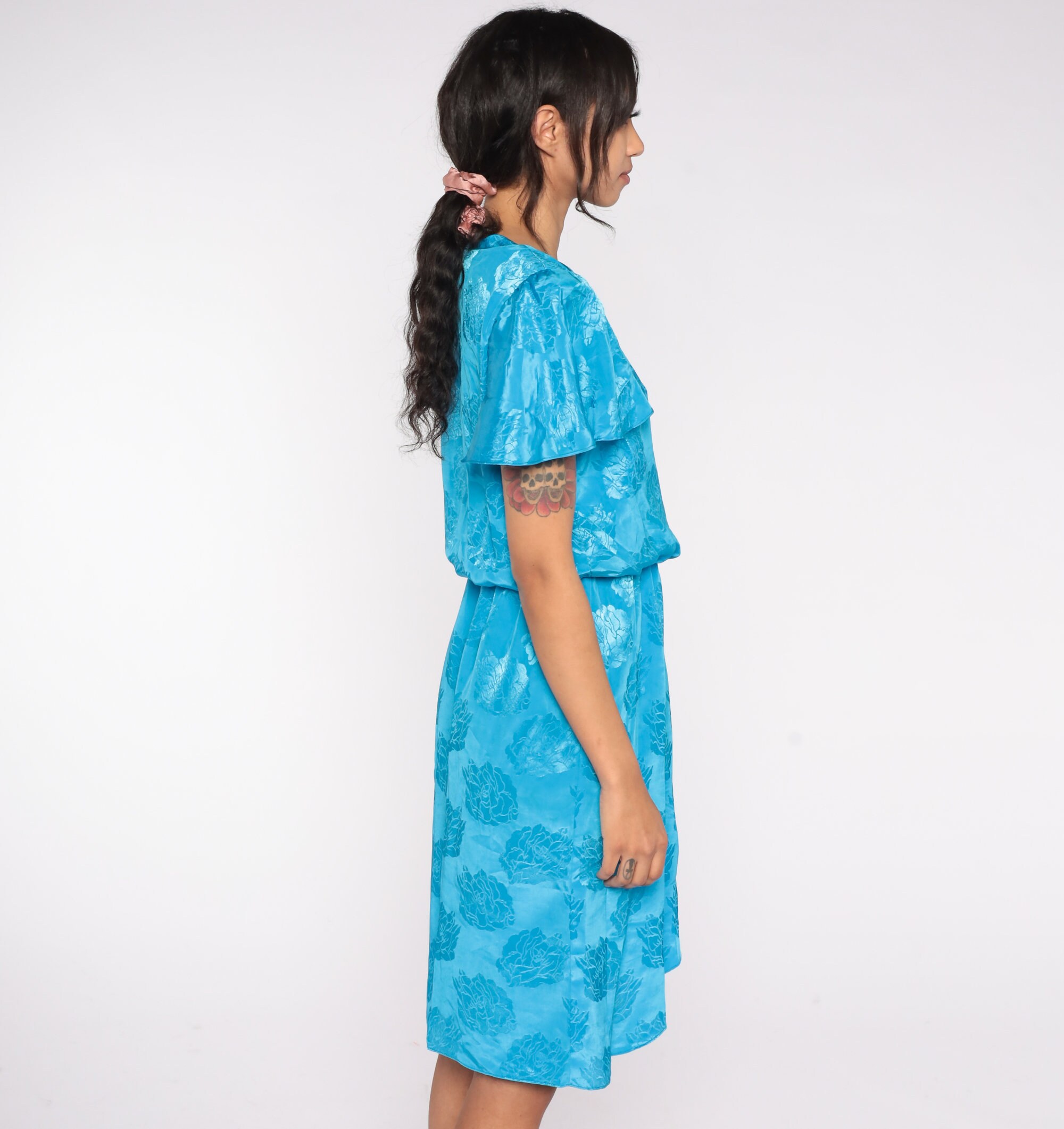Vintage 80s dress in blue with an embossed floral design. It has a high waist, flutter sleeves and a ruffle on the skirt. Midi length.
