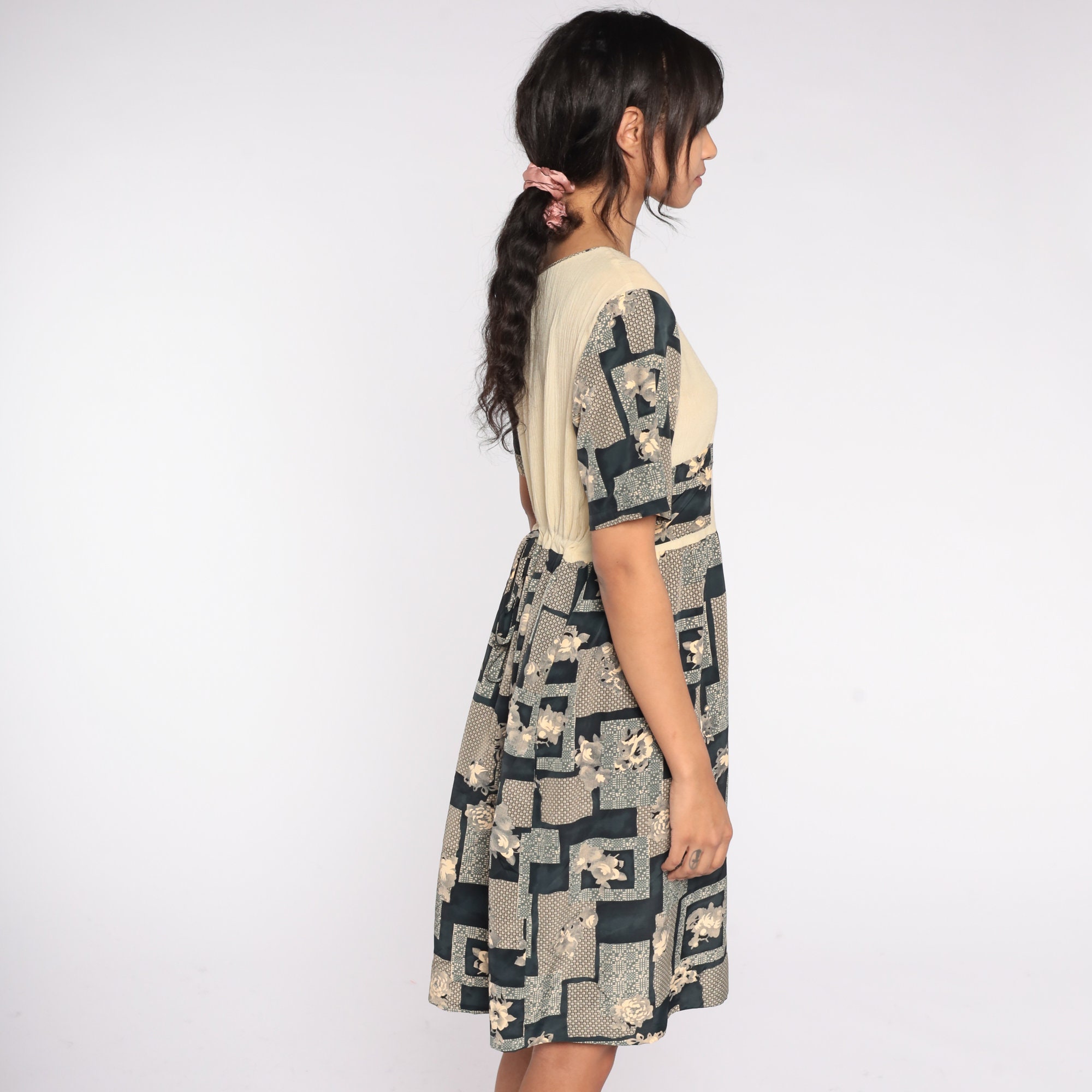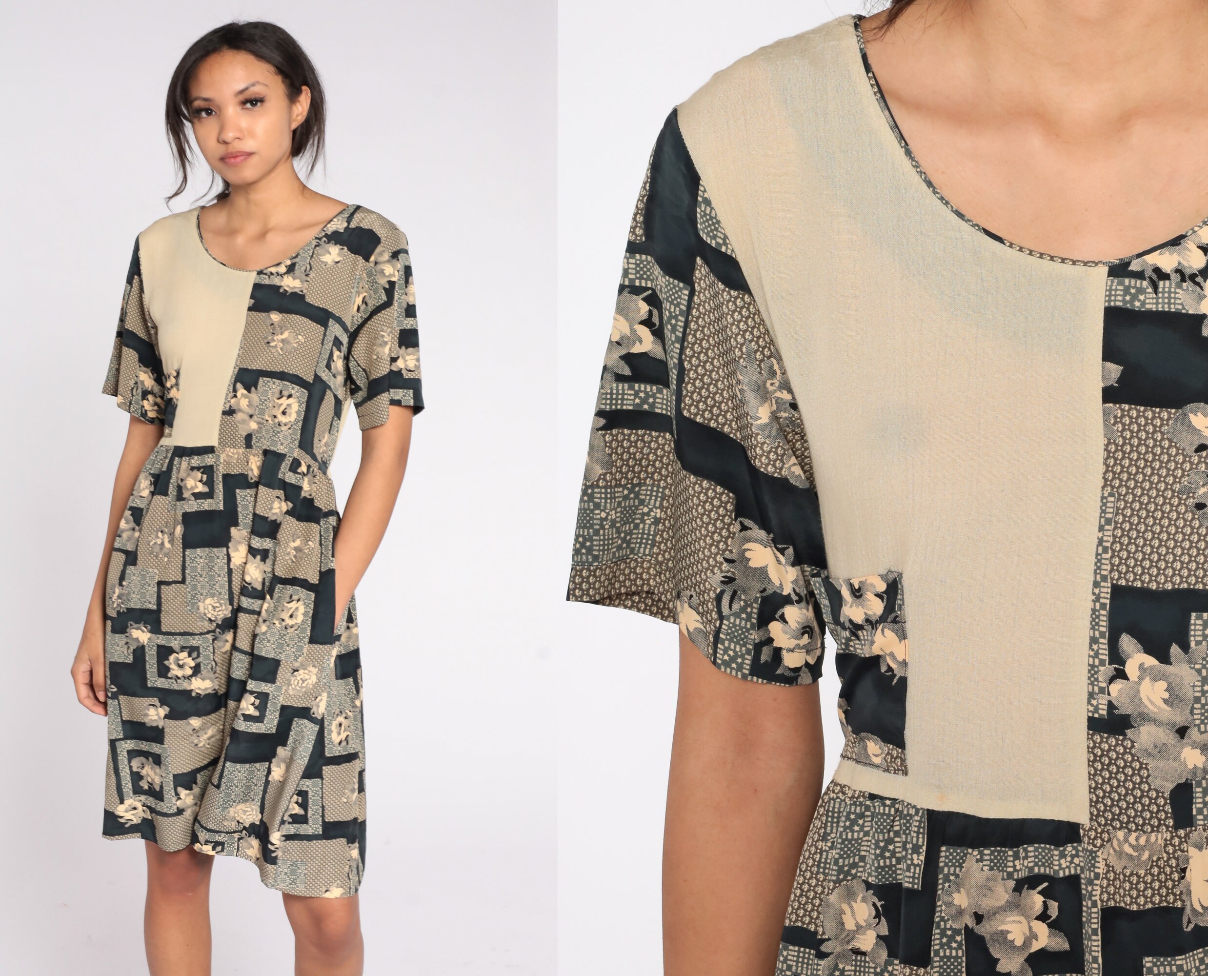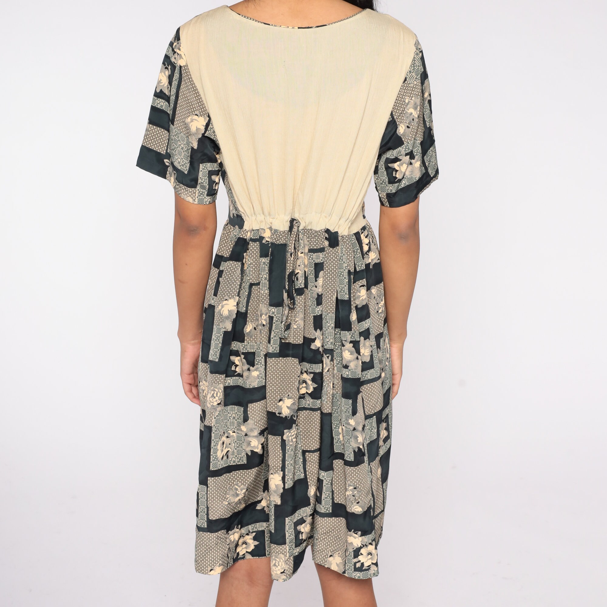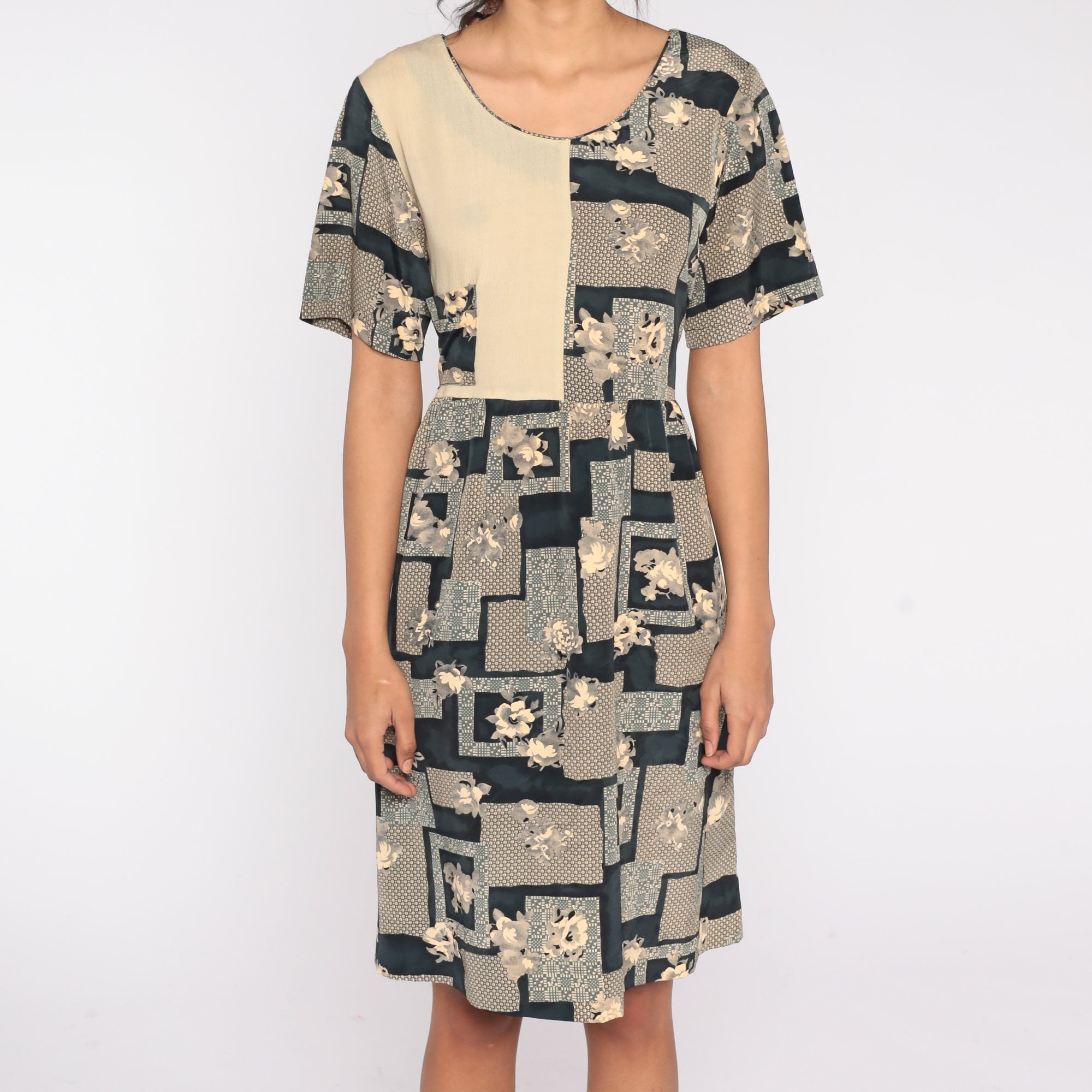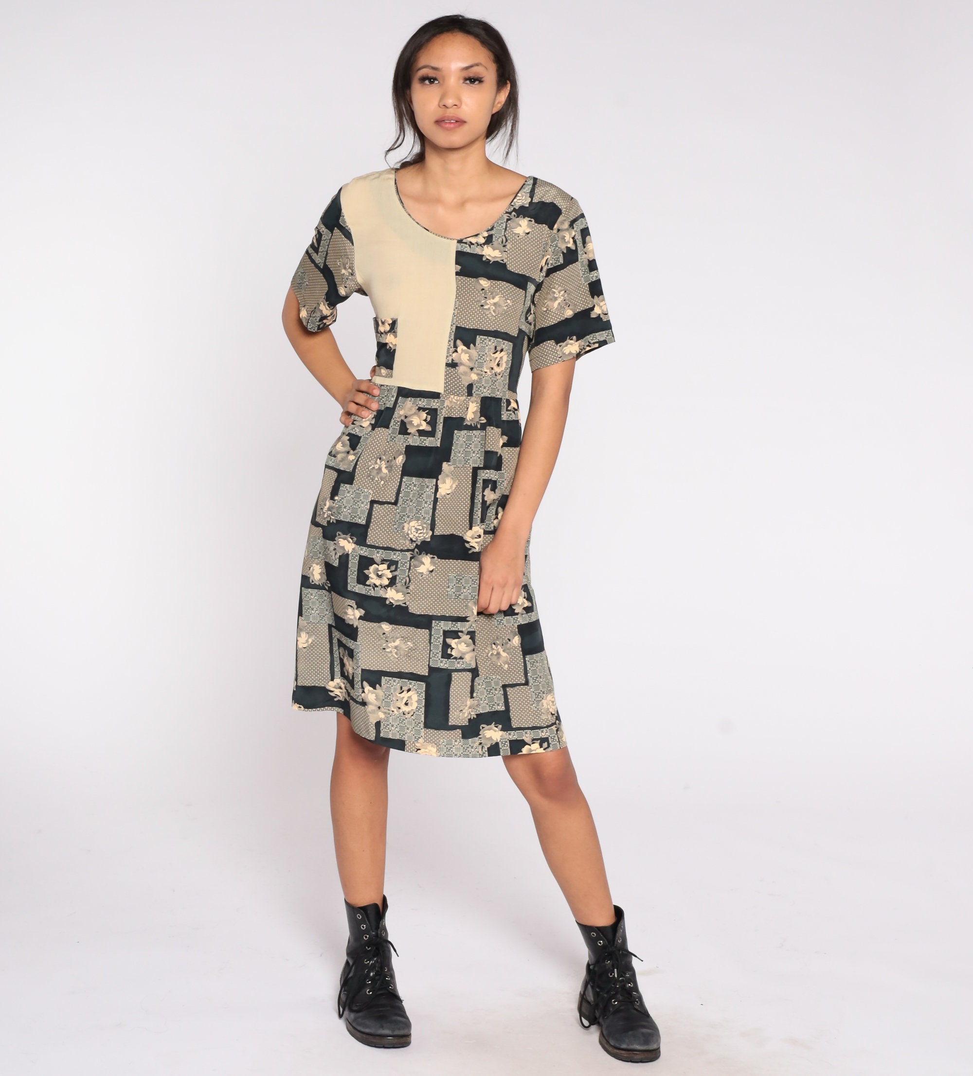 Vintage 90s dress in a geometric floral print with a high waist and short sleeves.