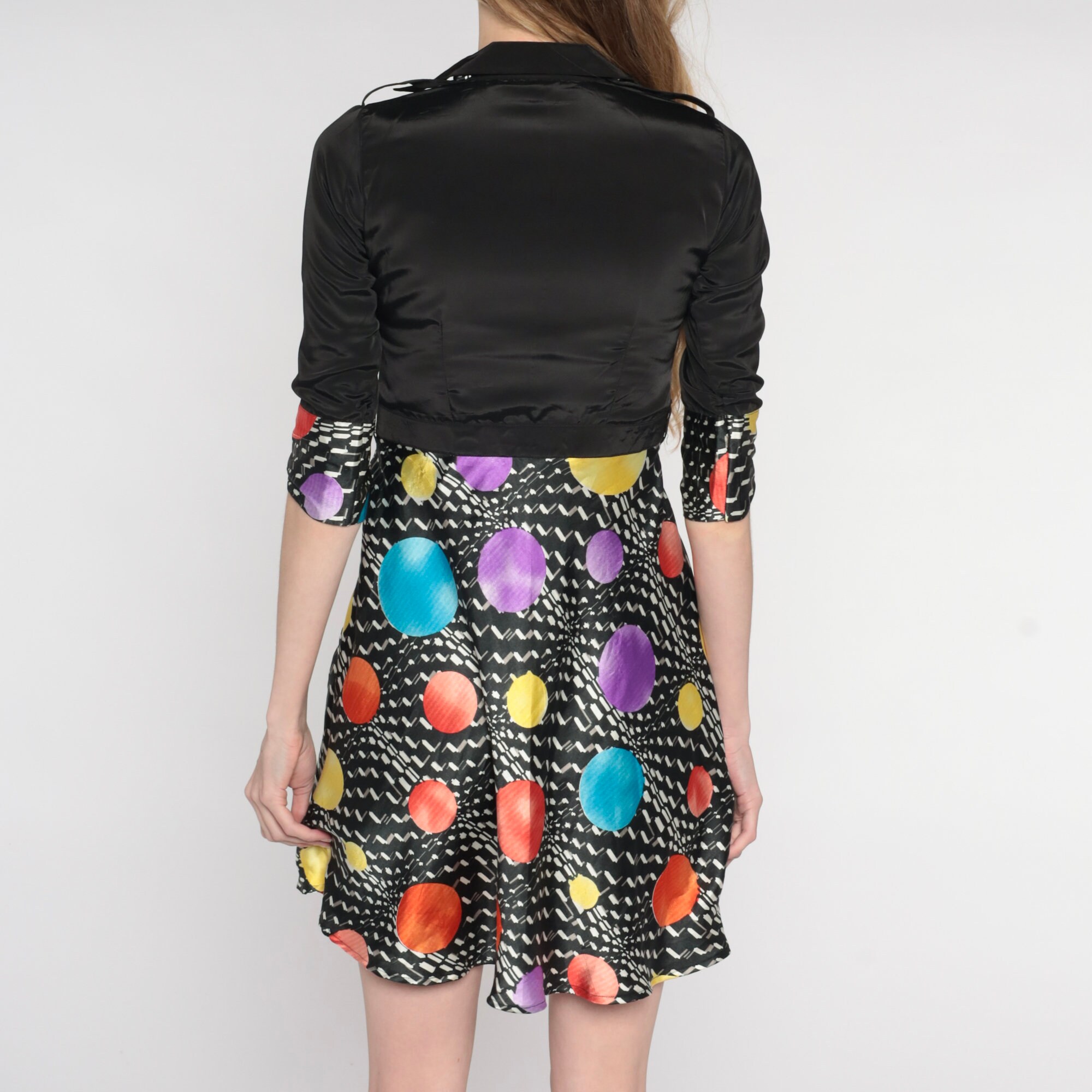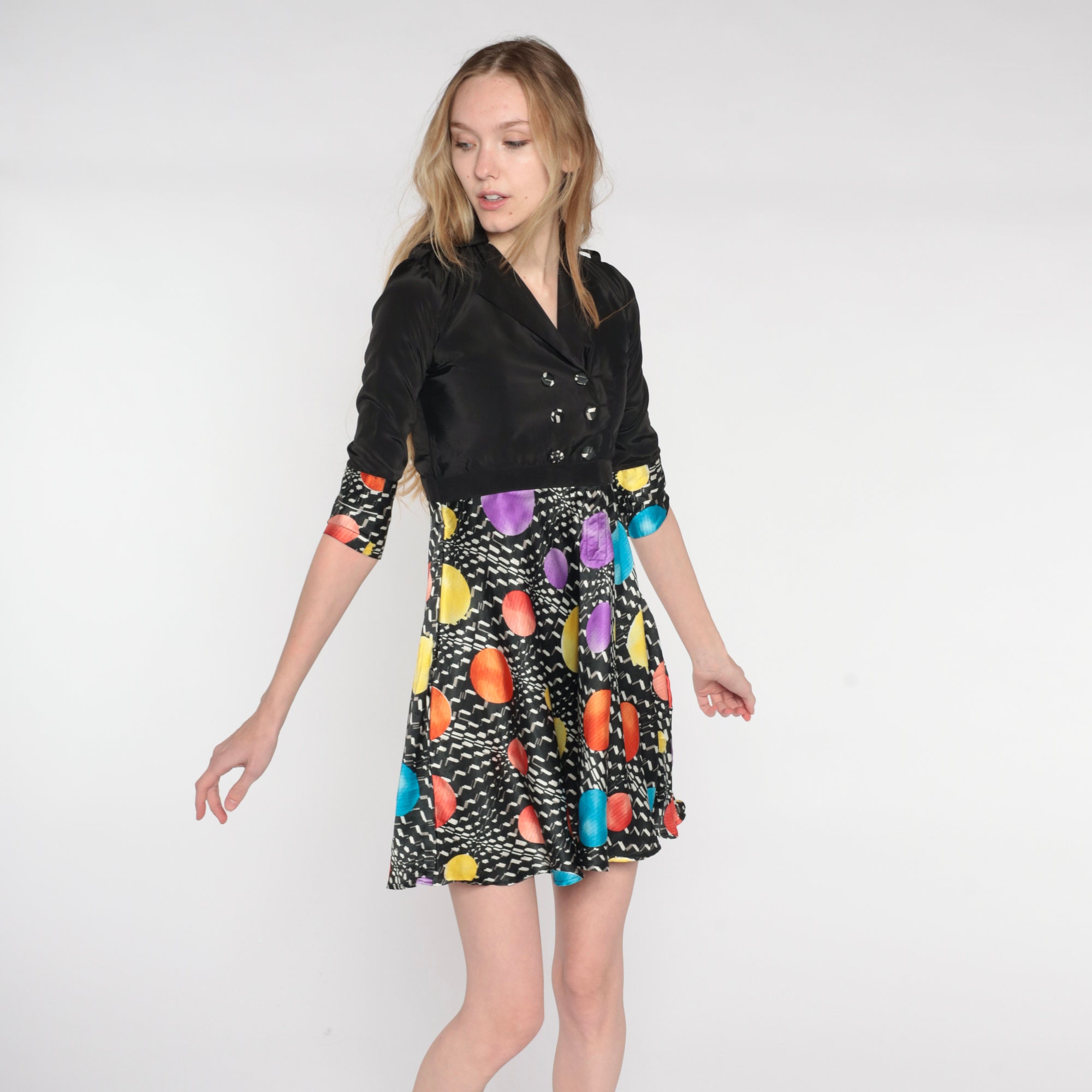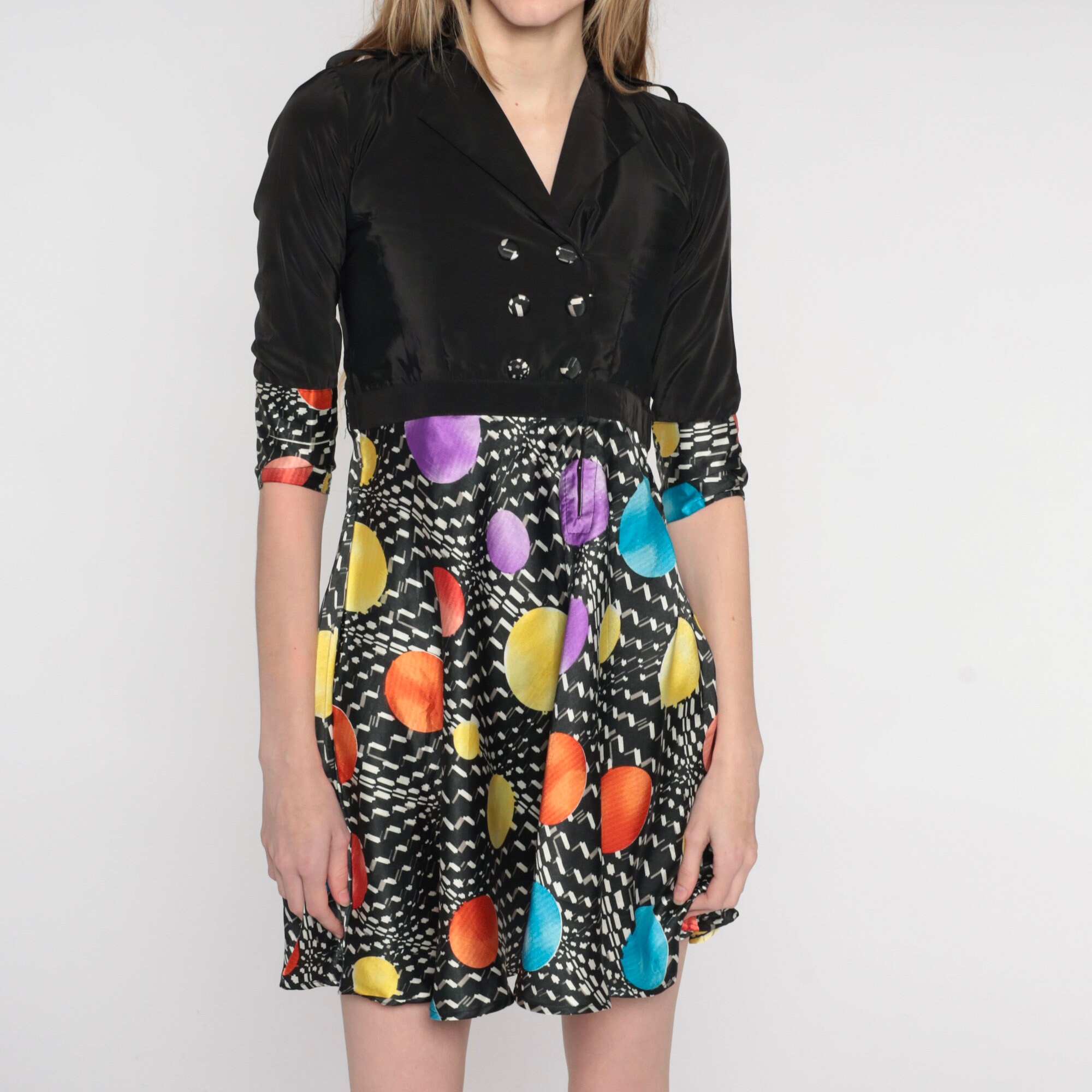 Vintage 90s silk dress with a black bodice and a geometric print skirt. High waisted with shoulder epaulets, double breasted buttons up the chest, and a collar. Mini length.