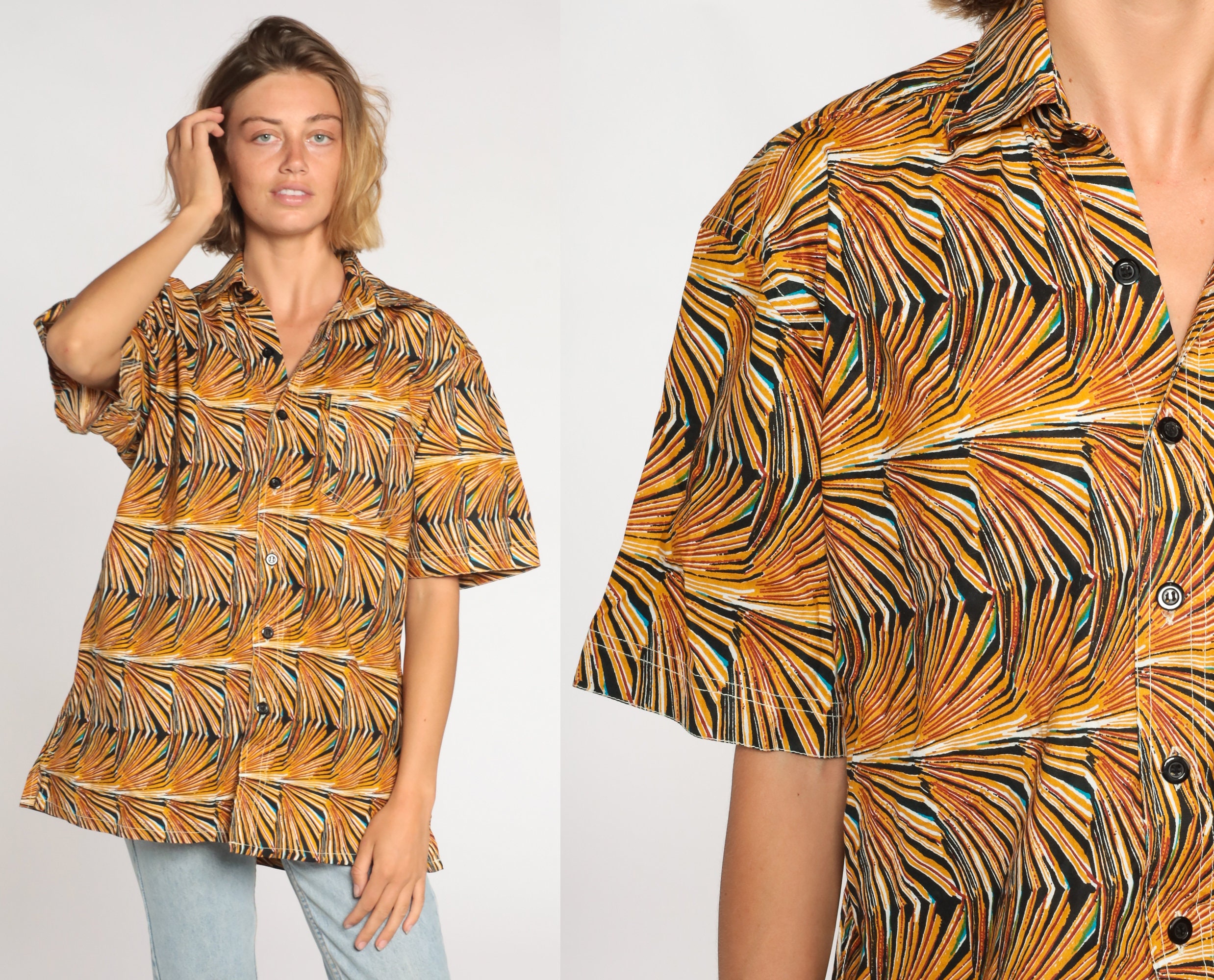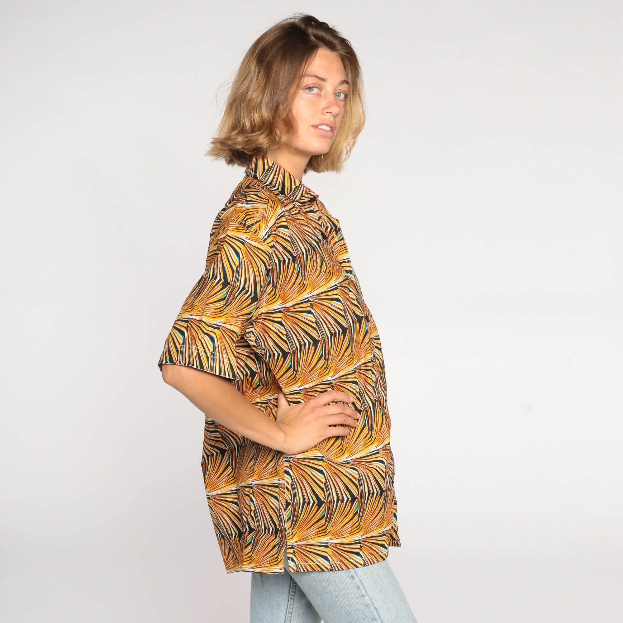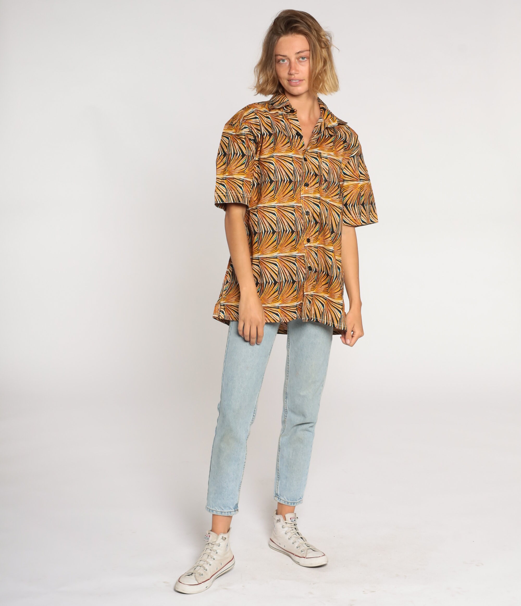 Vintage 80s shirt in an abstract print. Buttons up the front with short sleeves.