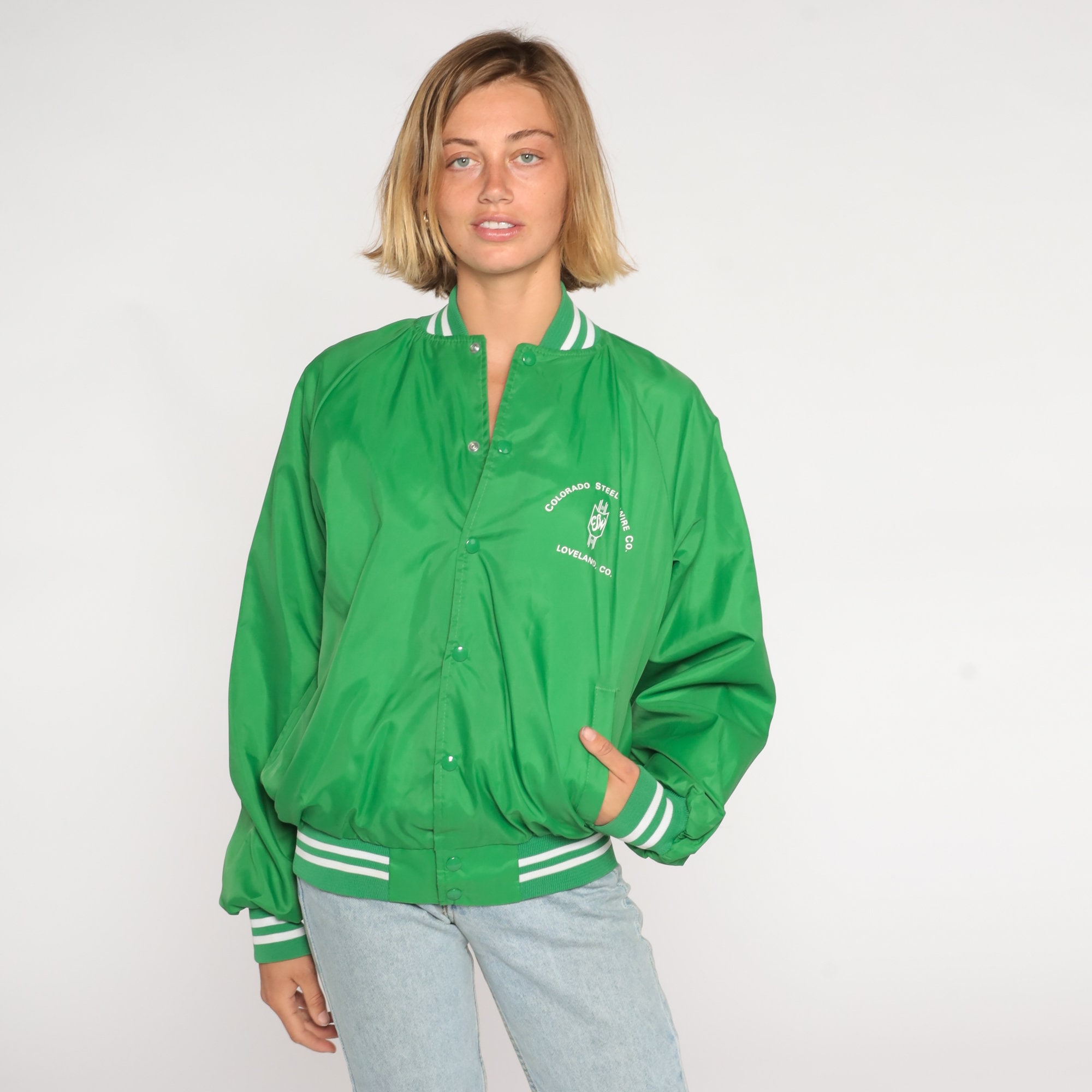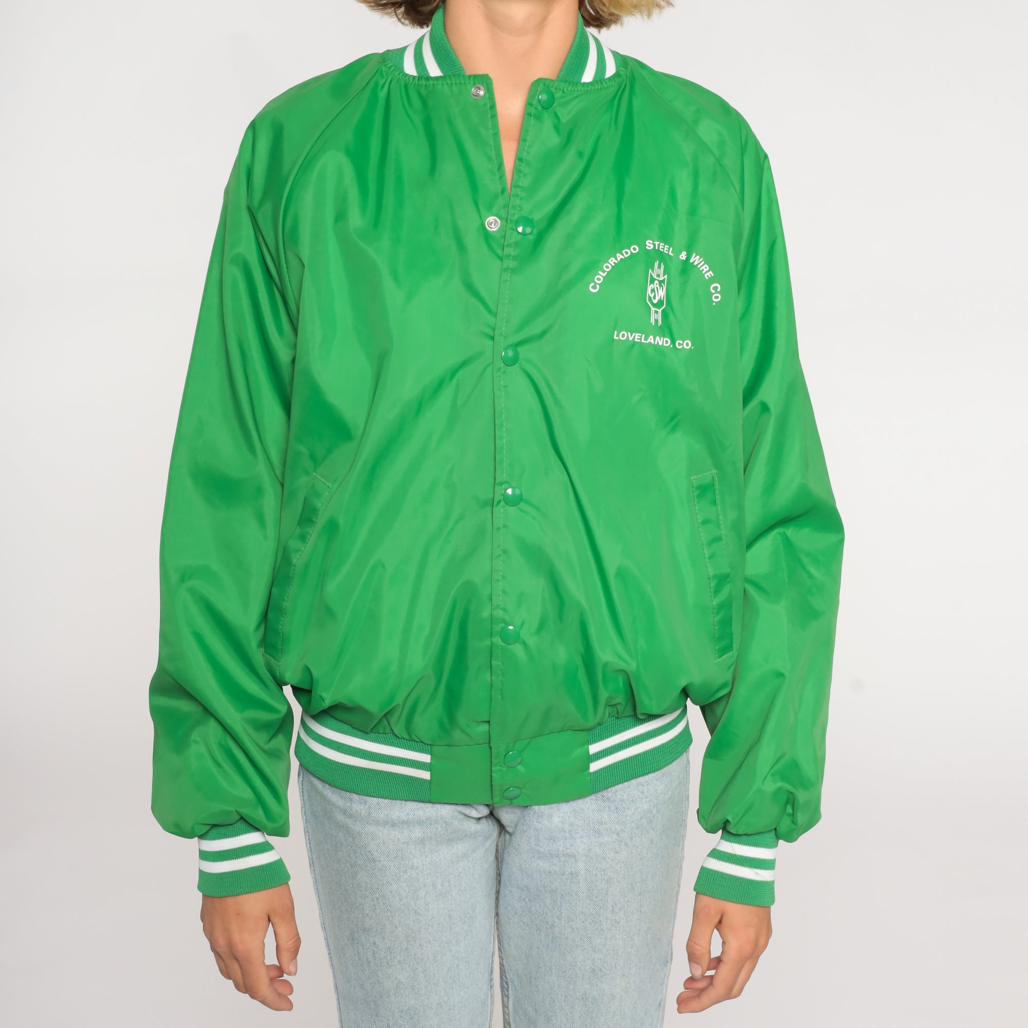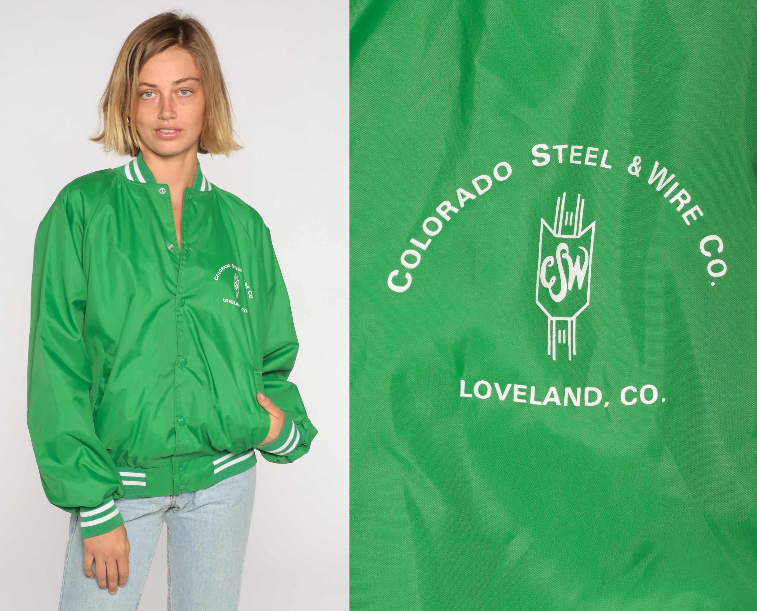 Vintage 80s bomber jacket in green with a Colorado Steel and Wire Co Loveland Colorado logo on the chest and snaps up the front.
