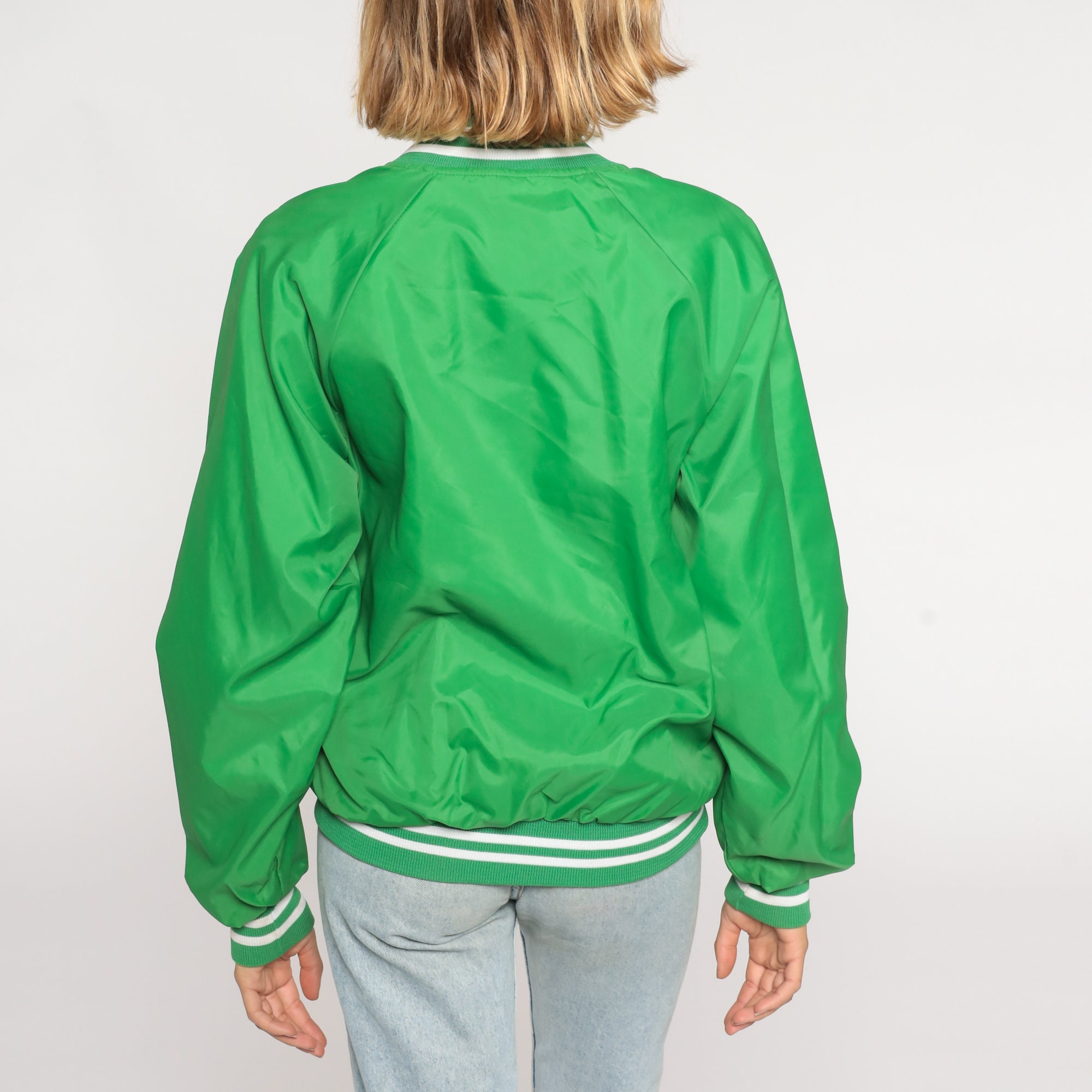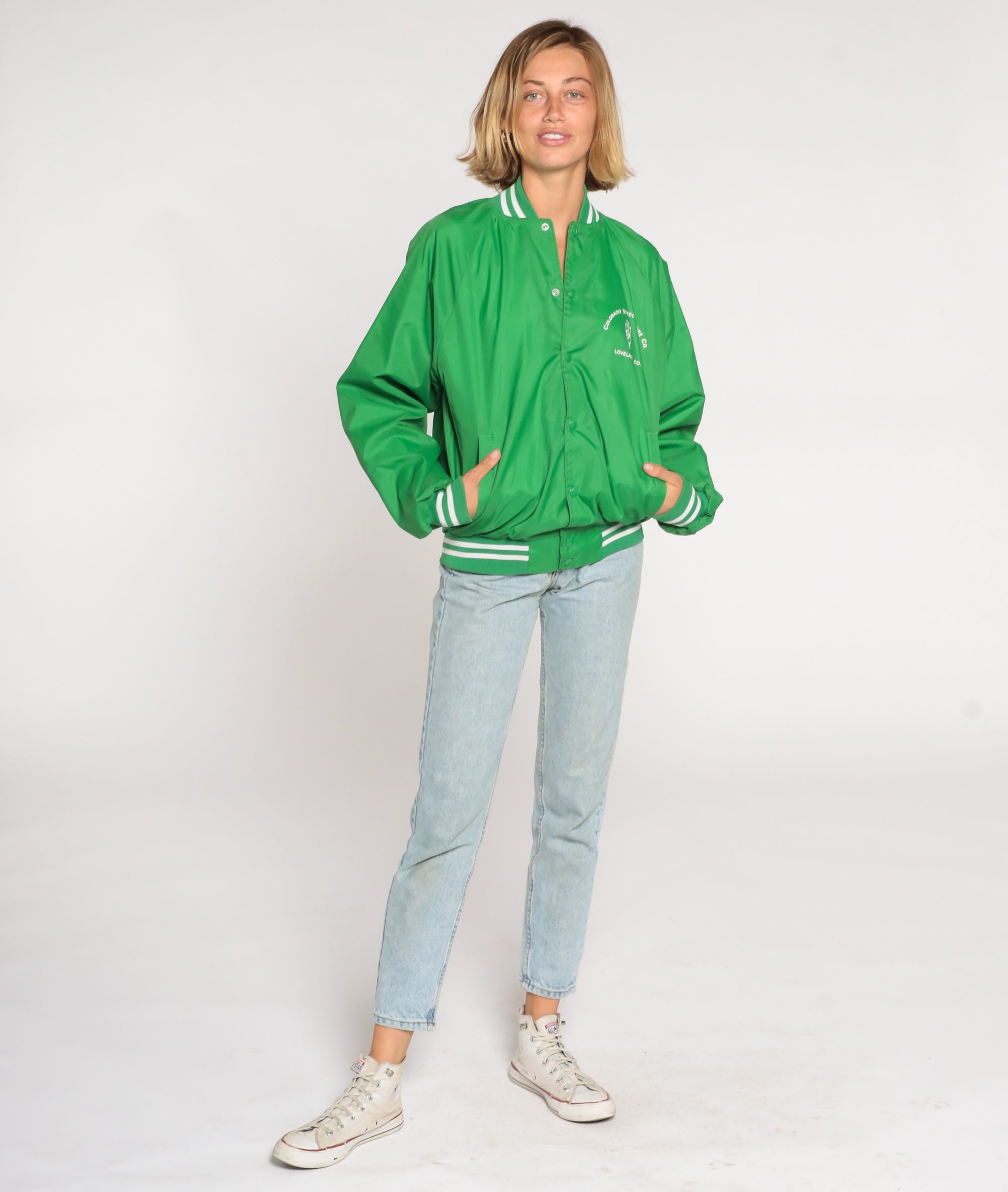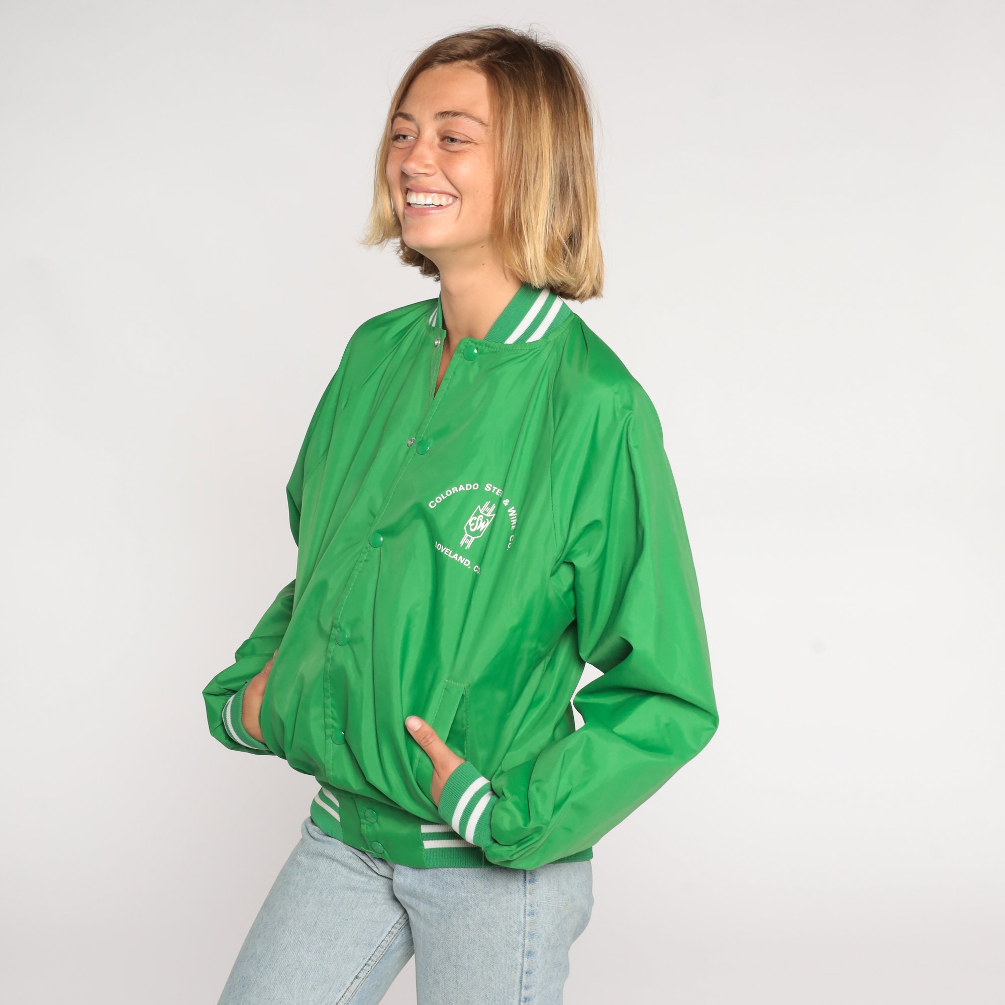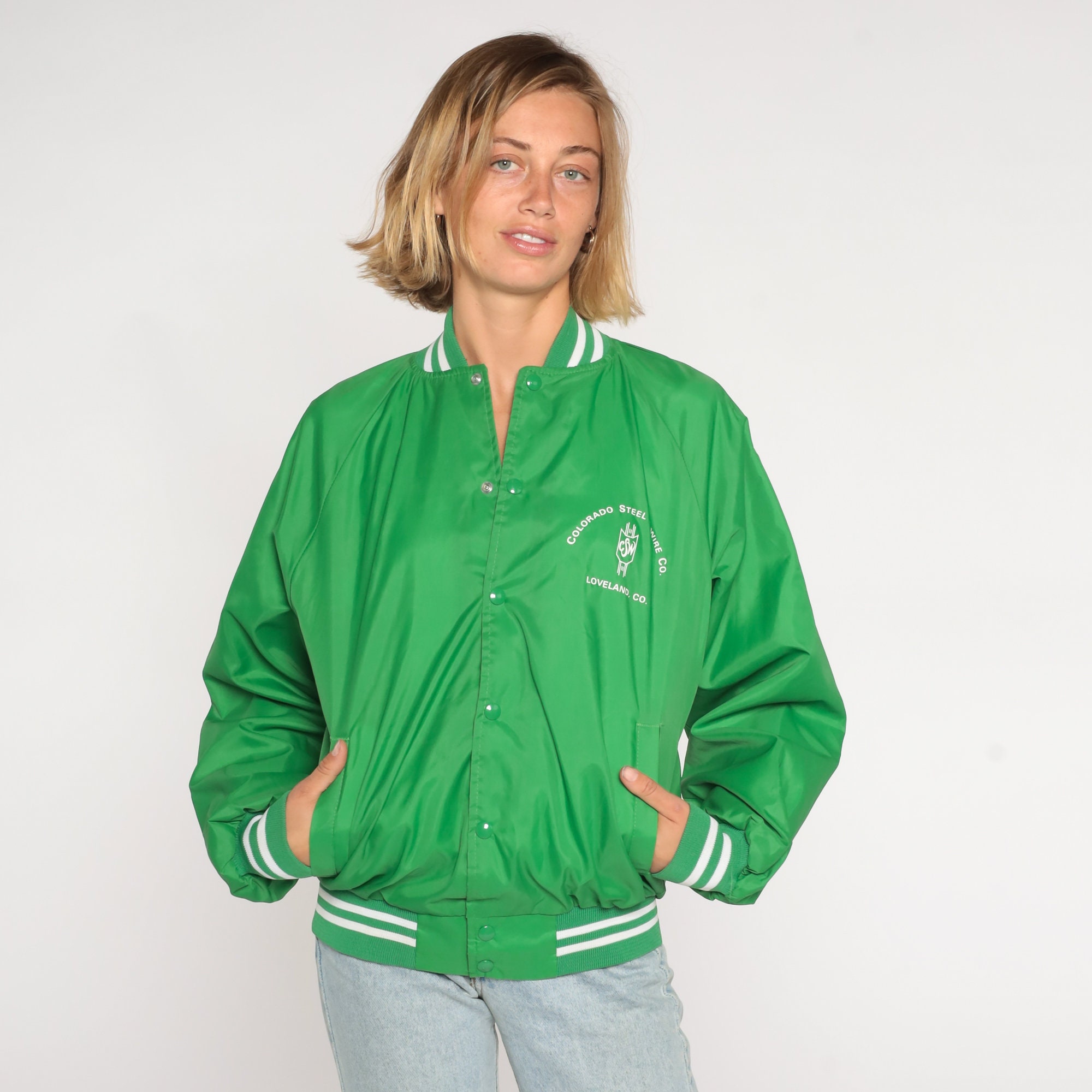 Vintage 80s bomber jacket in green with a Colorado Steel and Wire Co Loveland Colorado logo on the chest and snaps up the front.