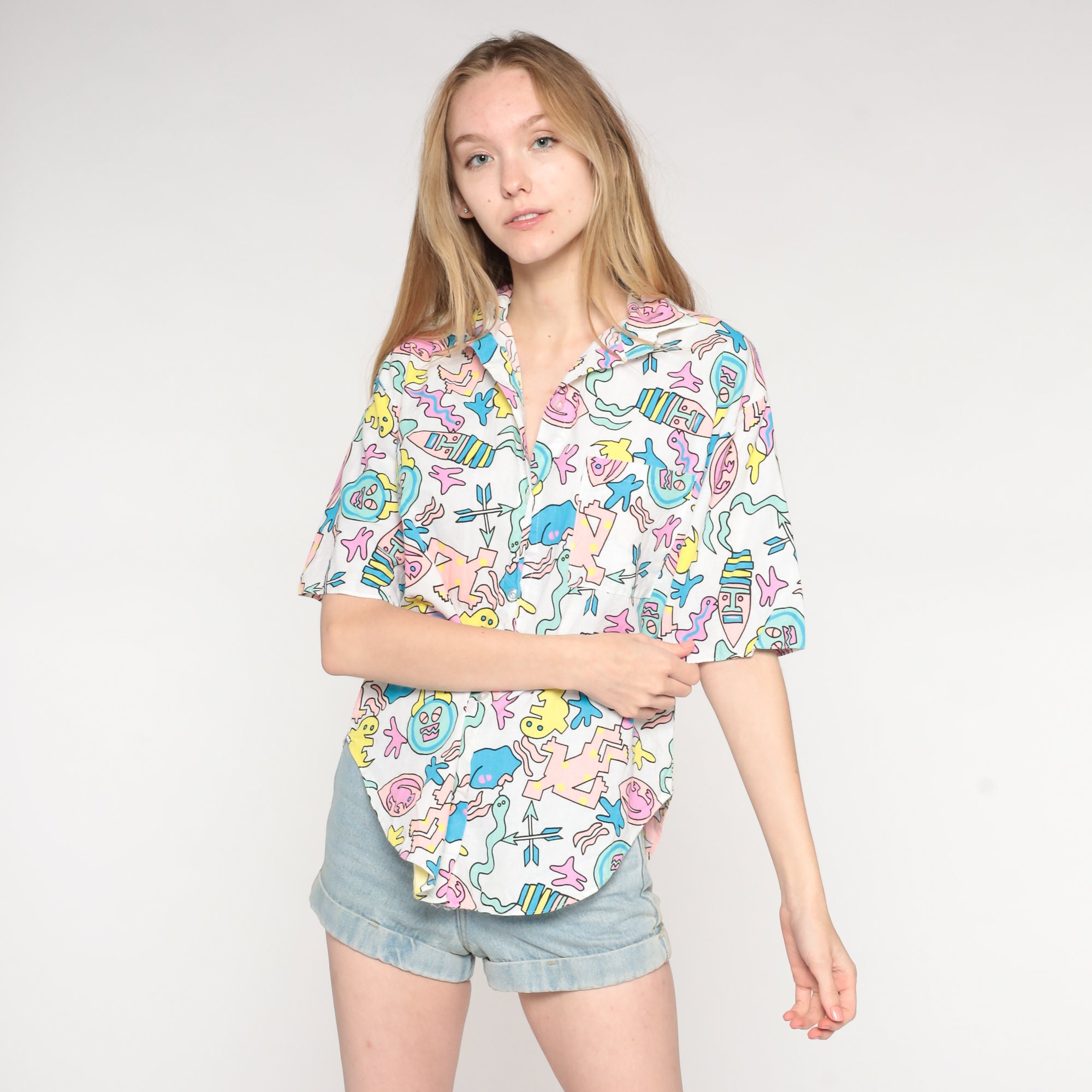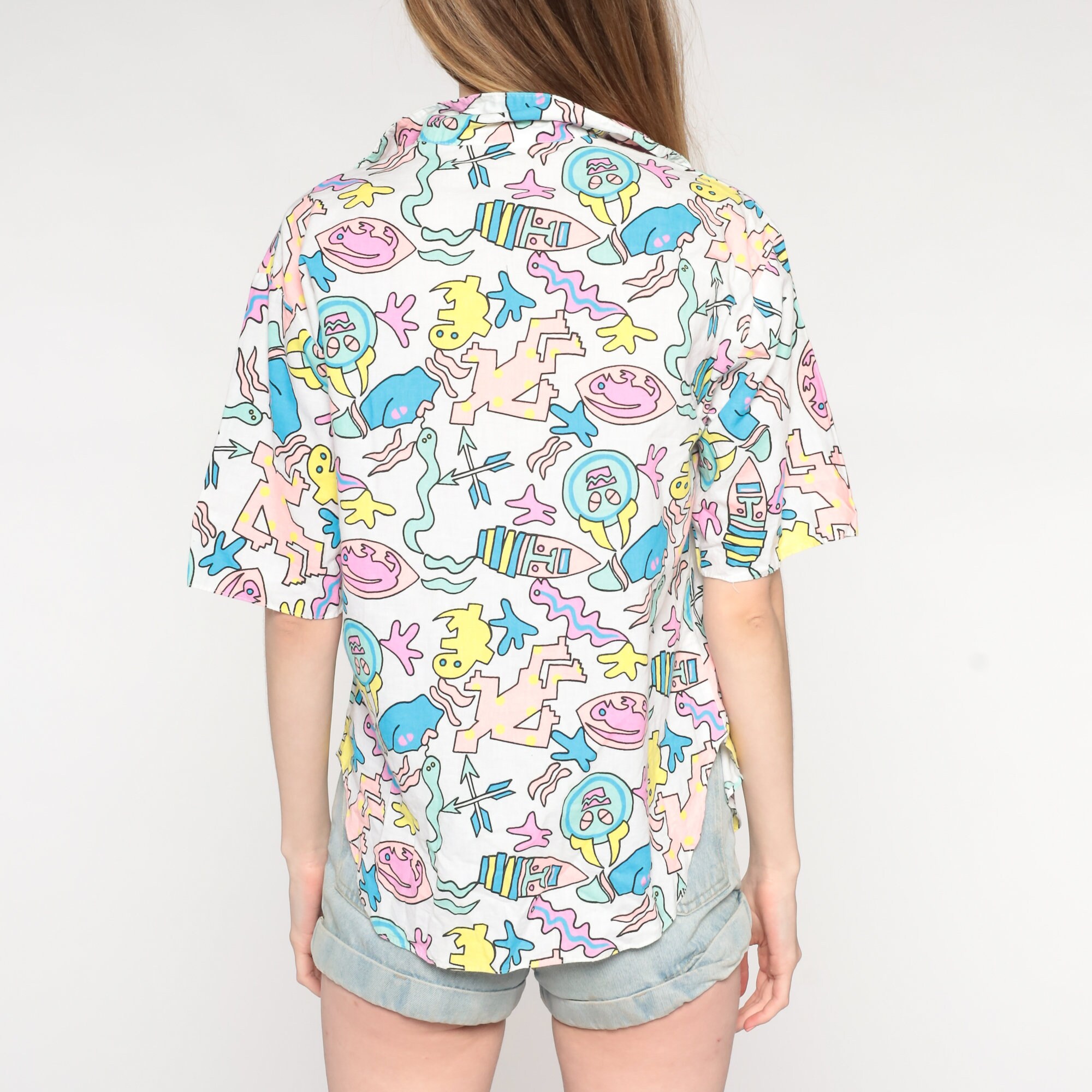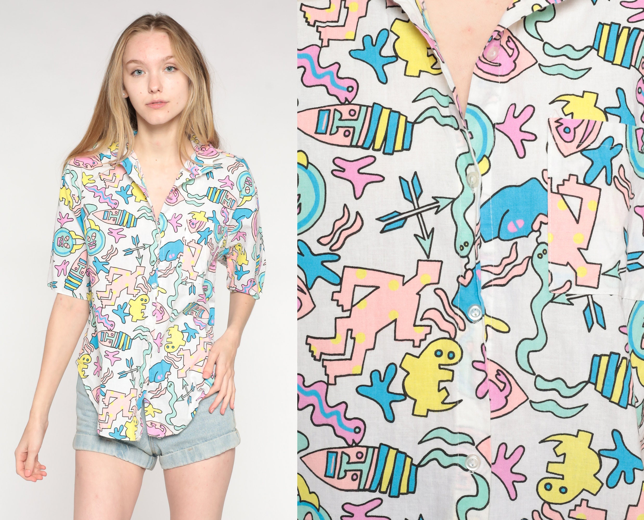 Vintage 80s 90s shirt with a tropical print with people, snakes, geckos and arrows.