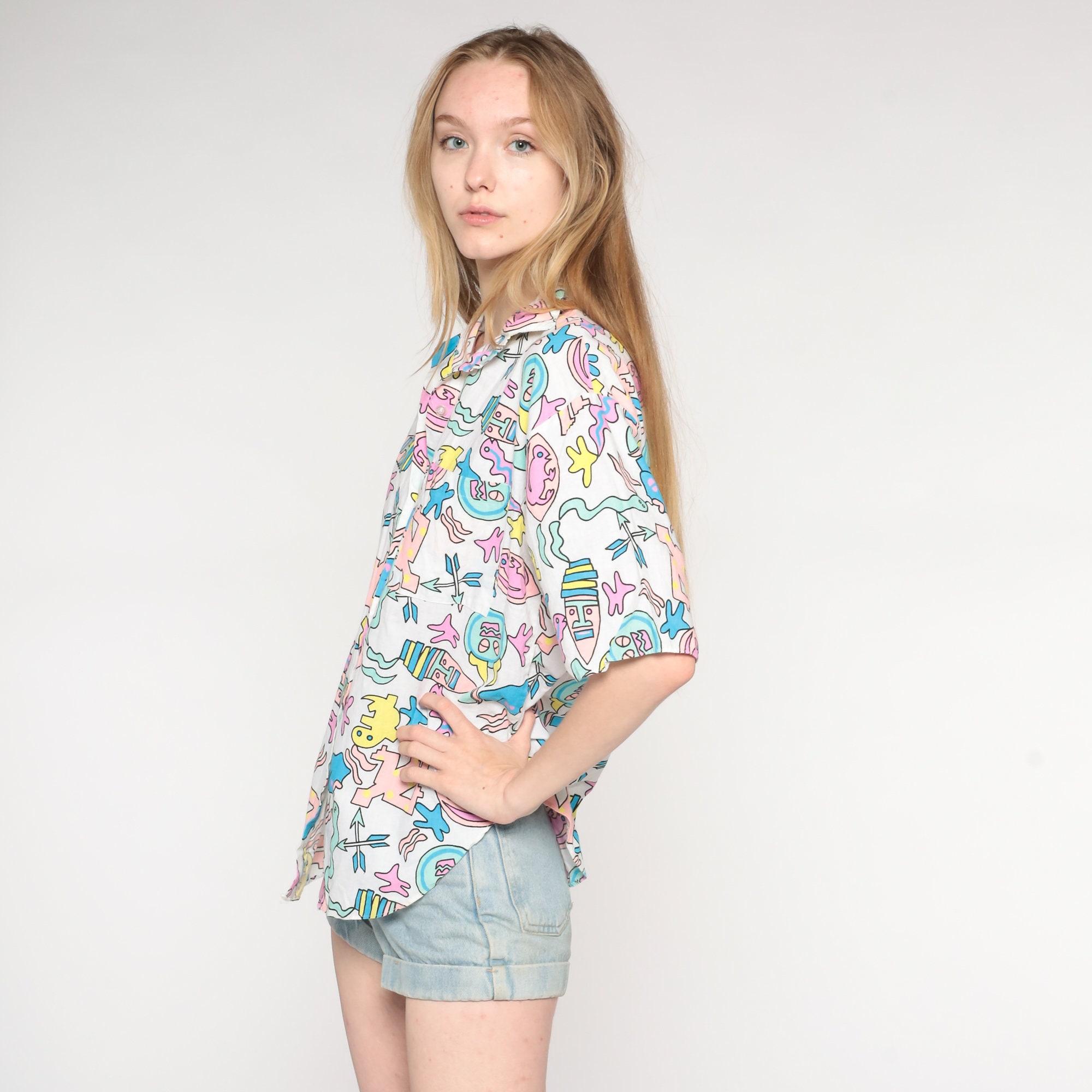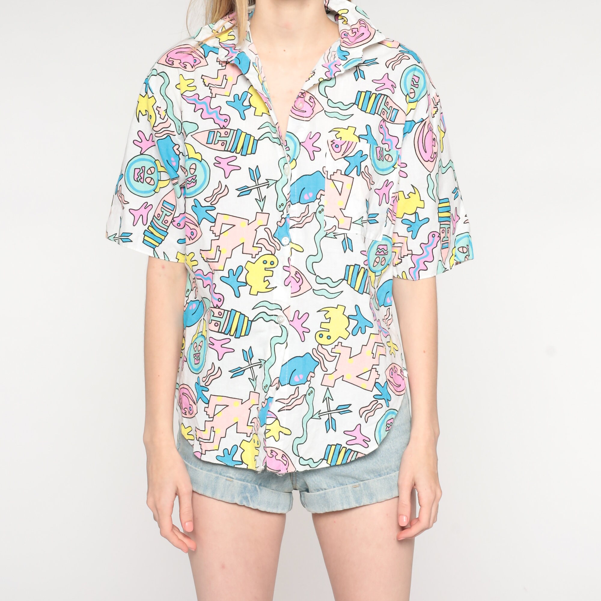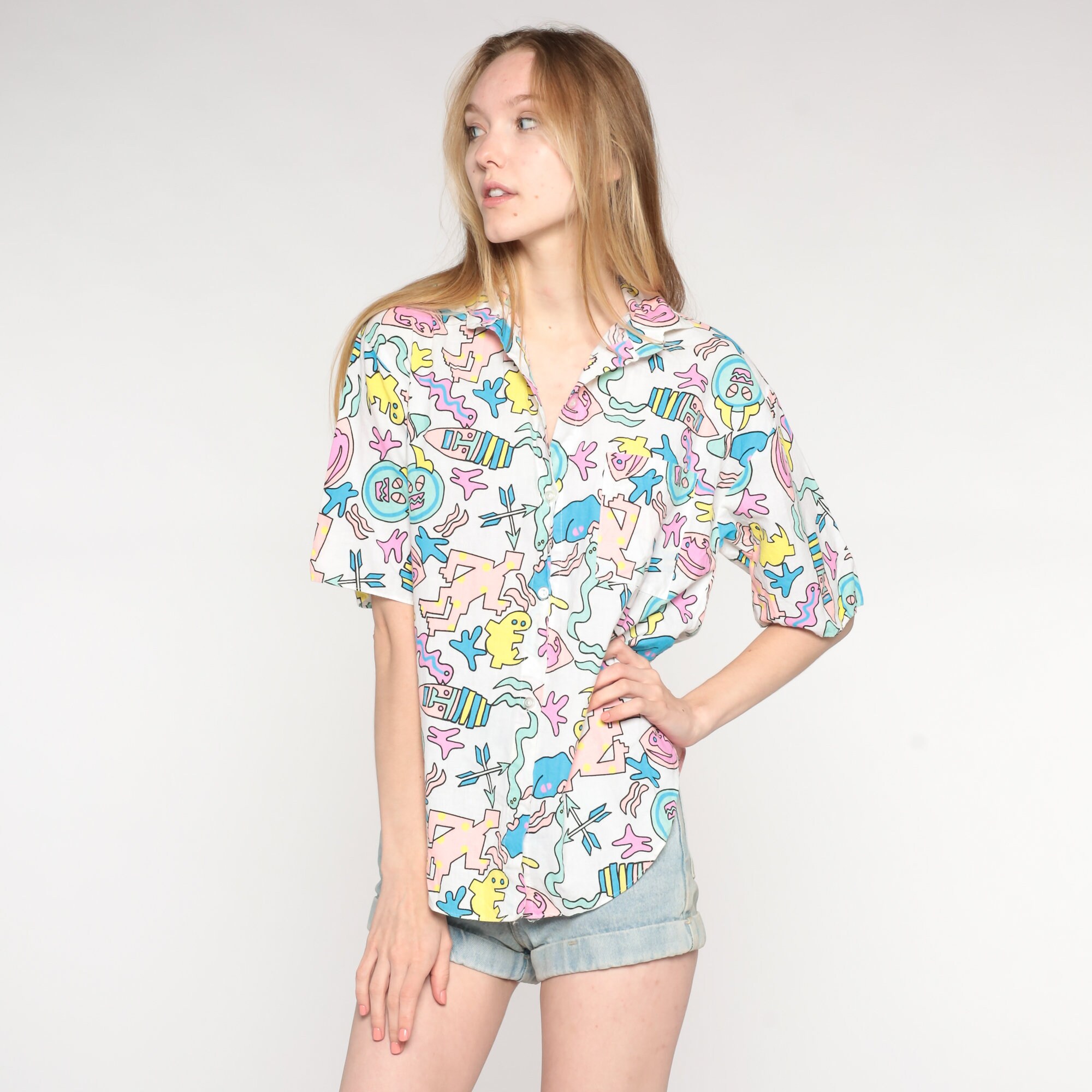 Vintage 80s 90s shirt with a tropical print with people, snakes, geckos and arrows.