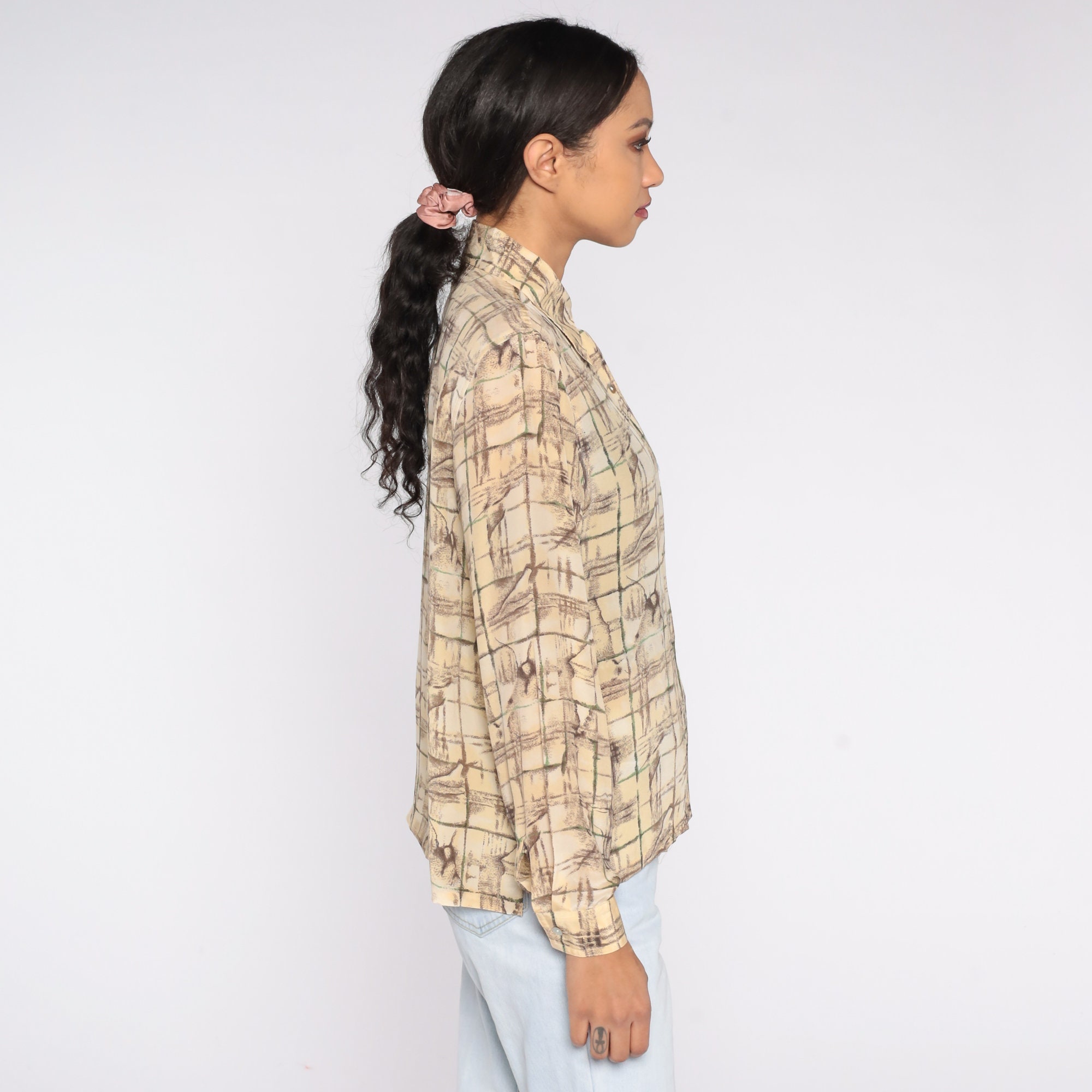 Vintage 90s shirt in cream and yellow silk with an abstract tile print. It has long sleeves and shell buttons up the front.