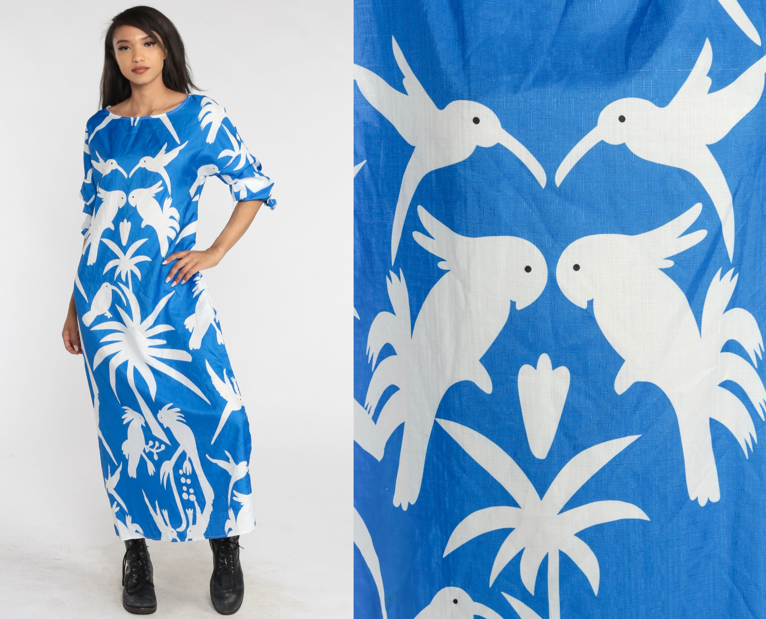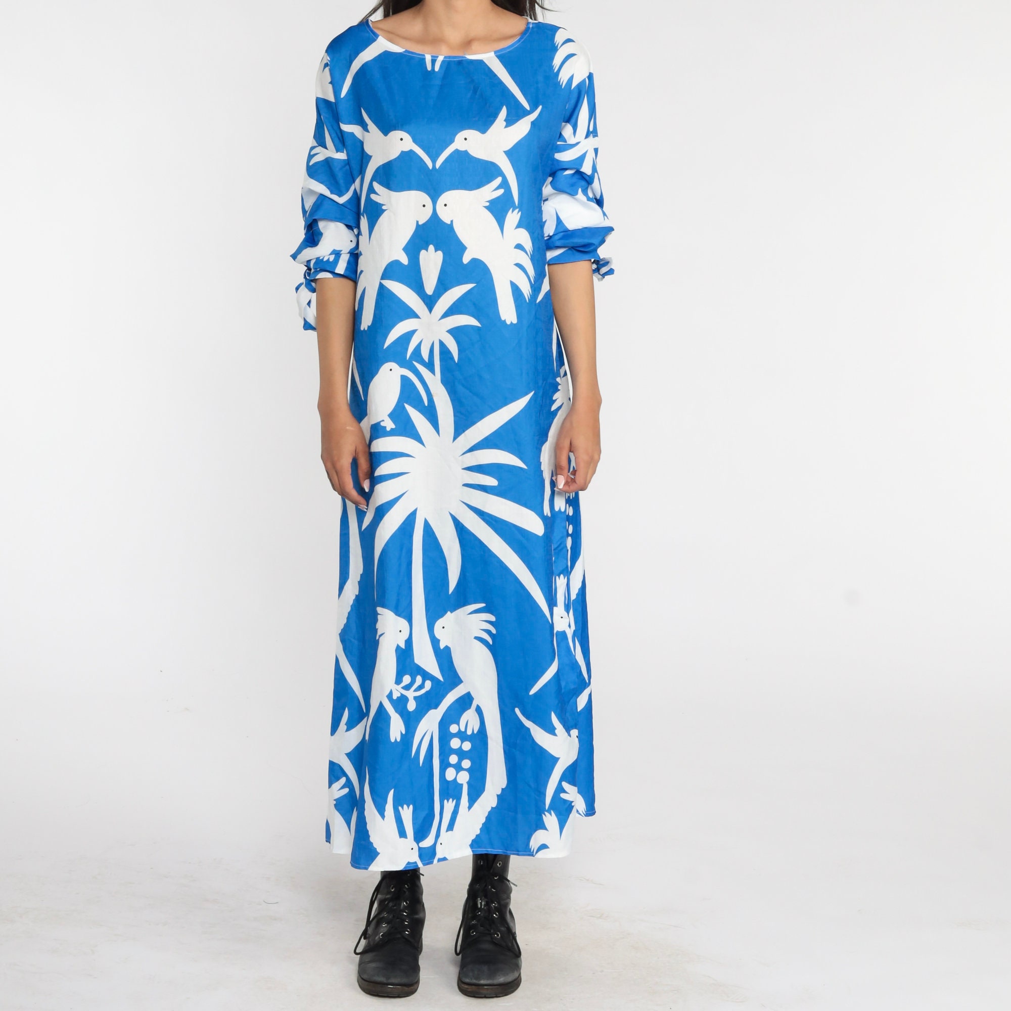 Vintage 80s dress in blue with a bird and Tropical palm tree print. Long sleeves that tie at the cuff. Maxi length.
