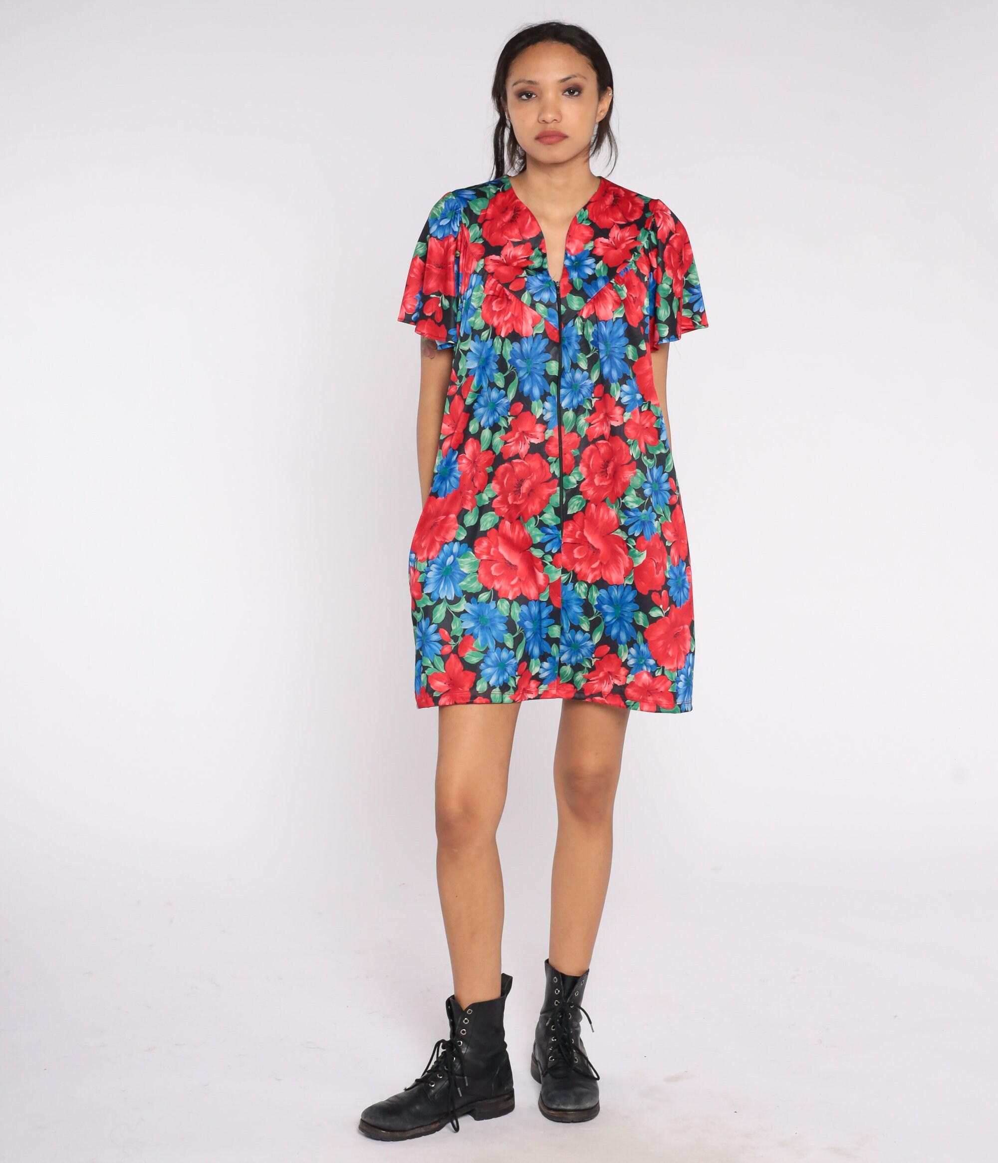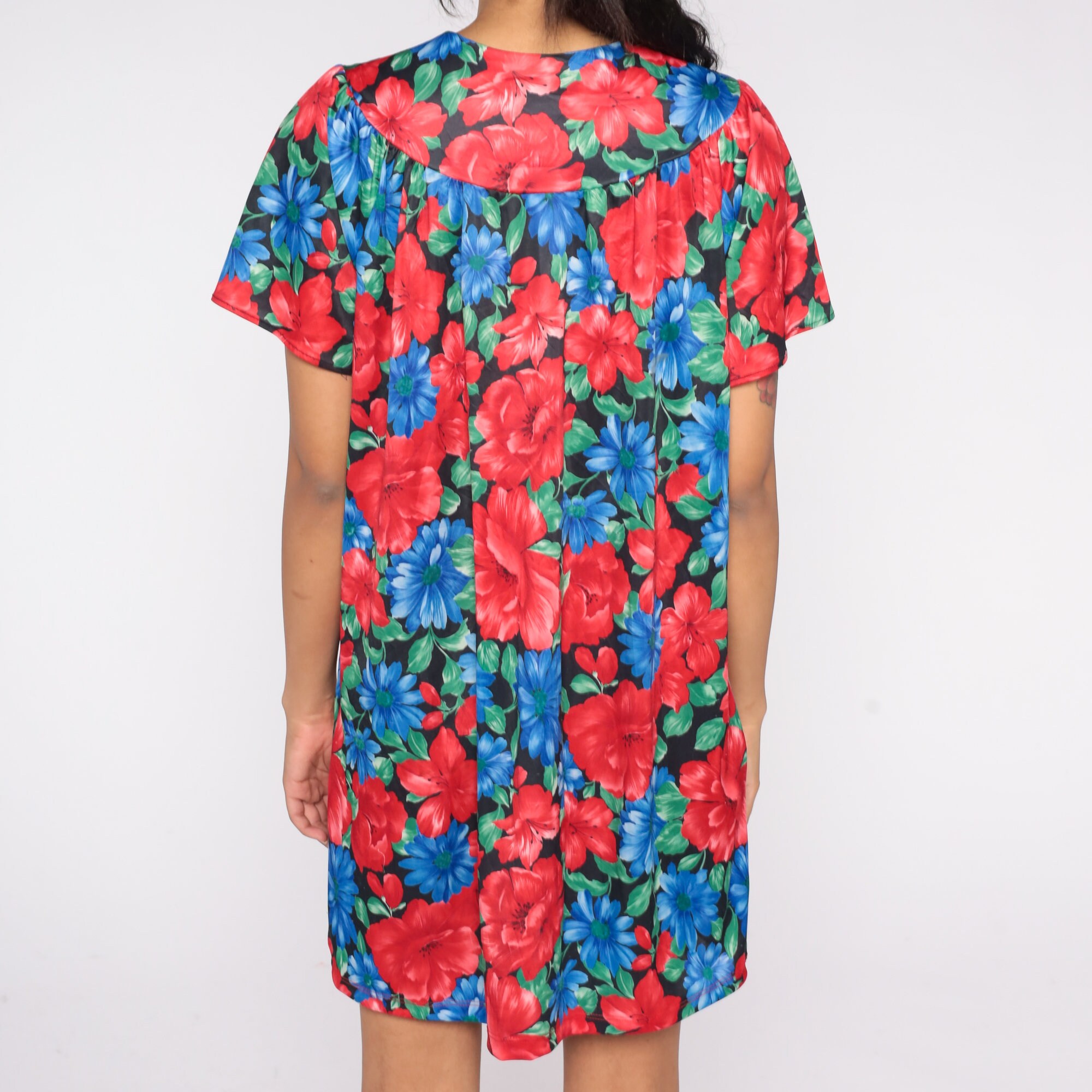 Vintage 80s pajama dress in red and blue with a floral print. It has a loose fit with short sleeves and buttons down the front. Mini length.
