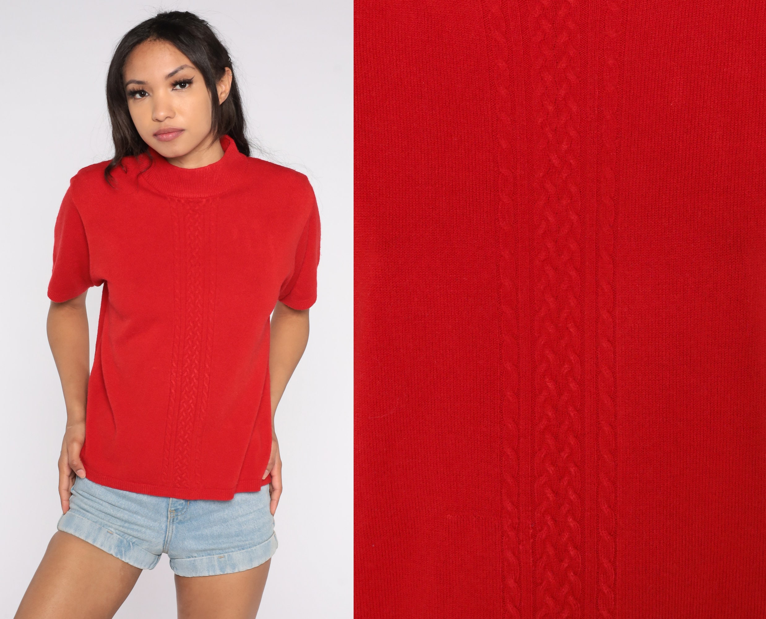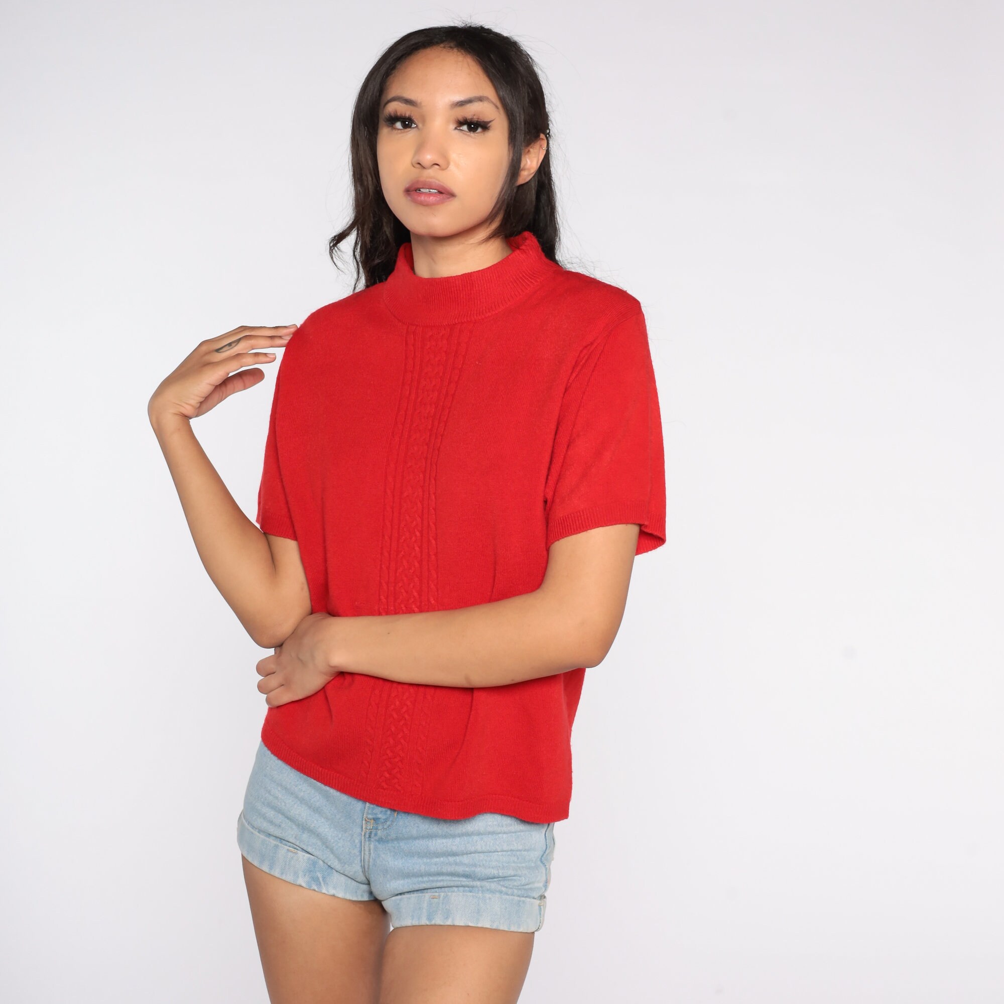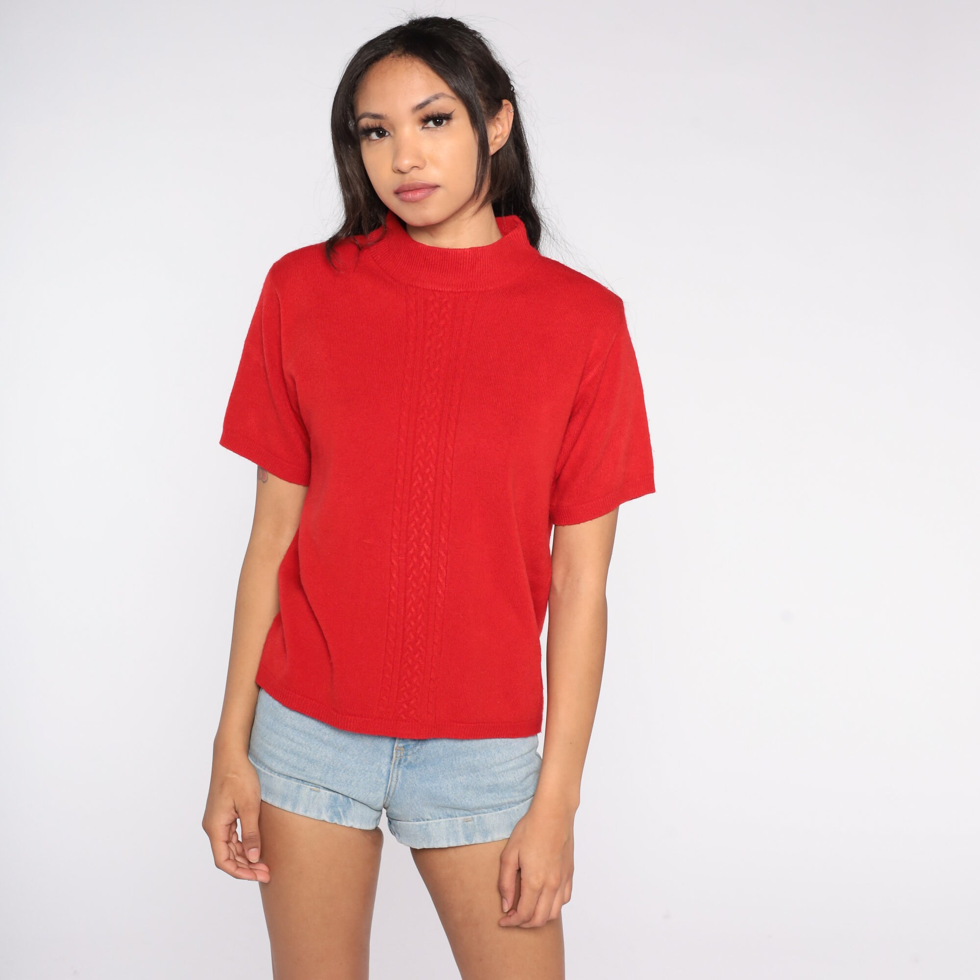 Vintage 90s top in a red knit with short sleeves and a mock neck.