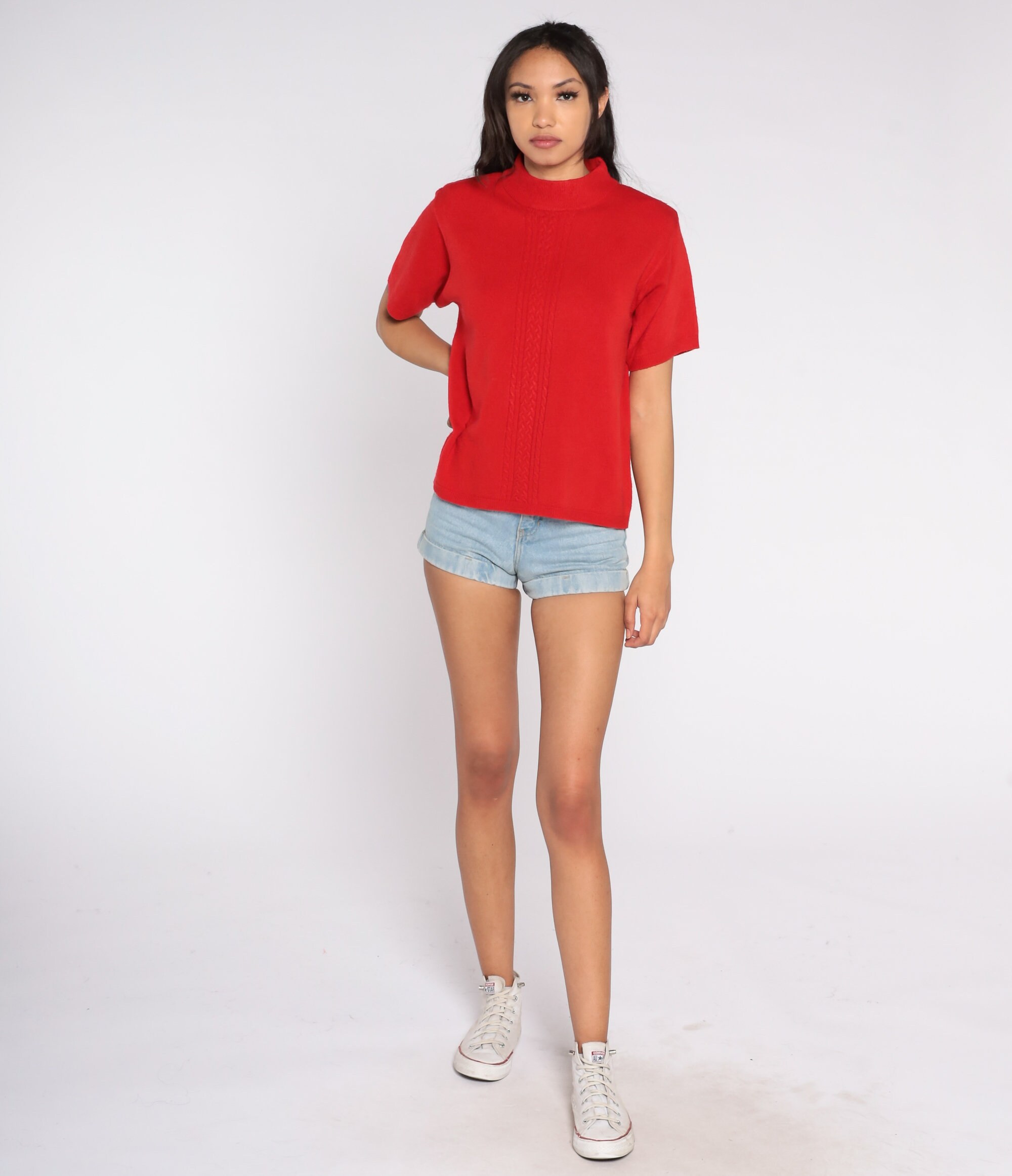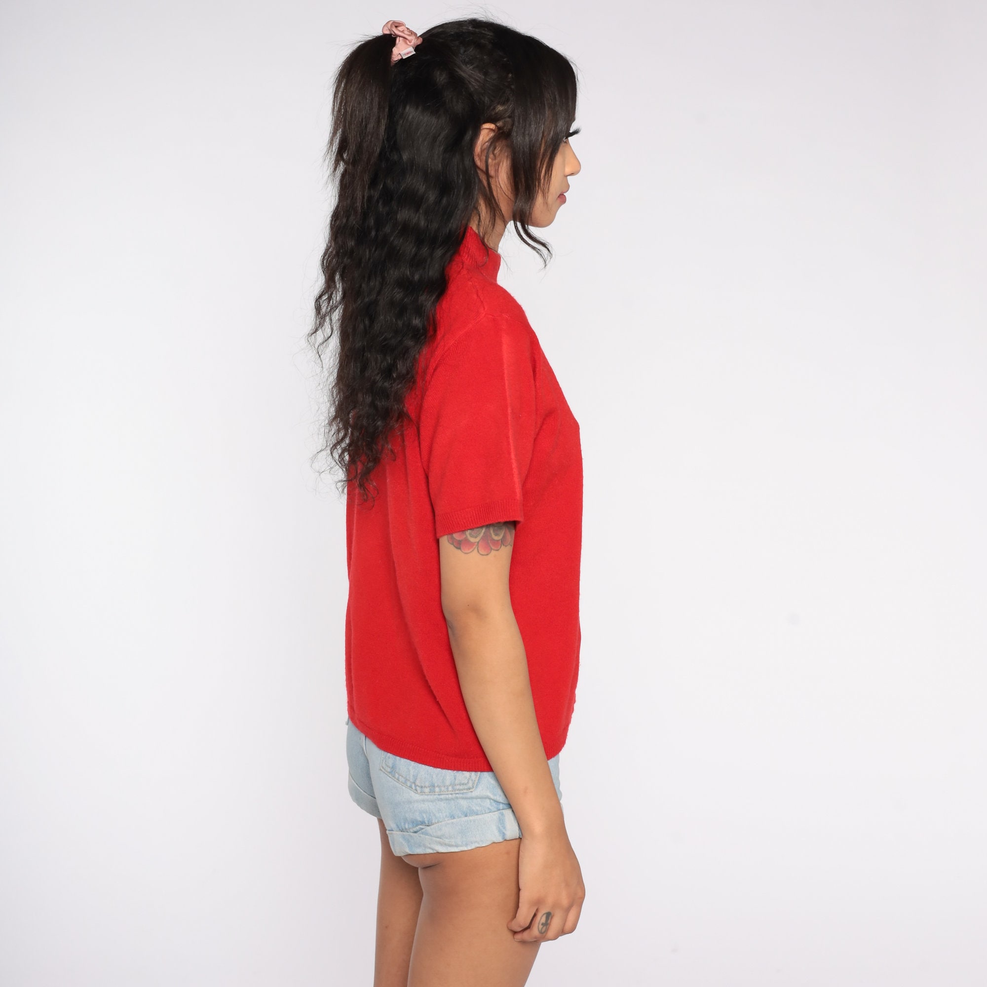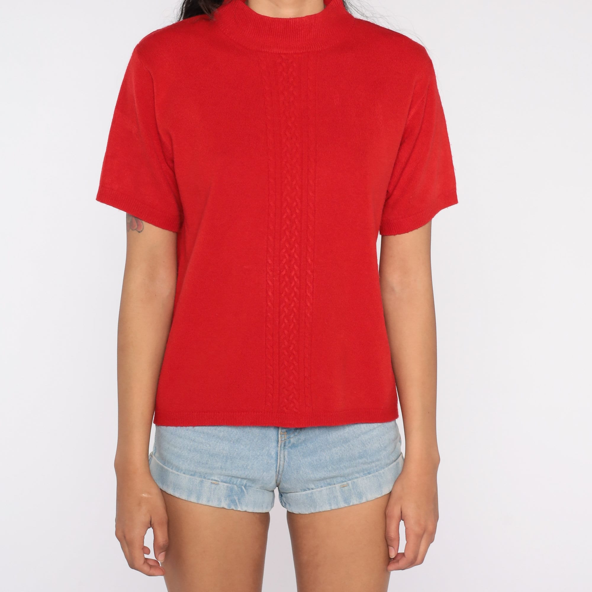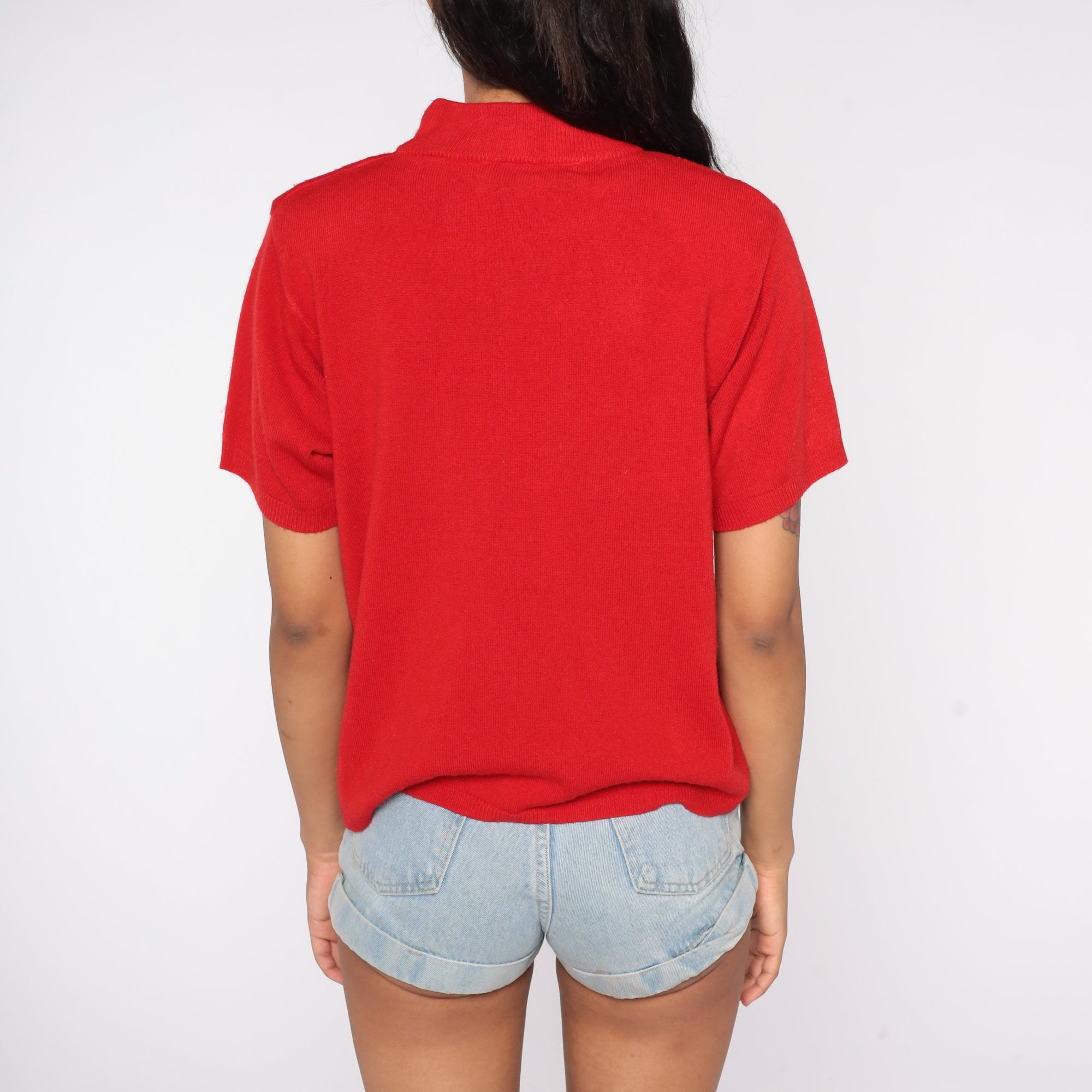 Vintage 90s top in a red knit with short sleeves and a mock neck.