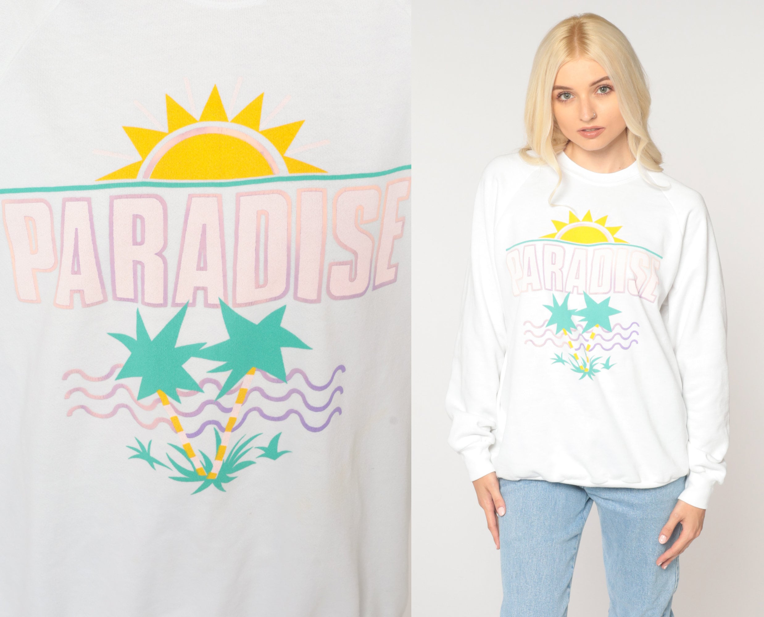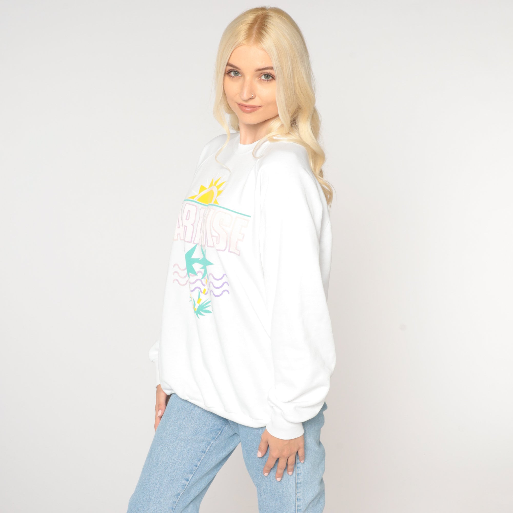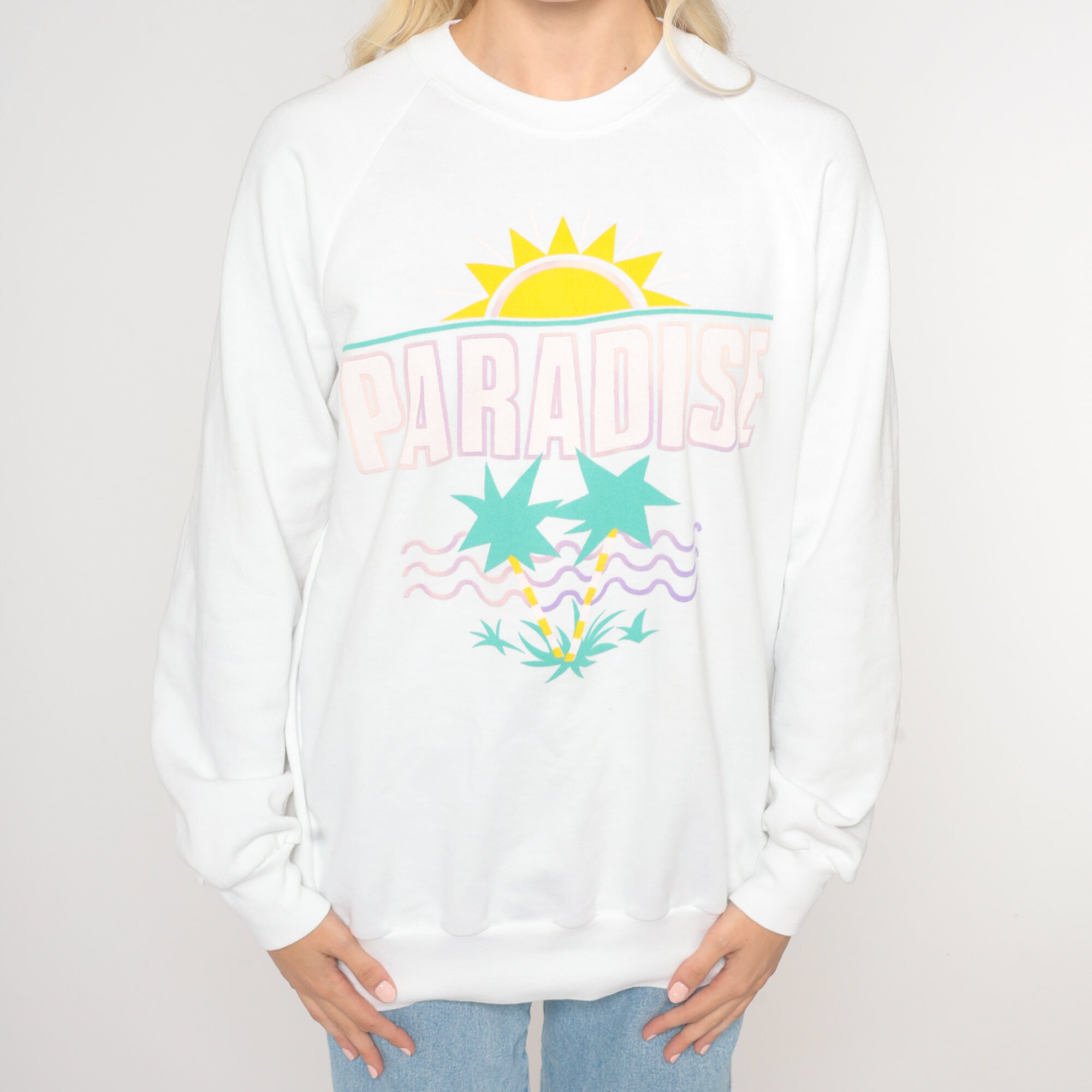 Vintage 80s sweatshirt with a tropical beach sunset print with Paradise on the front.