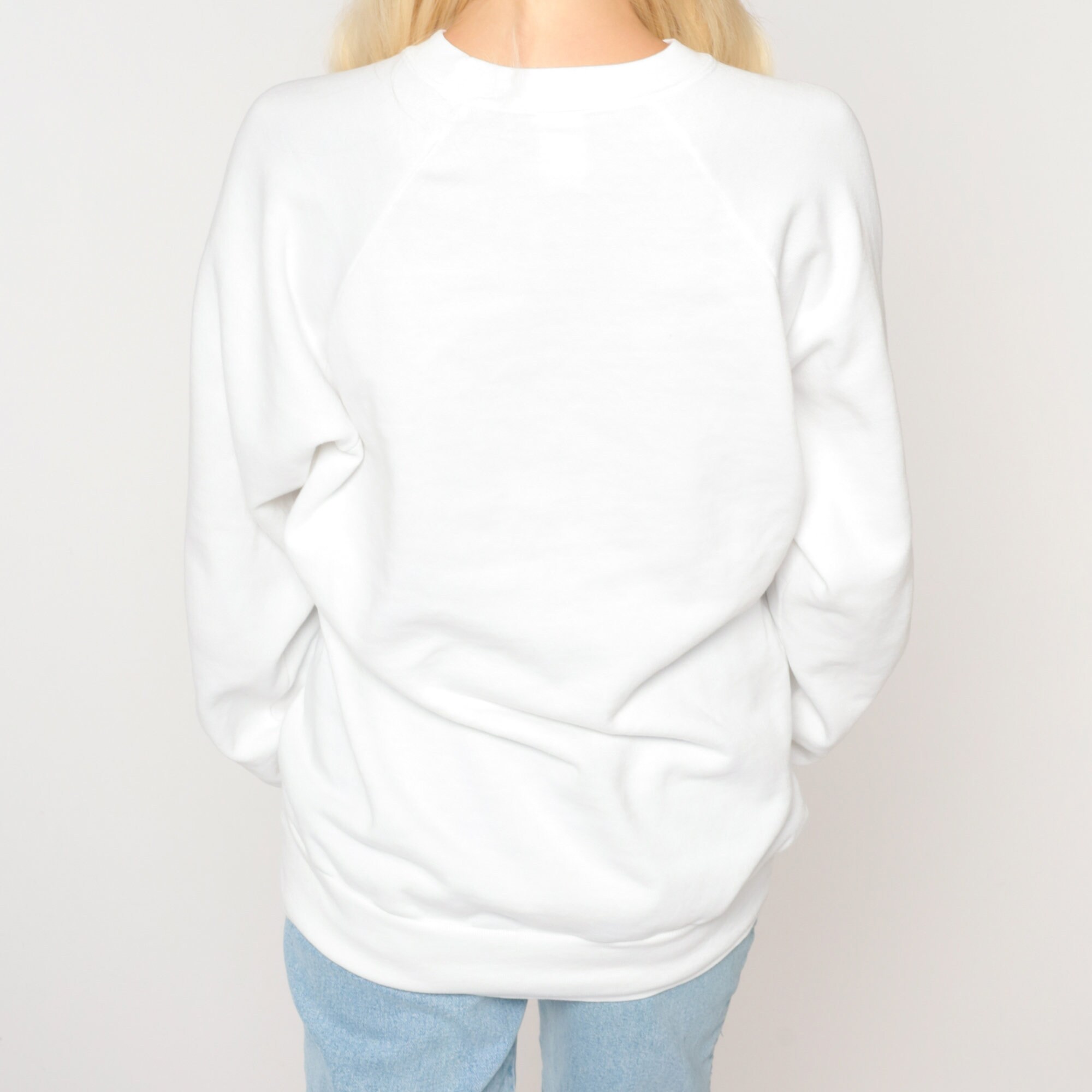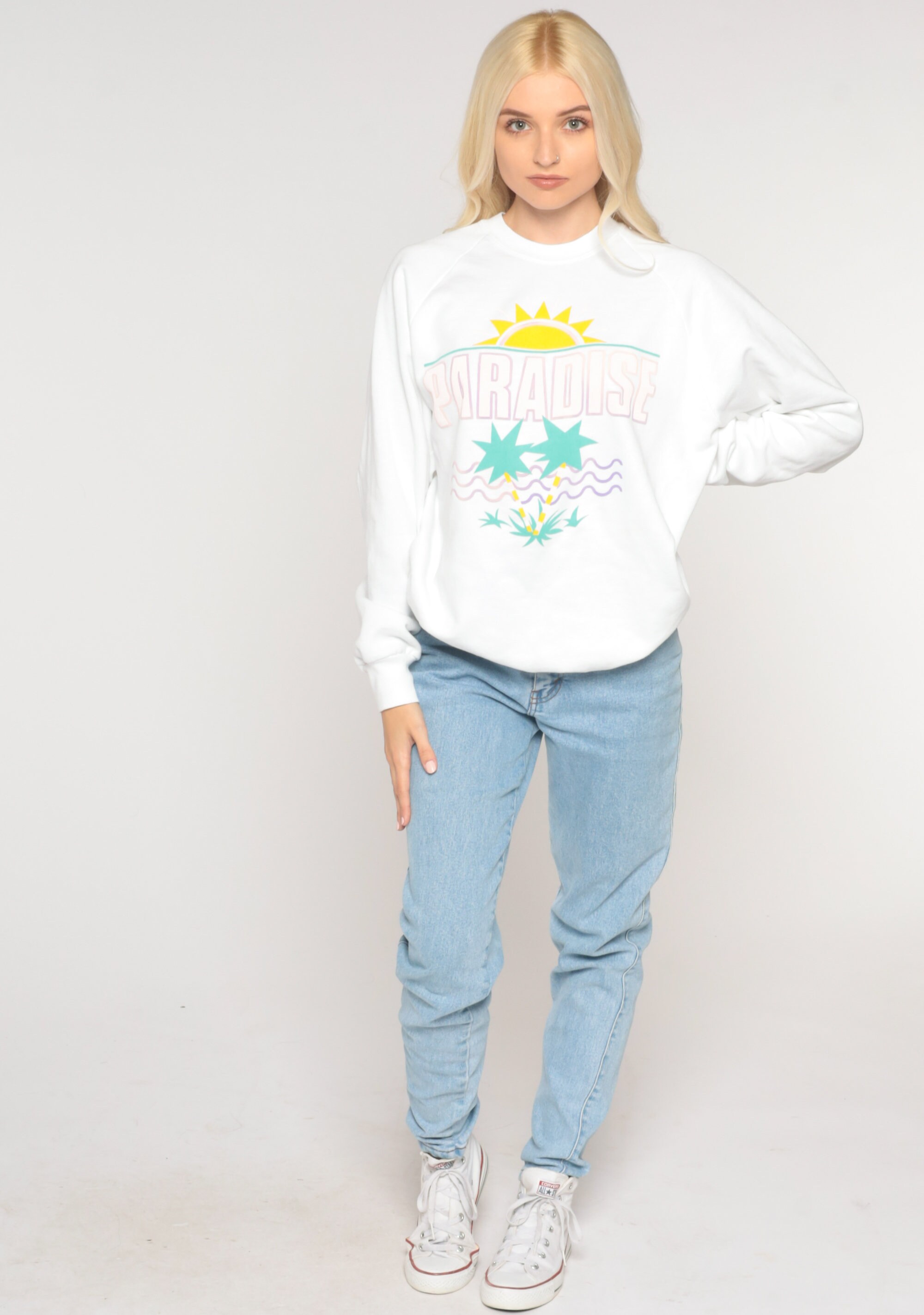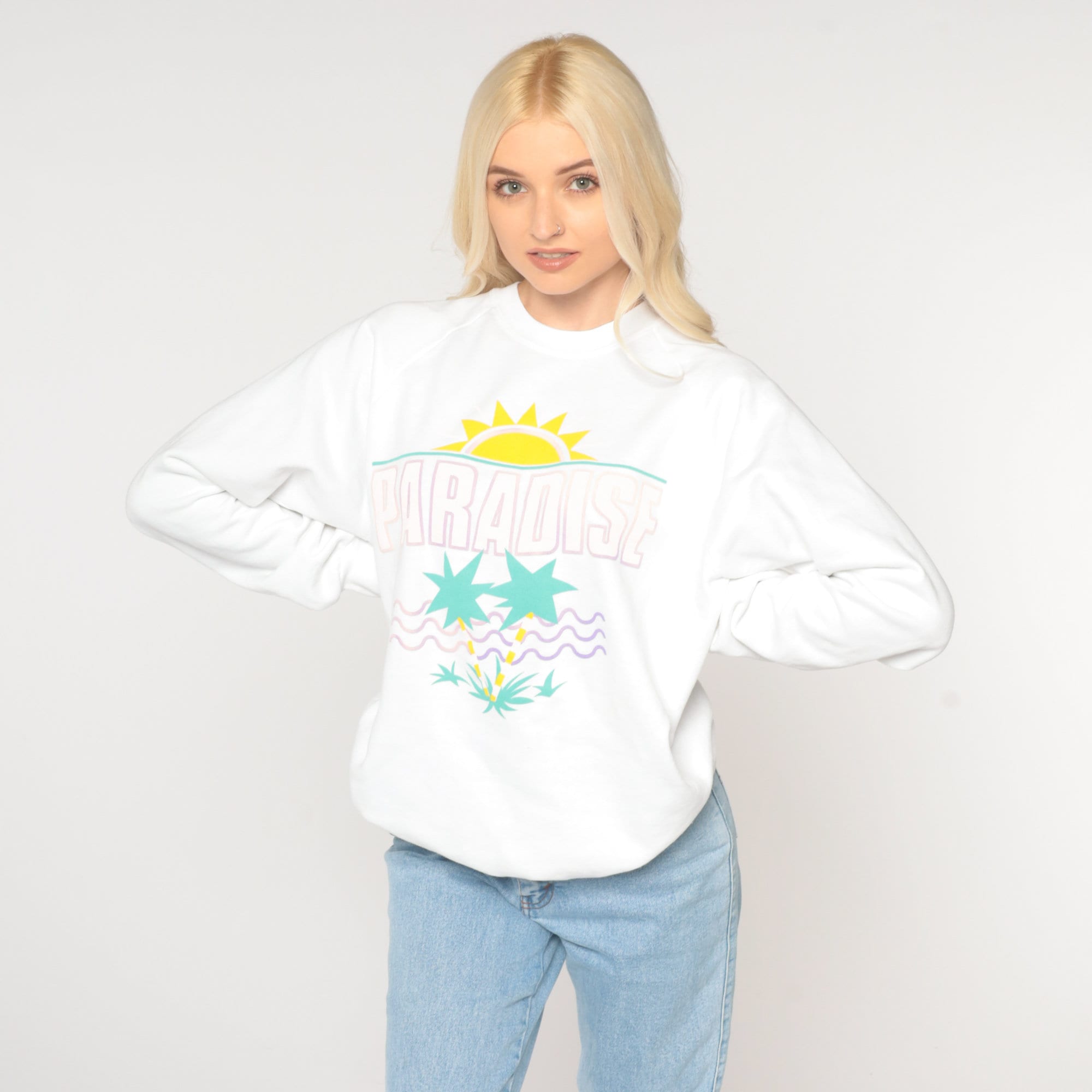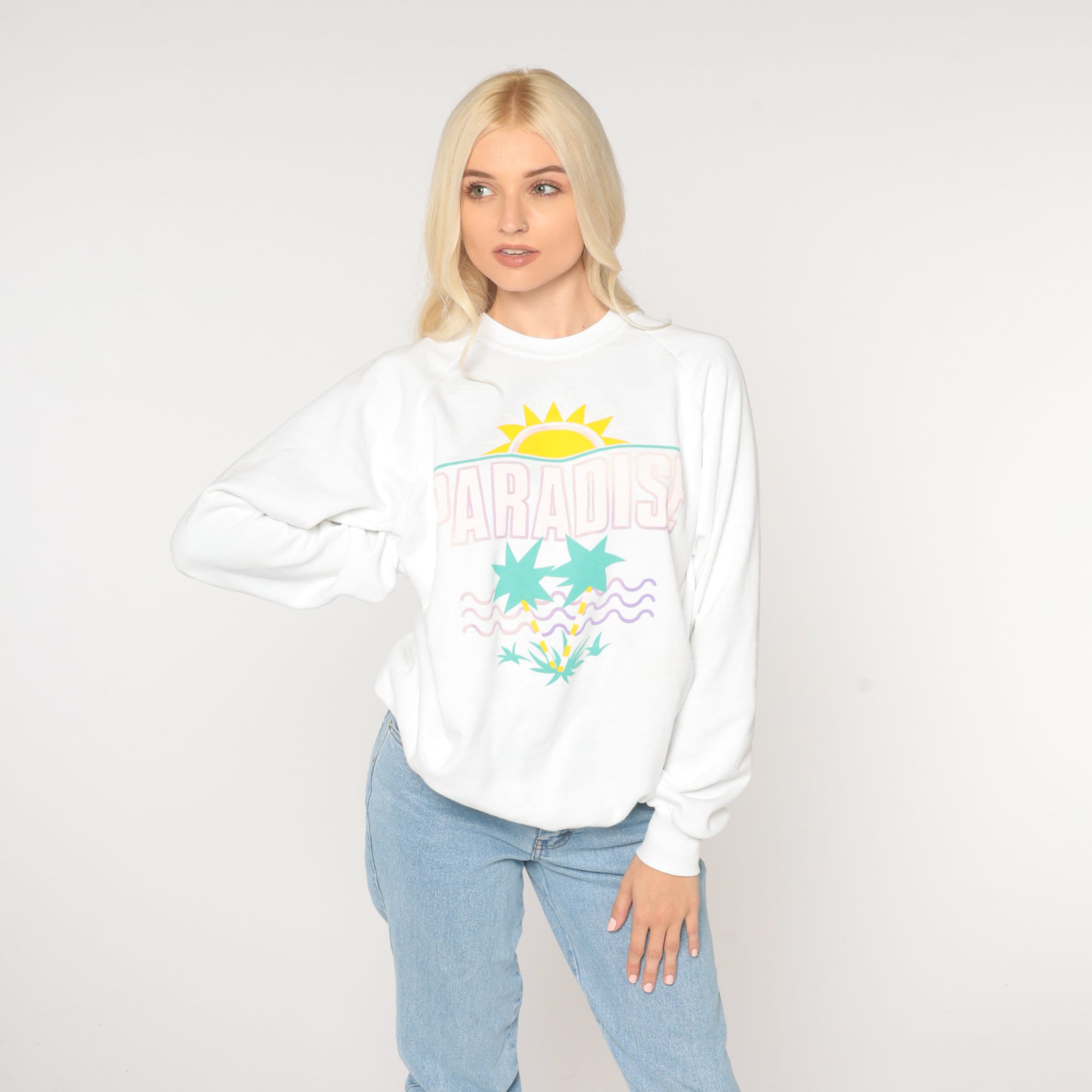 Vintage 80s sweatshirt with a tropical beach sunset print with Paradise on the front.