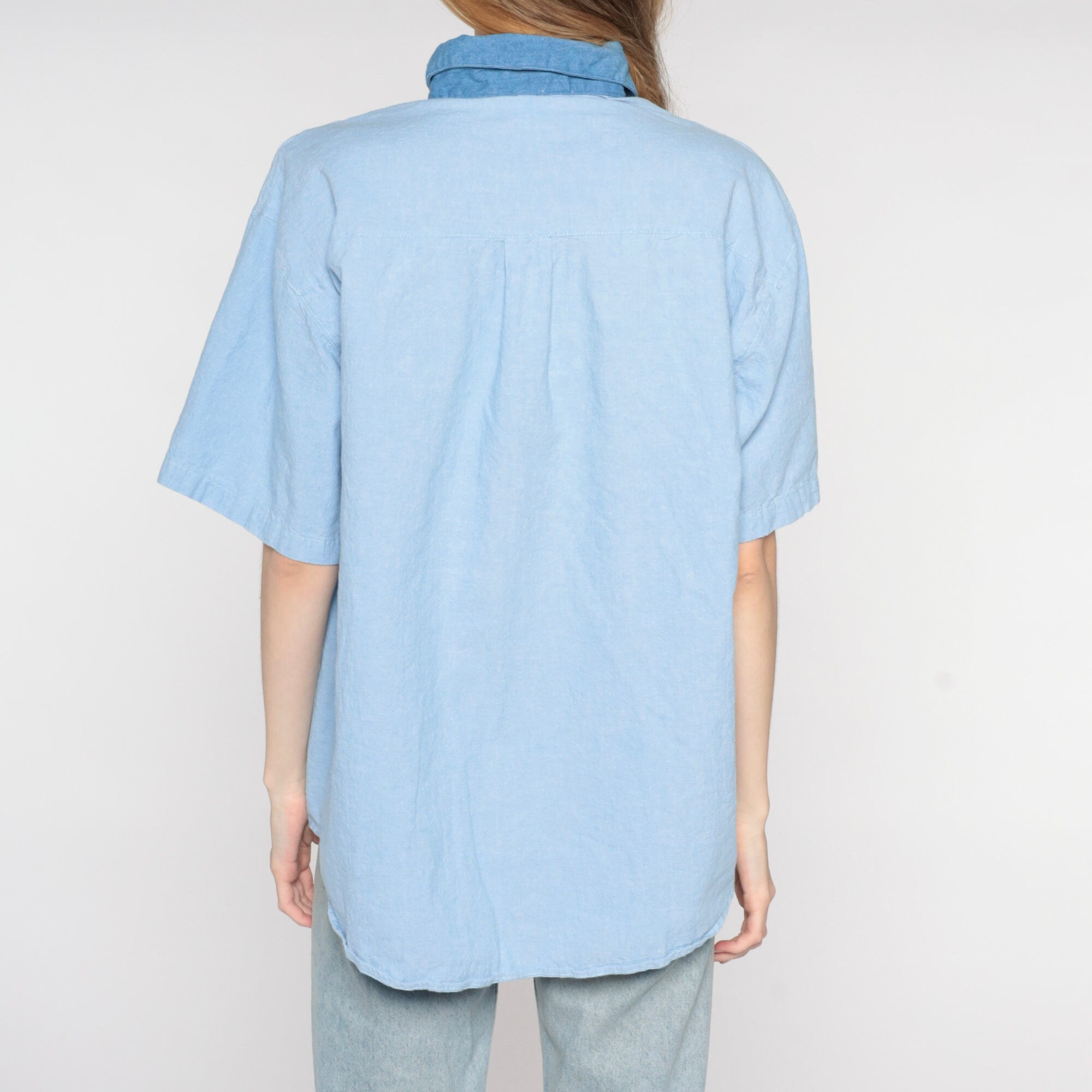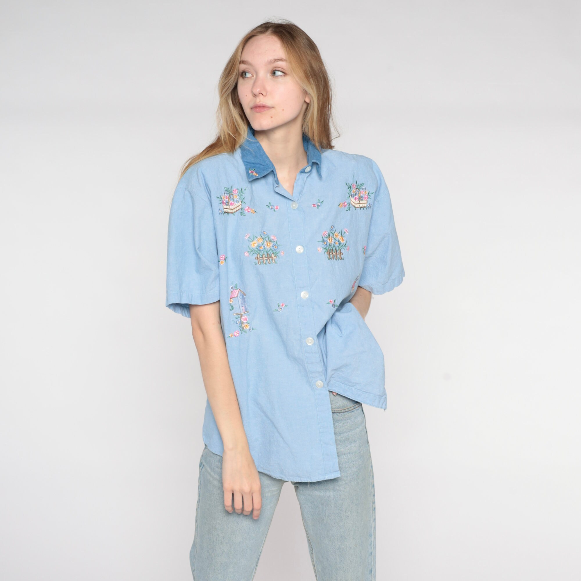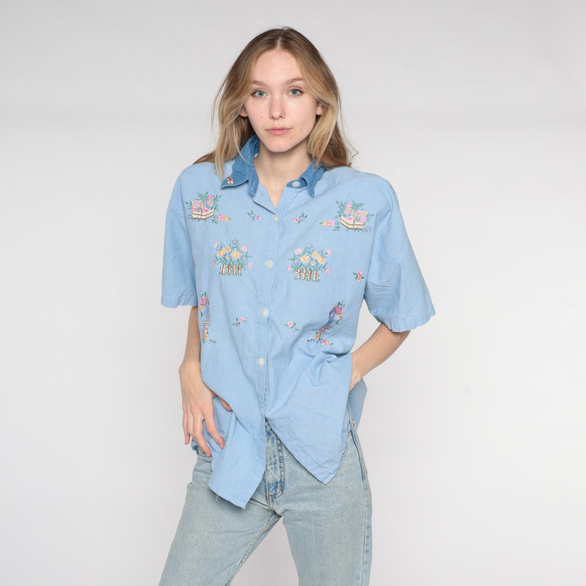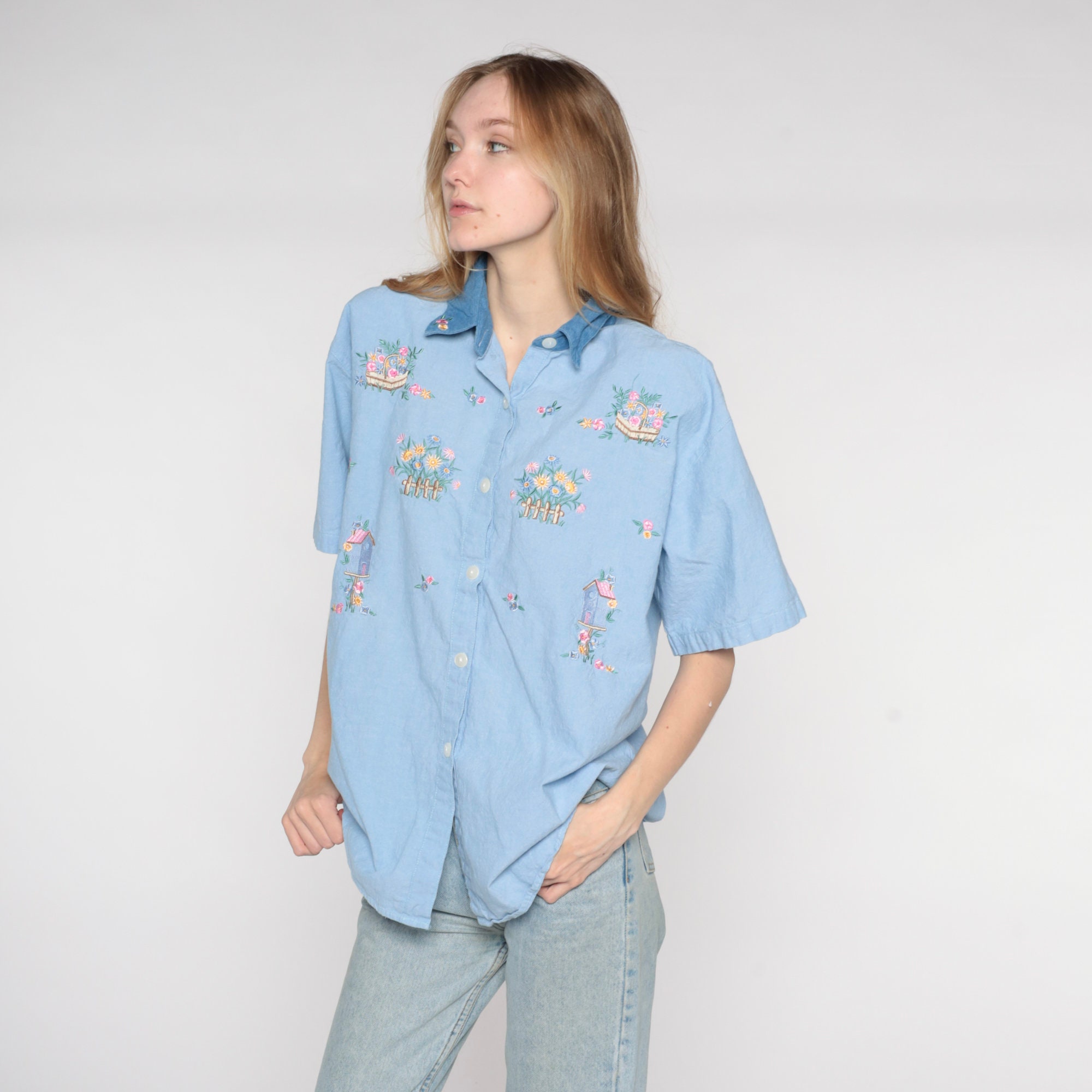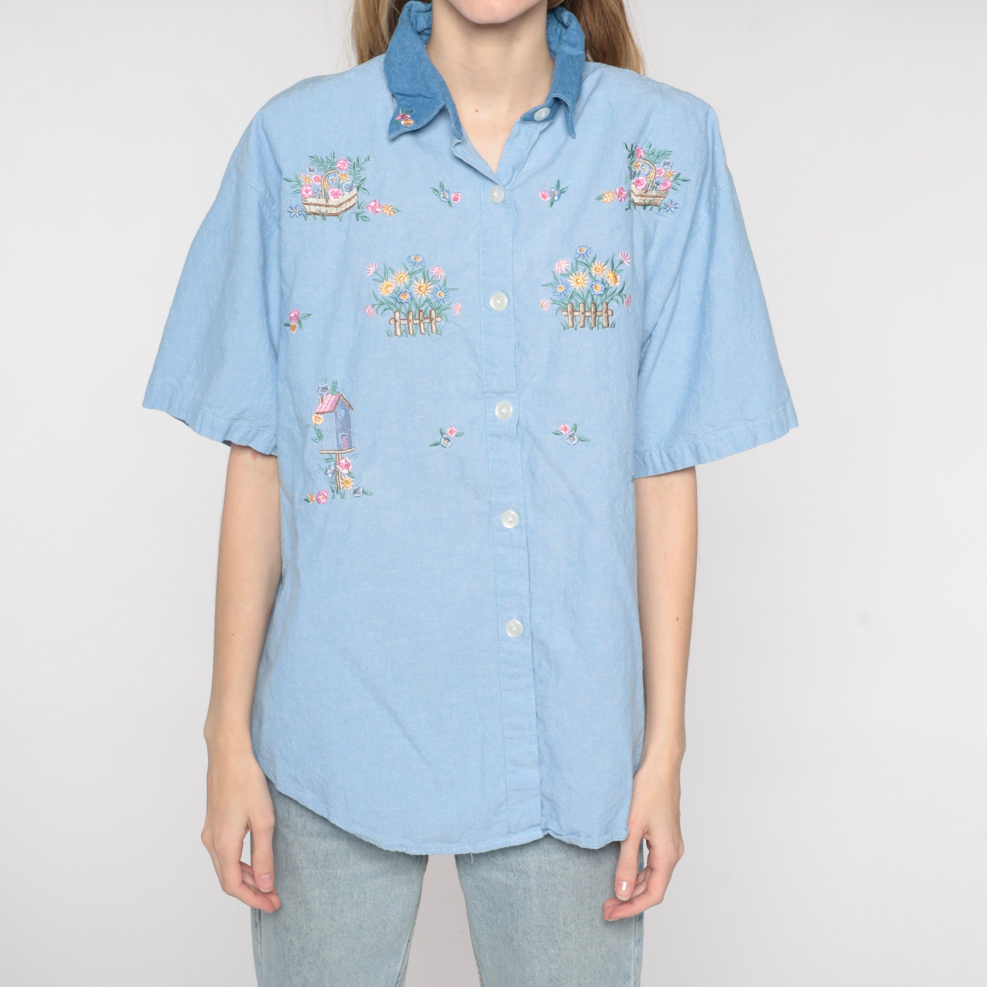 Vintage 90s shirt in blue with floral and birdhouse embroidery. Buttons up the front, short sleeves.