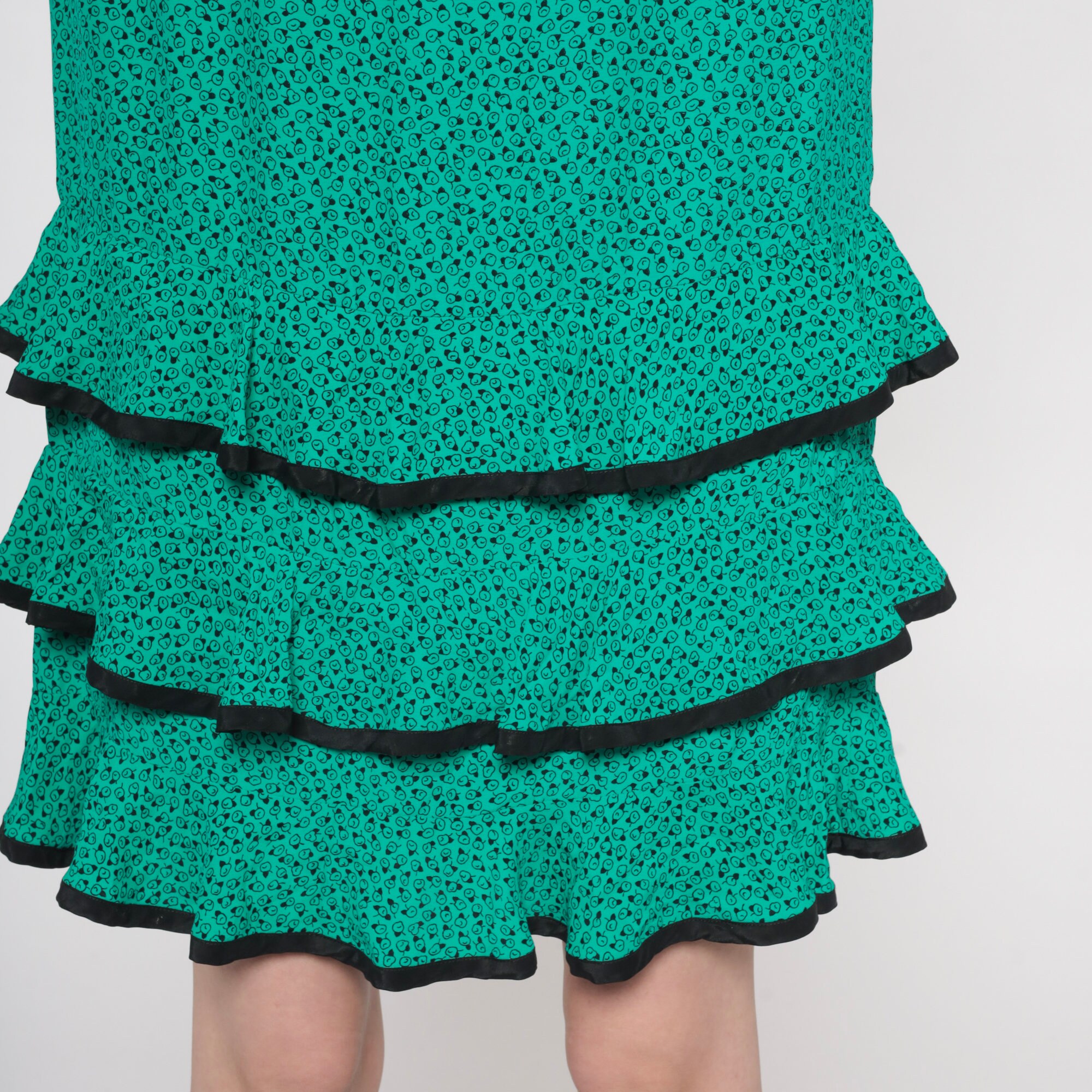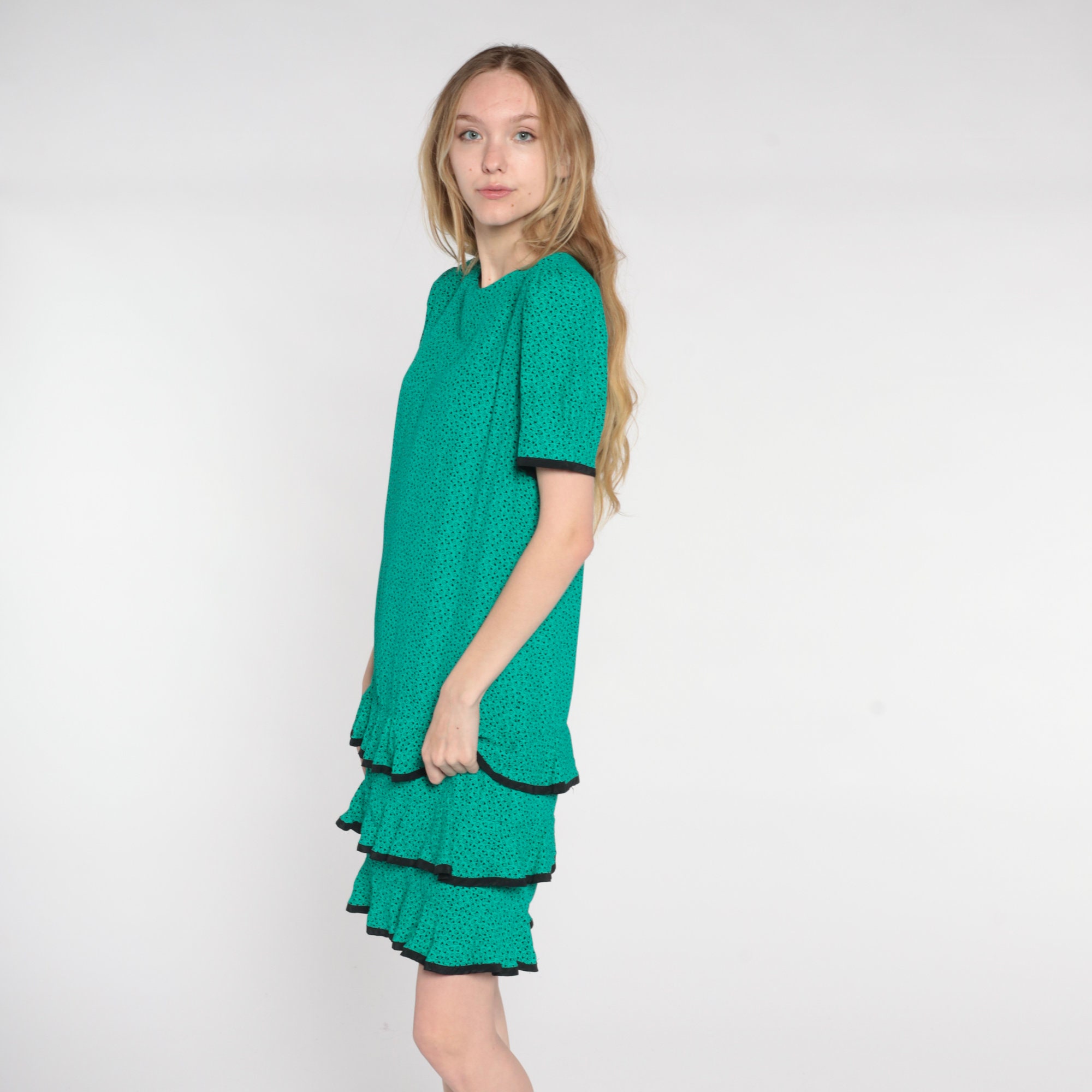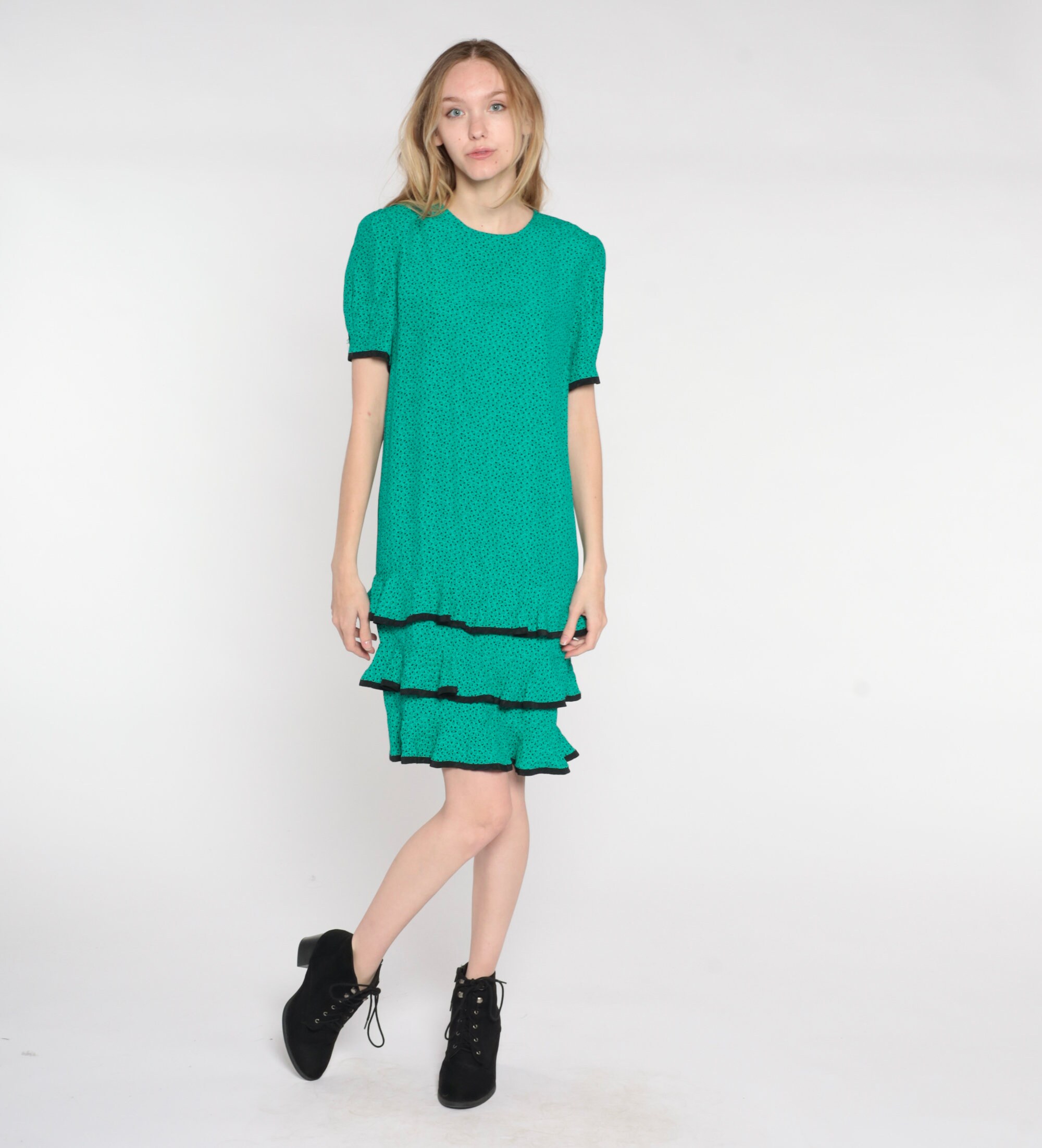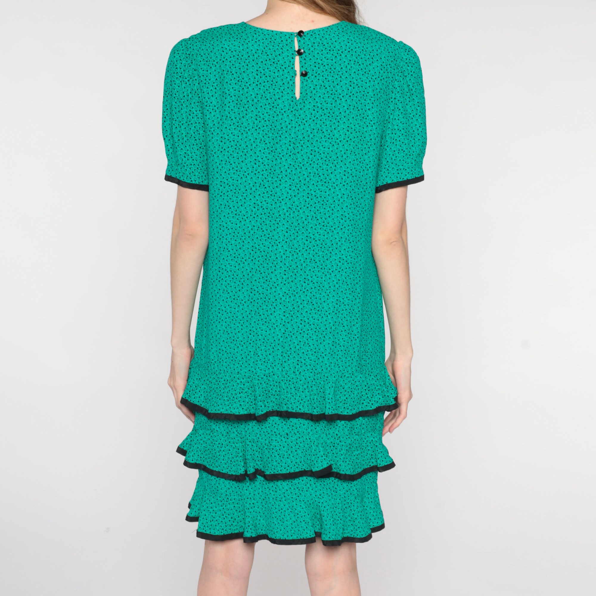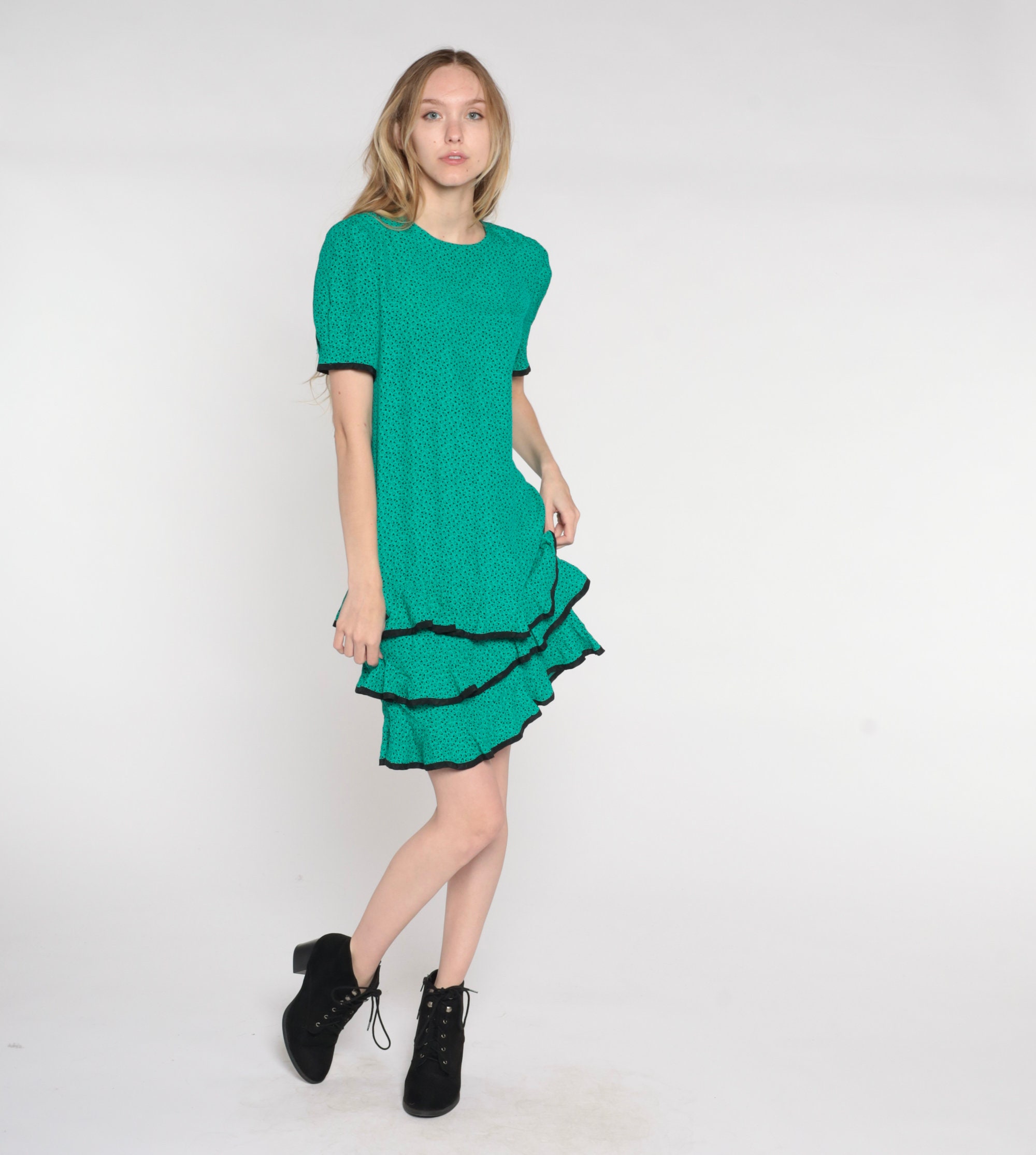 Vintage 80s dress in green with a tiny floral print. Shift cut with short sleeves and a ruffled skirt. Mini length with keyhole buttons on the back.