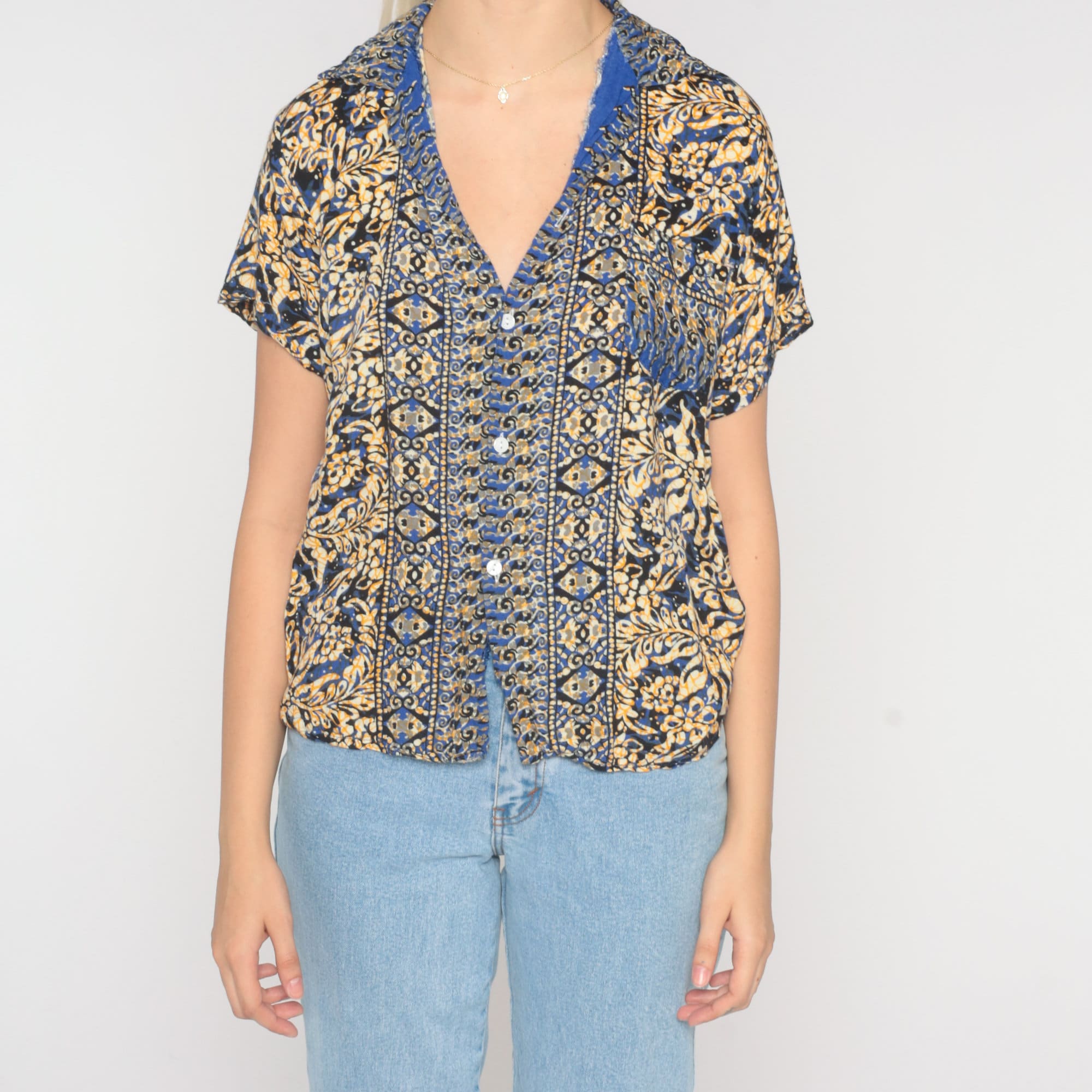 Vintage 90s shirt with a batik floral print. Buttons up the front with short sleeves.