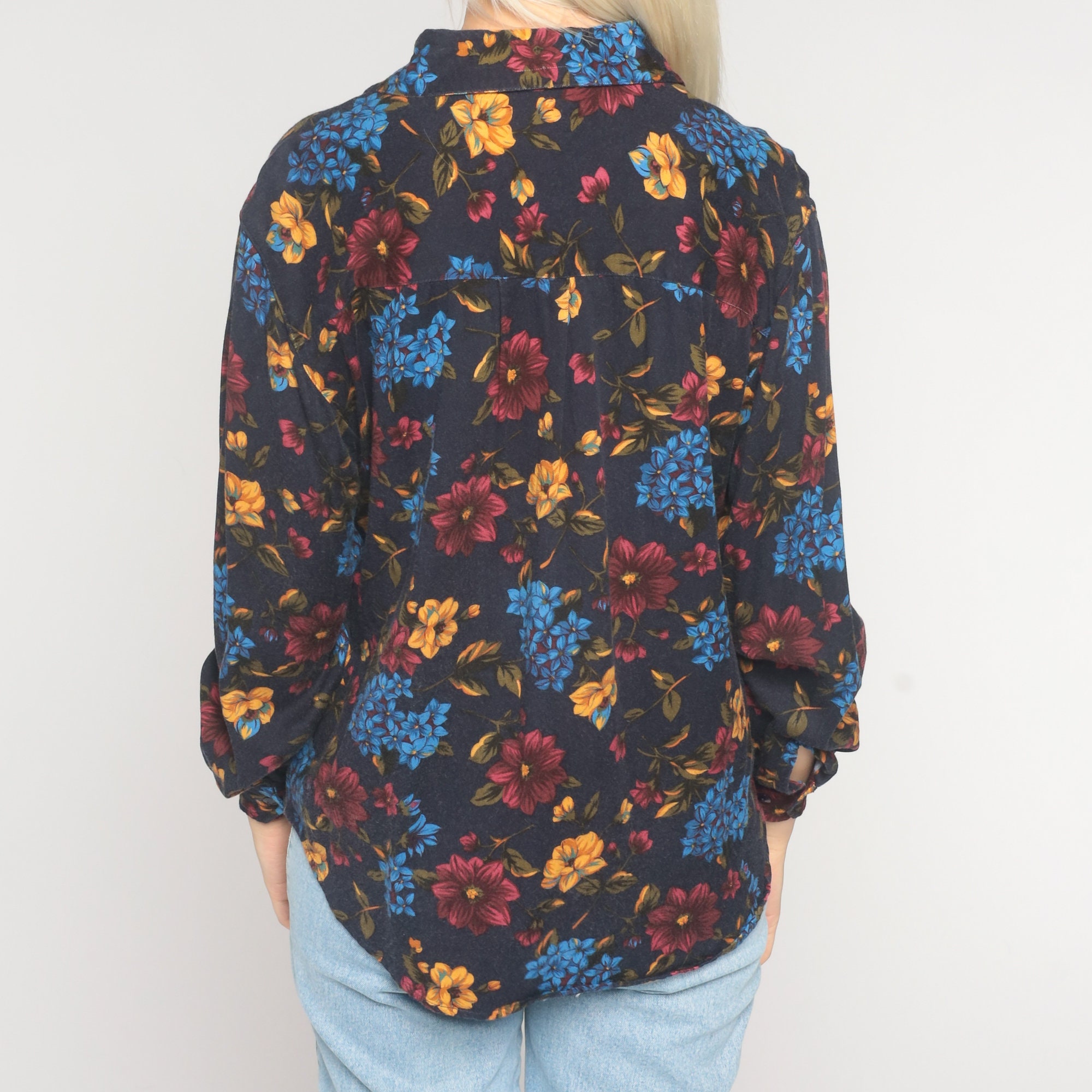 Vintage 90s shirt in navy blue with a floral print. It has a collar, buttons up the front, and long sleeves.