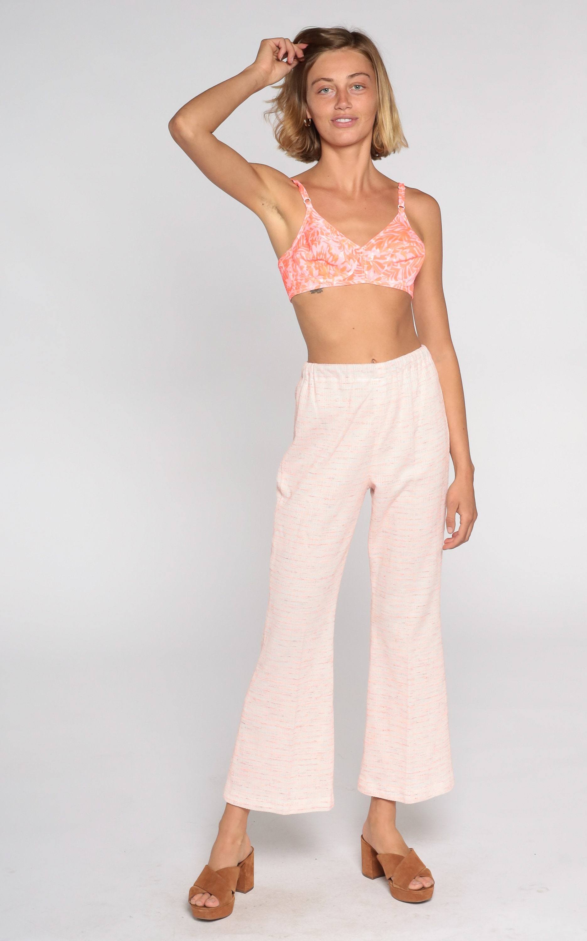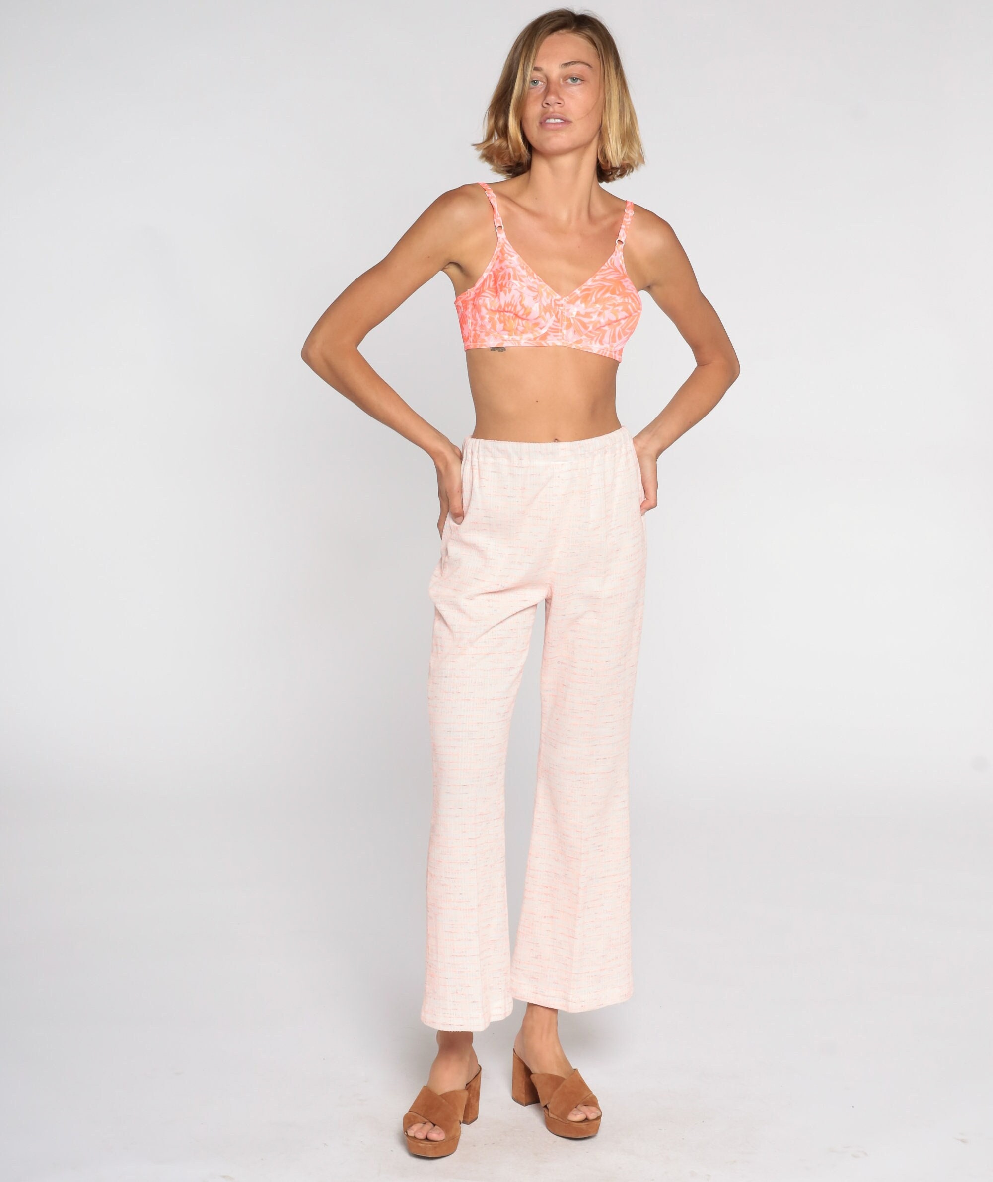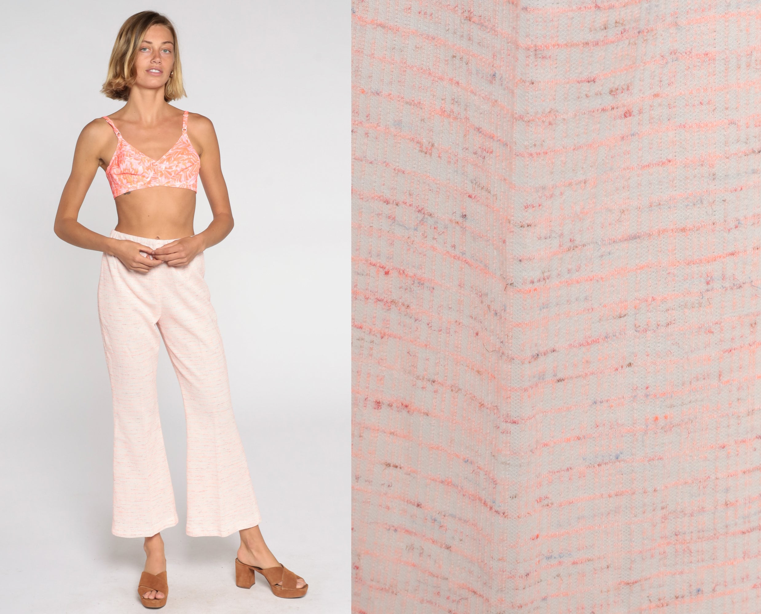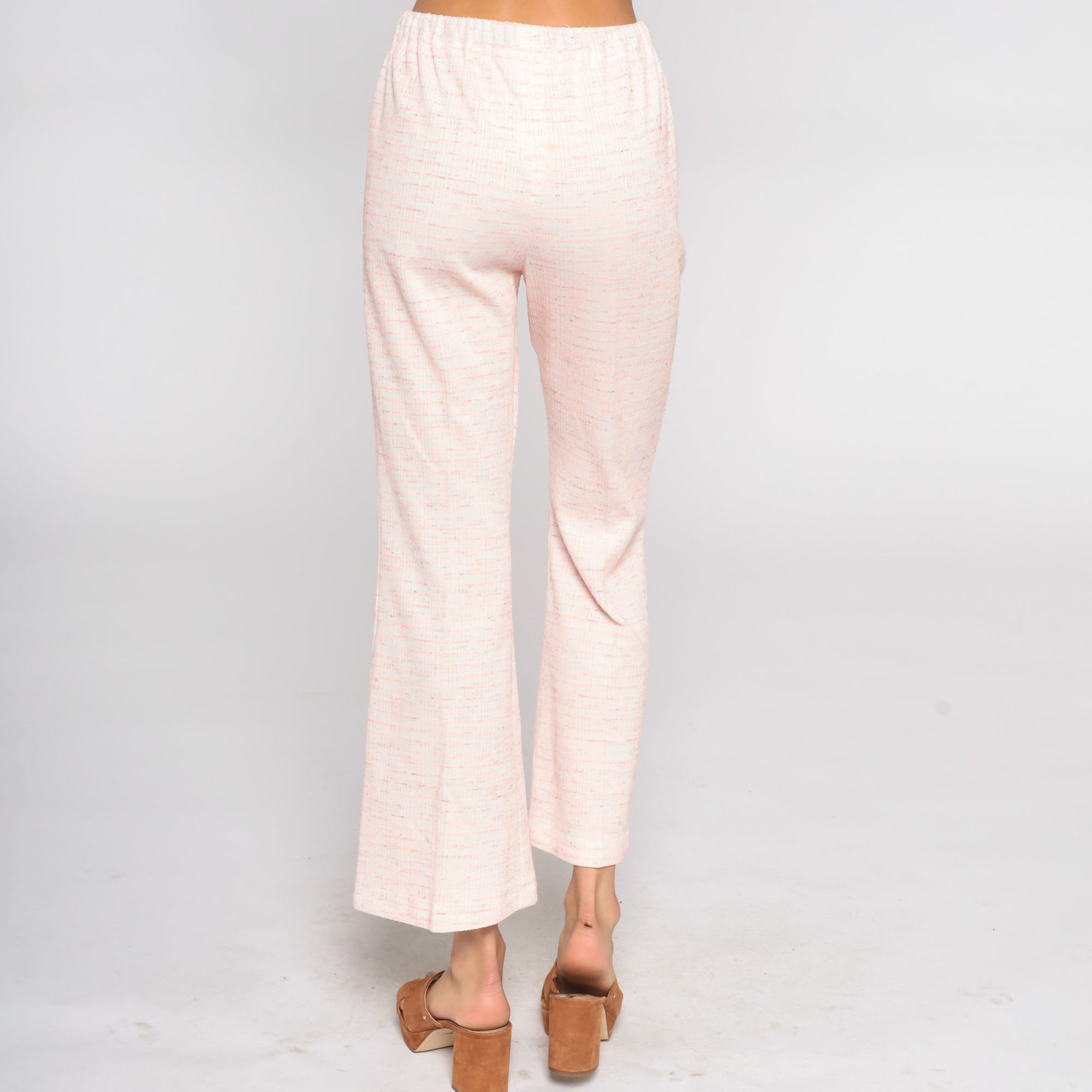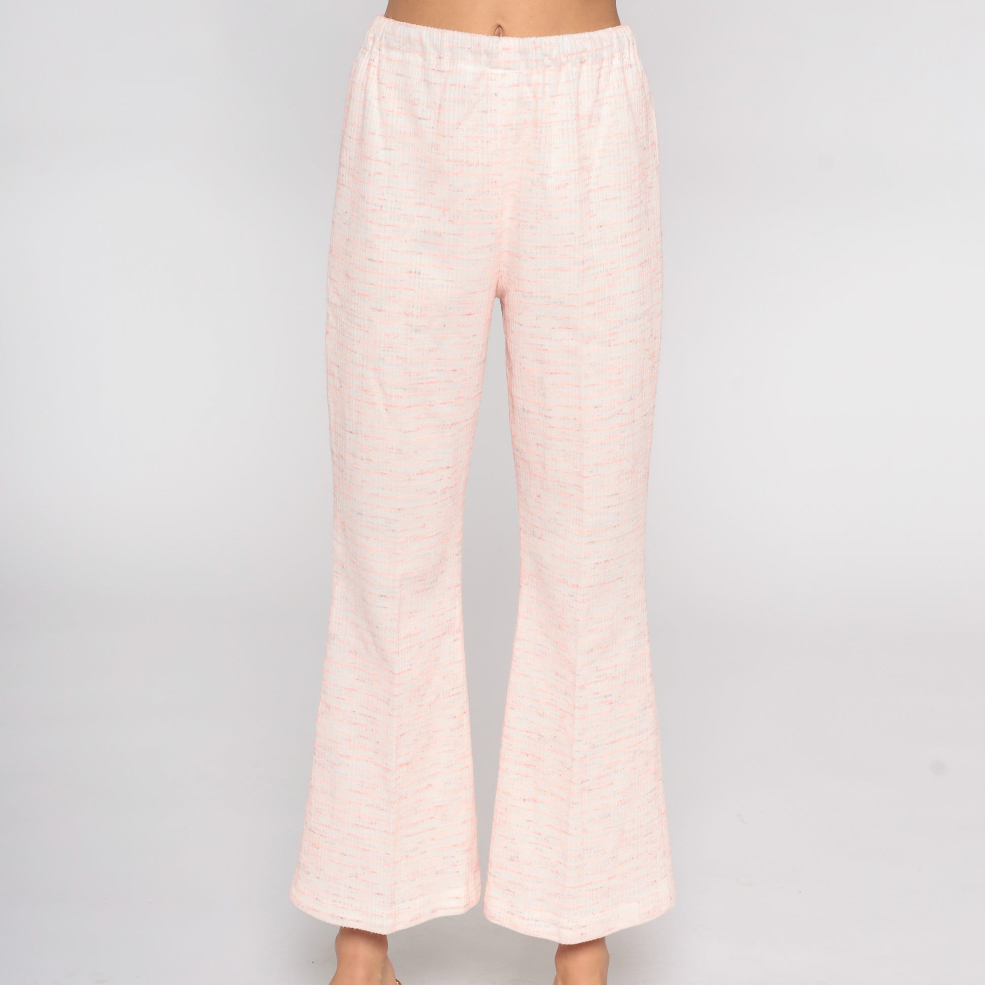 Vintage 70s bell bottom pants in pink with a high waist.
