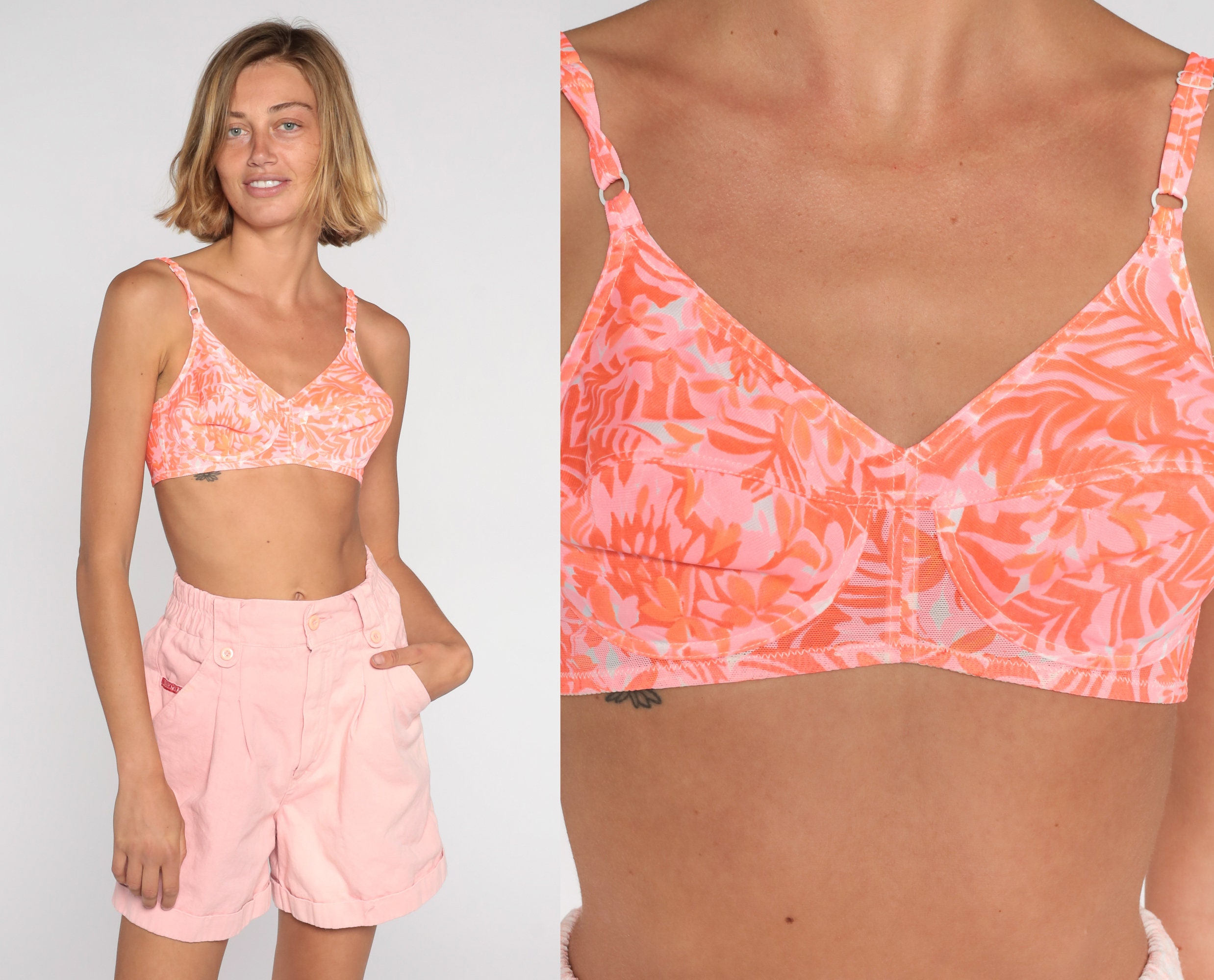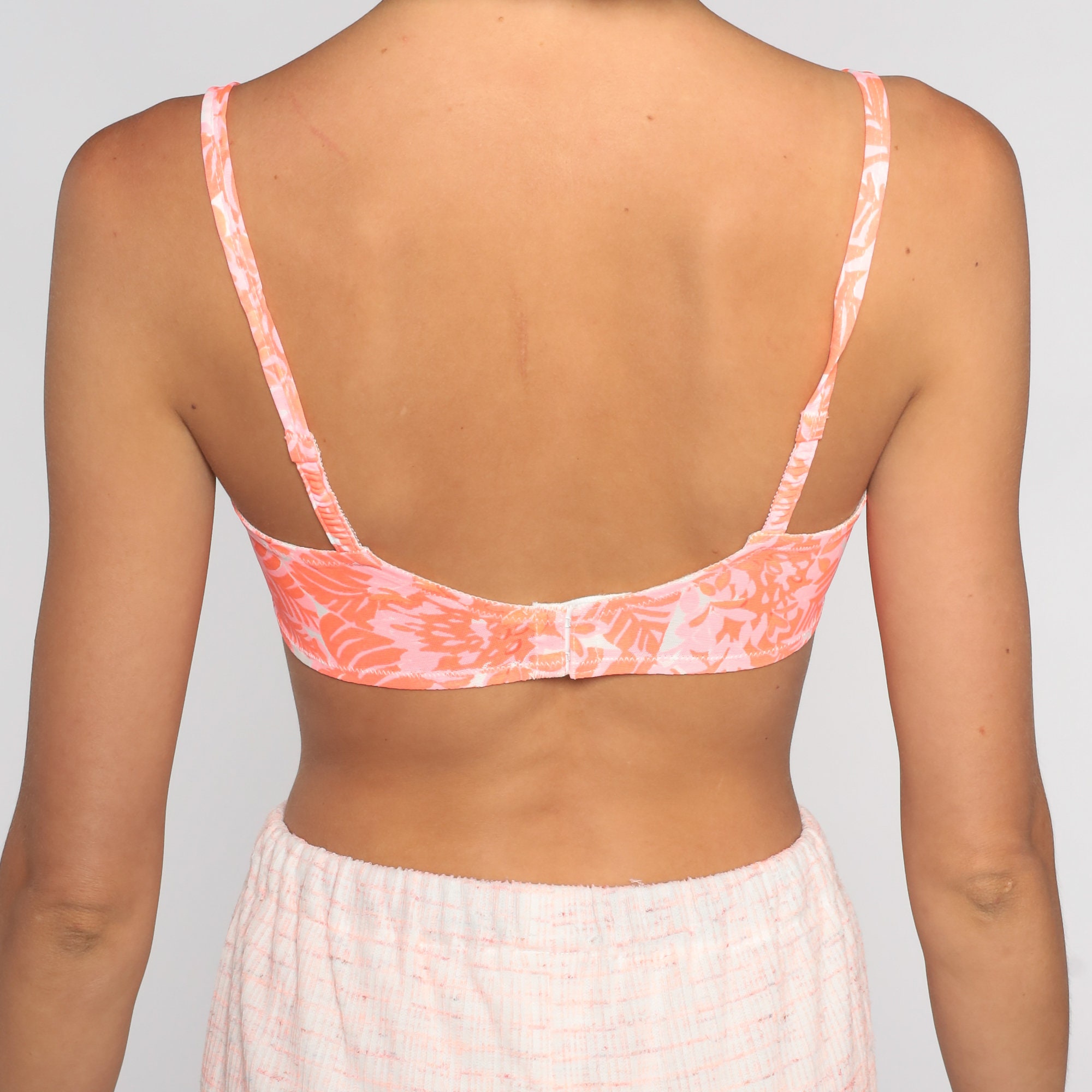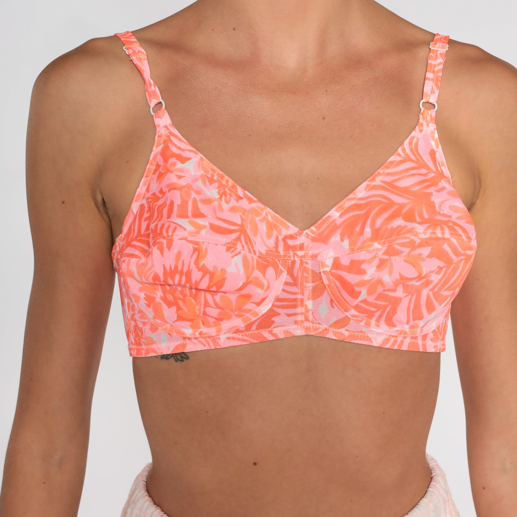 Vintage 70s bra in pink and orange with an abstract floral print.