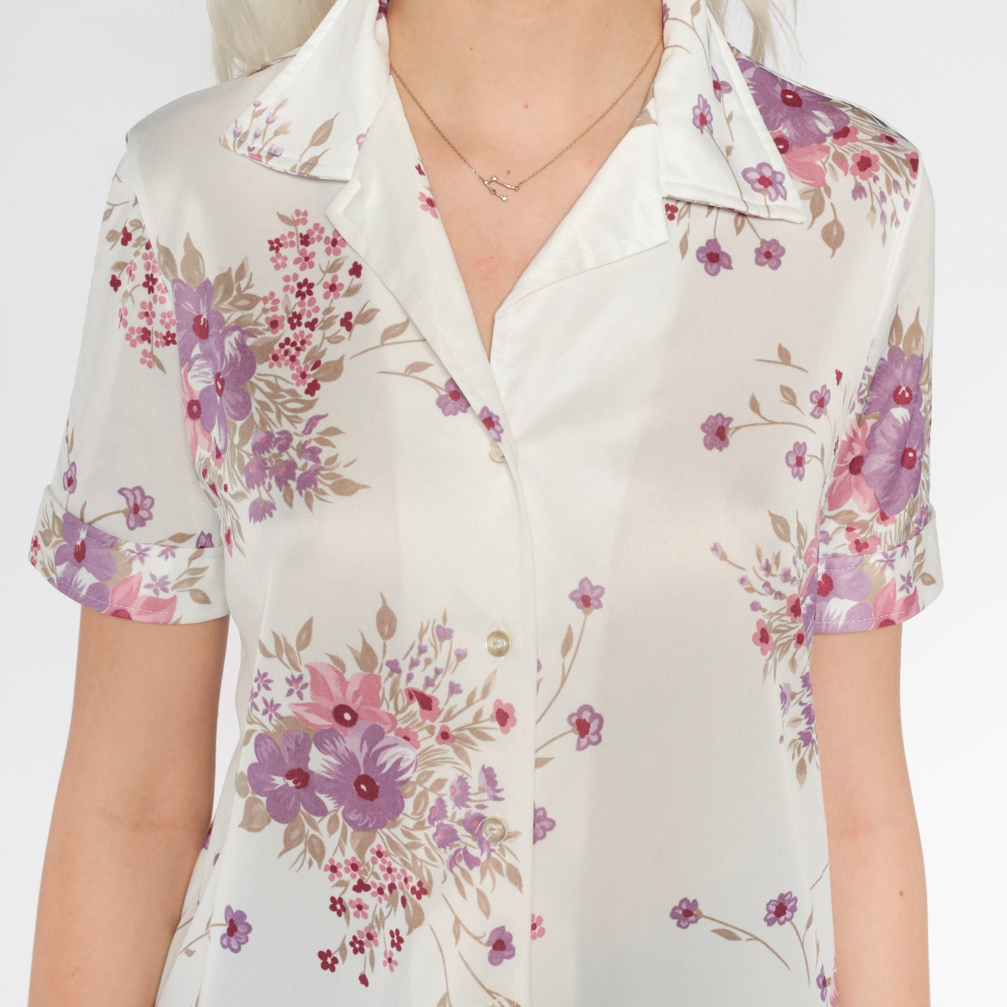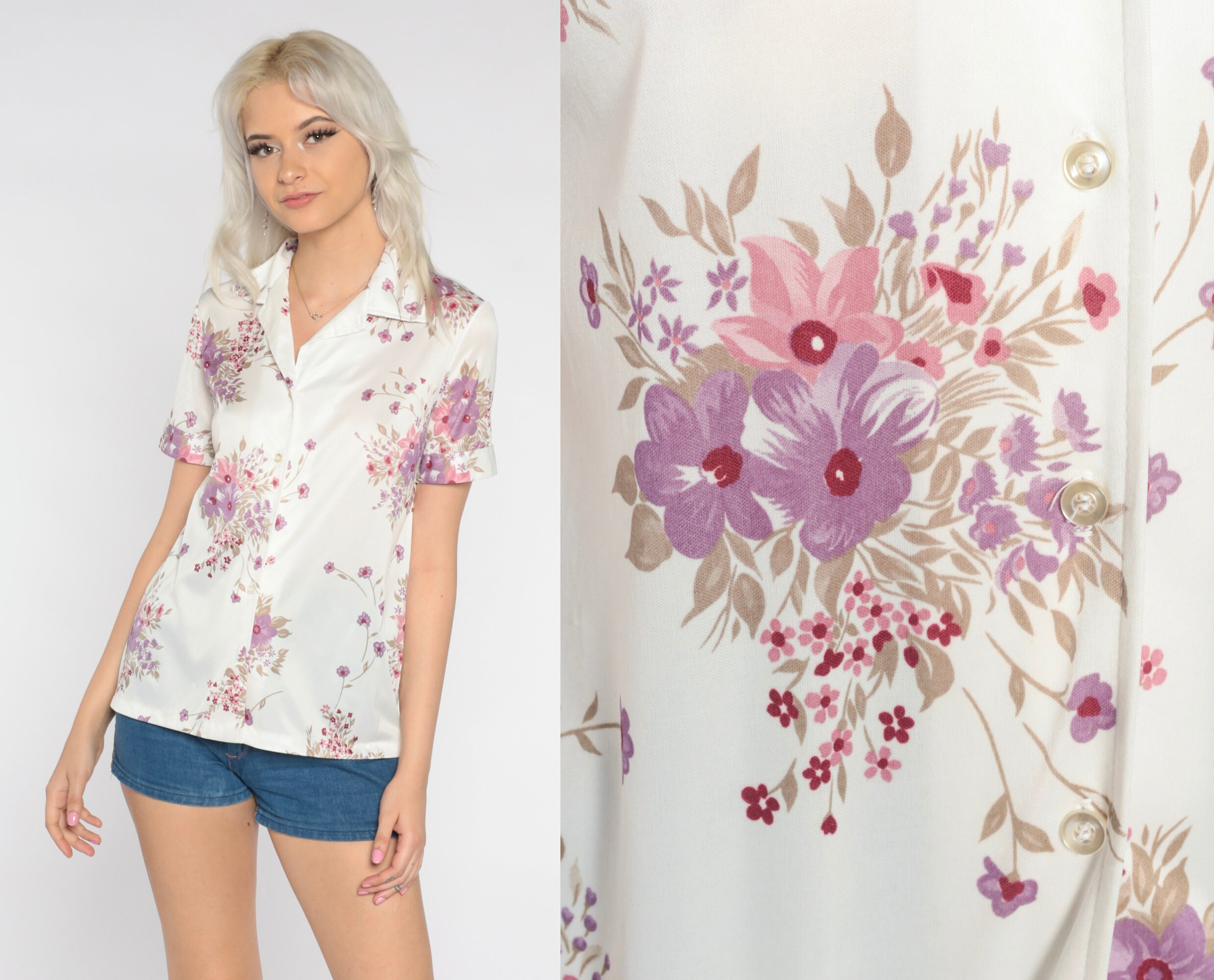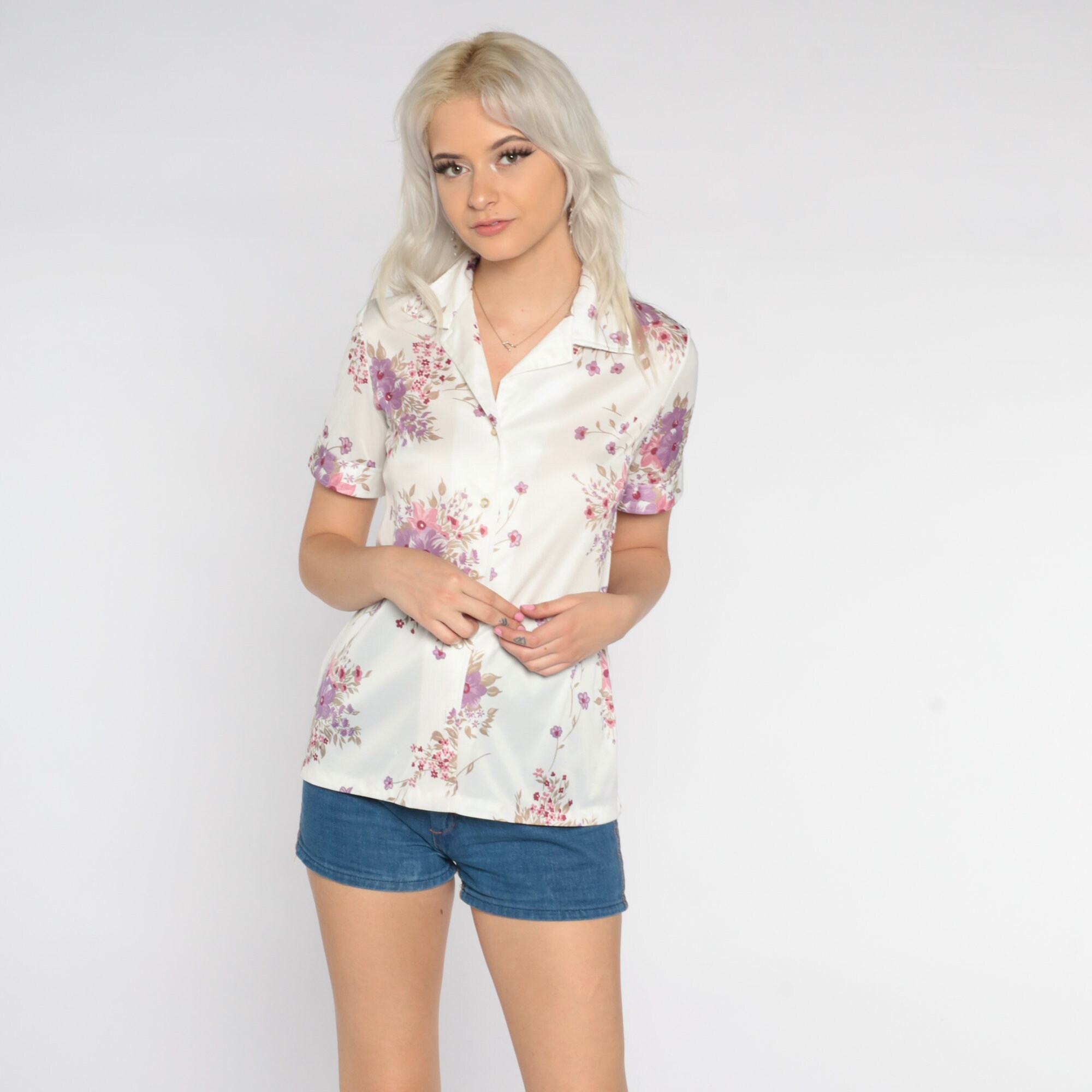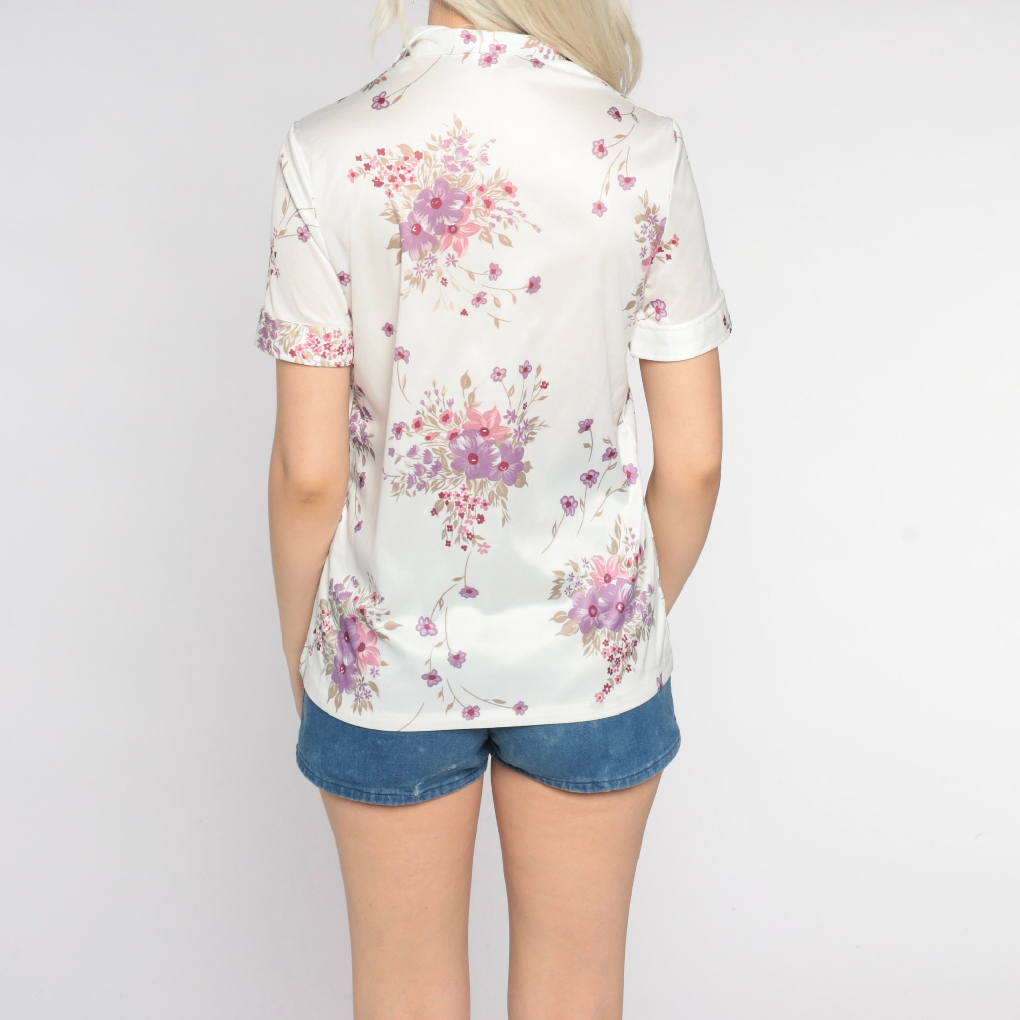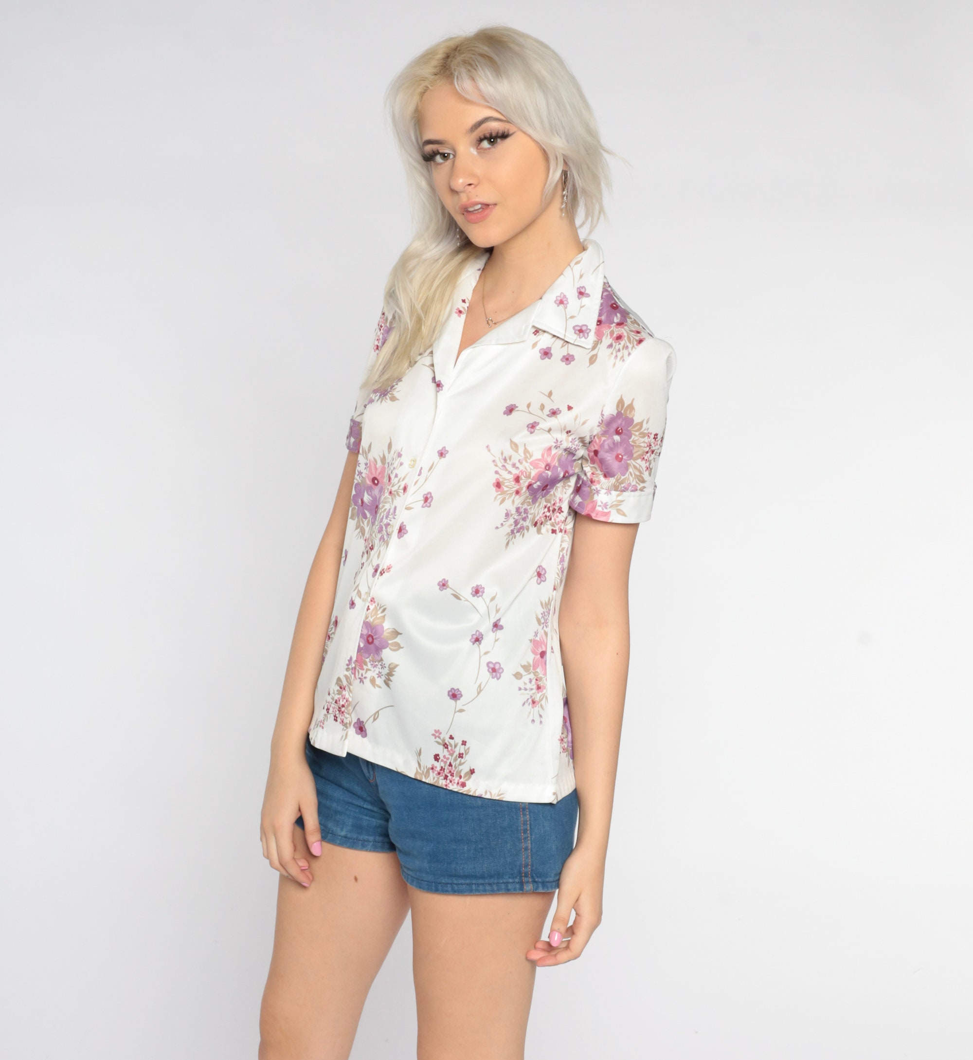 Vintage 70s blouse in white with a floral print. Buttons up the front, has a collar and short sleeves.