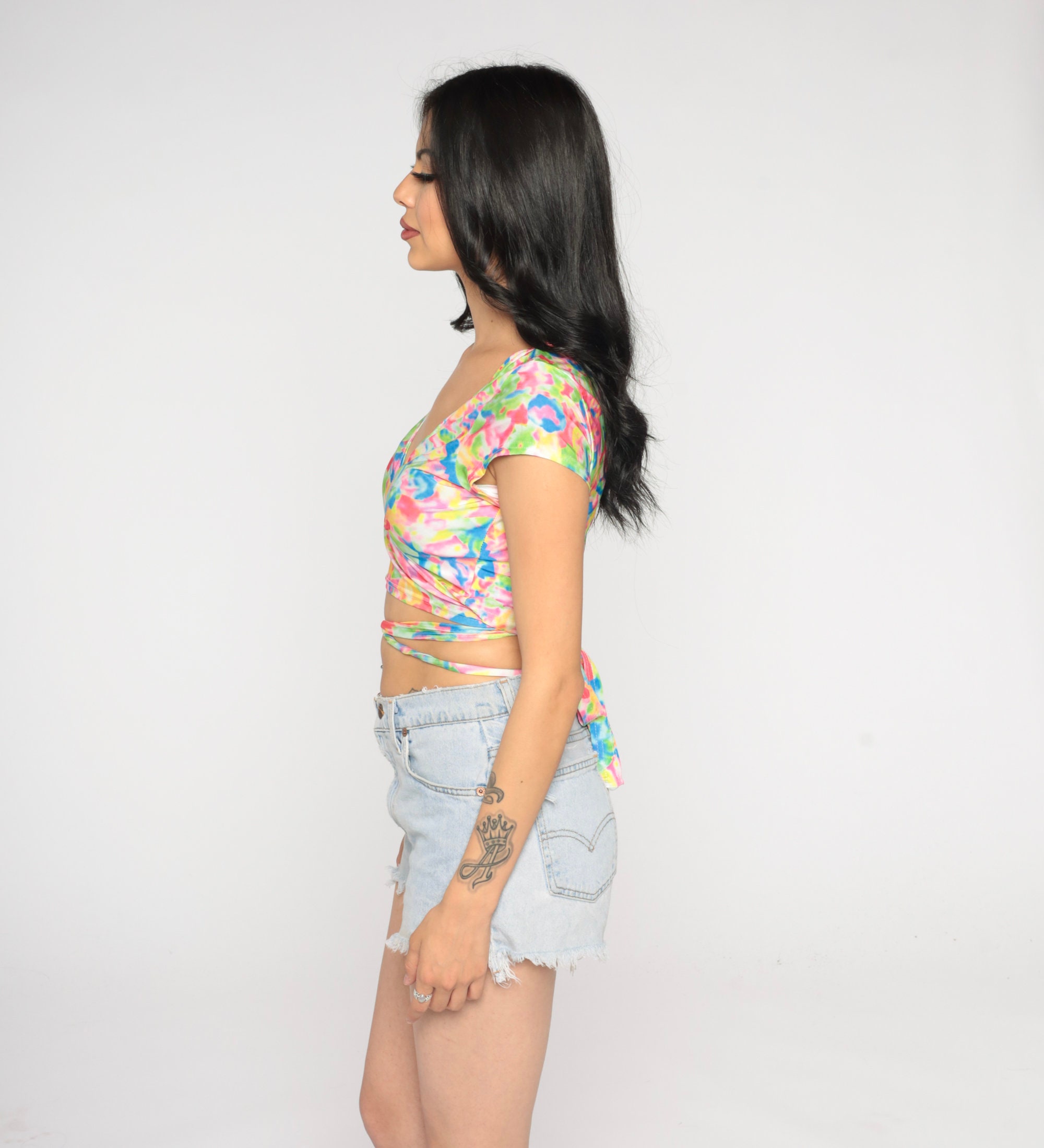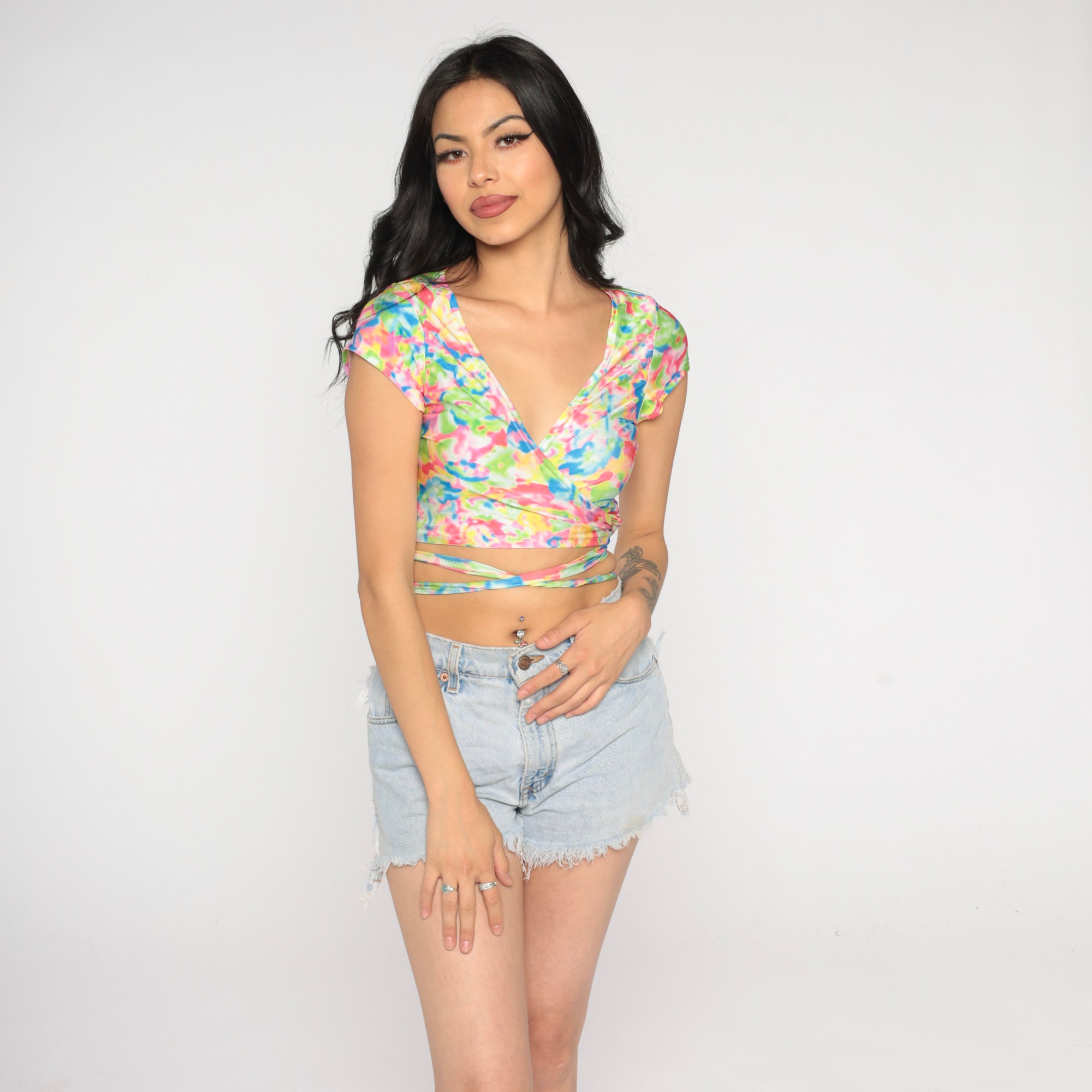 Vintage y2k crop top in a colorful abstract print with a wrap cut.