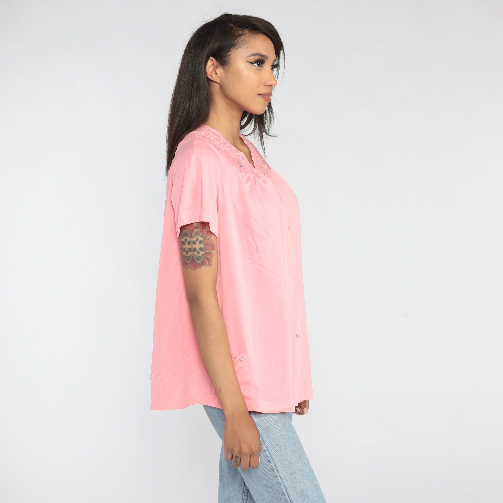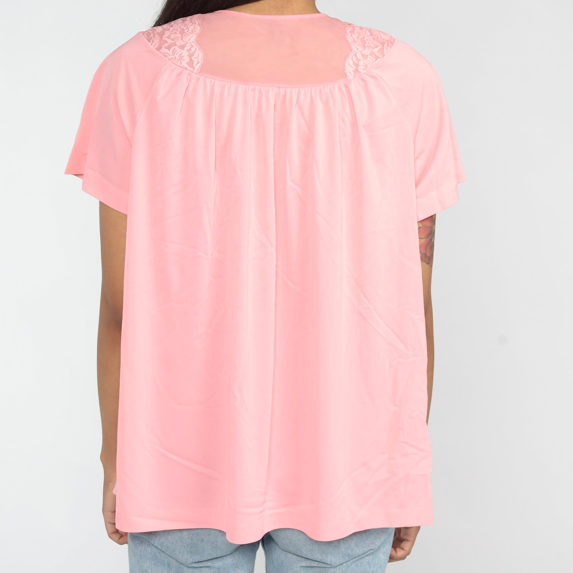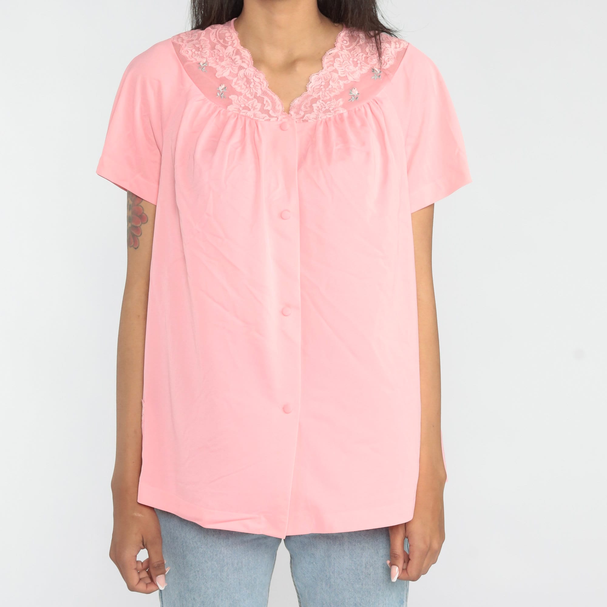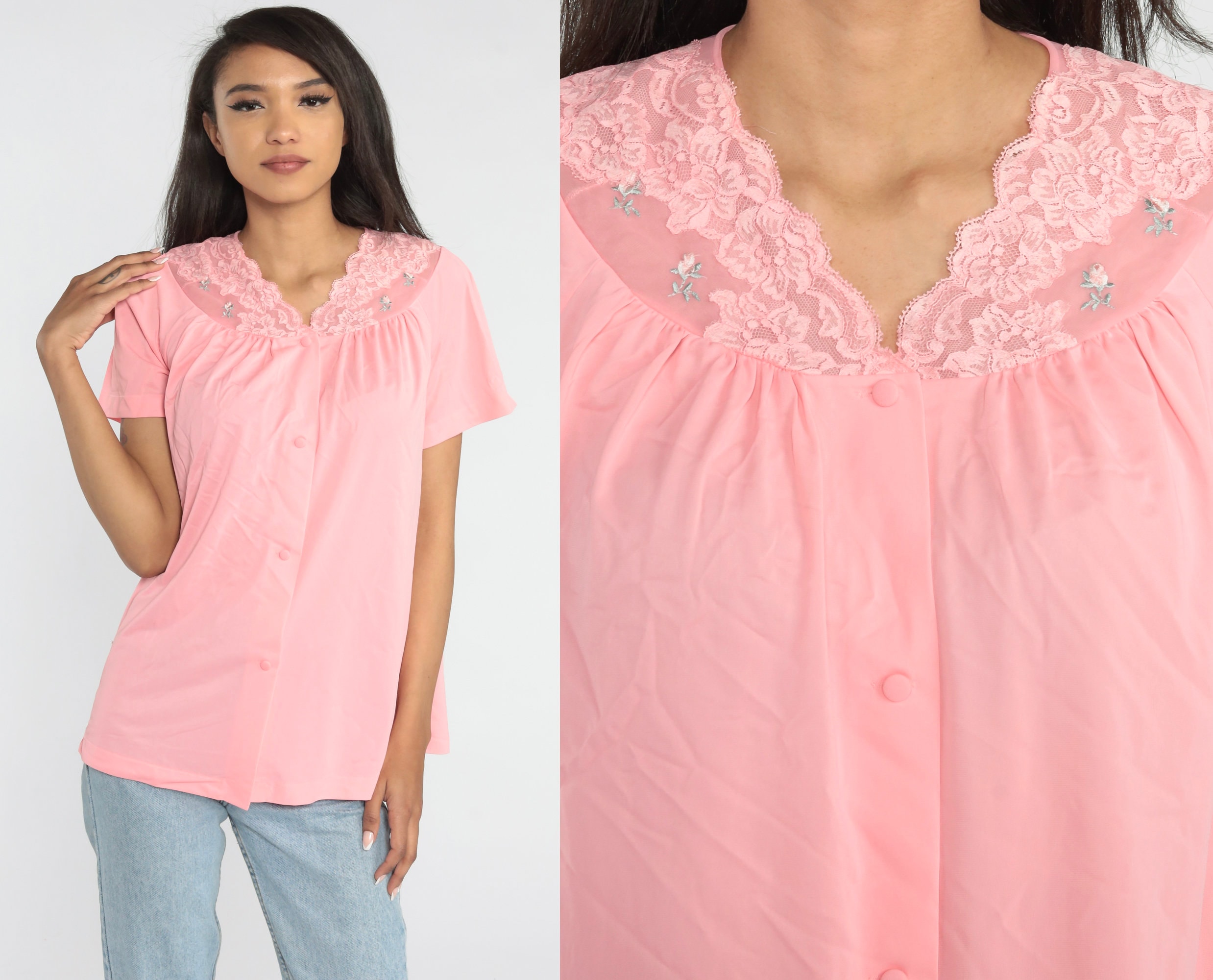 Vintage 70s lingerie pajama top in pink nylon with lace trim and buttons up the front.