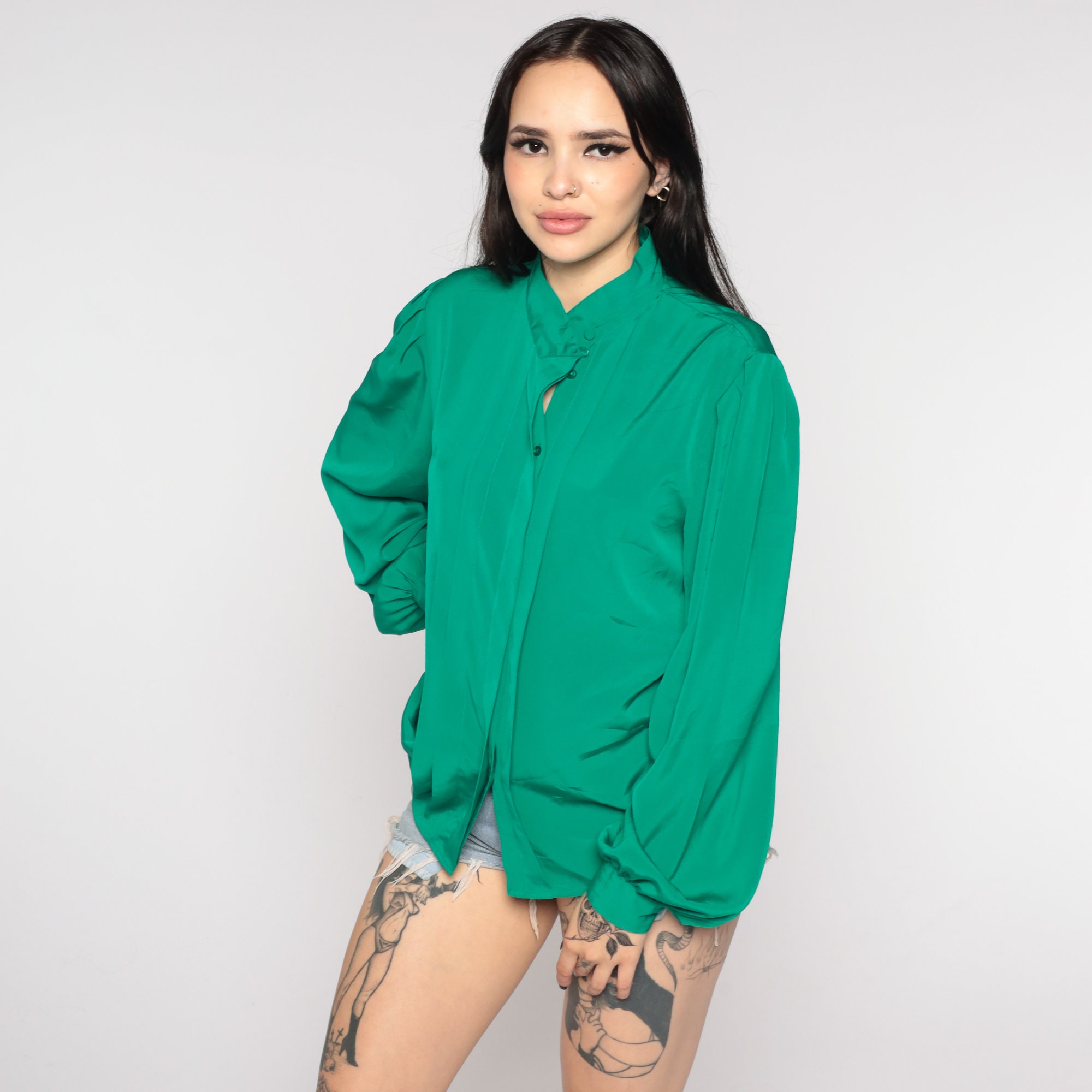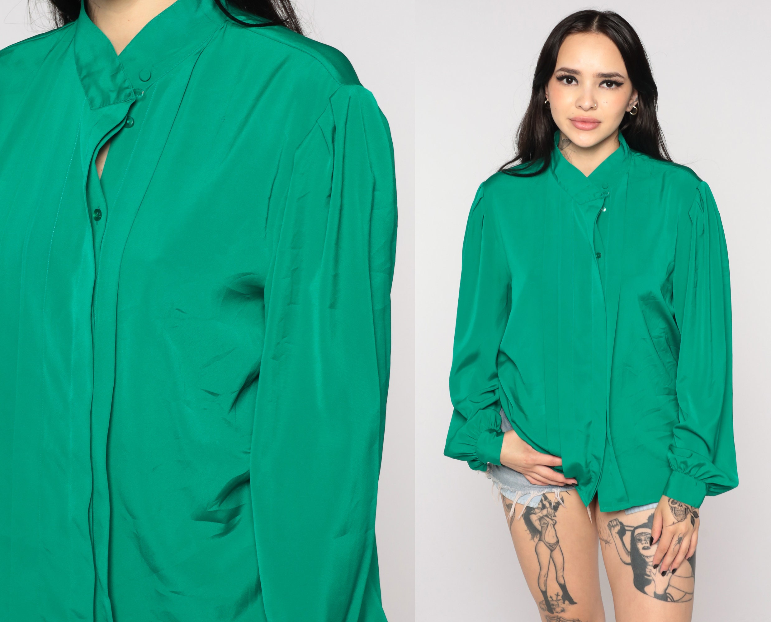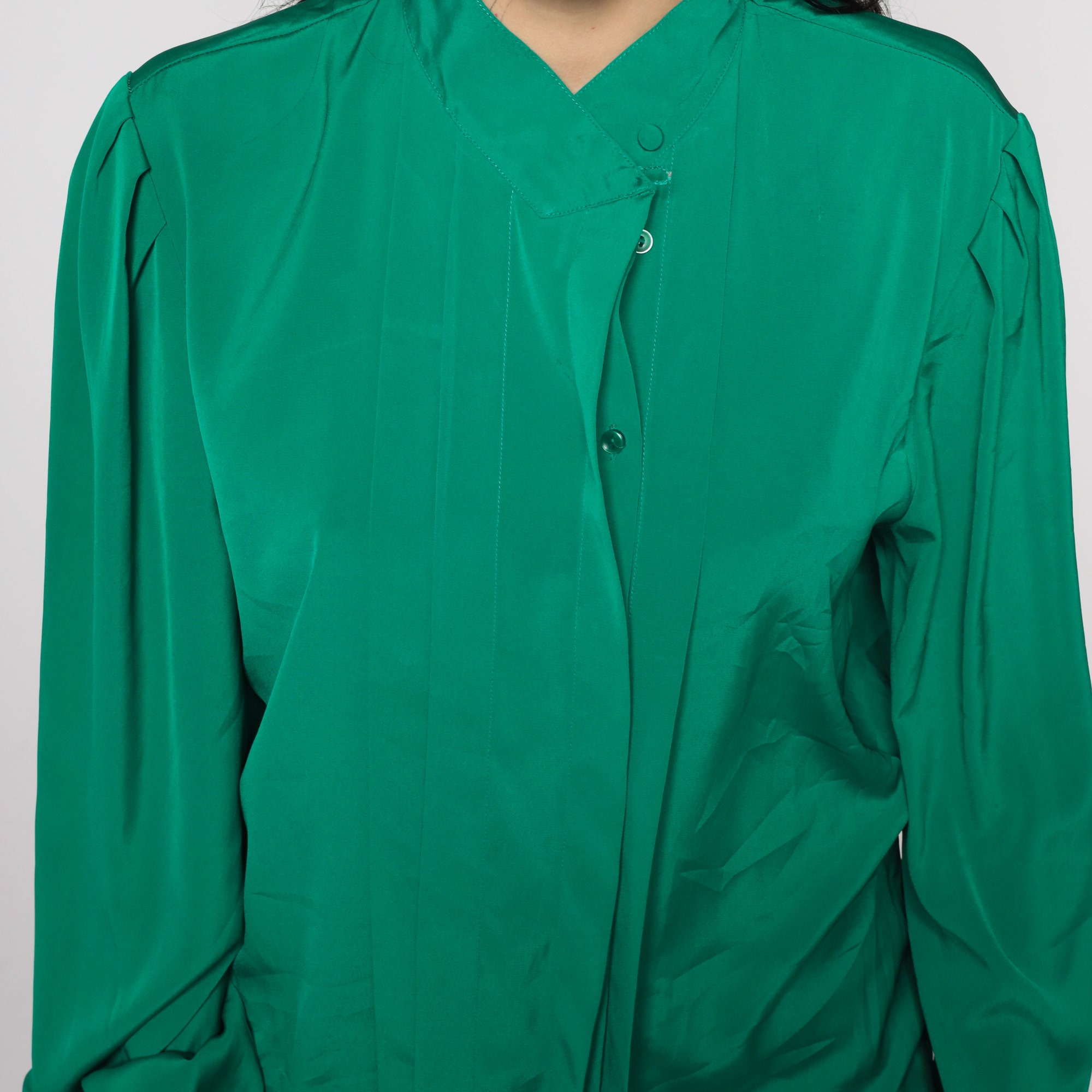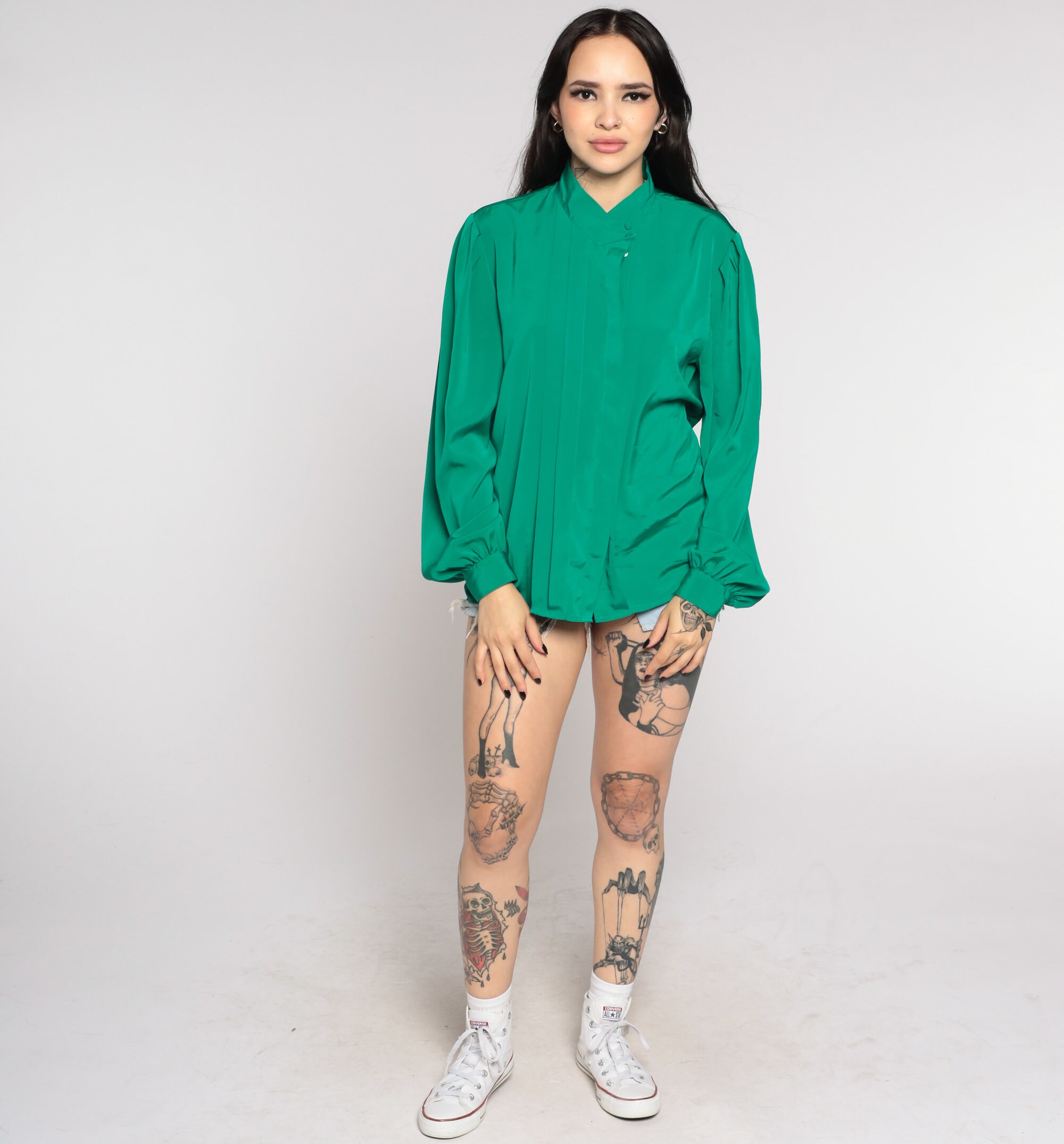 Vintage 80s shirt in green with long puff sleeves, pleats, and hidden buttons up the front.